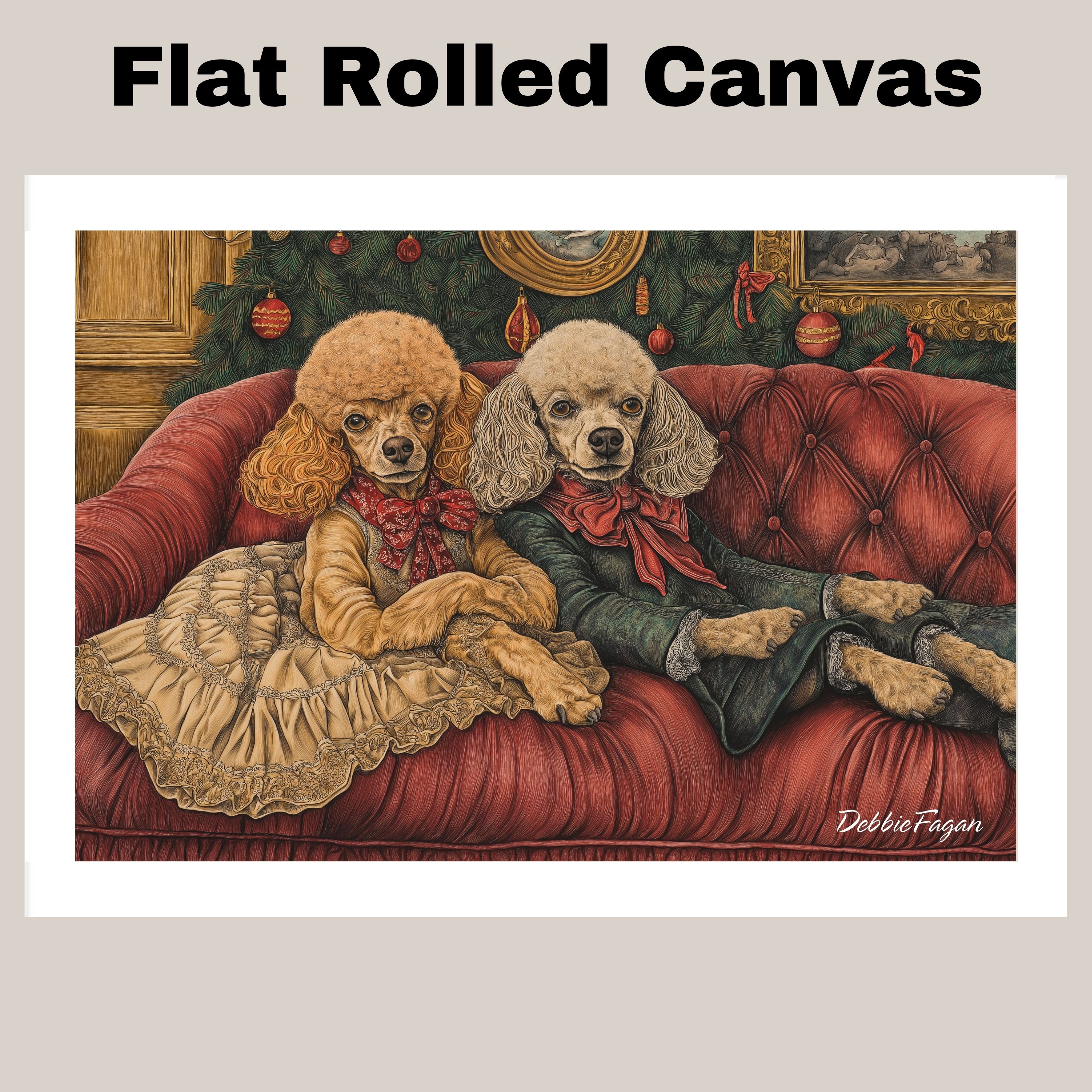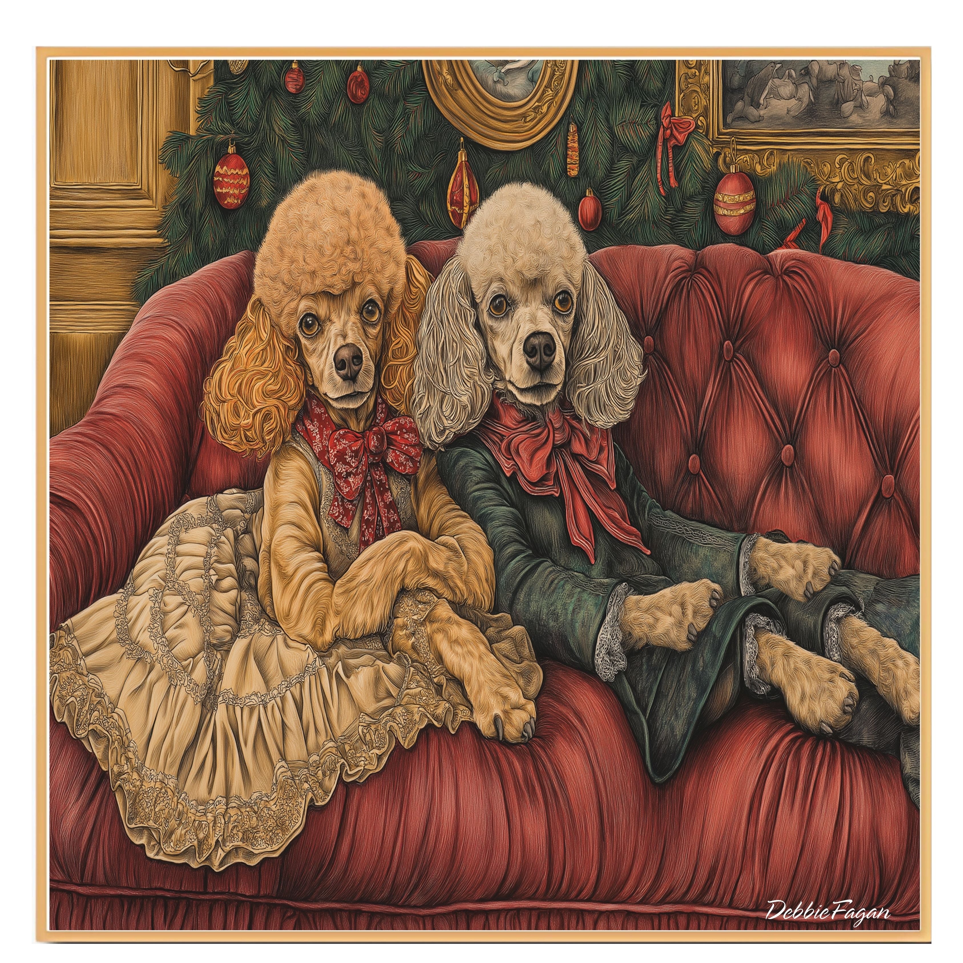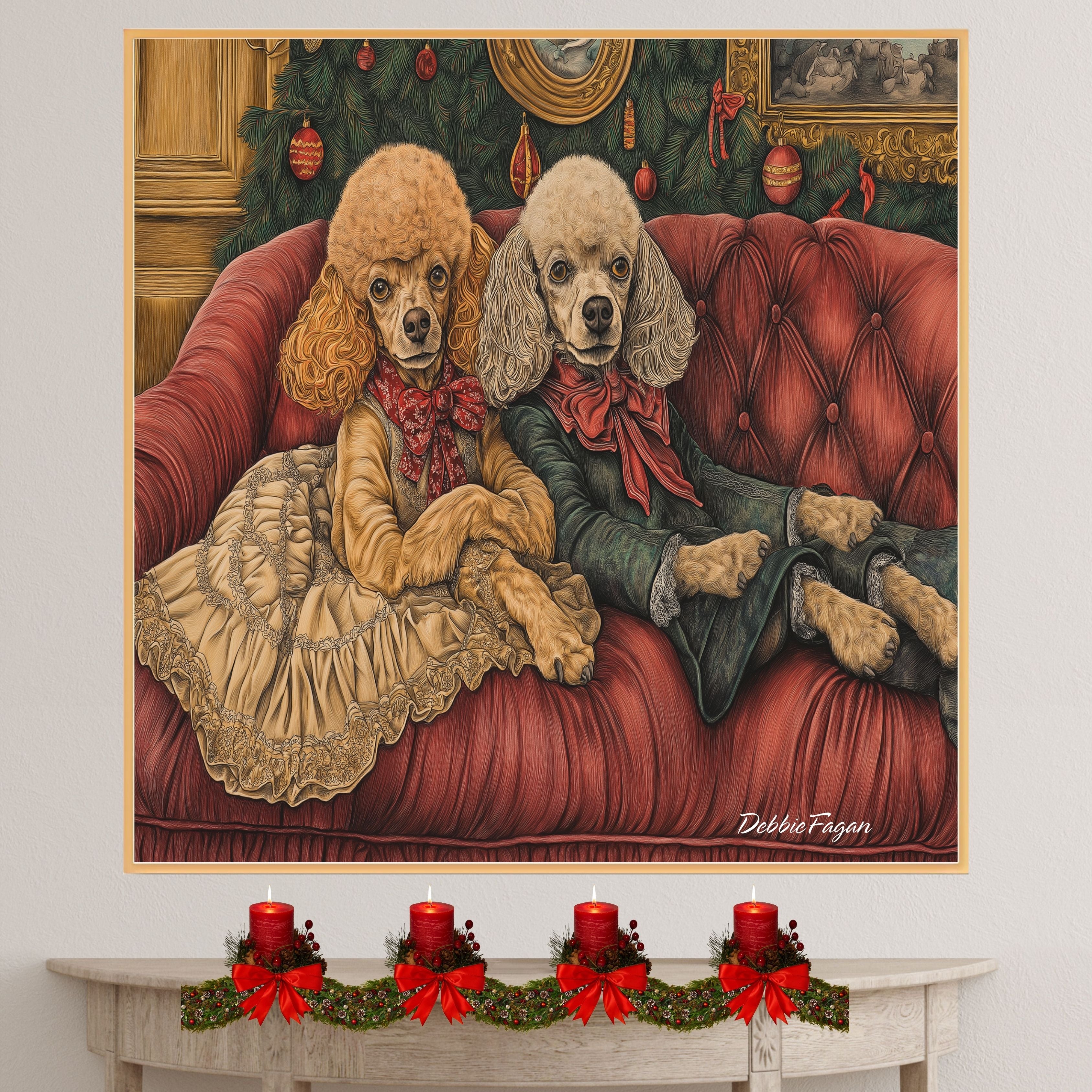 Our Poodle Pampering Canvas adds a touch of festive elegance and charm to your holiday decor, featuring two graceful Poodles lounging on a vintage red ornate sofa with a warm, cozy ambiance. Available on a 1.5" thick canvas wrap, floating framed canvas, or as a flat rolled canvas, this delightful piece captures the sophistication of the season with a playful yet timeless scene. With its combination of holiday warmth and refined style, this eye-catching artwork is perfect for adding a luxurious, joyful accent to any room and makes a stunning focal point for holiday celebrations and beyond.