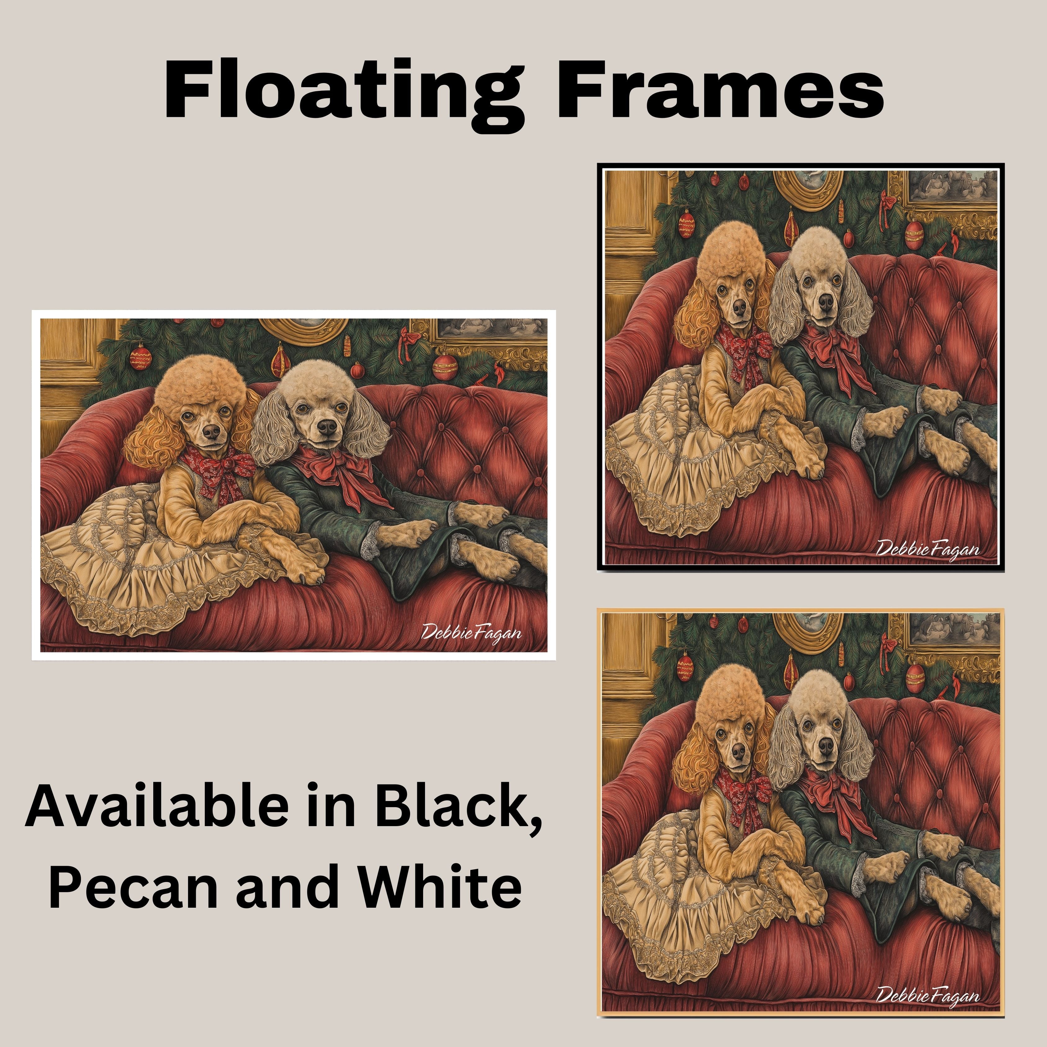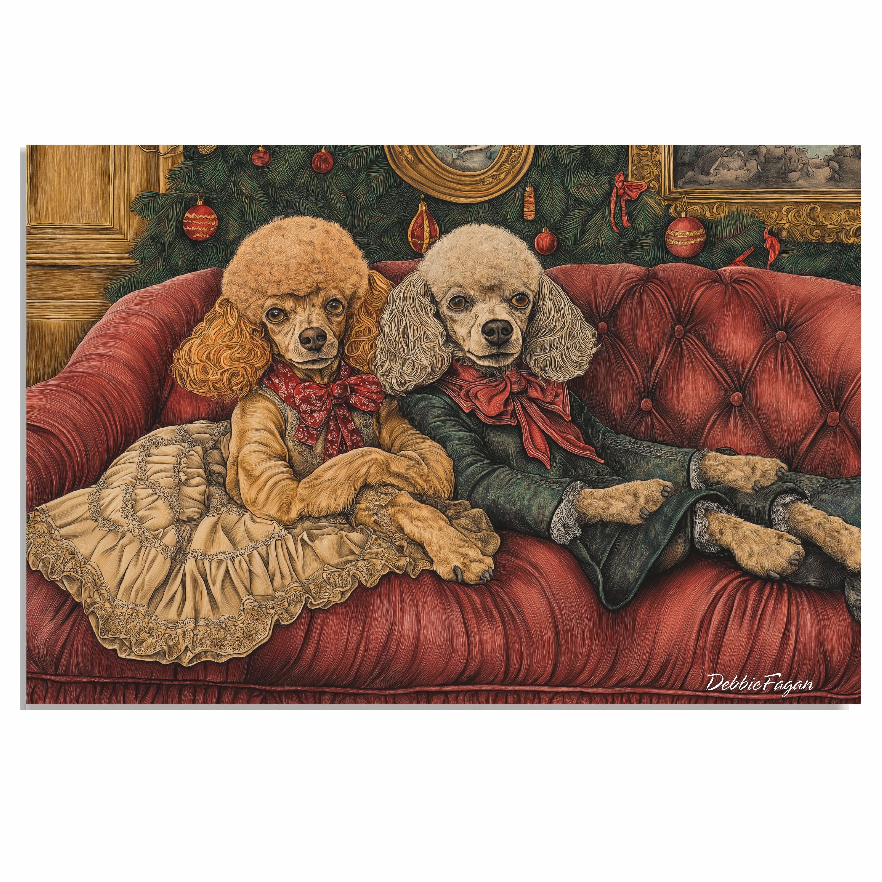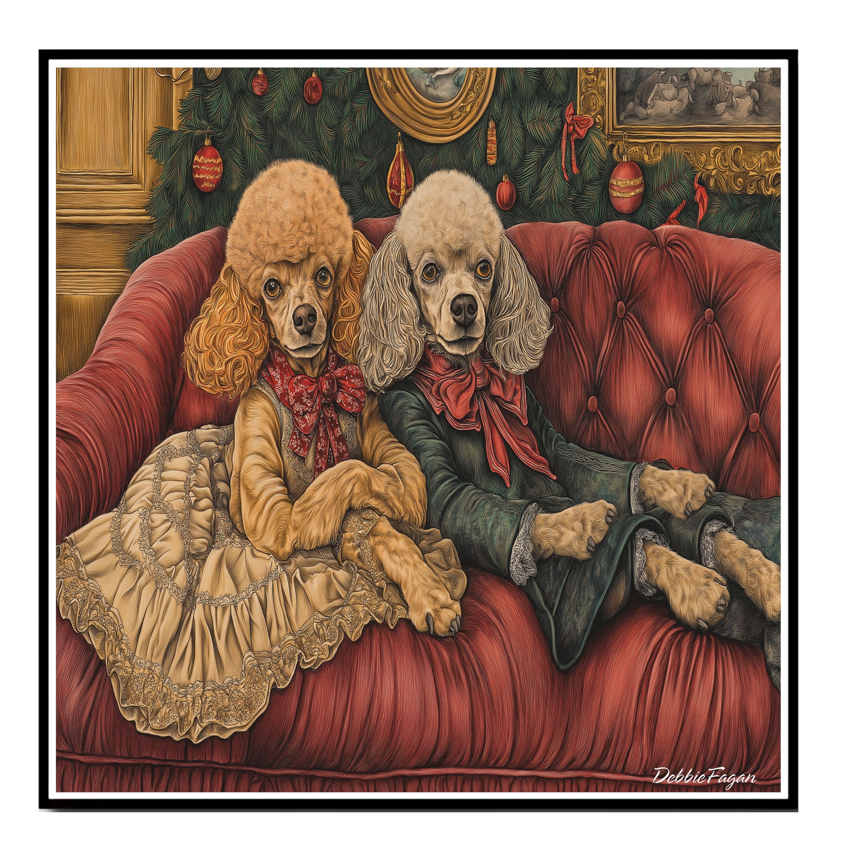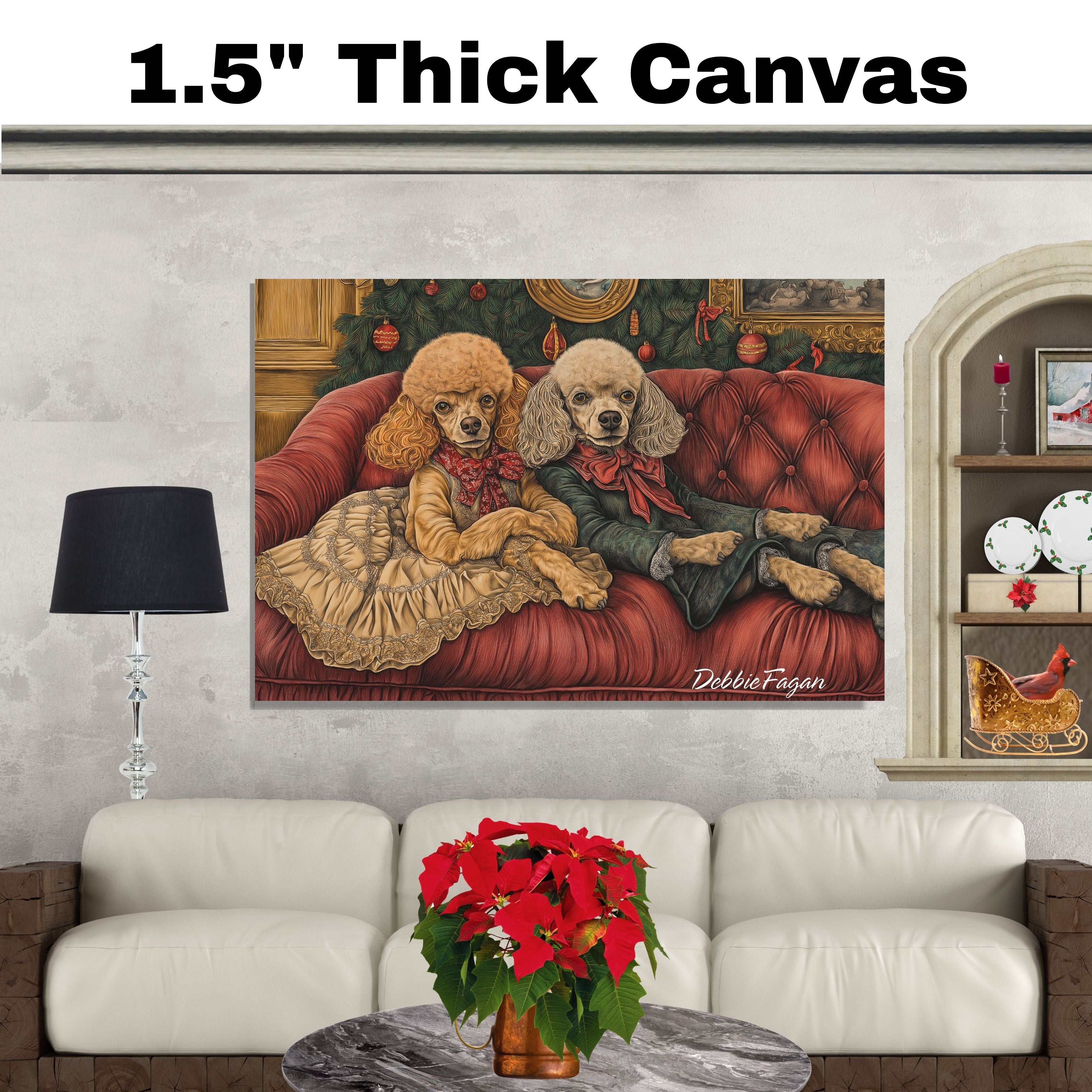 Our Poodle Pampering Canvas adds a touch of festive elegance and charm to your holiday decor, featuring two graceful Poodles lounging on a vintage red ornate sofa with a warm, cozy ambiance. Available on a 1.5" thick canvas wrap, floating framed canvas, or as a flat rolled canvas, this delightful piece captures the sophistication of the season with a playful yet timeless scene. With its combination of holiday warmth and refined style, this eye-catching artwork is perfect for adding a luxurious, joyful accent to any room and makes a stunning focal point for holiday celebrations and beyond.