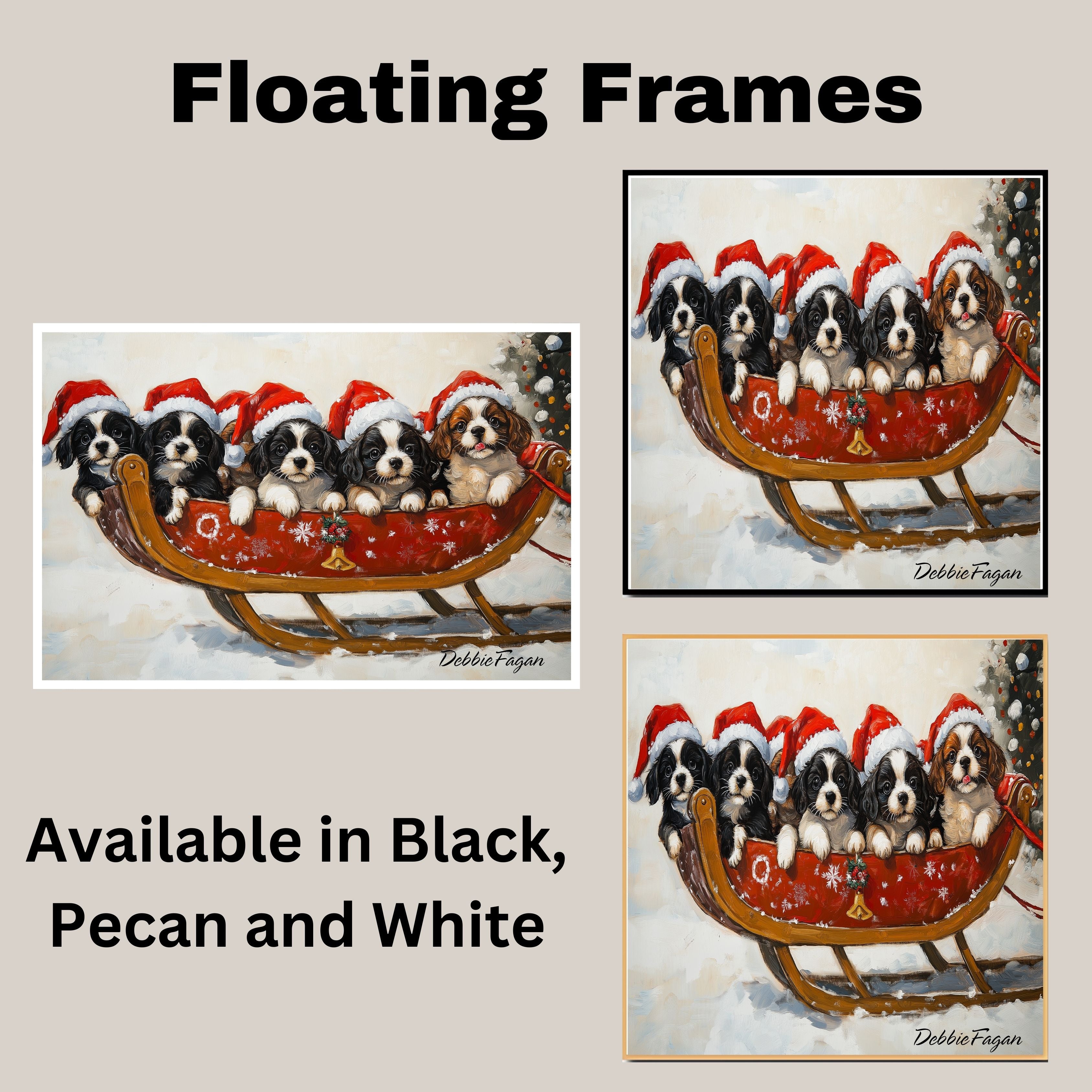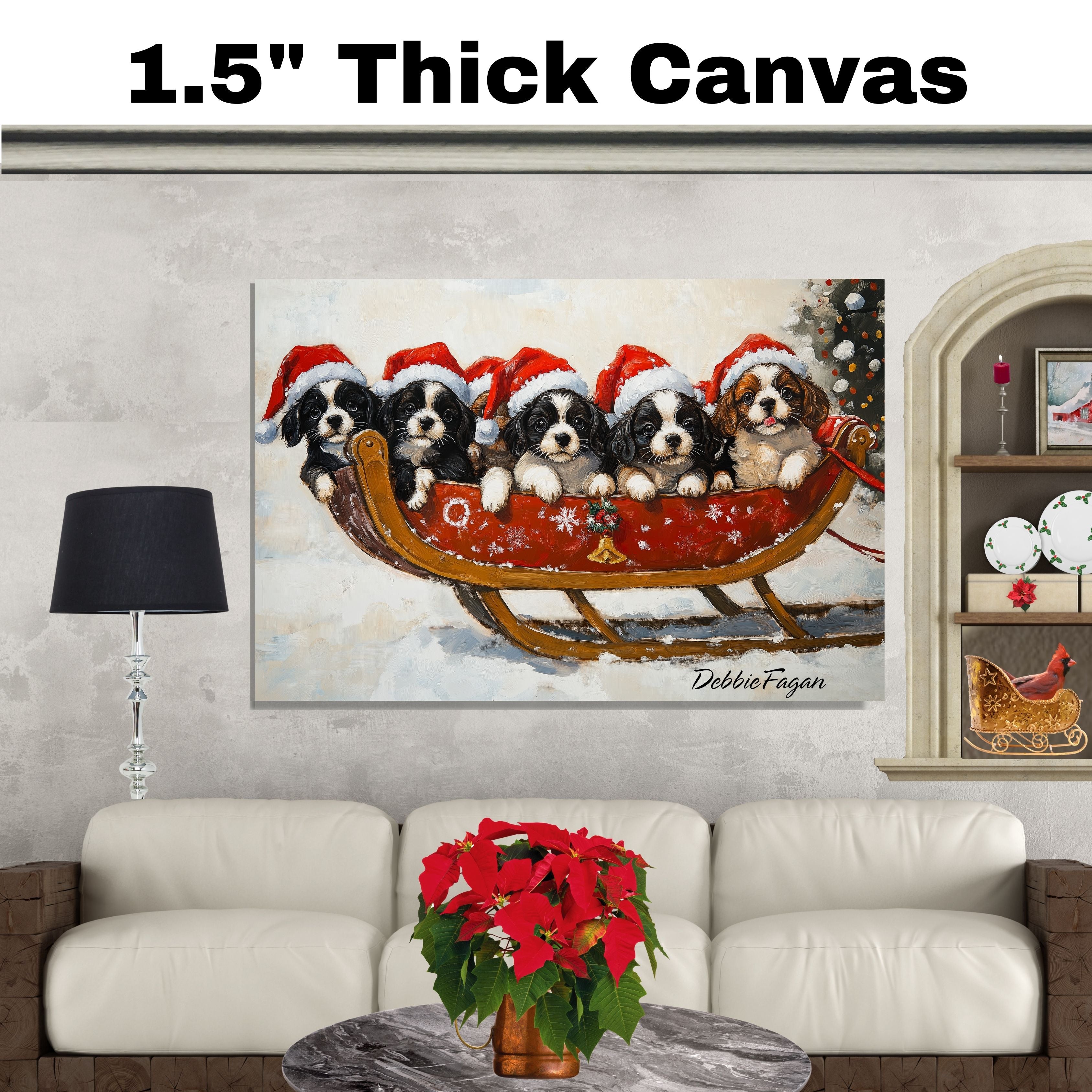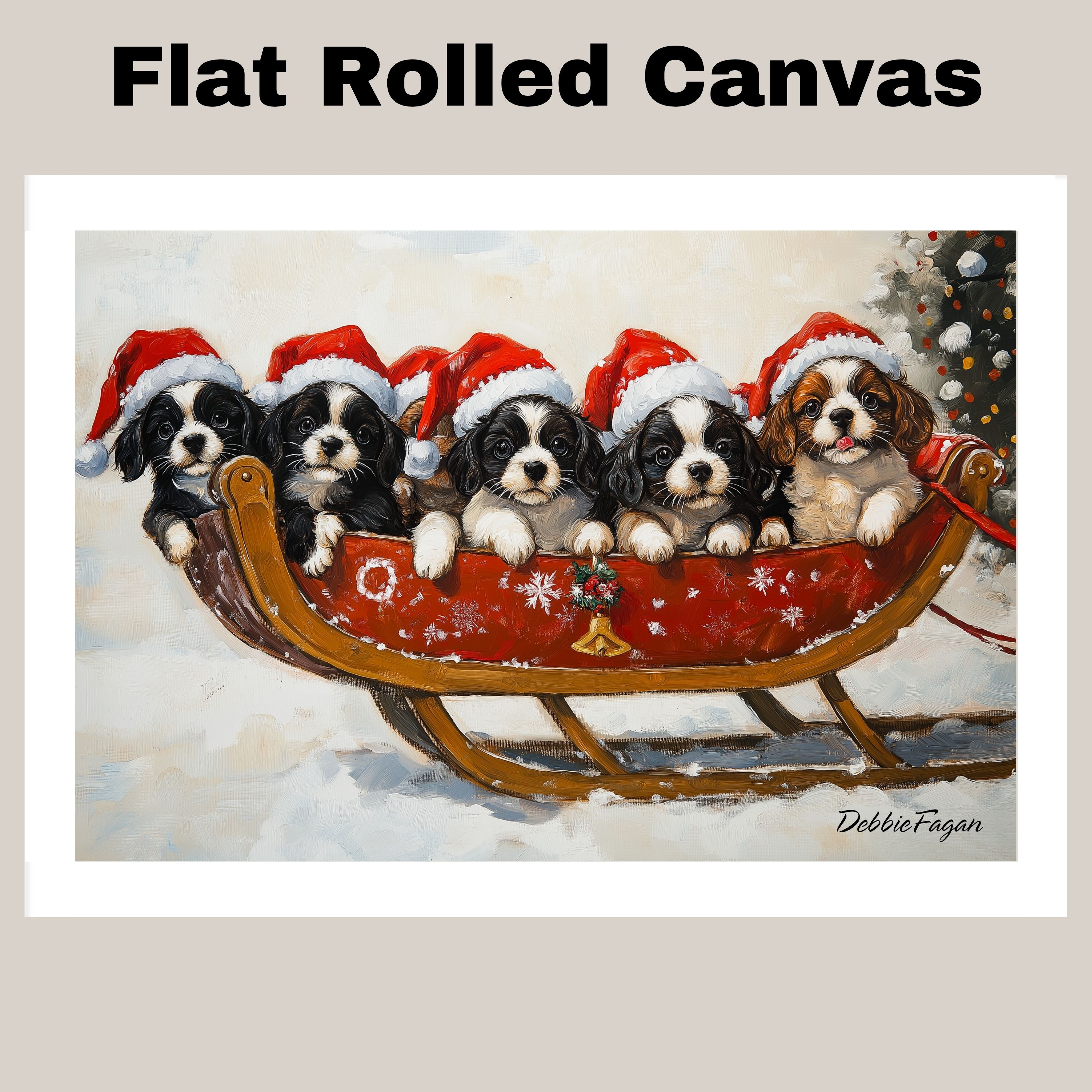 Our "Santa's Little Helpers" Canvas adds a touch of holiday magic and cheer to your home, featuring a group of adorable puppies wearing Santa hats as they ride a sleigh through a snowy winter wonderland. Available on a 1.5" thick canvas wrap, floating framed canvas, or as a flat rolled canvas, this charming artwork captures the spirit of the season with its playful pups and festive details. With its perfect blend of whimsy and holiday elegance, this joyful piece is sure to bring warmth and fun to your holiday decor, making it a delightful focal point in any room.