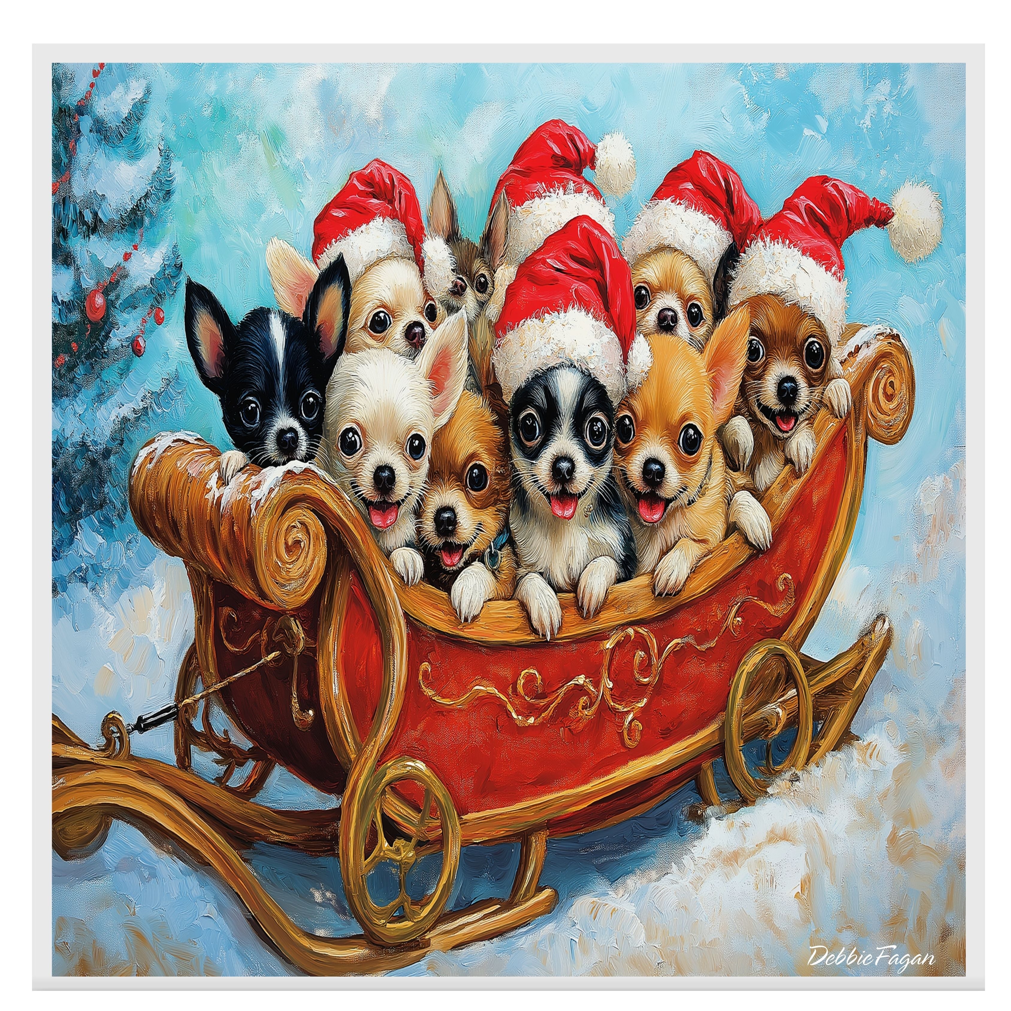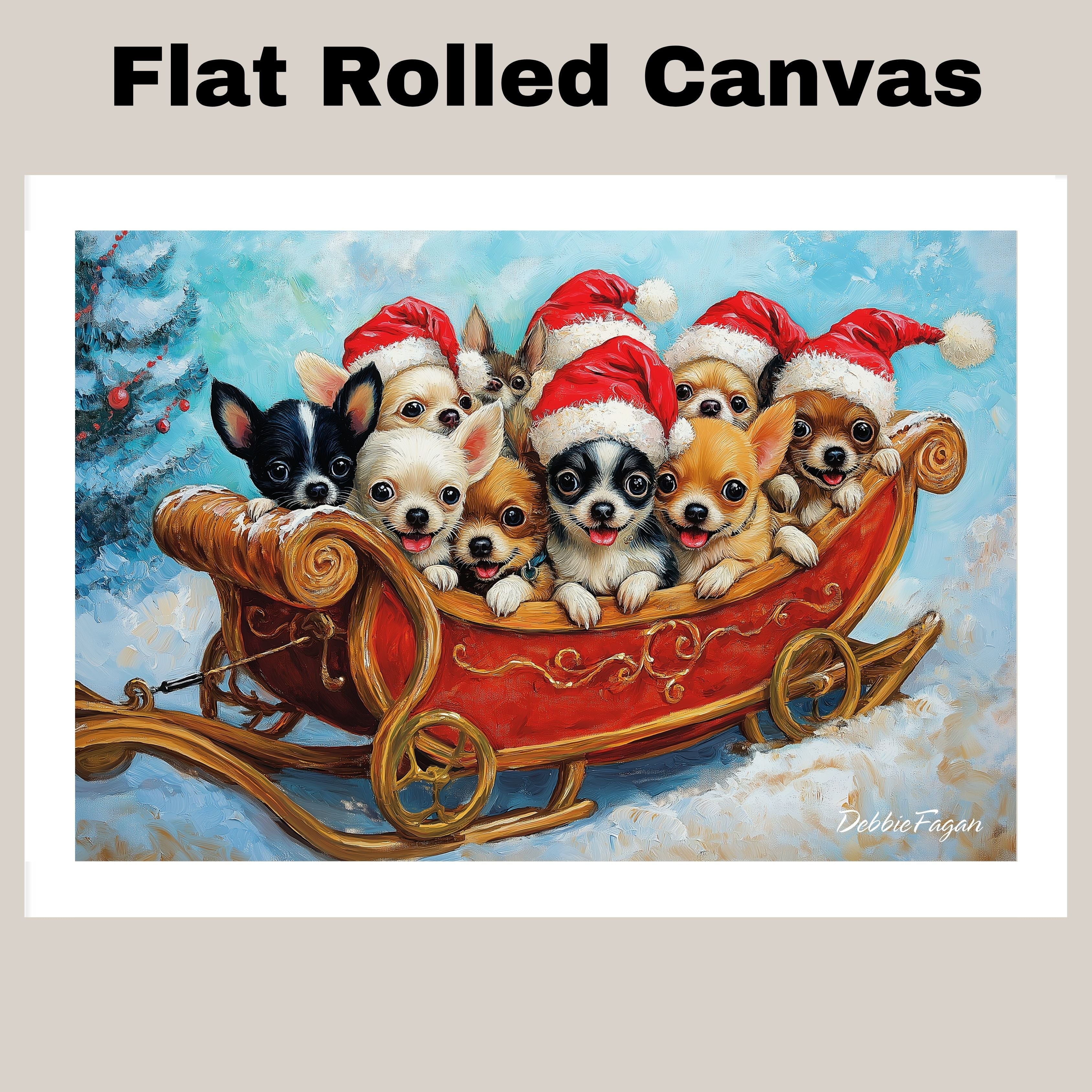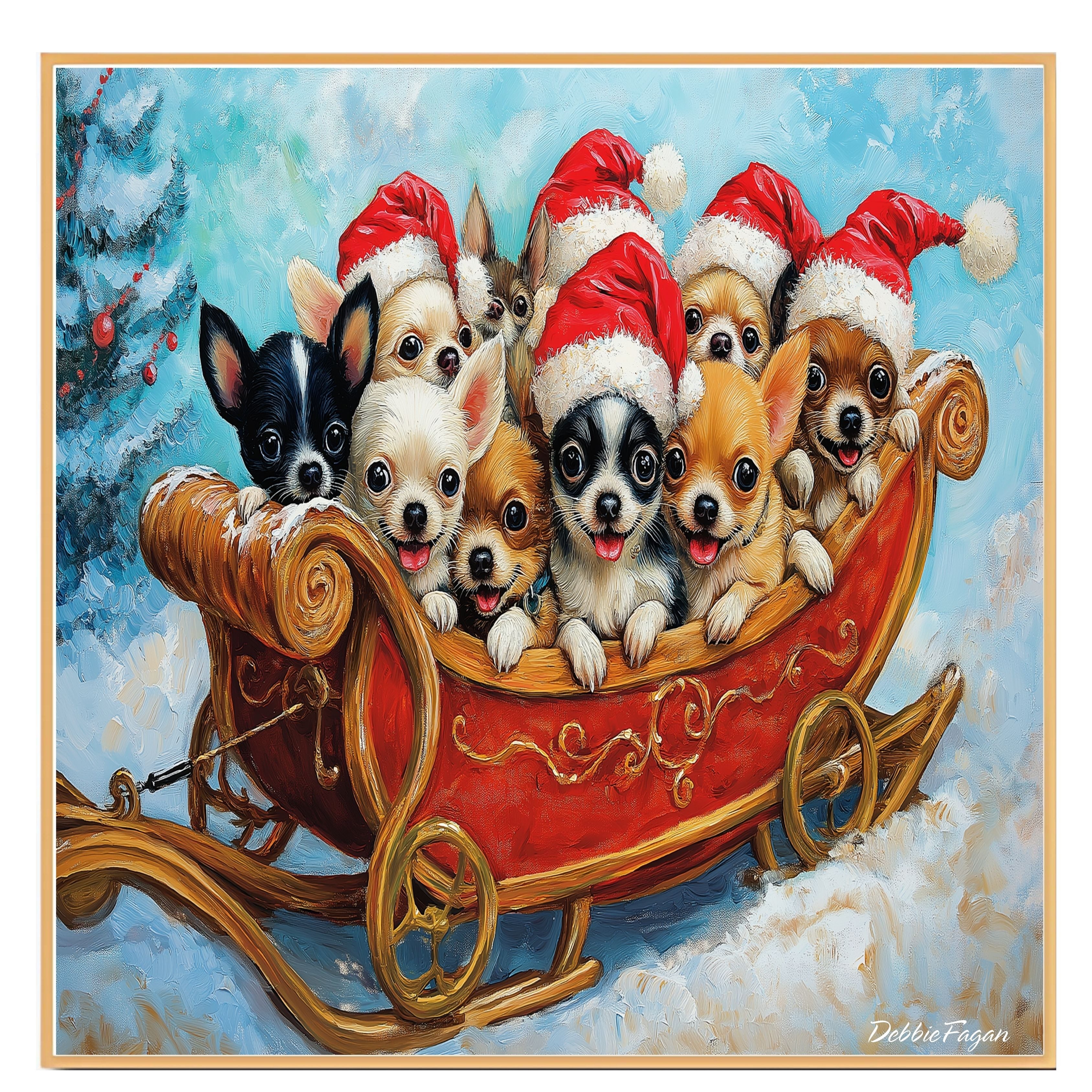 Our "Sleighing the Season" Canvas adds a touch of festive magic to your home, featuring a group of adorable puppies wearing Santa hats, joyfully riding a festive sleigh through a snowy winter wonderland. Available on a 1.5" thick canvas wrap, floating framed canvas, or as a flat rolled canvas, this heartwarming artwork perfectly captures the spirit of the holidays. With its playful charm and vibrant colors, "Sleighing the Season" brings cheer to any room, making it an ideal centerpiece for your holiday decor or a thoughtful gift for dog lovers.