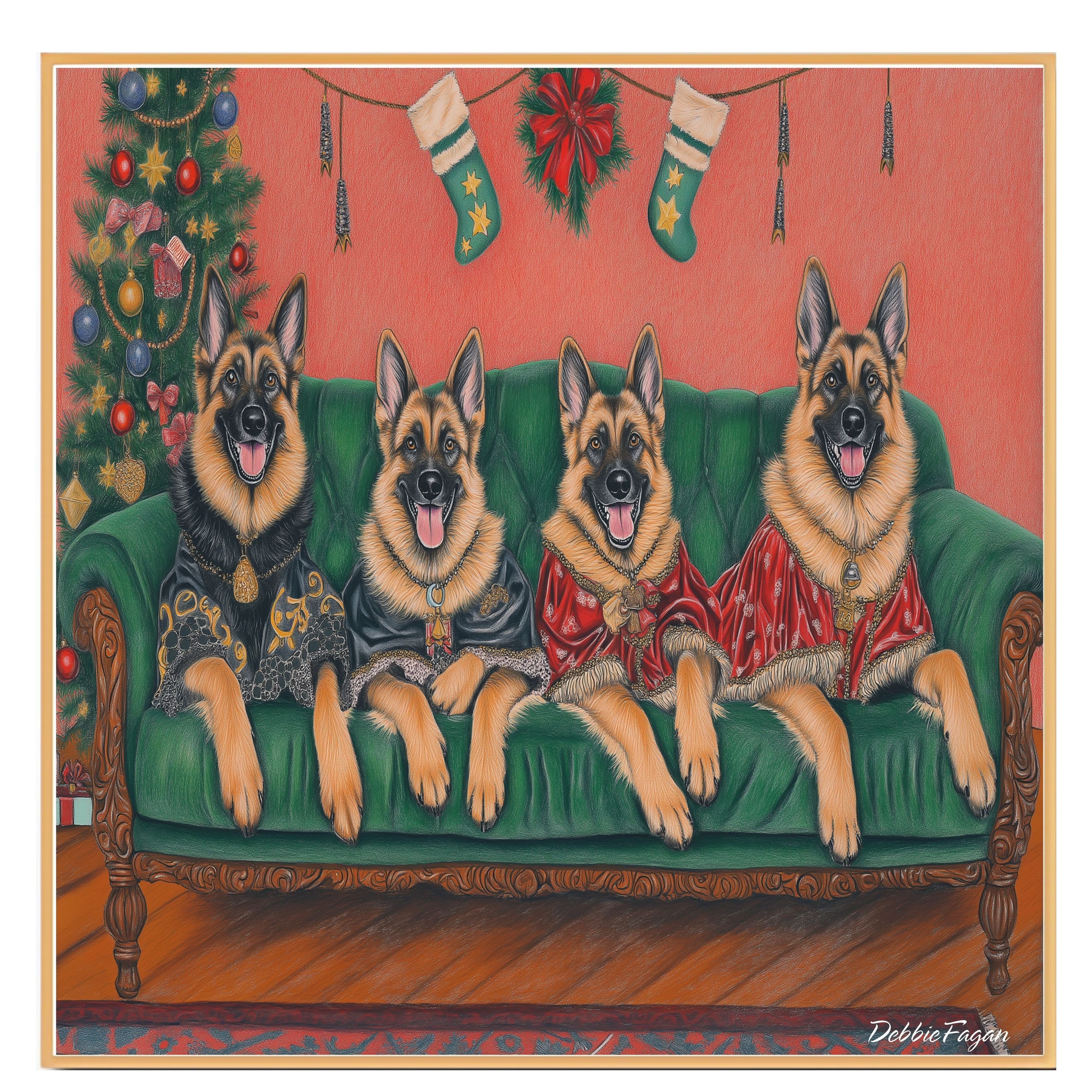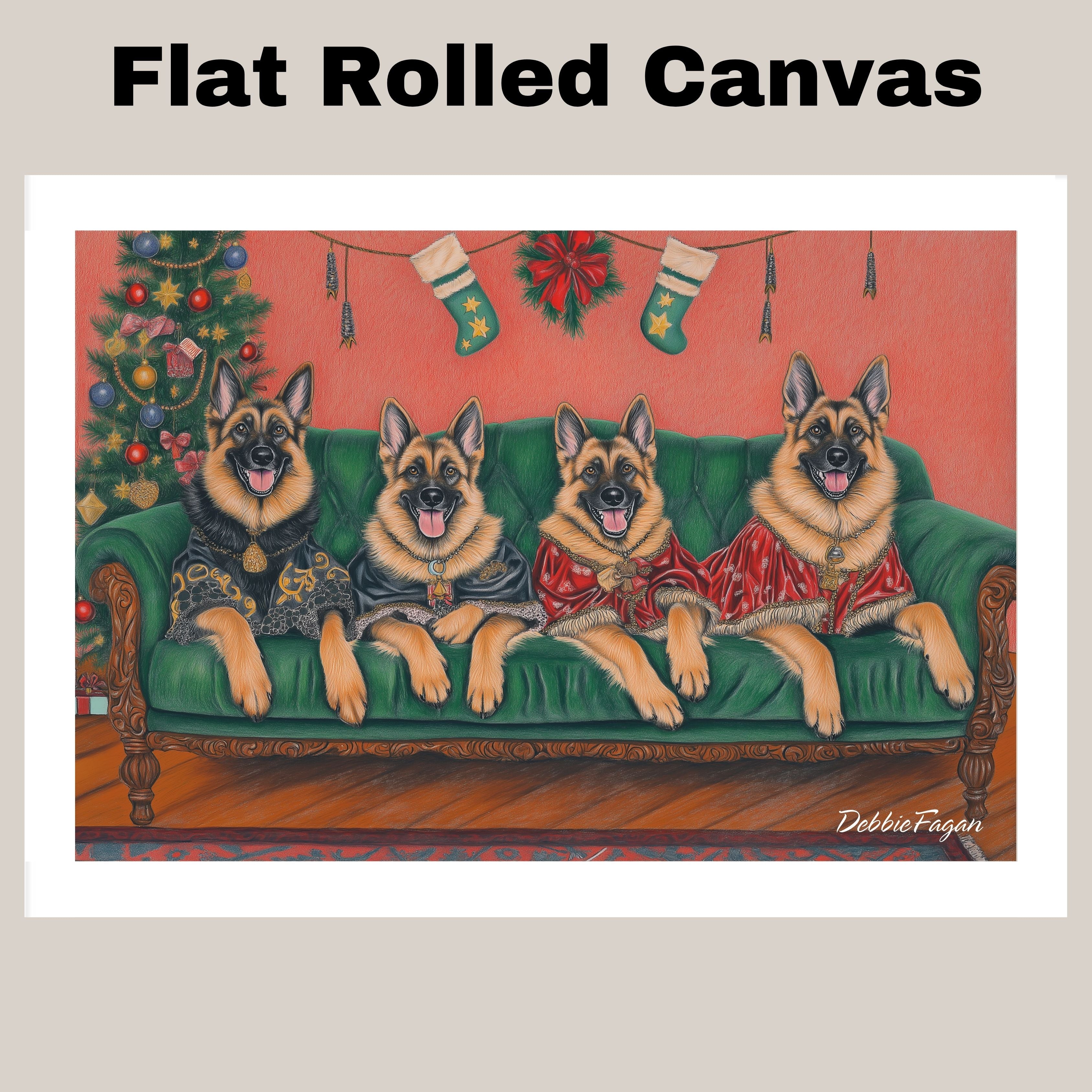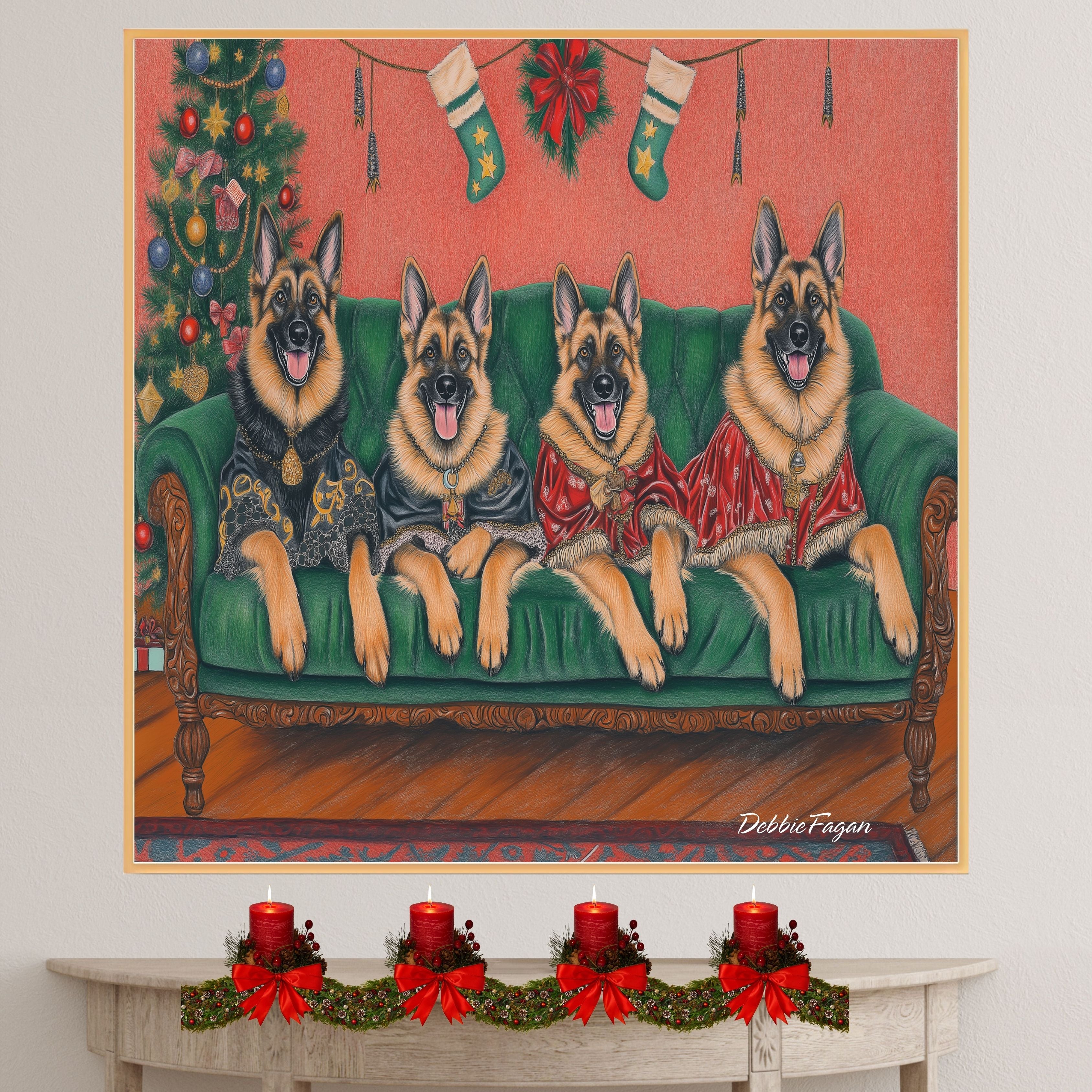 Our Victorian Yuletide Splendor Canvas adds a touch of festive elegance and timeless charm to your space, featuring majestic German Shepherds posed amidst a beautifully adorned winter wonderland. Set against a vintage-inspired backdrop with ornate holiday decor and a dusting of snow, this heartwarming scene captures the grace and strength of these noble dogs in the spirit of the season. Available on a 1.5" thick canvas wrap, floating framed canvas, or as a flat rolled canvas, this stunning artwork embodies seasonal warmth and classic style. Perfect for creating a festive focal point, it brings joy and sophistication to any holiday decor.