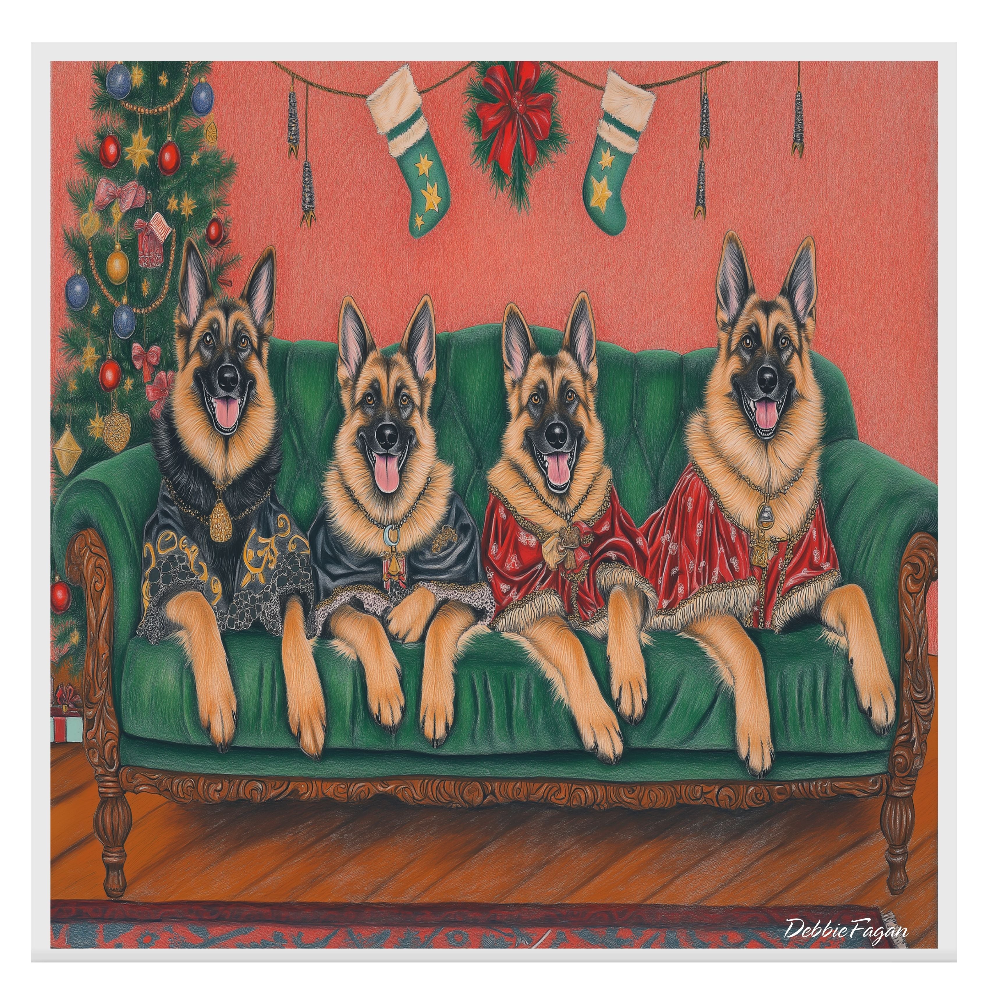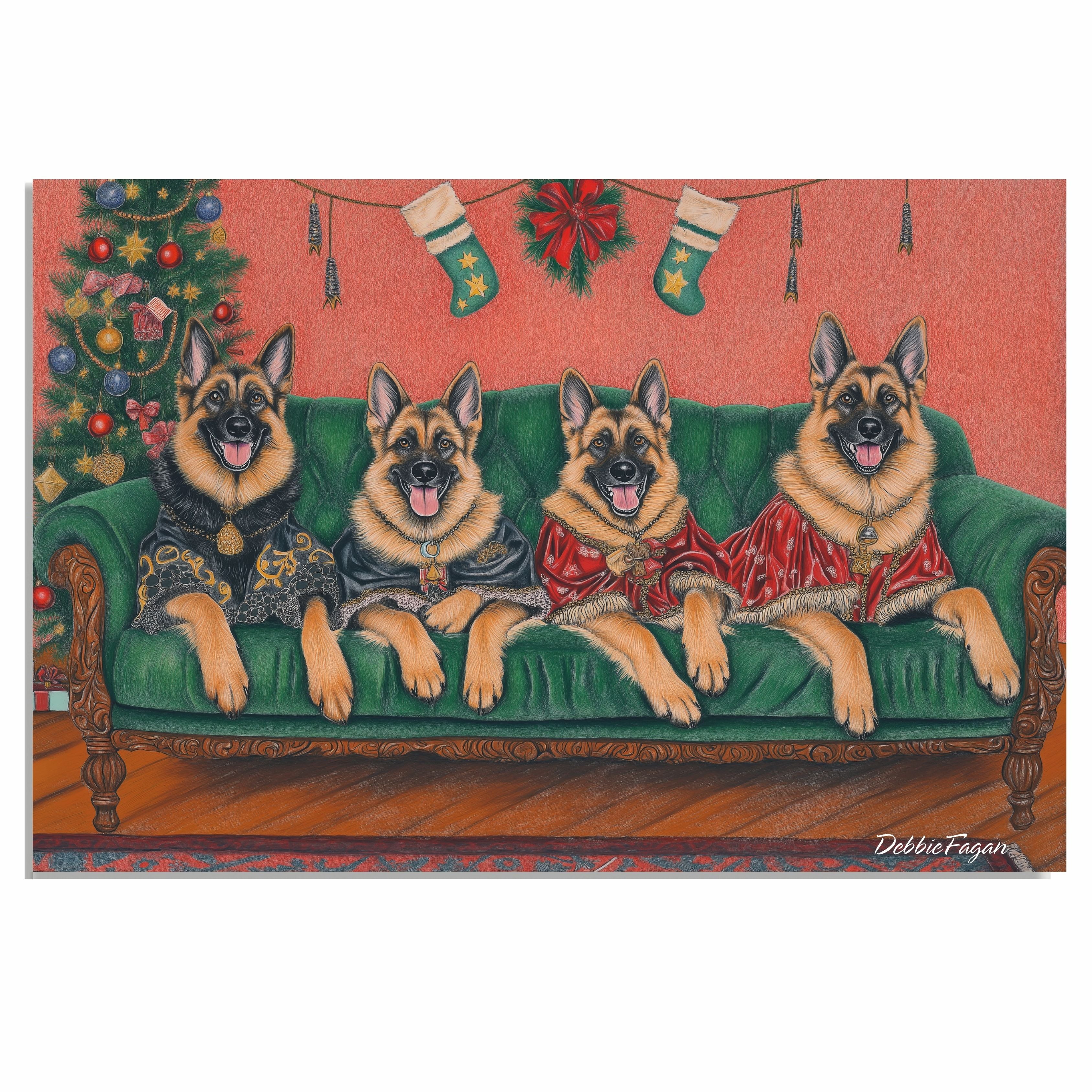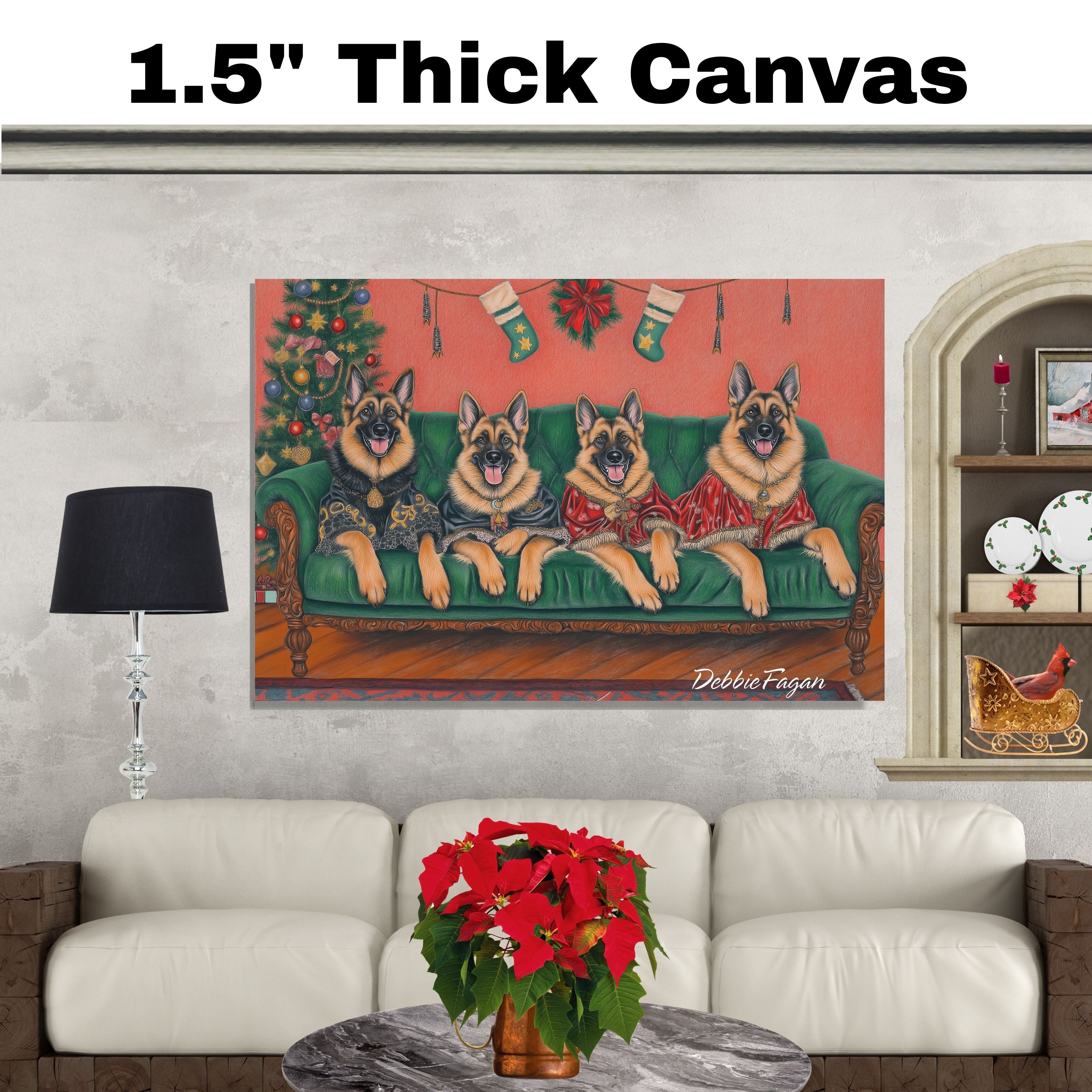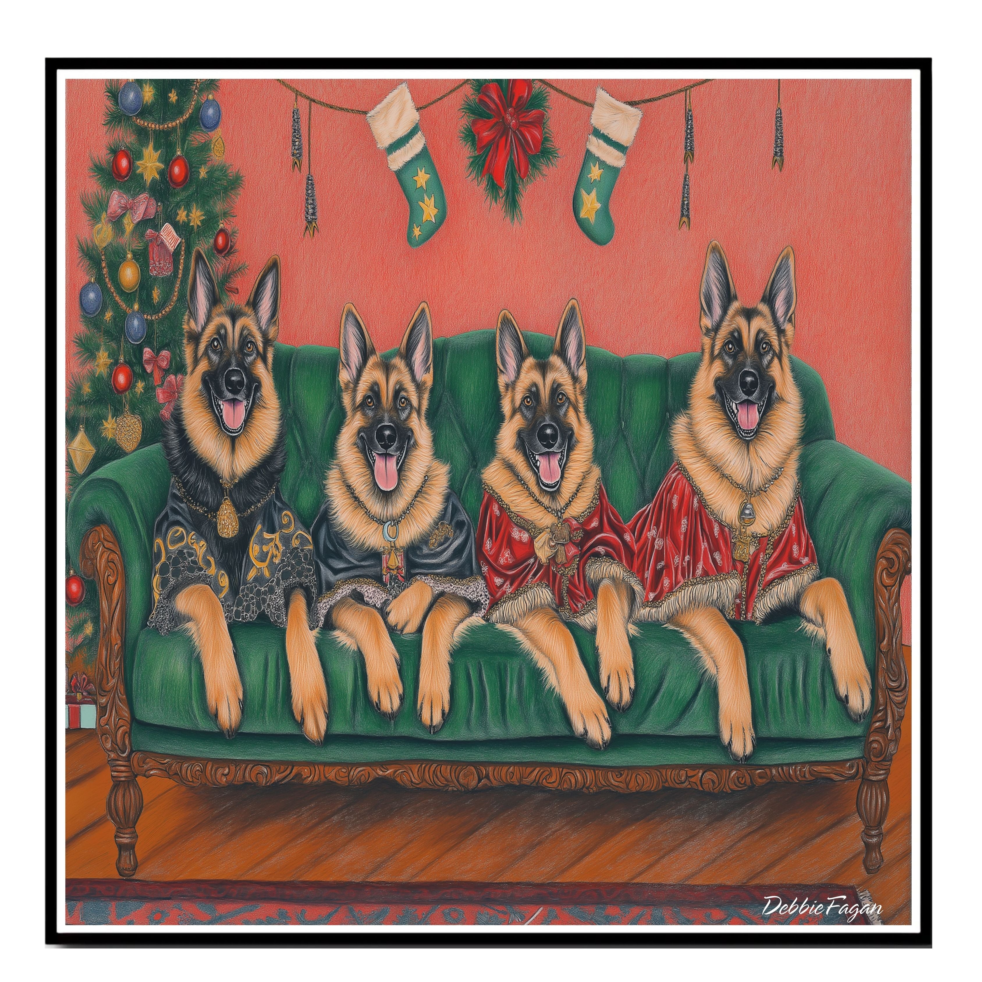 Our Victorian Yuletide Splendor Canvas adds a touch of festive elegance and timeless charm to your space, featuring majestic German Shepherds posed amidst a beautifully adorned winter wonderland. Set against a vintage-inspired backdrop with ornate holiday decor and a dusting of snow, this heartwarming scene captures the grace and strength of these noble dogs in the spirit of the season. Available on a 1.5" thick canvas wrap, floating framed canvas, or as a flat rolled canvas, this stunning artwork embodies seasonal warmth and classic style. Perfect for creating a festive focal point, it brings joy and sophistication to any holiday decor.