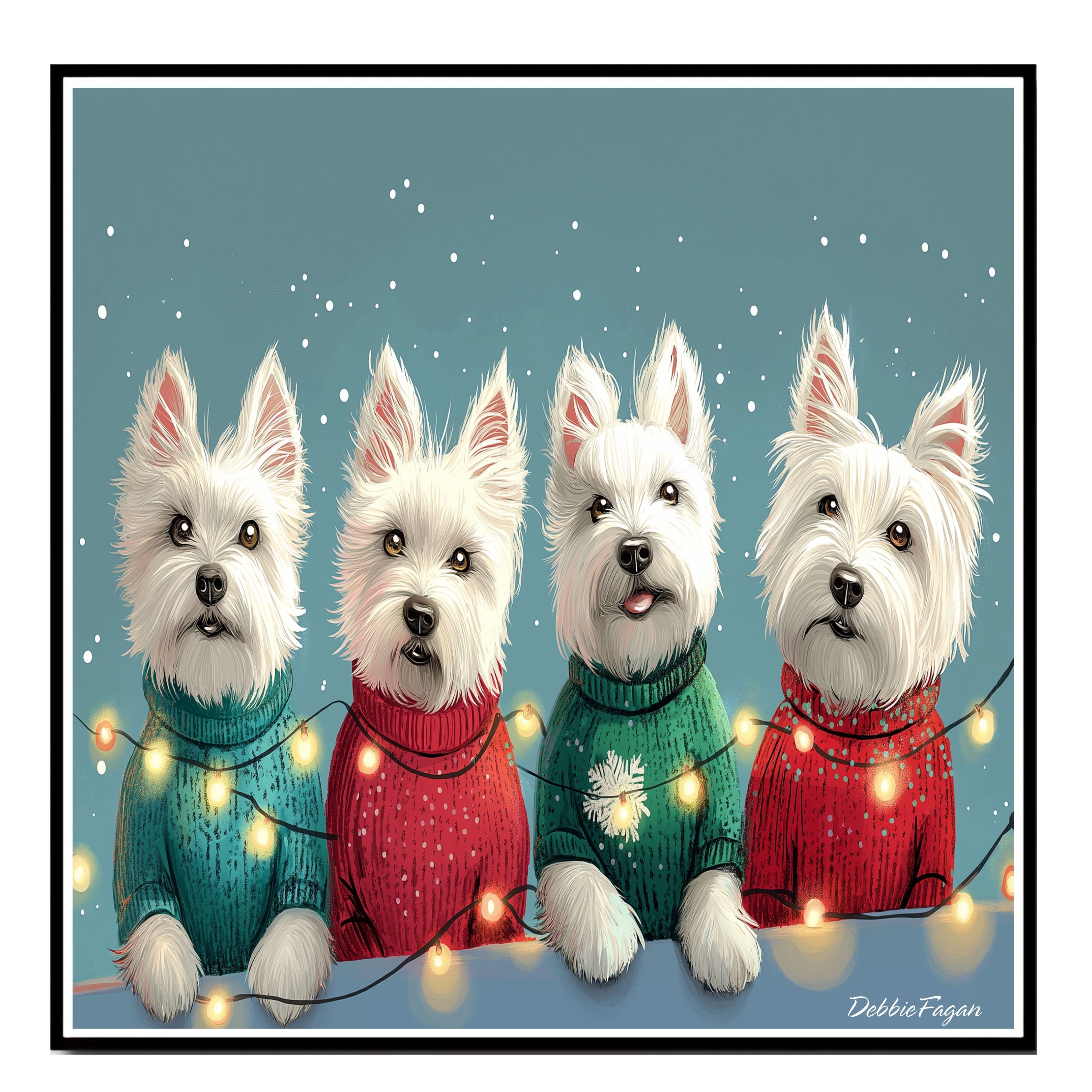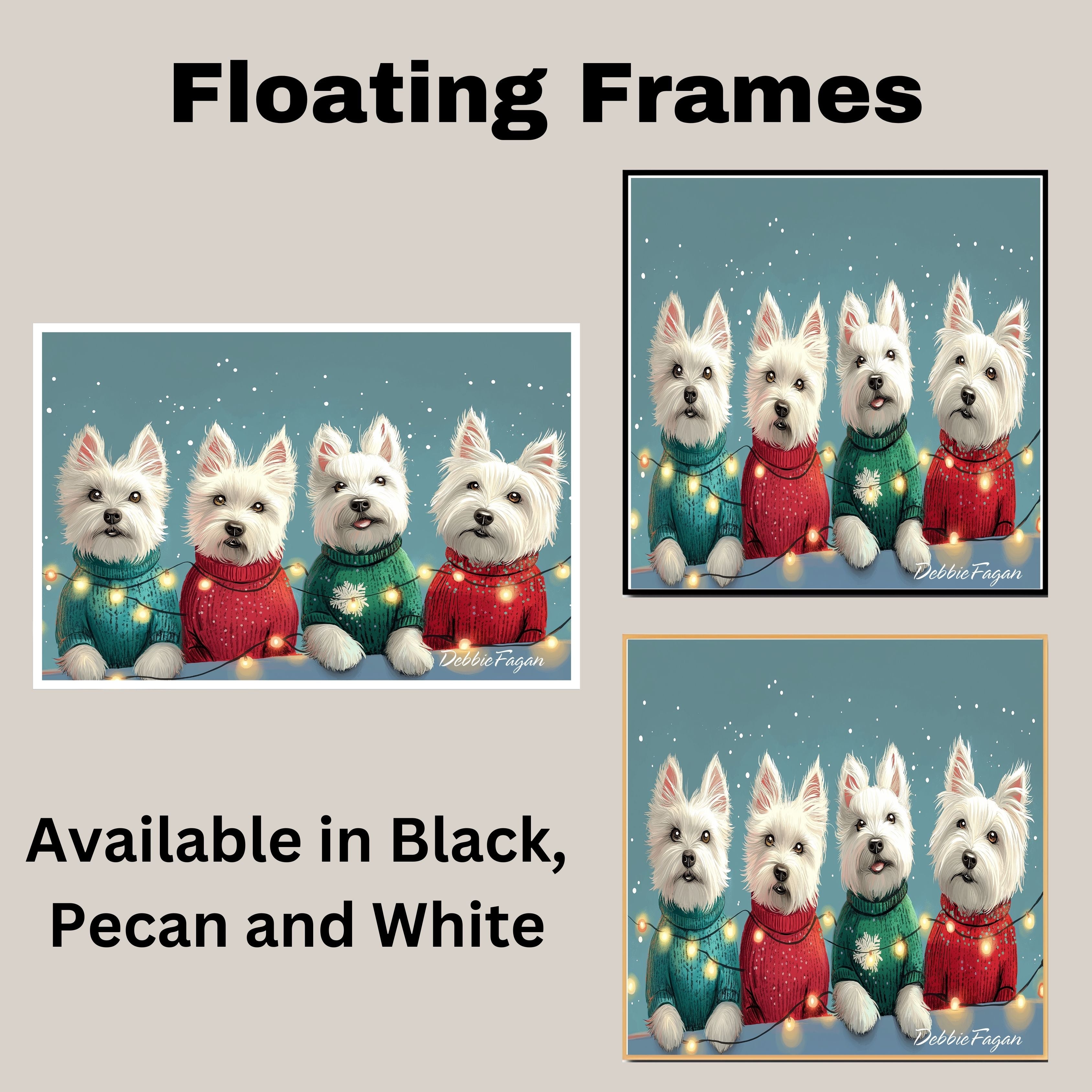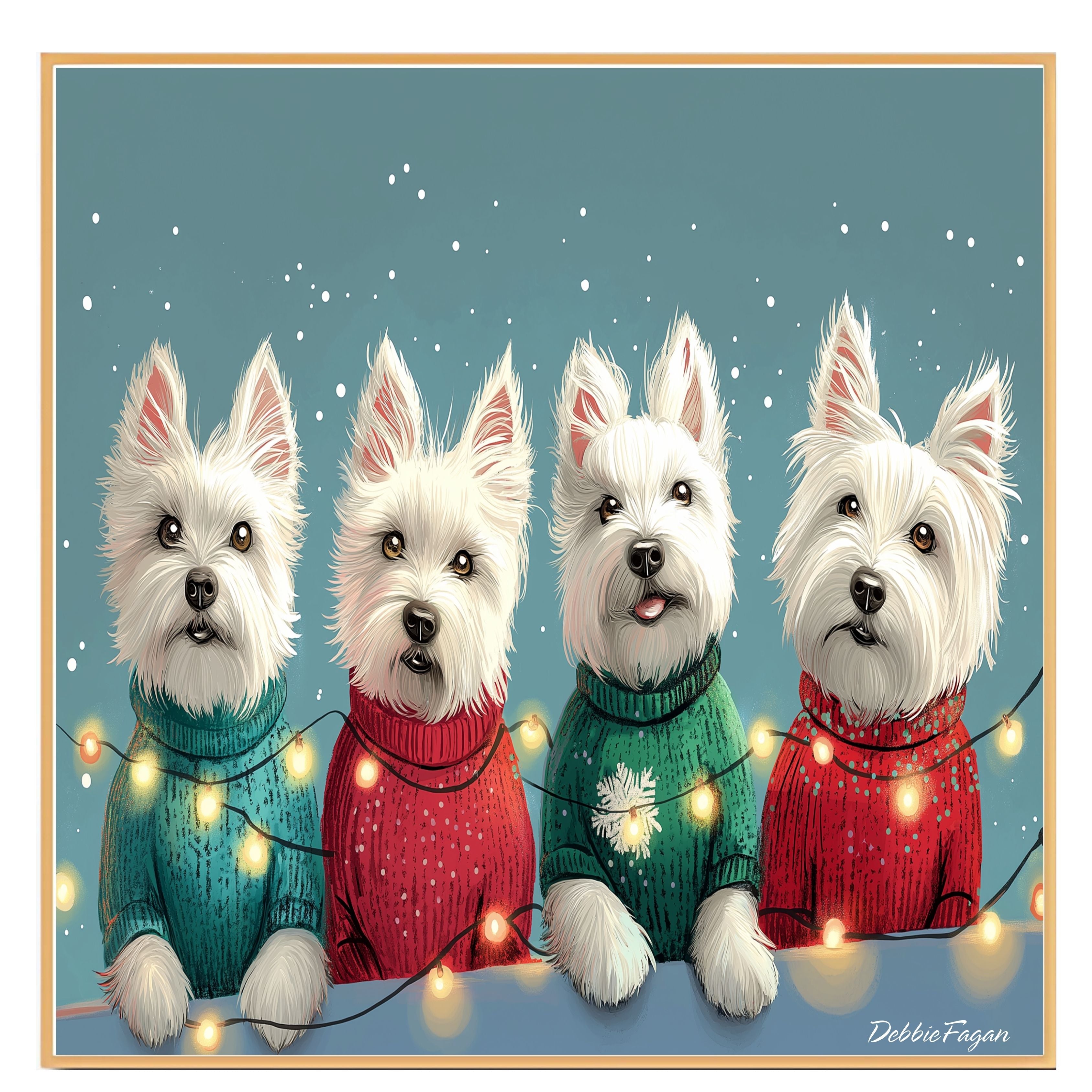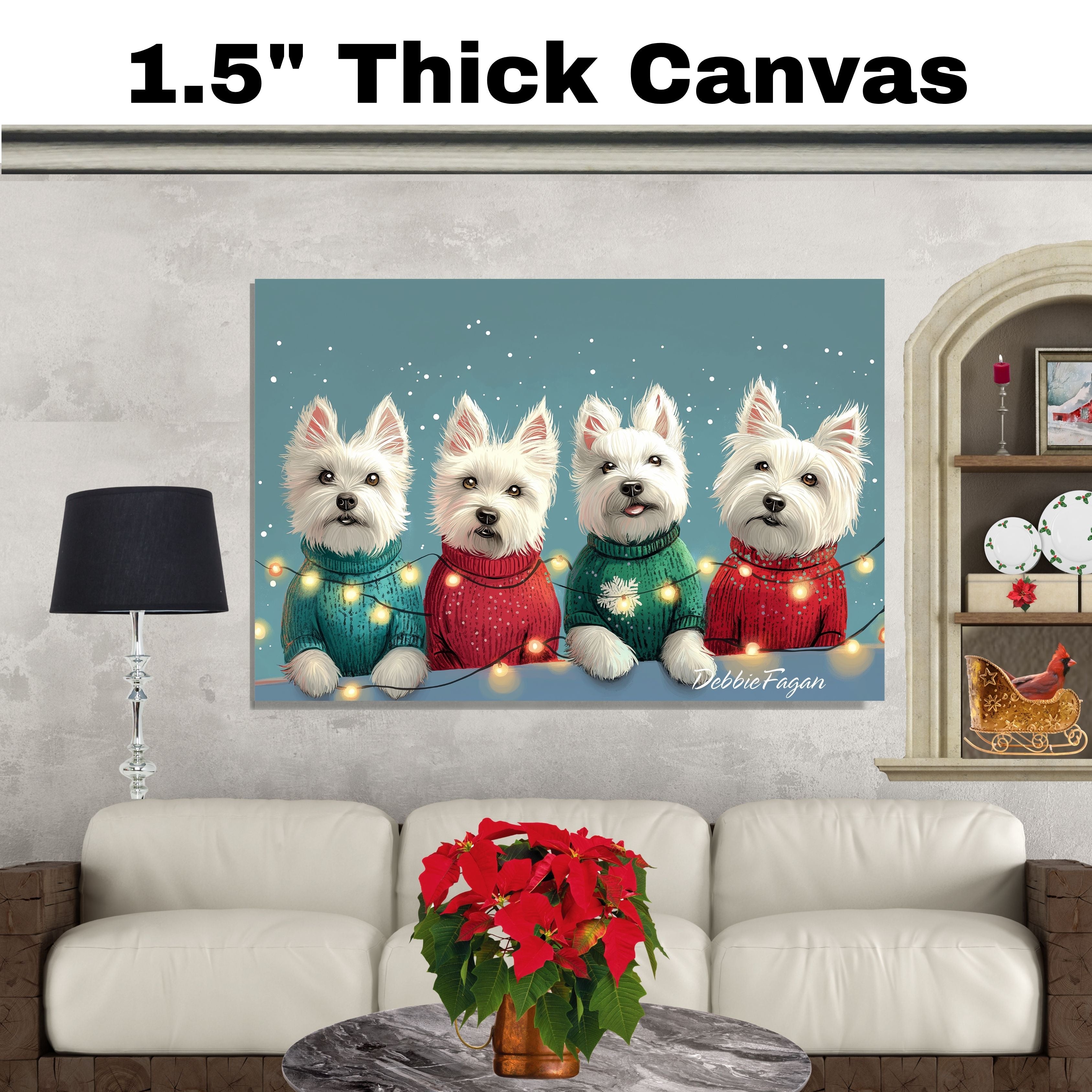 Our Westie Wonderland Canvas adds a touch of festive joy to your home, featuring playful West Highland Terriers wrapped in twinkling Christmas lights and sporting cozy festive sweaters. Set against a cheerful backdrop of holiday cheer, this heartwarming artwork titled Westie Wonderland captures the spirit of the season in a fun and vibrant way. Available on a 1.5" thick canvas wrap, floating framed canvas, or as a flat rolled canvas, this delightful piece is perfect for brightening your holiday decor and bringing smiles to all who see it. Whether hanging in the living room or adding charm to your entryway, its a playful and eye-catching focal point for any space.