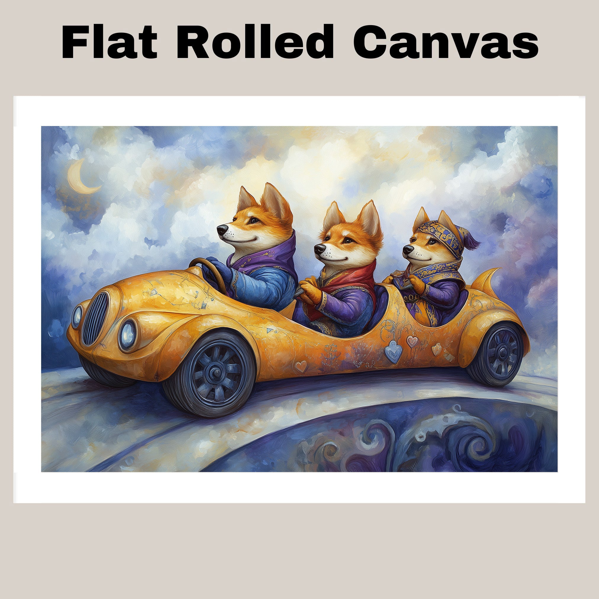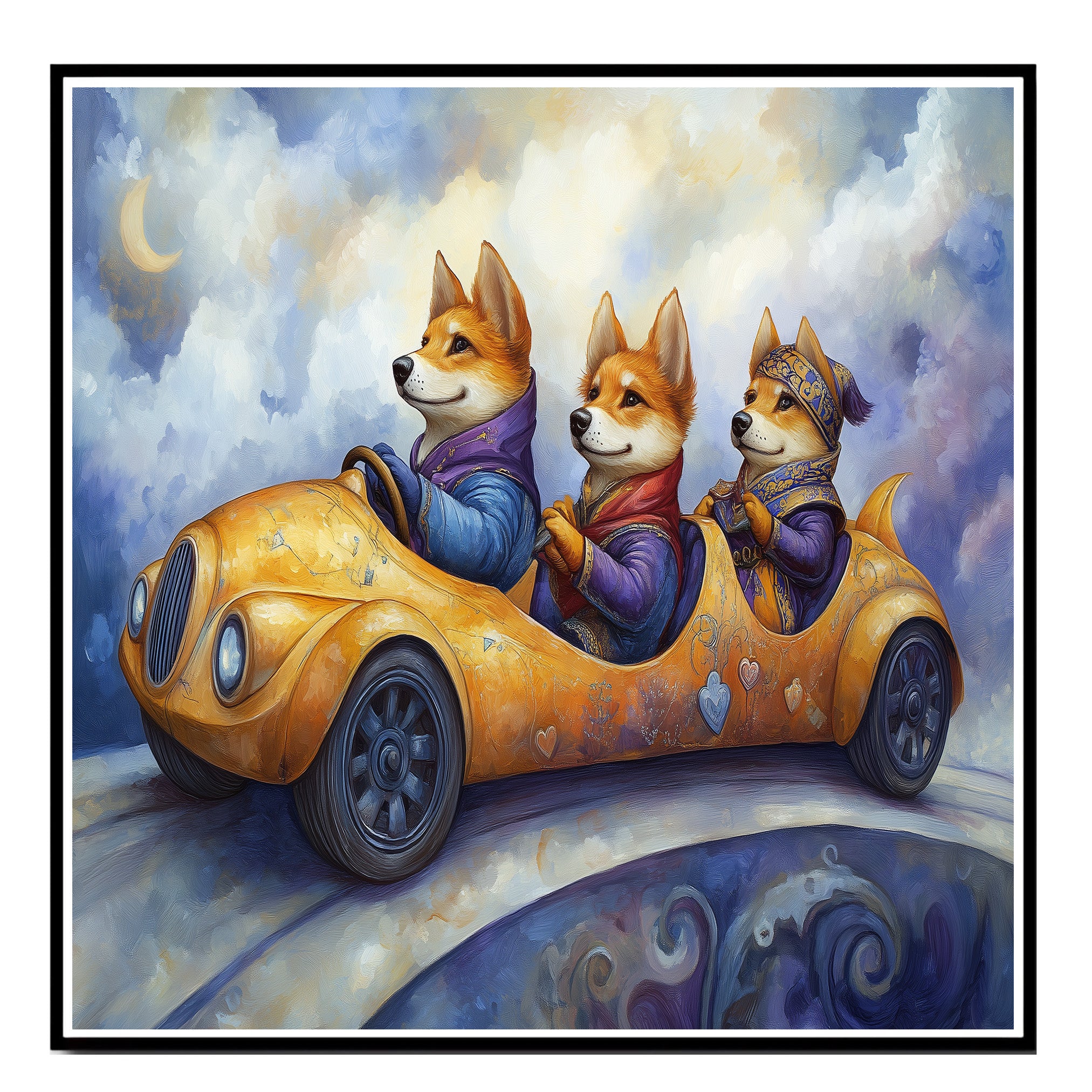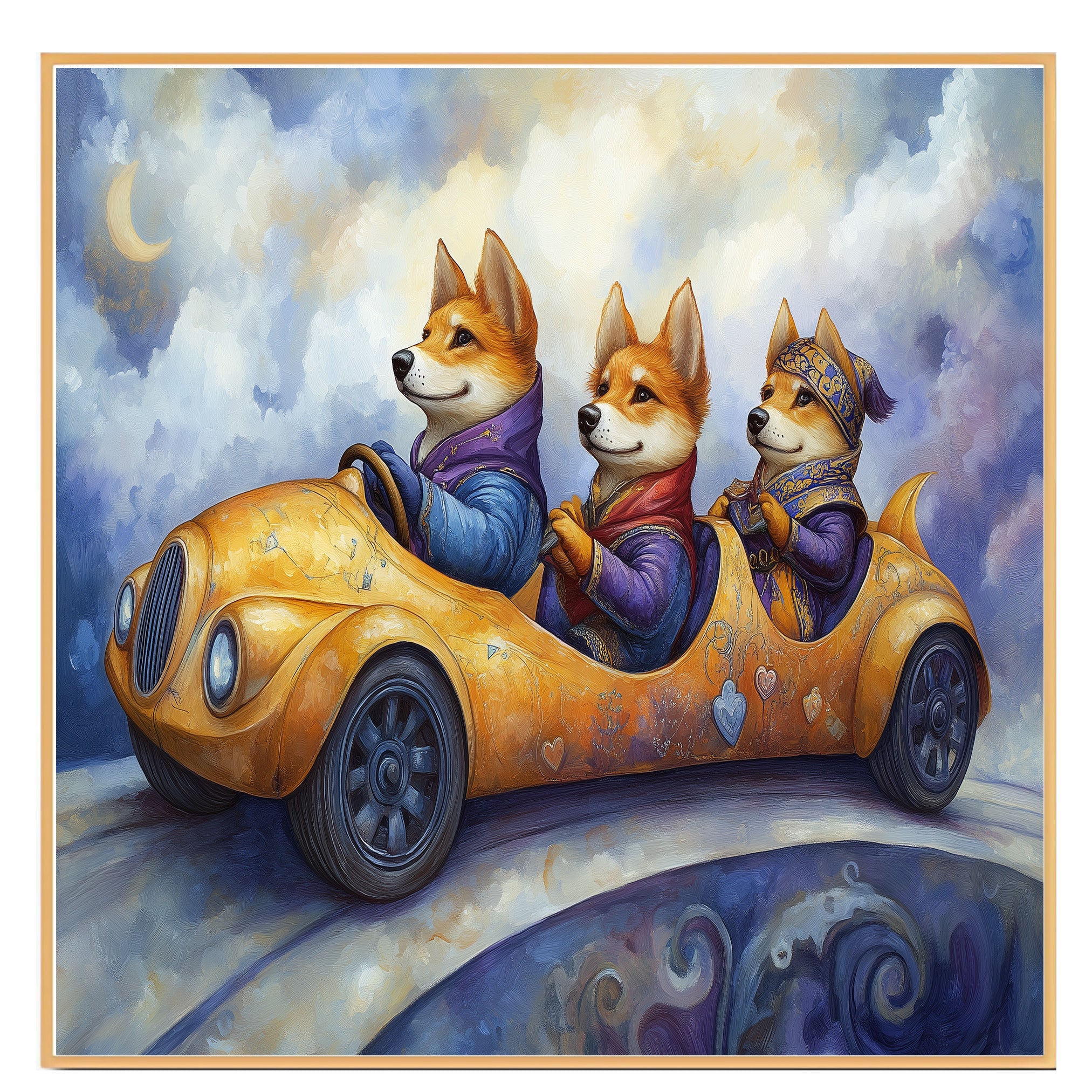 Elevate your space with this enchanting artwork featuring three adorable dogs dressed in steampunk outfits soaring through dreamy skies in a colorful airship. This vibrant fantasy piece is perfect for animal lovers, adventure enthusiasts, and fans of imaginative, whimsical worlds. A delightful addition to children's rooms, creative spaces, or any area in need of a joyful and uplifting touch.
