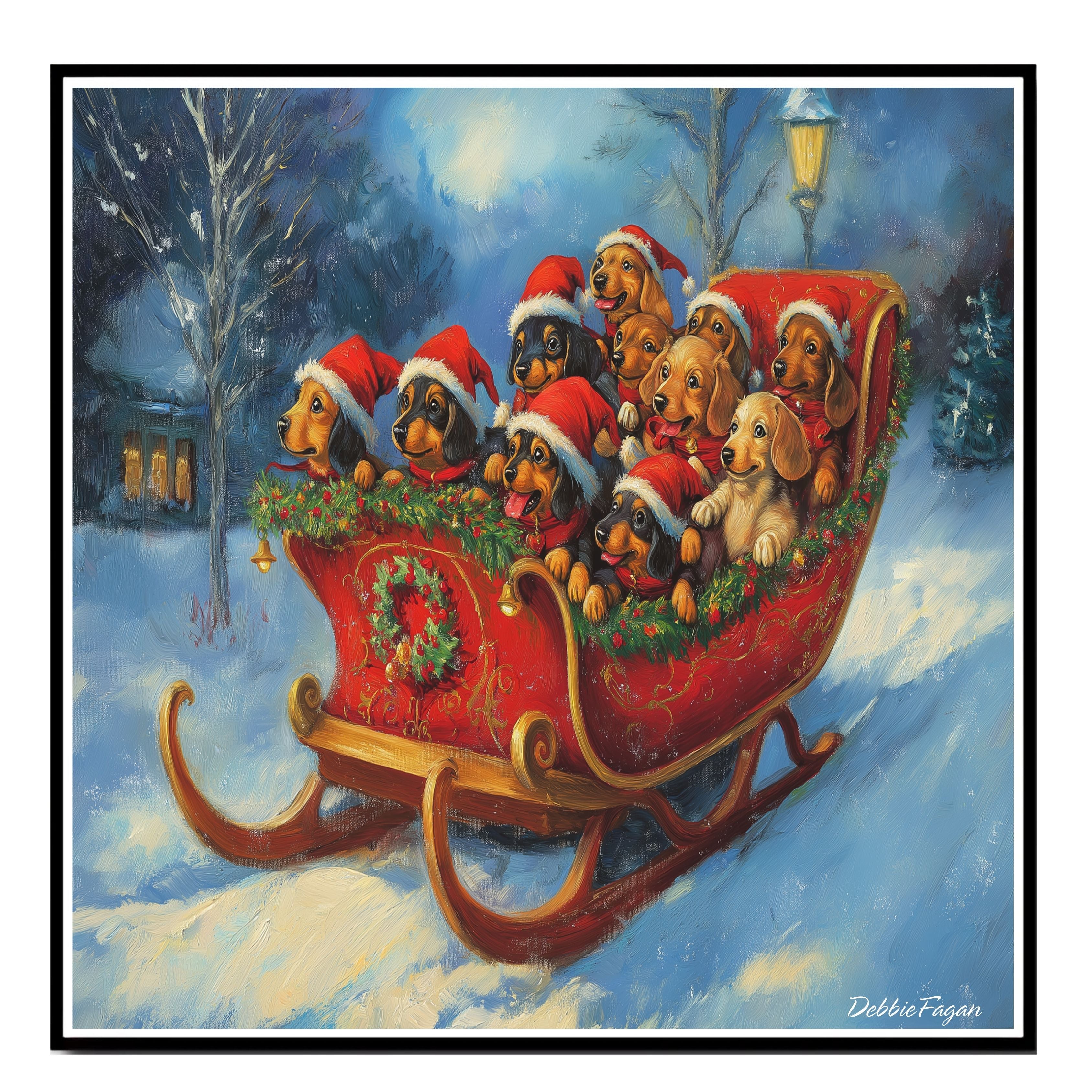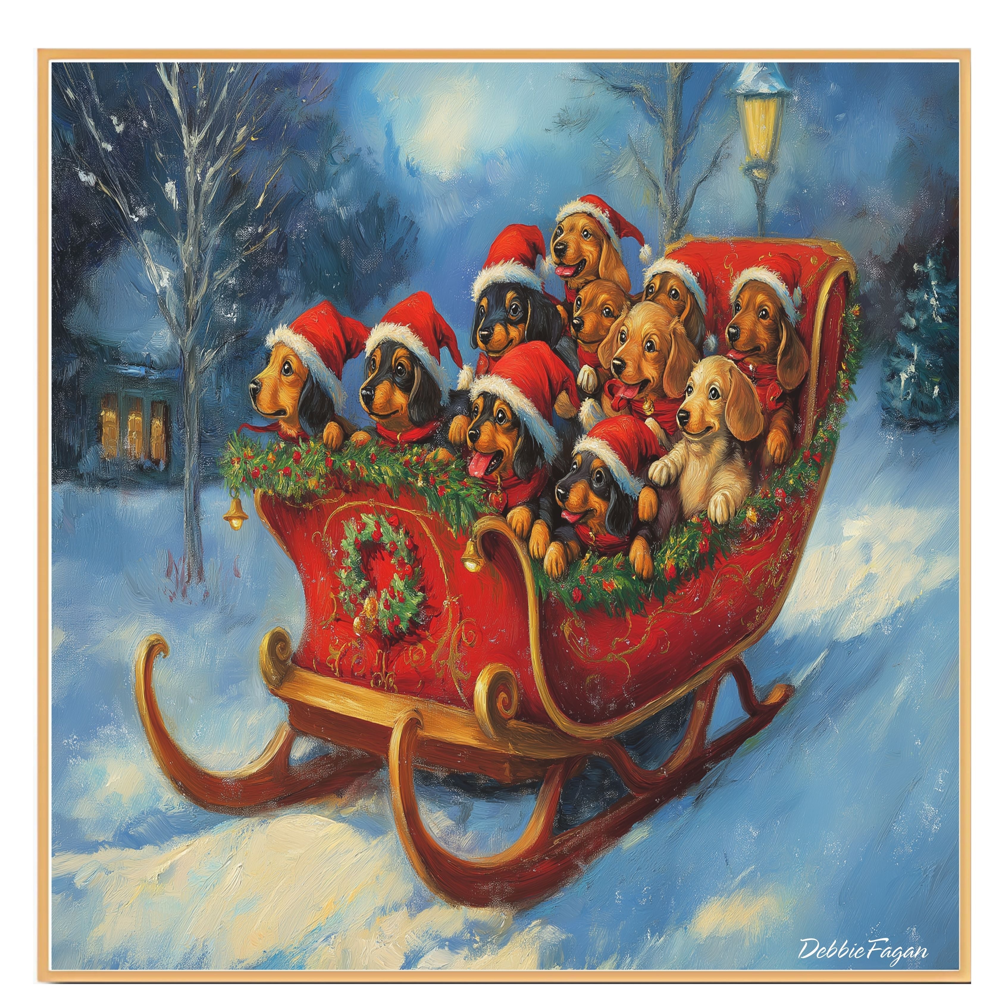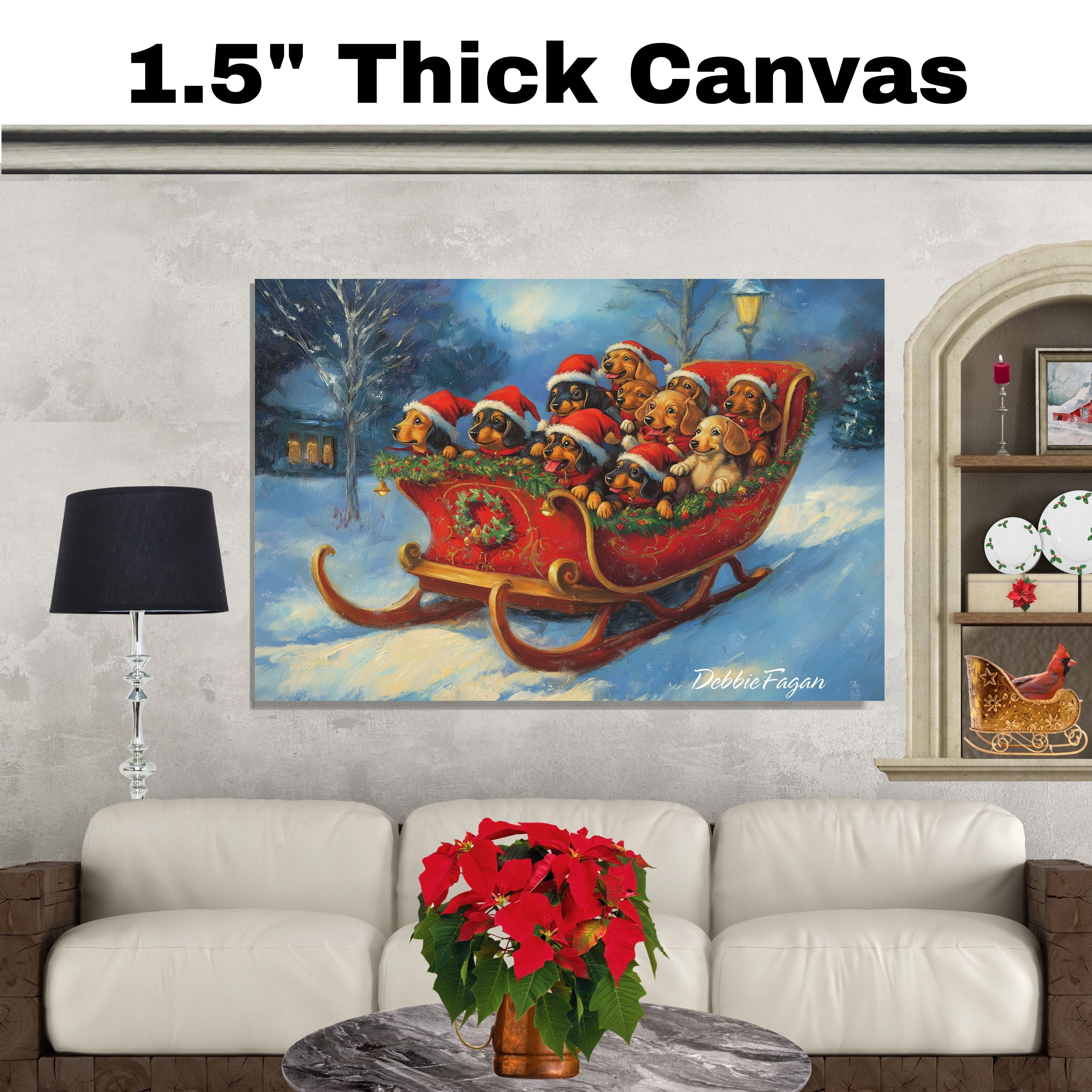 Dachshund Puppies in Santa Hats Sleighing Adventure Painting Our Doxie Christmas Canvas adds a touch of holiday...