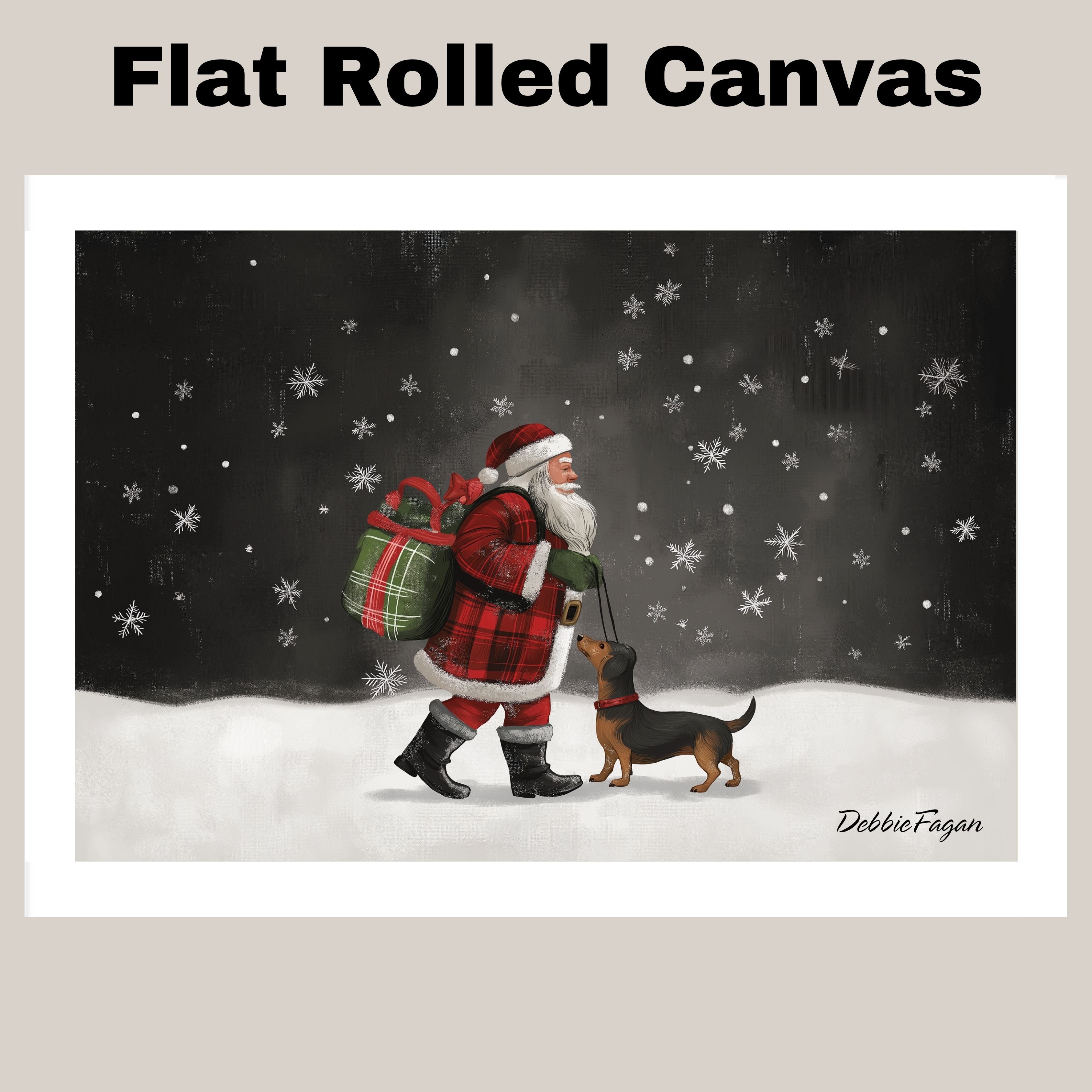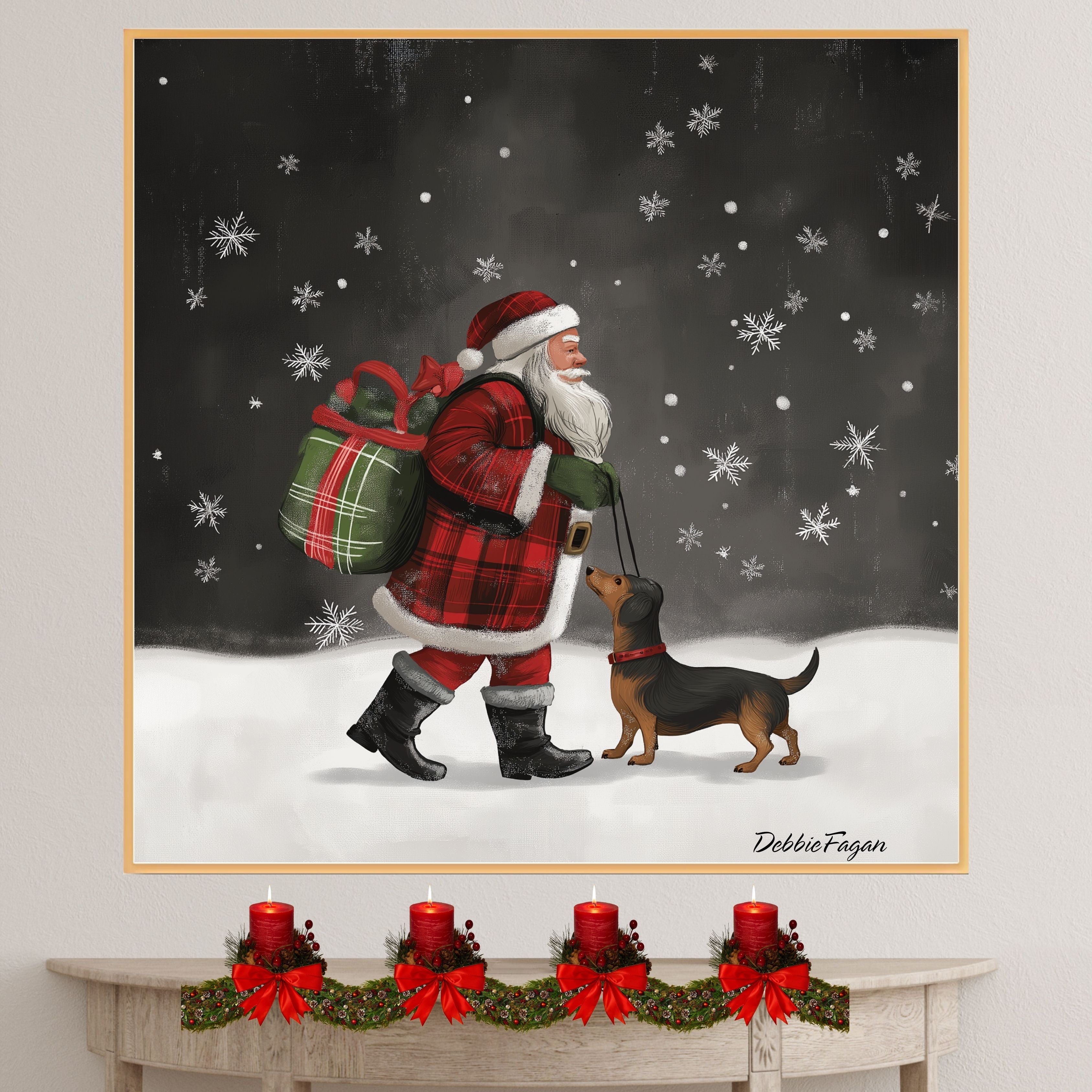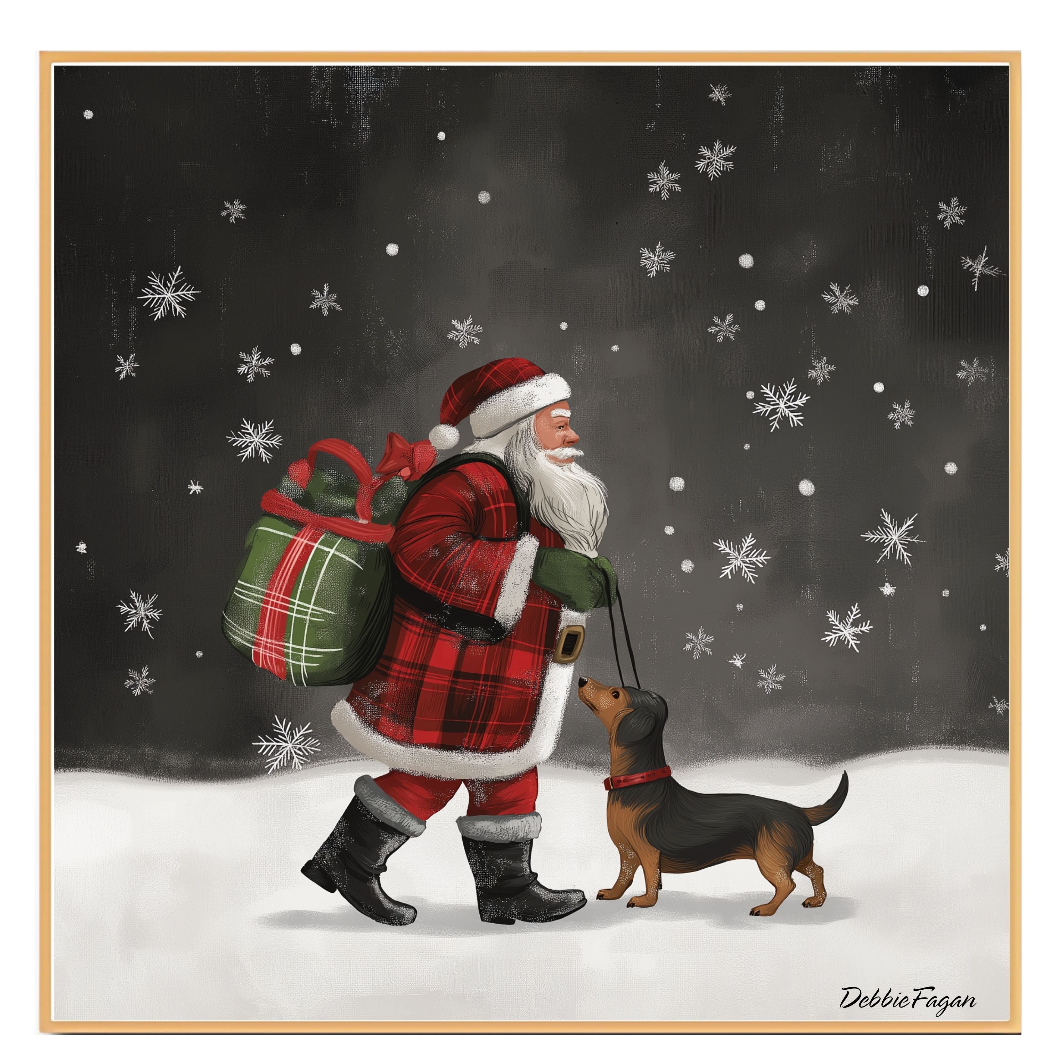Our Doxie Christmas Canvas - 'Snowy Adventure' adds a touch of festive charm and whimsy to your space, featuring an adorable Dachshund dressed as Santa, ready to embark on a snowy winter adventure. Set against a tranquil snowy backdrop, this playful scene captures the joyful spirit of the holiday season. Available on a 1.5" thick canvas wrap, floating framed canvas, or as a flat rolled canvas, this delightful piece titled 'Snowy Adventure' is perfect for bringing warmth and cheer to your home decor. With its heartwarming blend of seasonal fun and timeless appeal, this joyful artwork makes a delightful addition to any room during the holiday season.