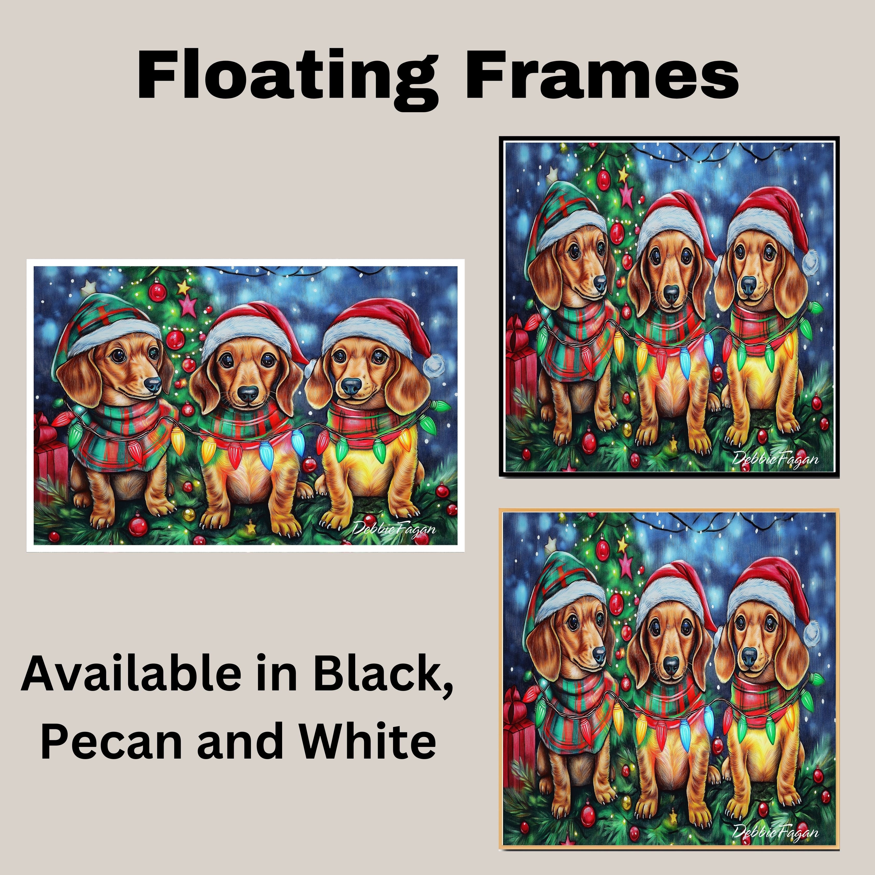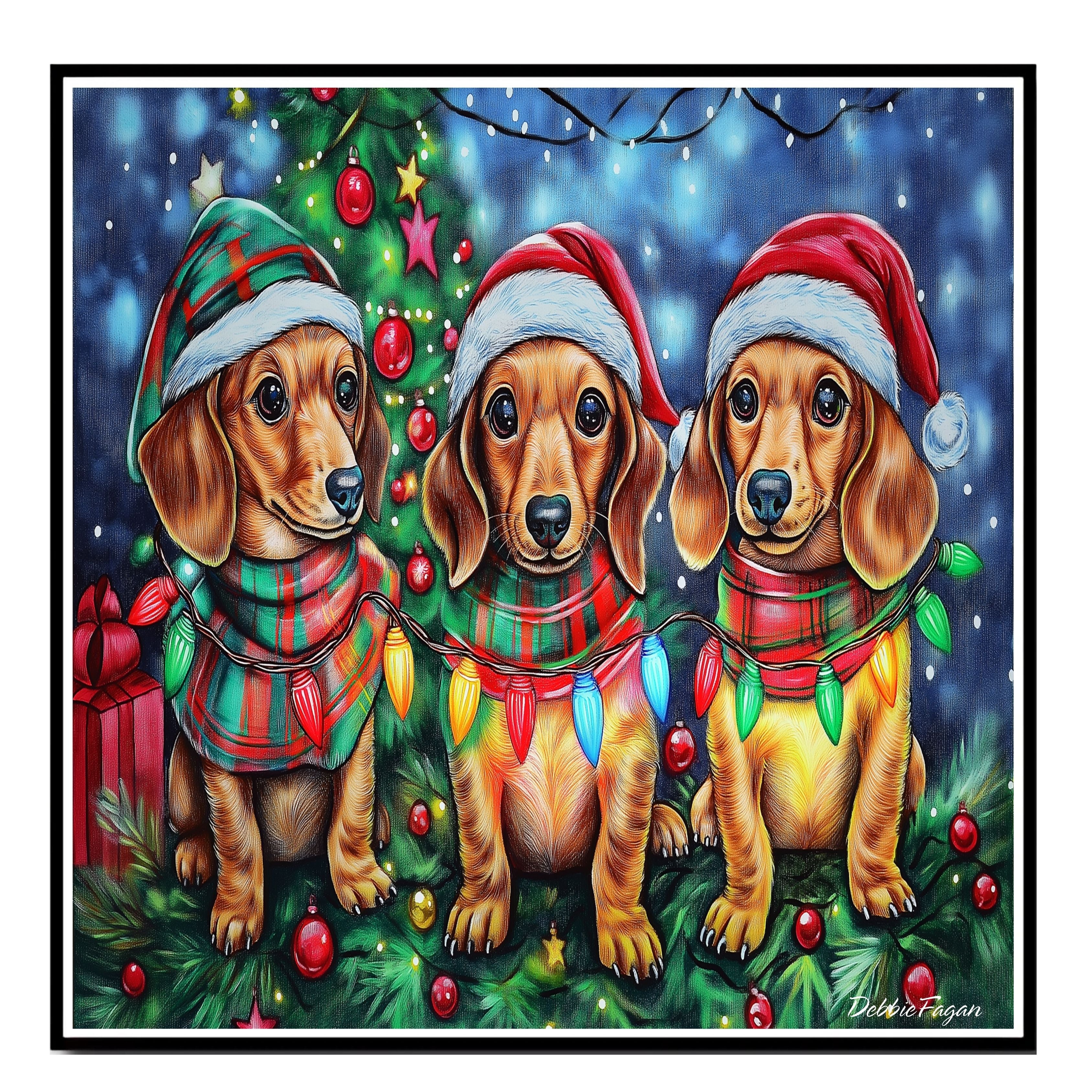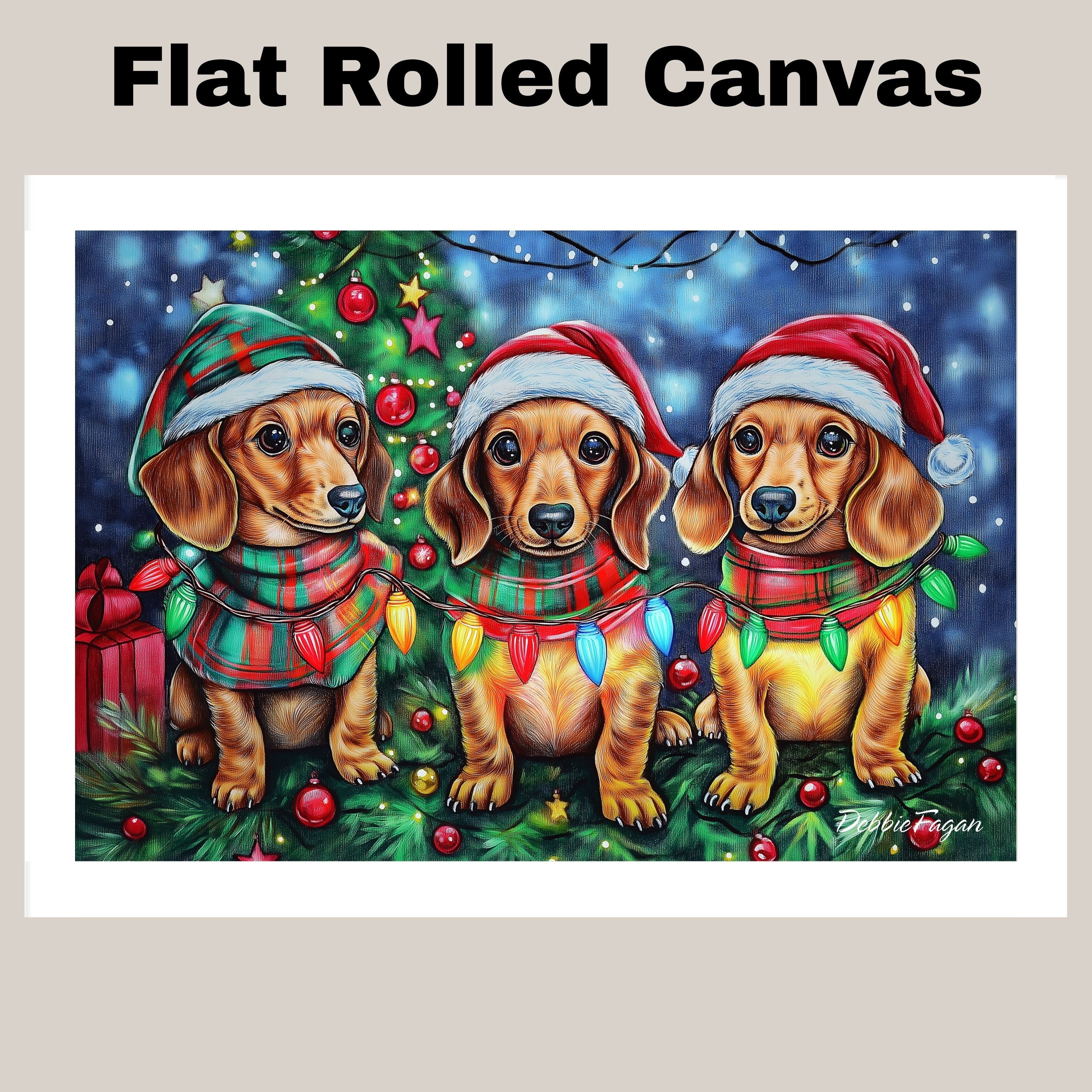 Our Doxie Christmas Canvas, titled Wiener Wonder, brings a playful touch of holiday spirit to your decor, featuring adorable Dachshunds bundled up in cozy winter wear and adorned with twinkling Christmas lights. Set against a softly frosted backdrop, these charming pups capture the warmth and joy of the season. Available in a 1.5" thick canvas wrap, floating framed canvas, or as a flat rolled canvas, this heartwarming artwork is designed to be the perfect festive accent. Whether hung in a cozy living room or holiday entryway, Wiener Wonder adds a dash of holiday cheer and makes a delightful focal point in any space.