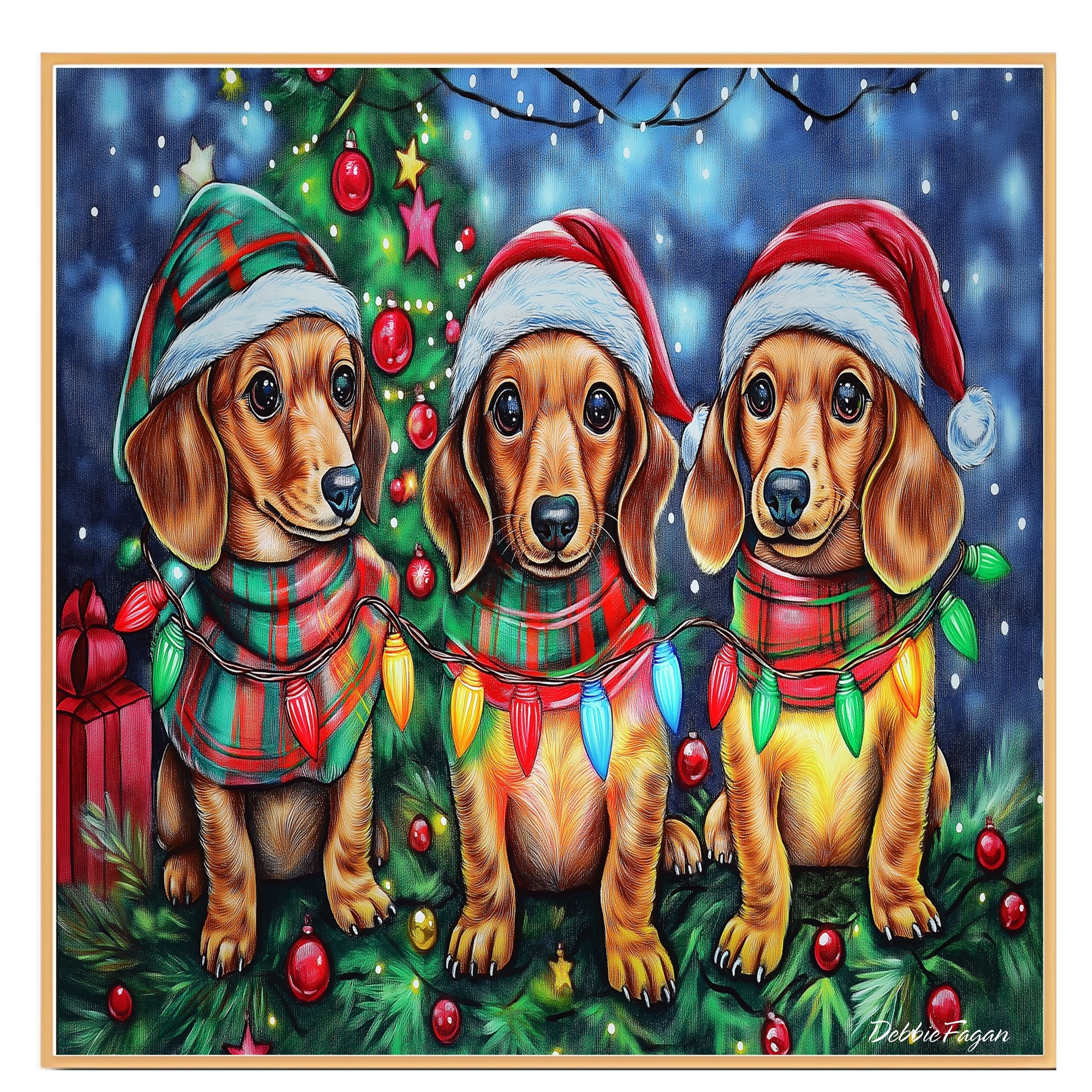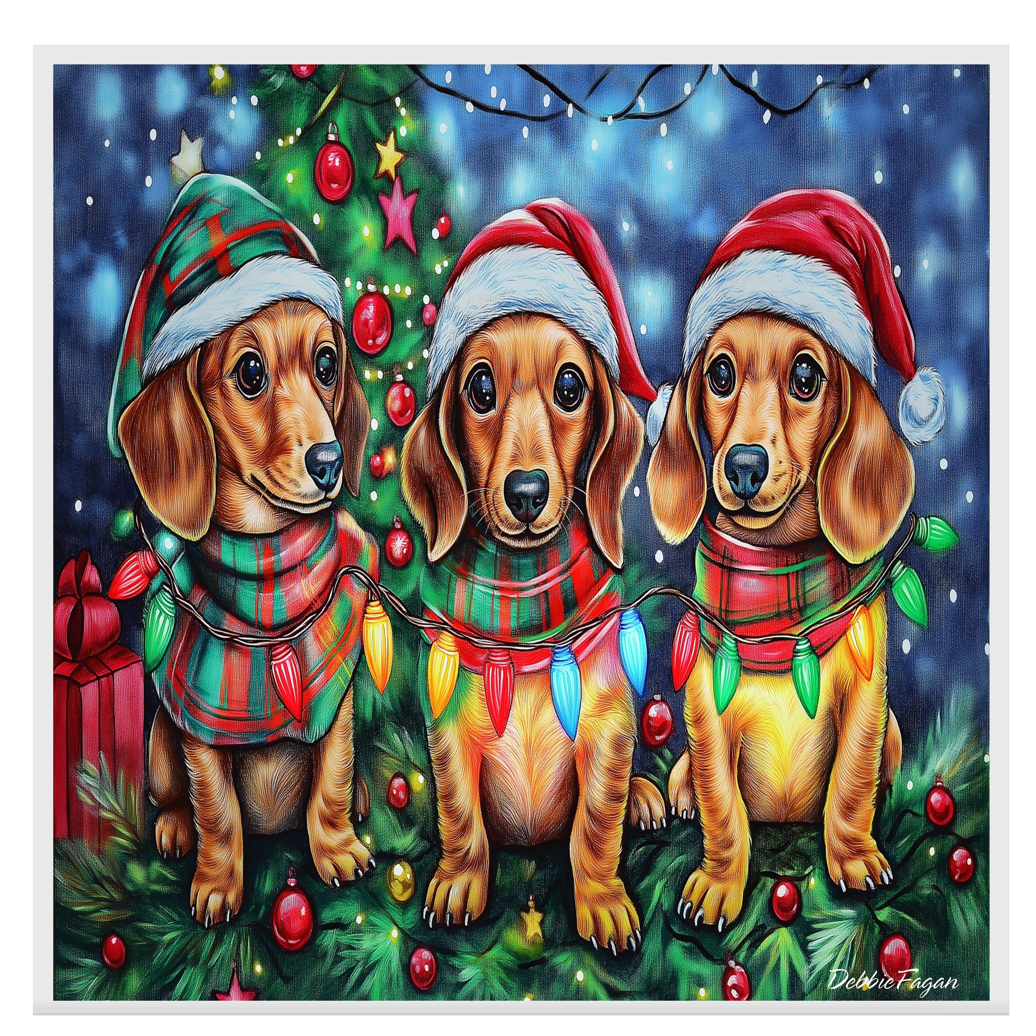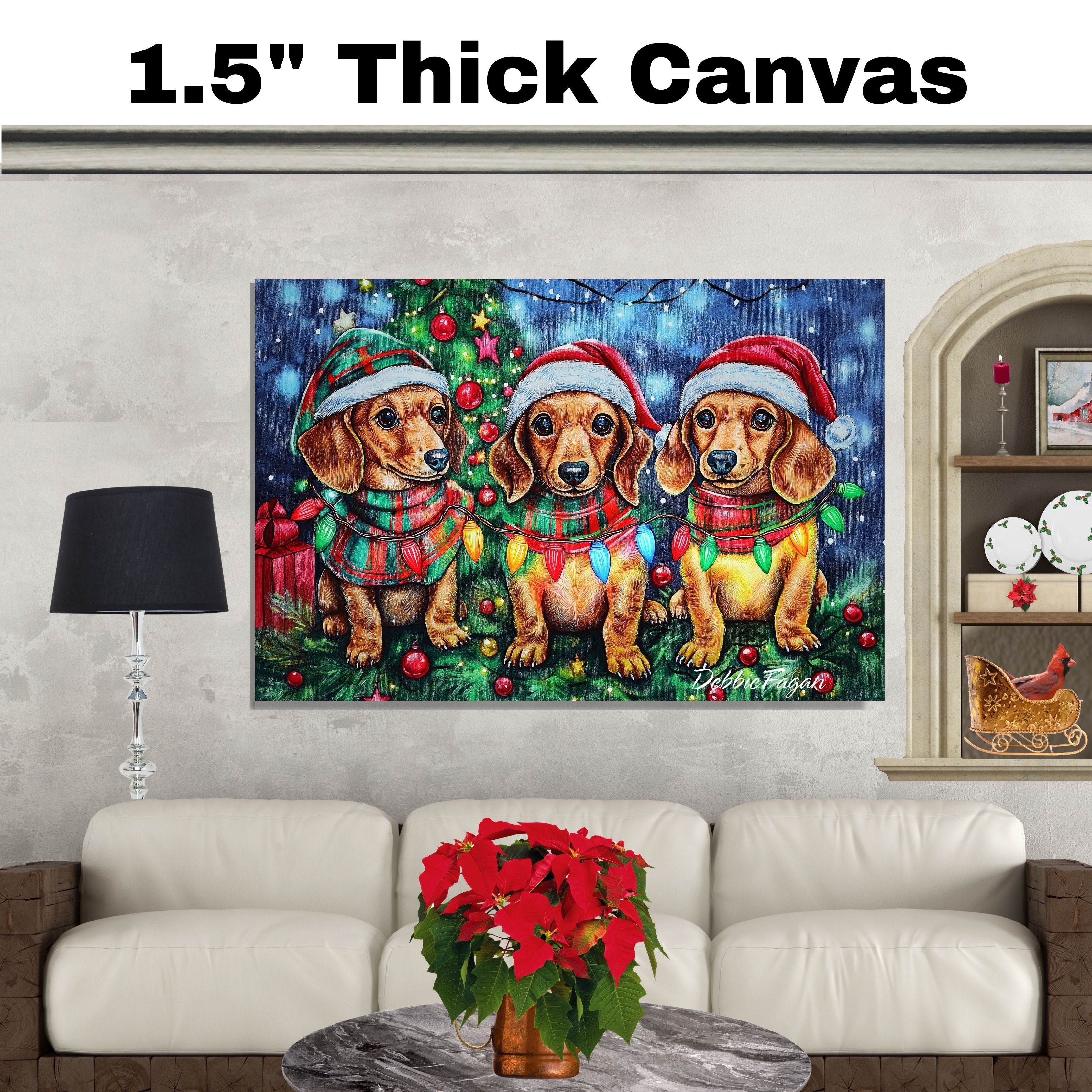 Doxie Christmas Canvas - "Wiener Wonder" - Festive Pups in Cozy Winter Wear Dressed with Twinkling Christmas Lights on Ready to Hang 1.5" Thick Canvas Wrap, Floating Framed Canvas, Flat Rolled Canvas
