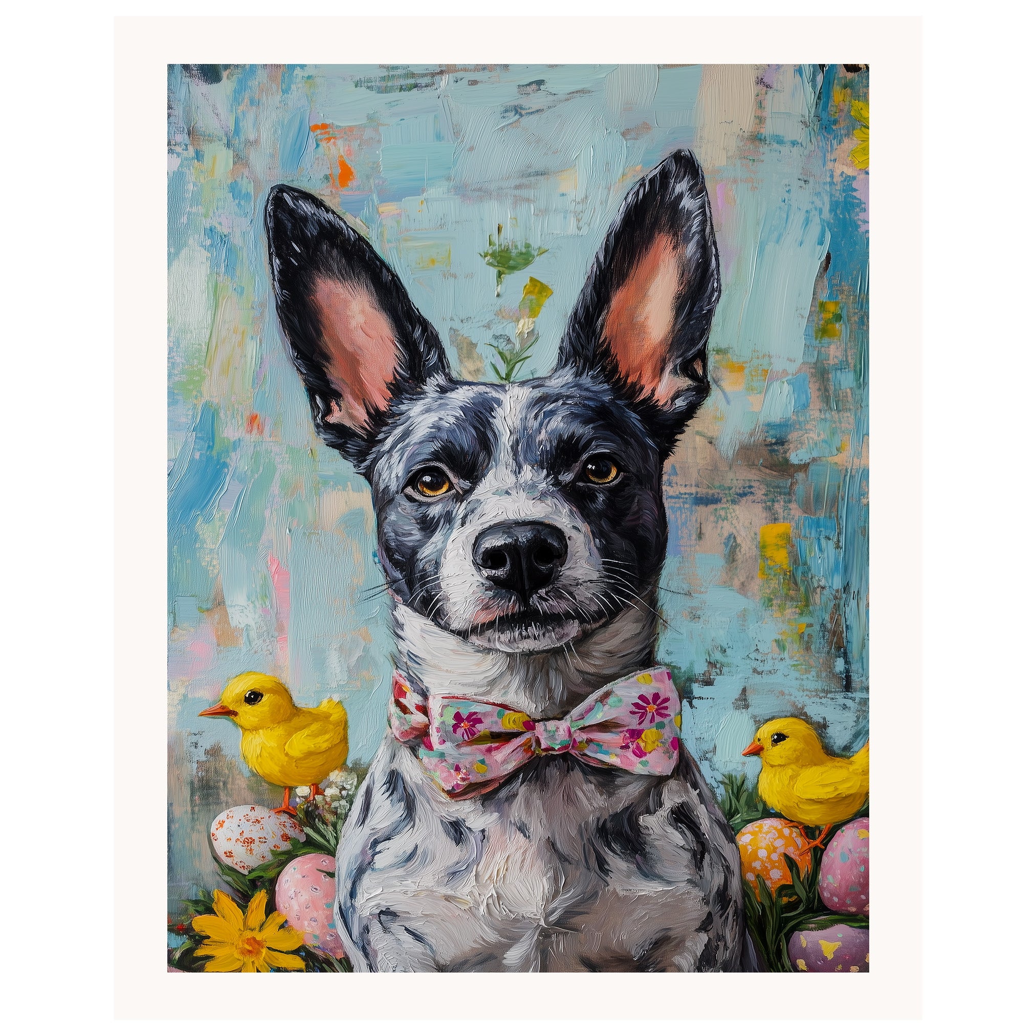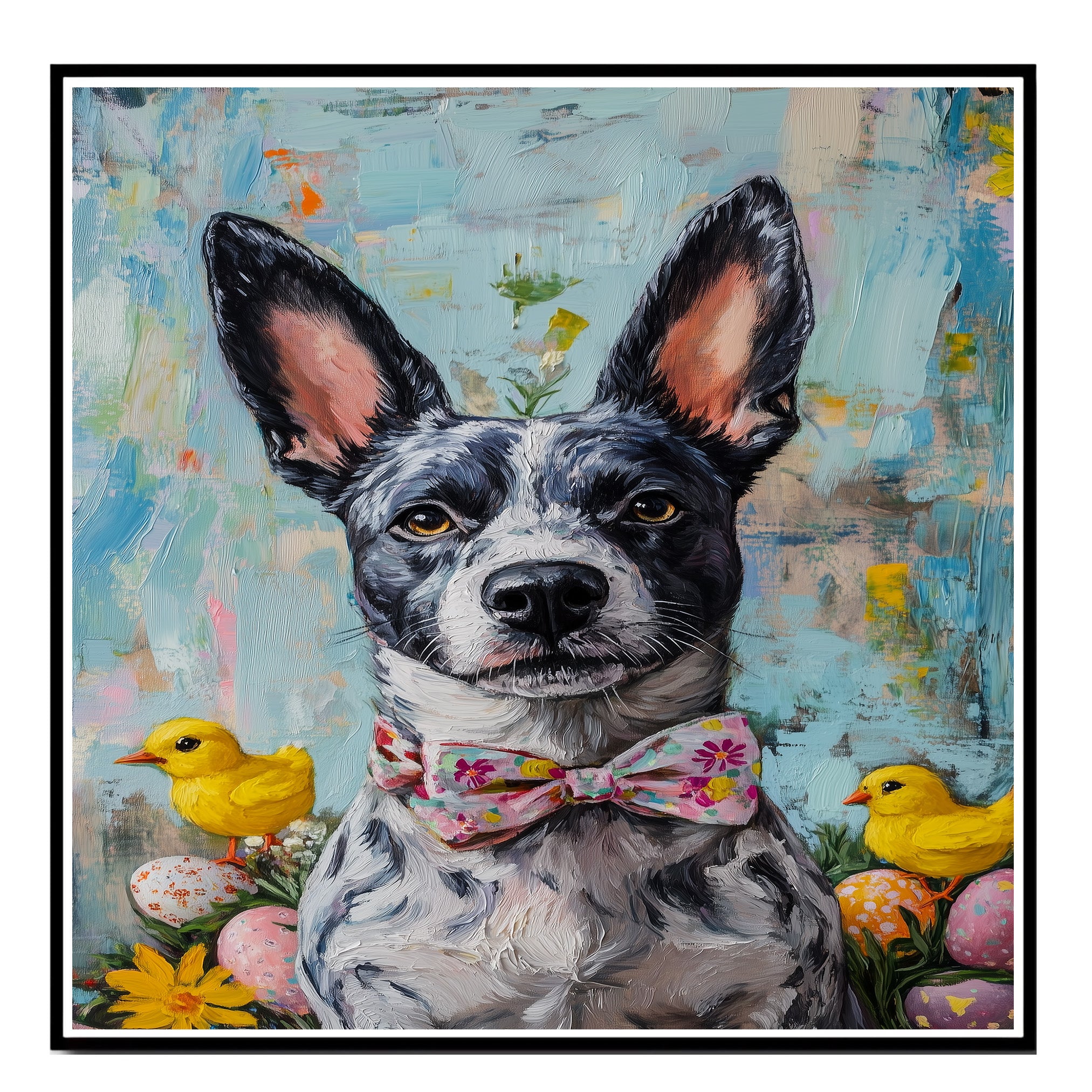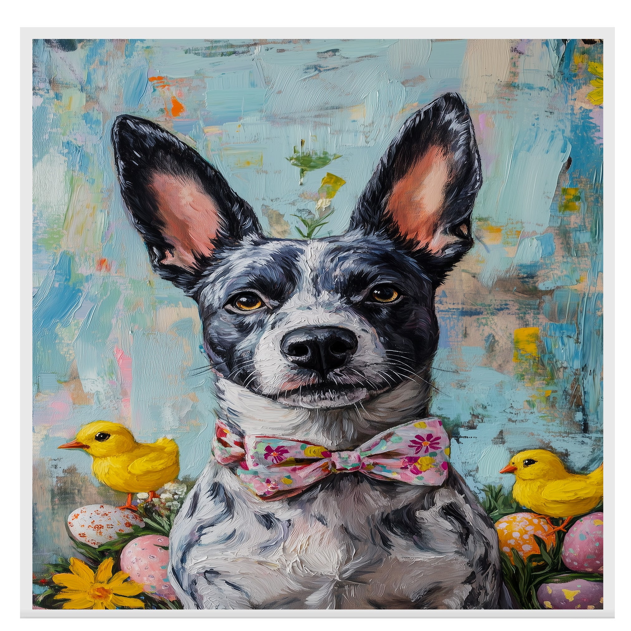 Our Easter Charm Canvas captures the festive joy of the season, featuring a spirited Blue Heeler dressed in a colorful holiday outfit. With bright spring hues and whimsical details, this heartwarming artwork exudes playfulness and celebration, making it a delightful addition to your Easter decor. The cheerful scene adds a touch of seasonal magic to any space, bringing warmth and charm to your home. Available as an artistic canvas wrap, framed print, or rolled artwork, this enchanting piece is a perfect gift for dog lovers and holiday enthusiasts alike.