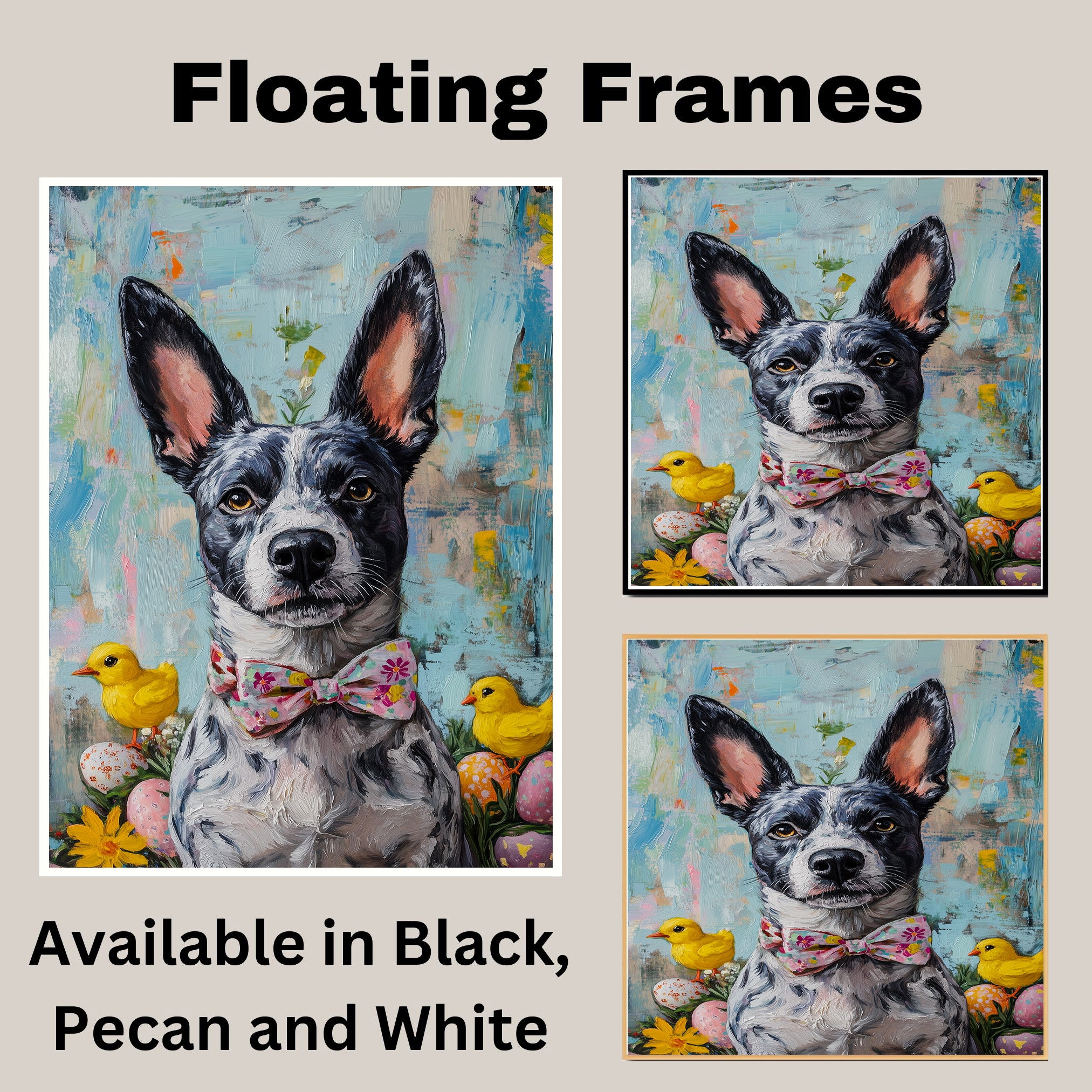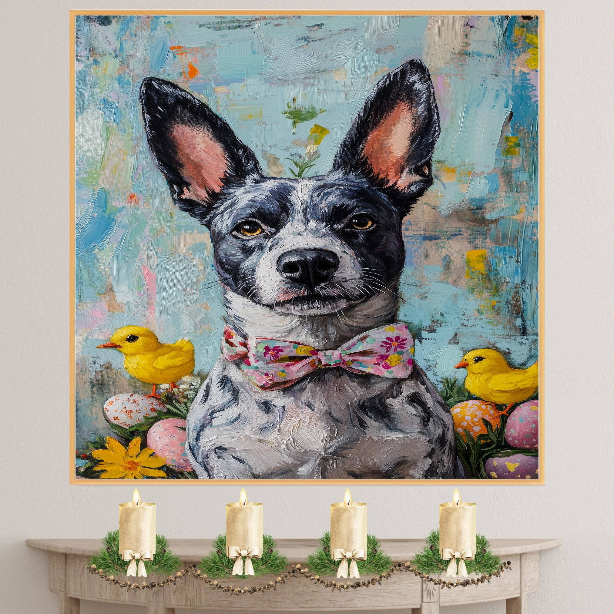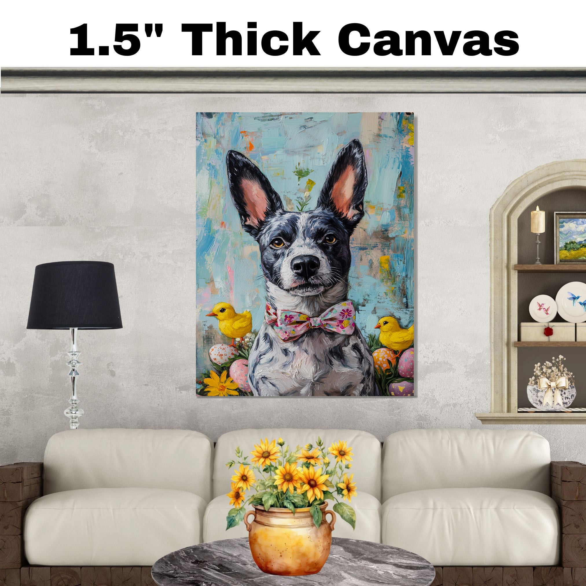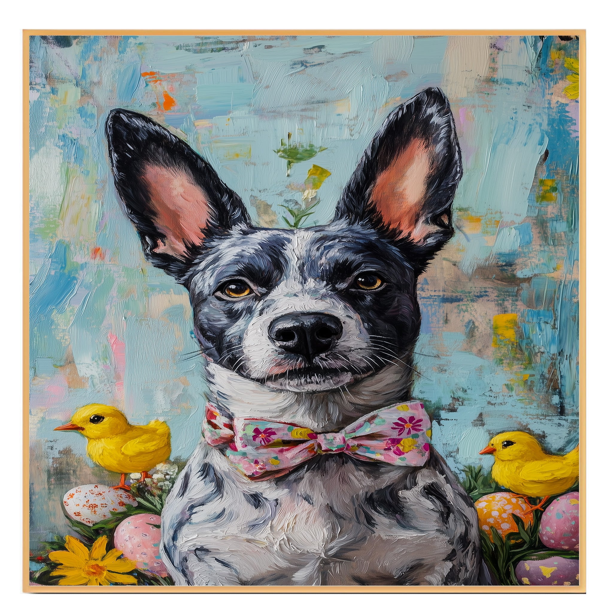 Our Easter Charm Canvas captures the festive joy of the season, featuring a spirited Blue Heeler dressed in a colorful holiday outfit. With bright spring hues and whimsical details, this heartwarming artwork exudes playfulness and celebration, making it a delightful addition to your Easter decor. The cheerful scene adds a touch of seasonal magic to any space, bringing warmth and charm to your home. Available as an artistic canvas wrap, framed print, or rolled artwork, this enchanting piece is a perfect gift for dog lovers and holiday enthusiasts alike.