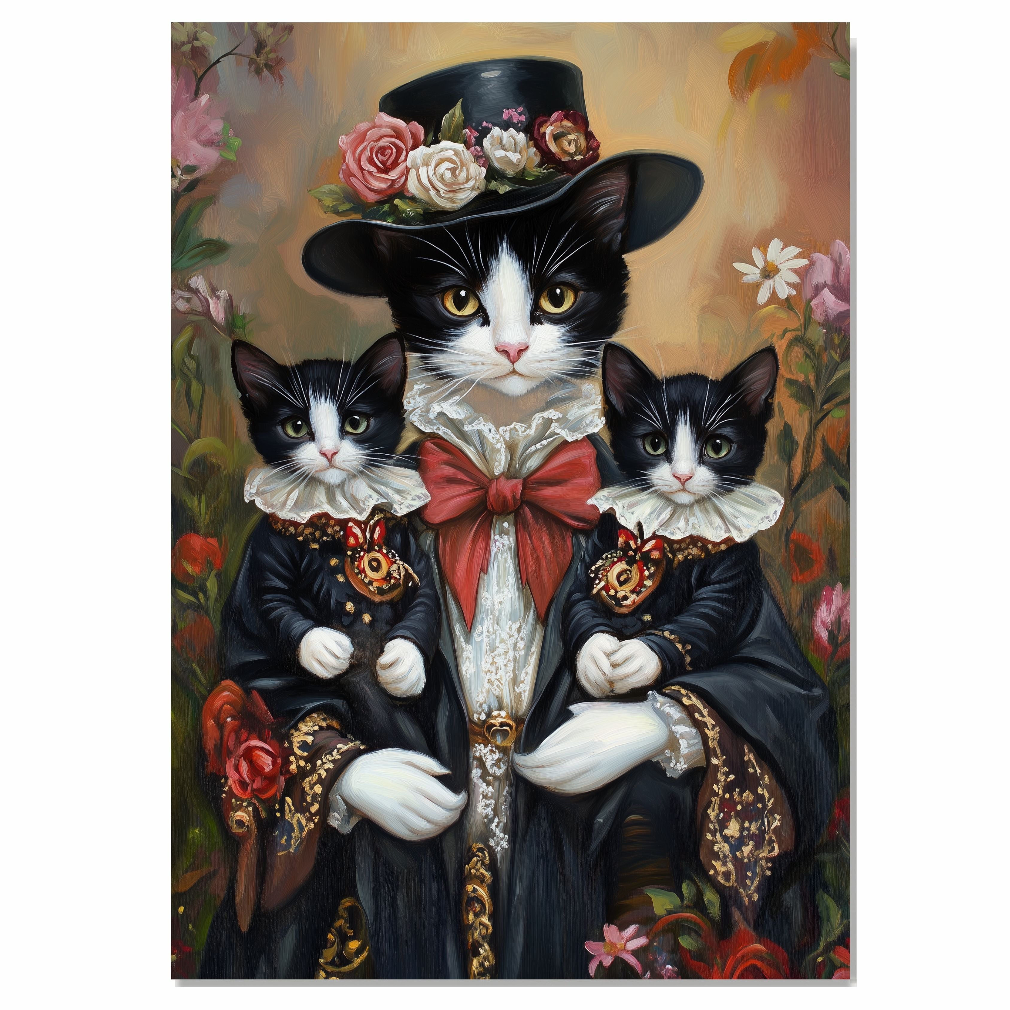 "Elegant Blossoms" Canvas features a tuxedo cat mom gracefully carrying two kittens while dressed in a Victorian gown, surrounded by delicate floral details. This whimsical and heartfelt artwork blends classic elegance with feline charm, making it a perfect addition to any space. Available on a 1.5" thick canvas wrap, floating framed canvas, or flat rolled canvas, it brings a touch of Victorian sophistication and warmth to your decor.