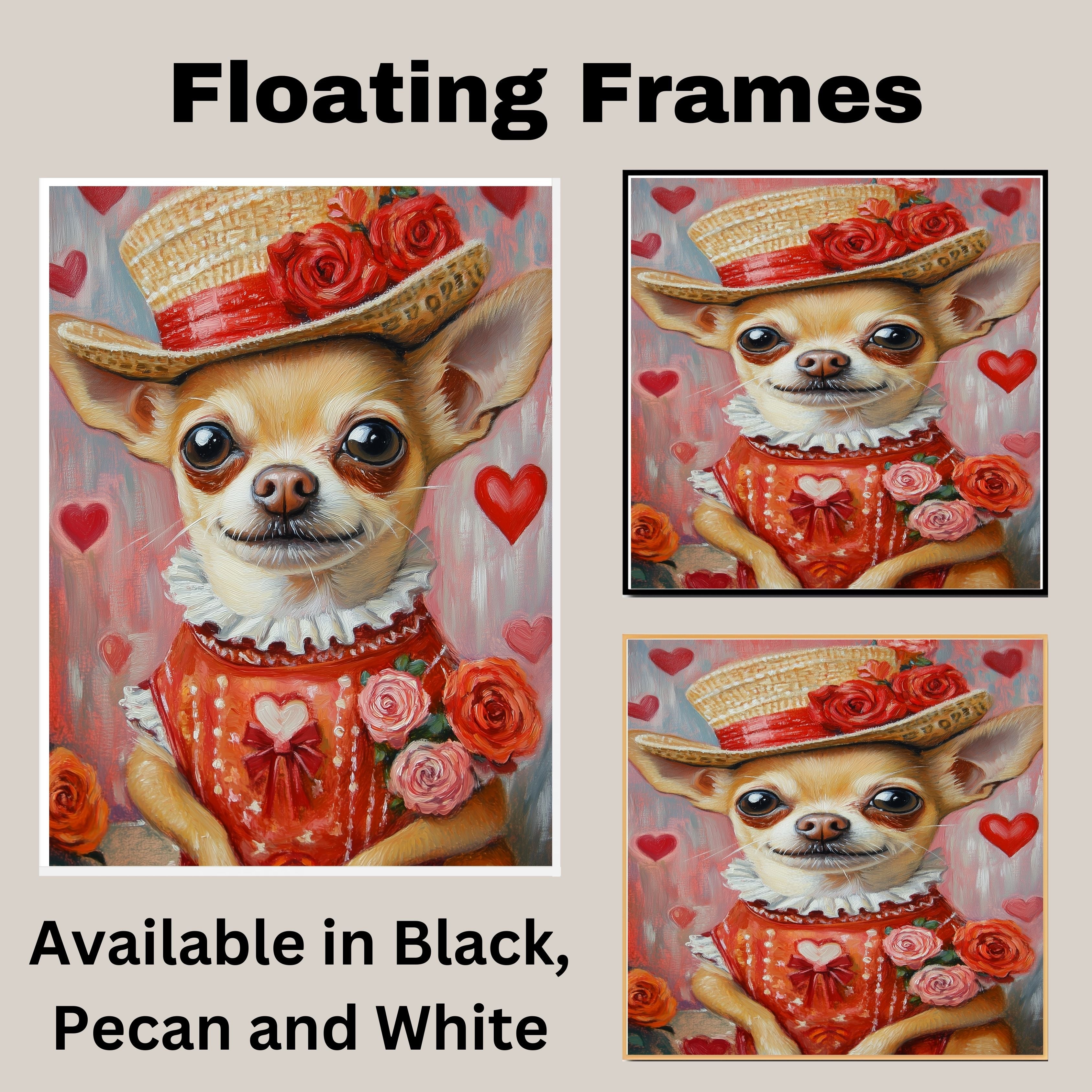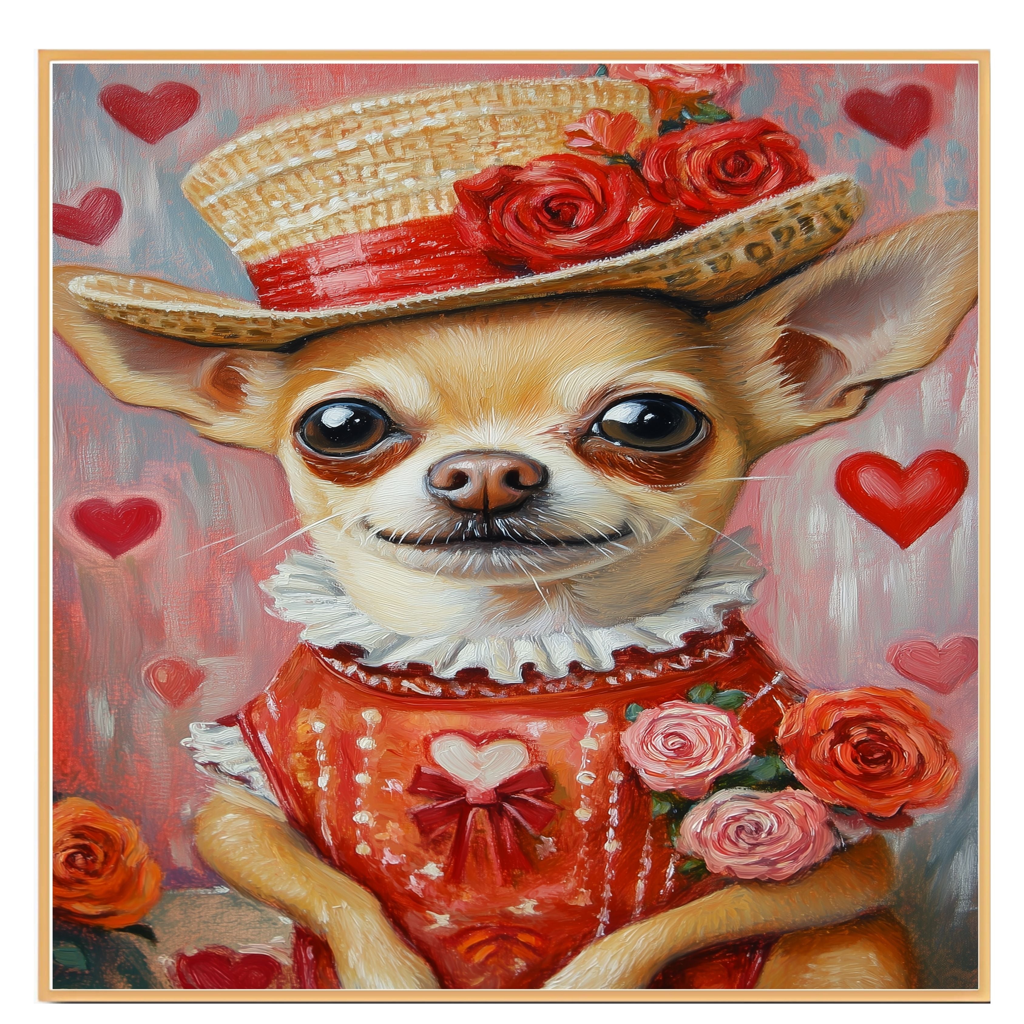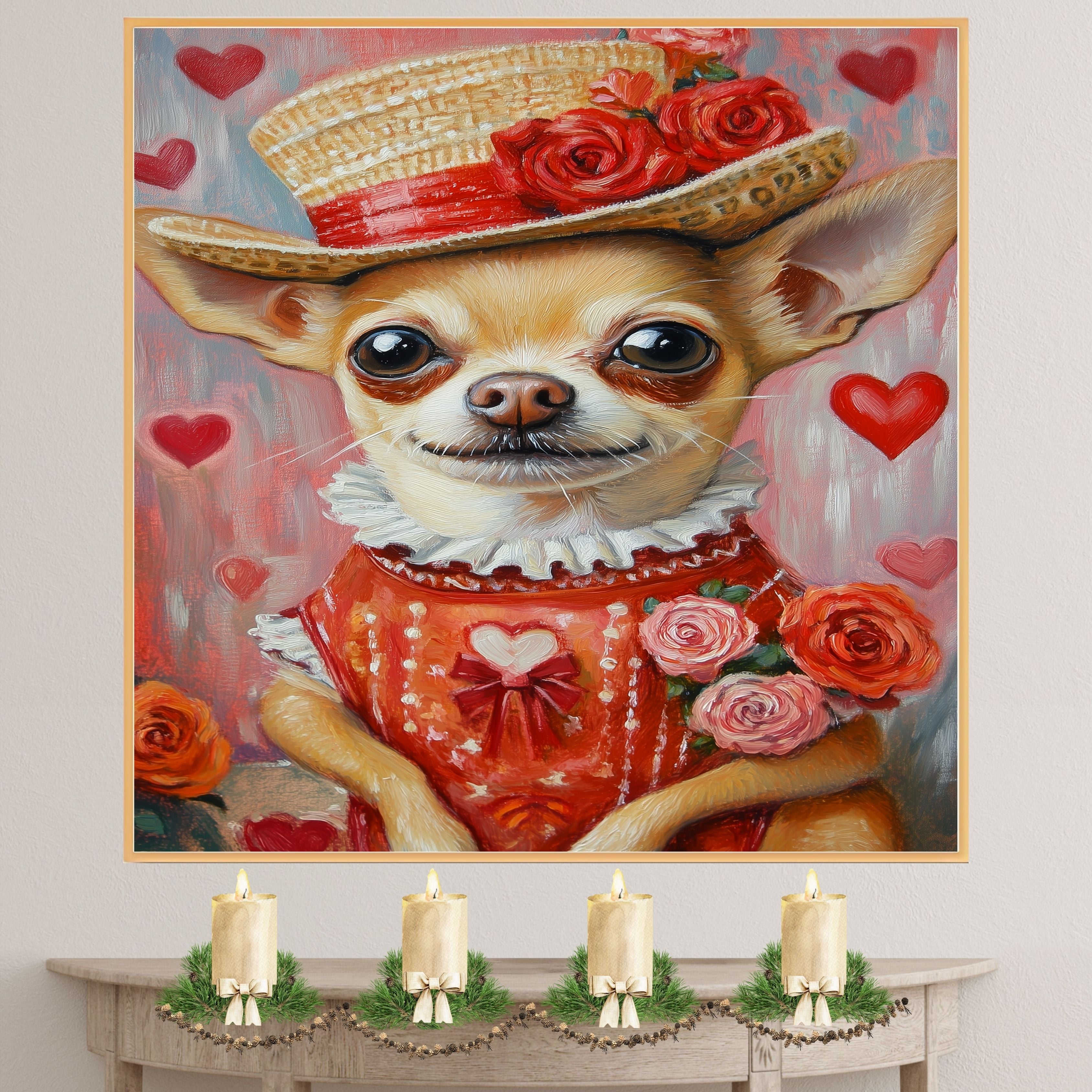 Elegant Devotion: Chihuahua in a European-Inspired Red Dress and Hat with a Heartfelt Touch Romantic Painting on Ready to Hang 1.5" Thick Canvas Wrap, Floating Framed Canvas, Flat Rolled Canvas