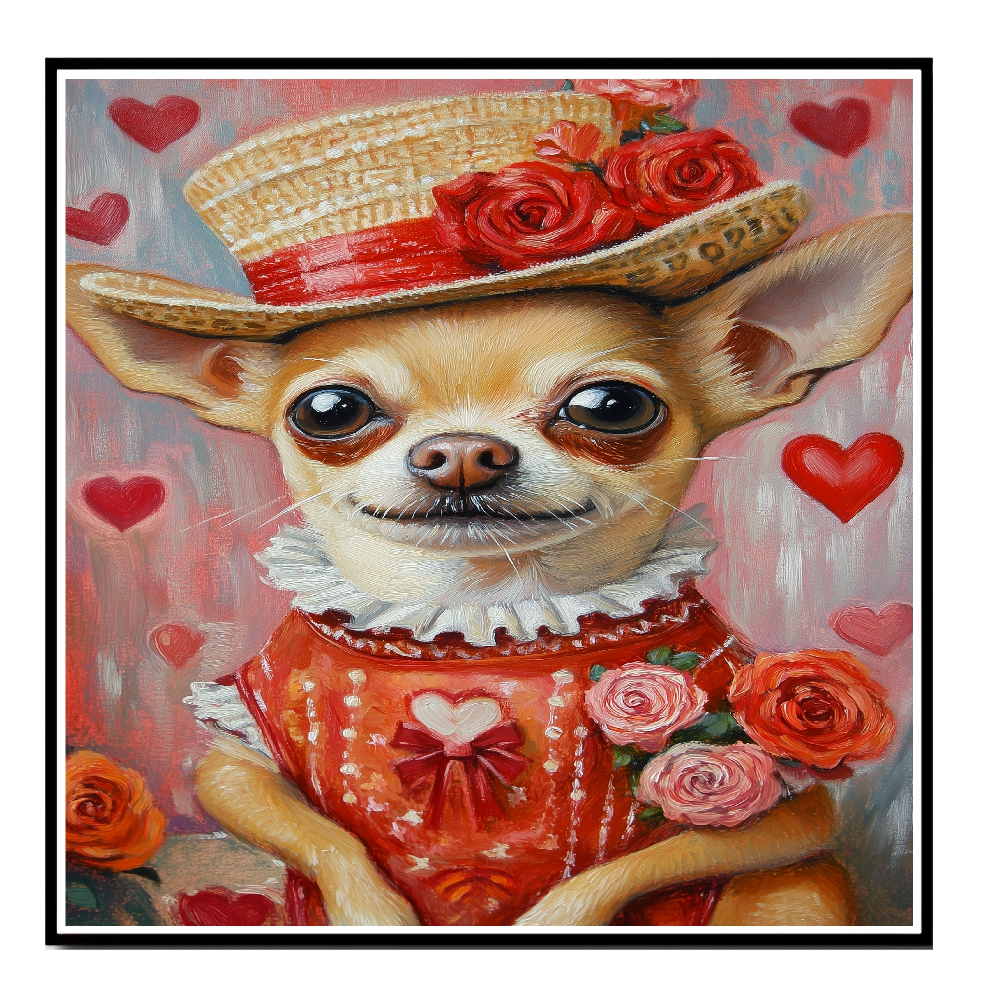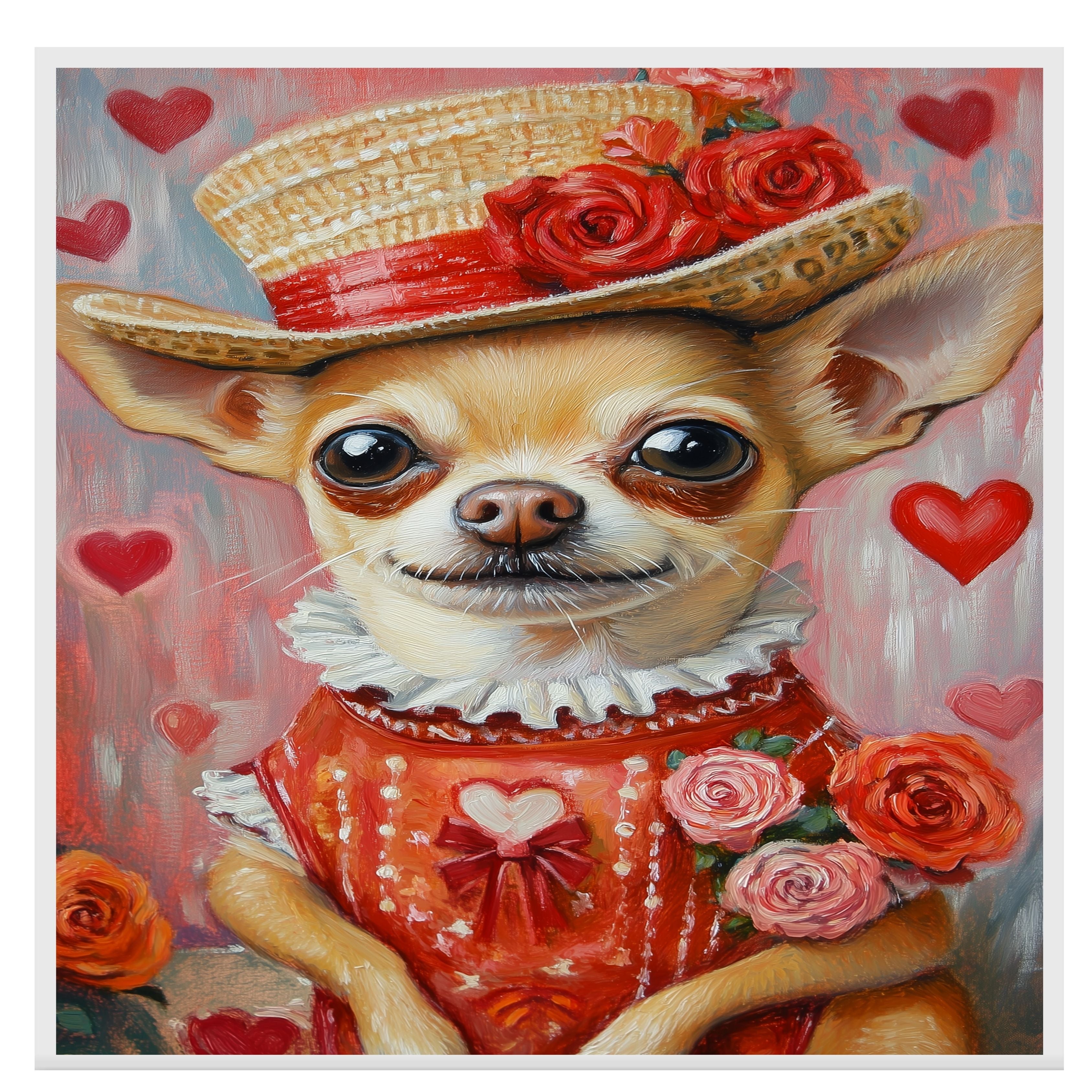 Our Elegant Devotion Canvas exudes timeless grace, featuring a poised Chihuahua adorned in a European-inspired red dress and matching hat, embodying charm and sophistication. With a heartfelt gaze, this refined portrait captures the essence of love and devotion, making it a captivating statement piece for any space. The rich hues and delicate details lend a romantic allure, evoking a sense of nostalgia and elegance. Available on a 1.5" thick canvas wrap, floating framed canvas, or as a flat rolled canvas, this exquisite artwork is perfect for dog lovers and those who appreciate classic beauty with a touch of sentiment.