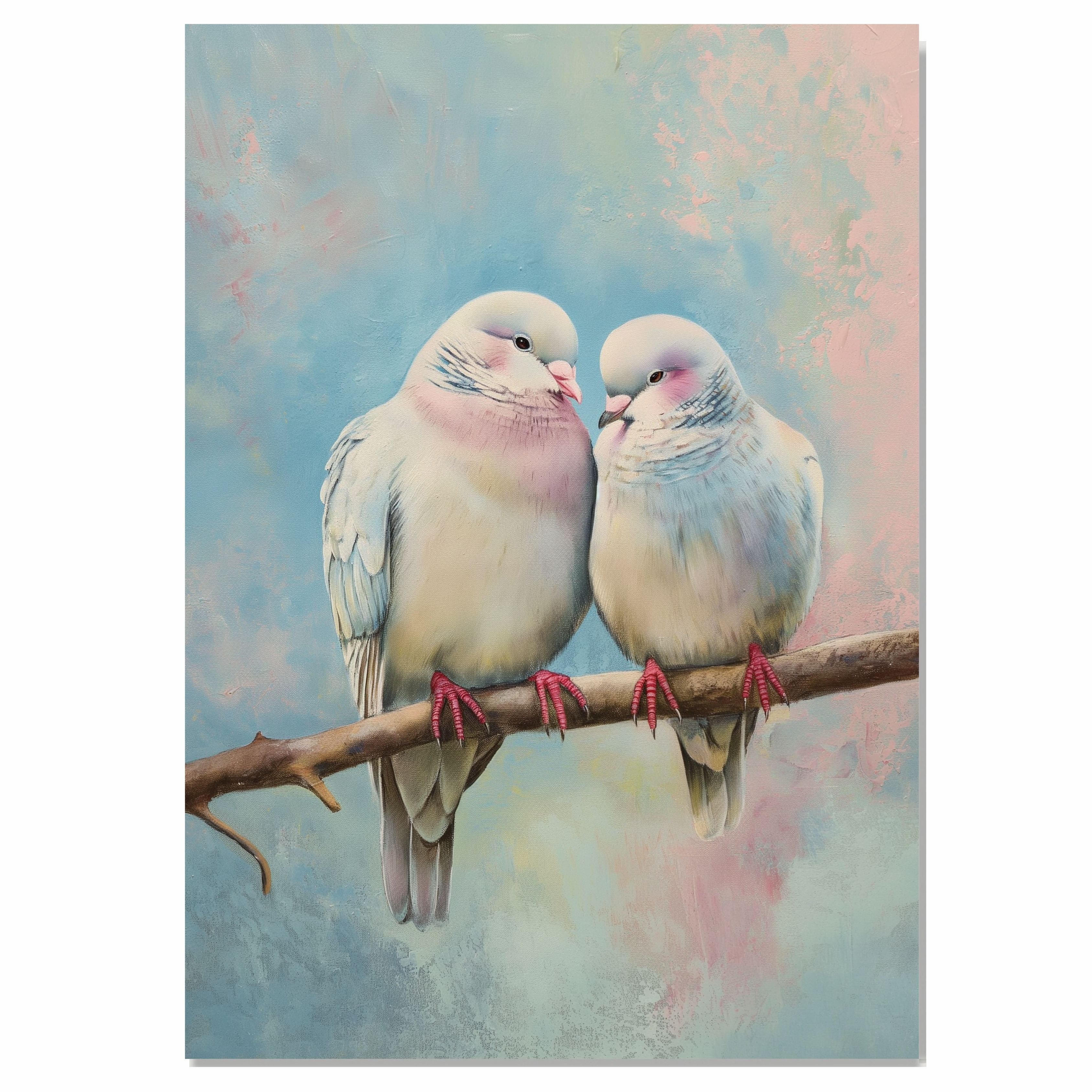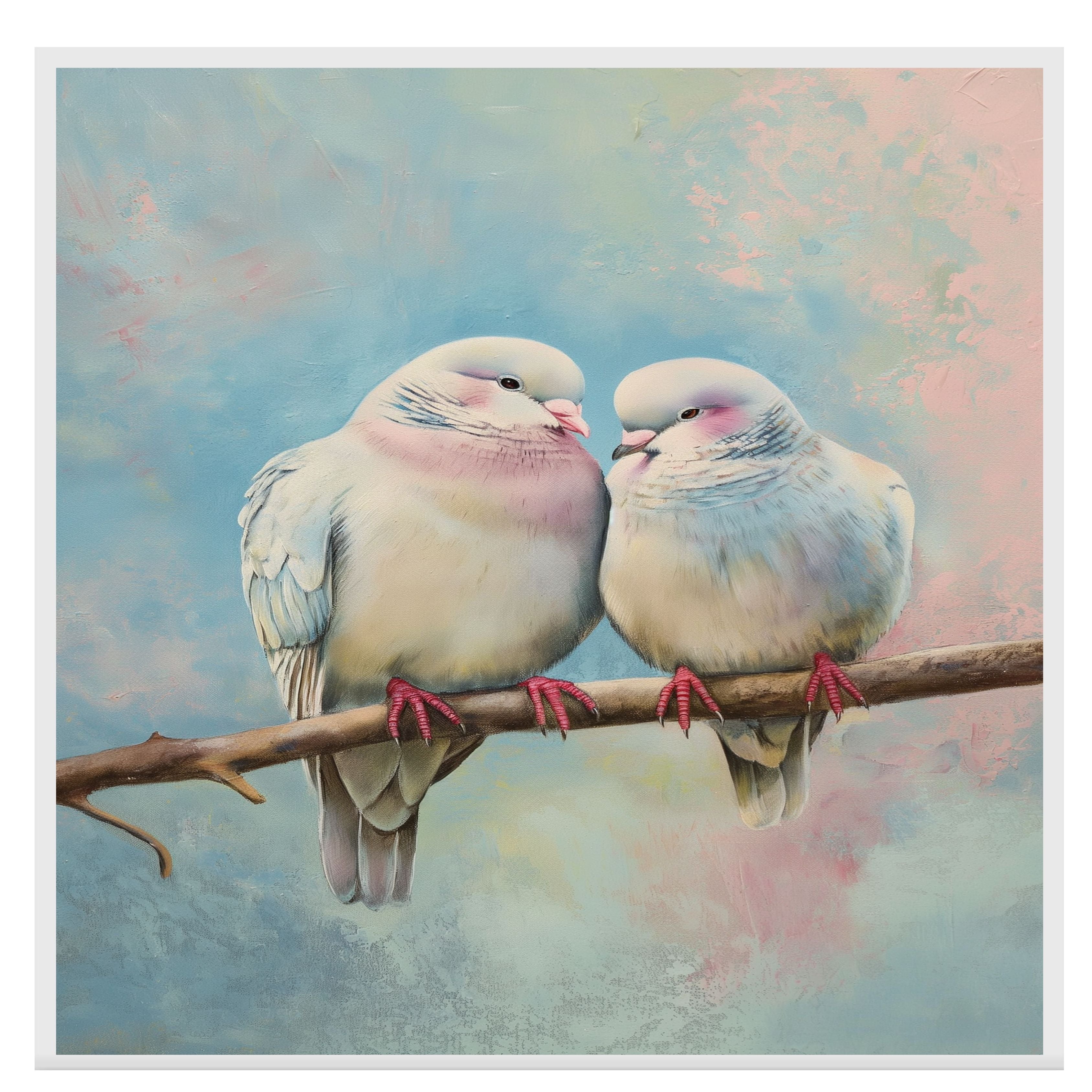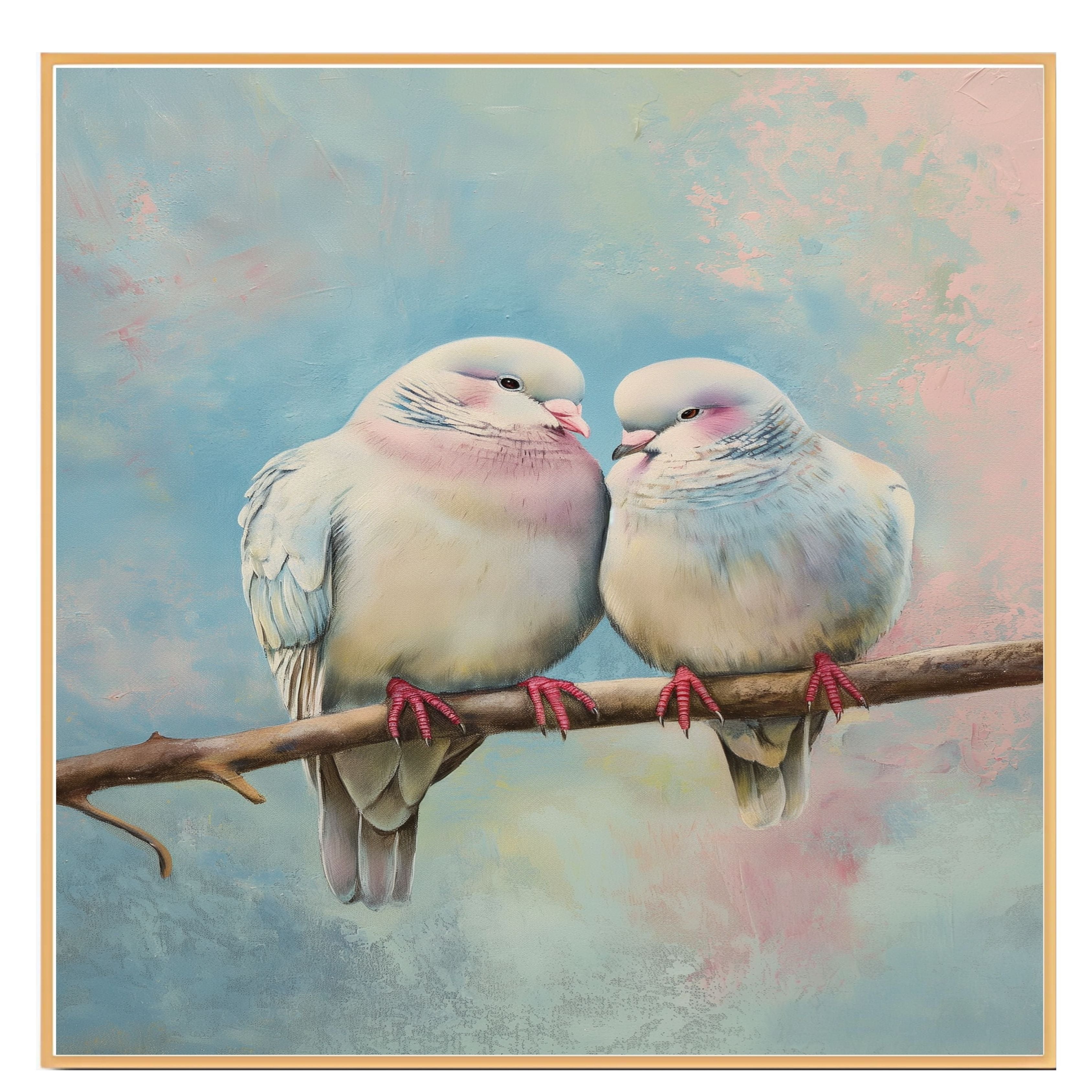 This serene painting features two elegant lovebirds sitting peacefully on a branch, set against a dreamy blend of soft blue and pink pastel tones. Ideal for romantic or nature-themed spaces, the artwork evokes calm, affection, and natural harmony.
