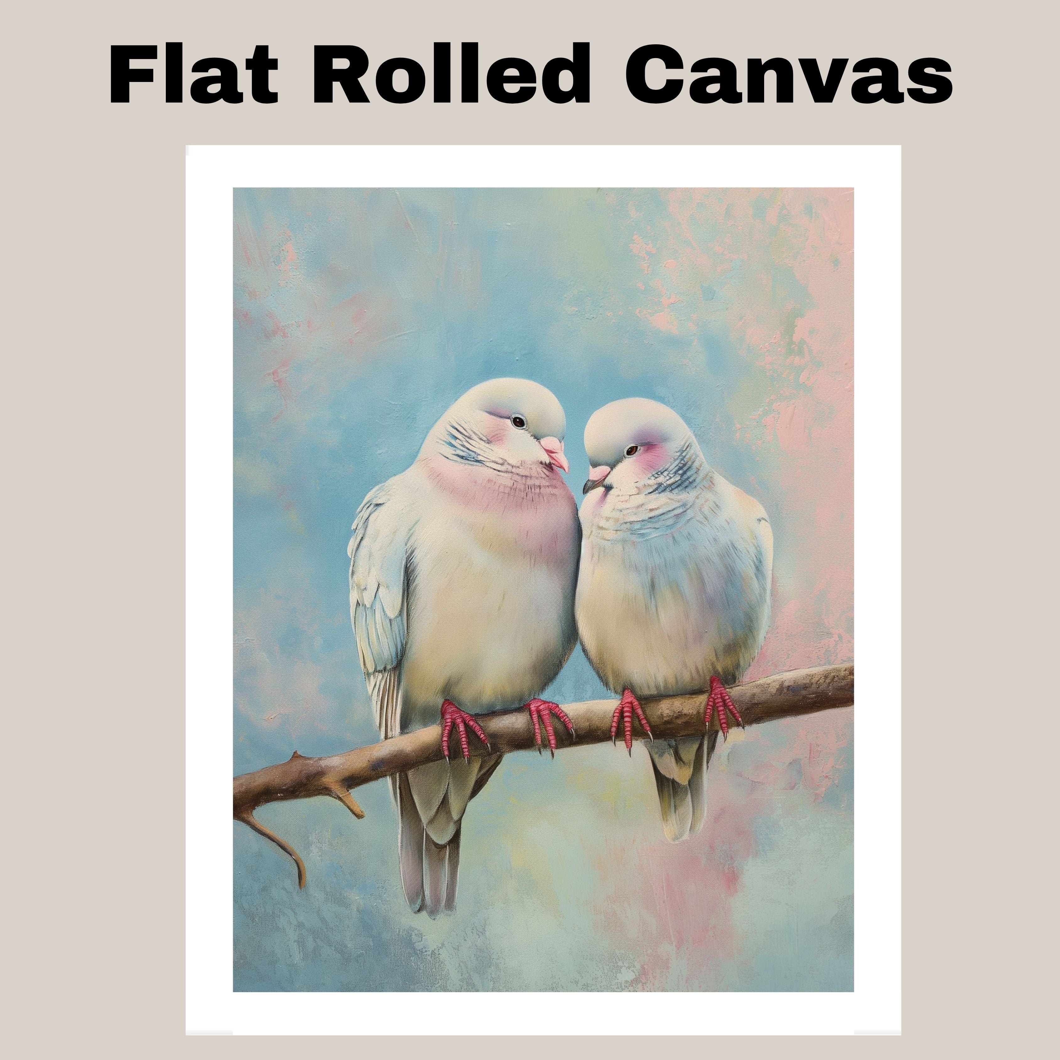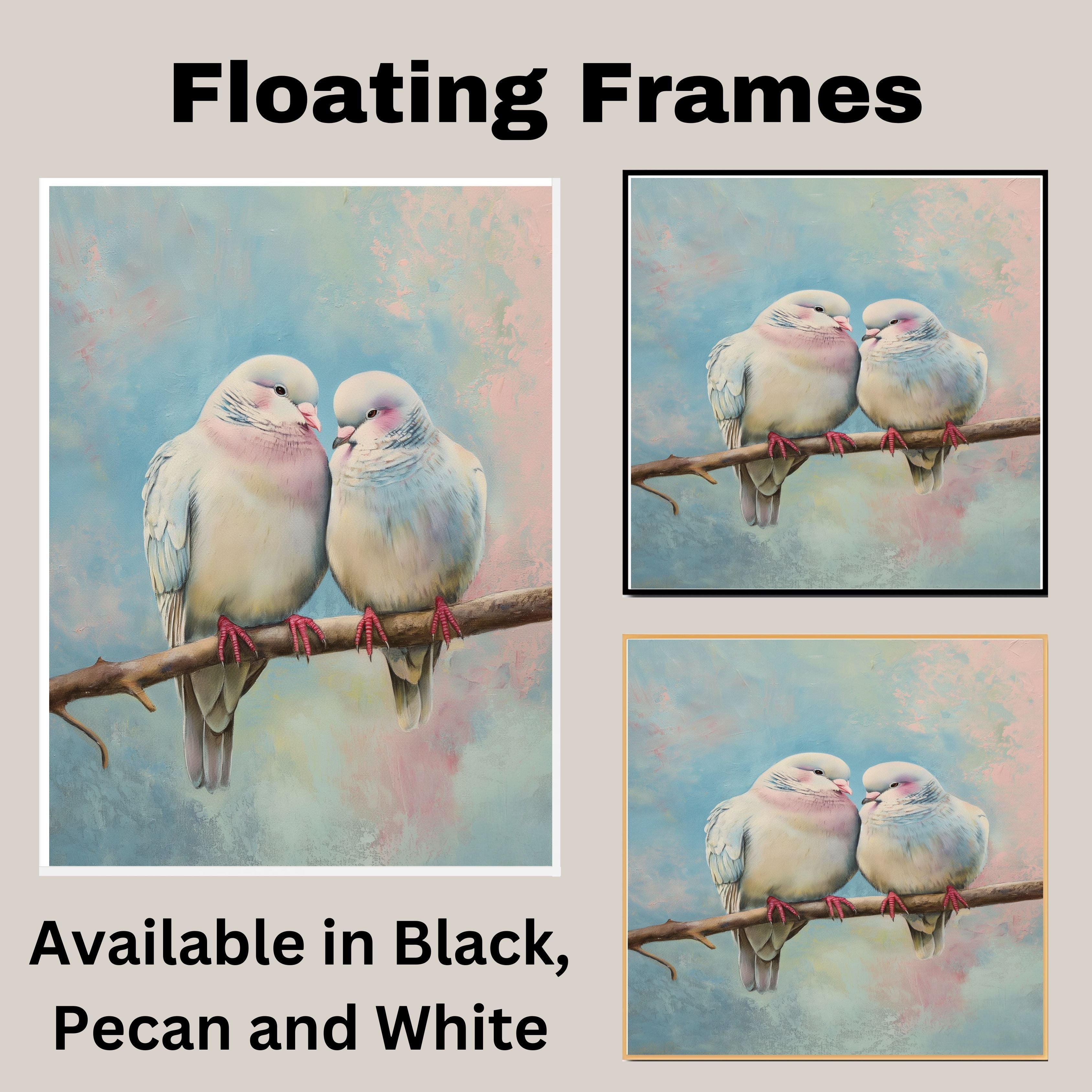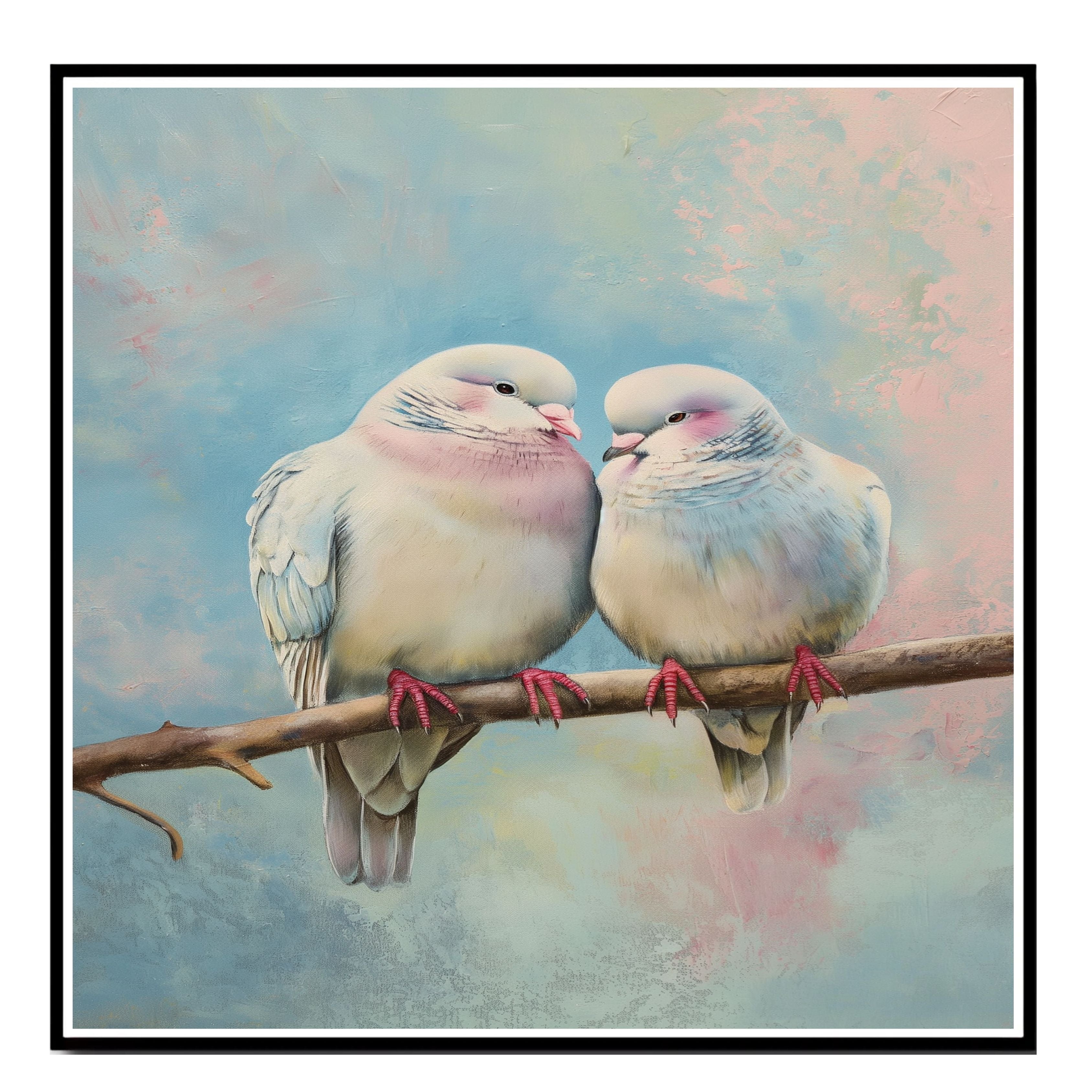 This serene painting features two elegant lovebirds sitting peacefully on a branch, set against a dreamy blend of soft blue and pink pastel tones. Ideal for romantic or nature-themed spaces, the artwork evokes calm, affection, and natural harmony.