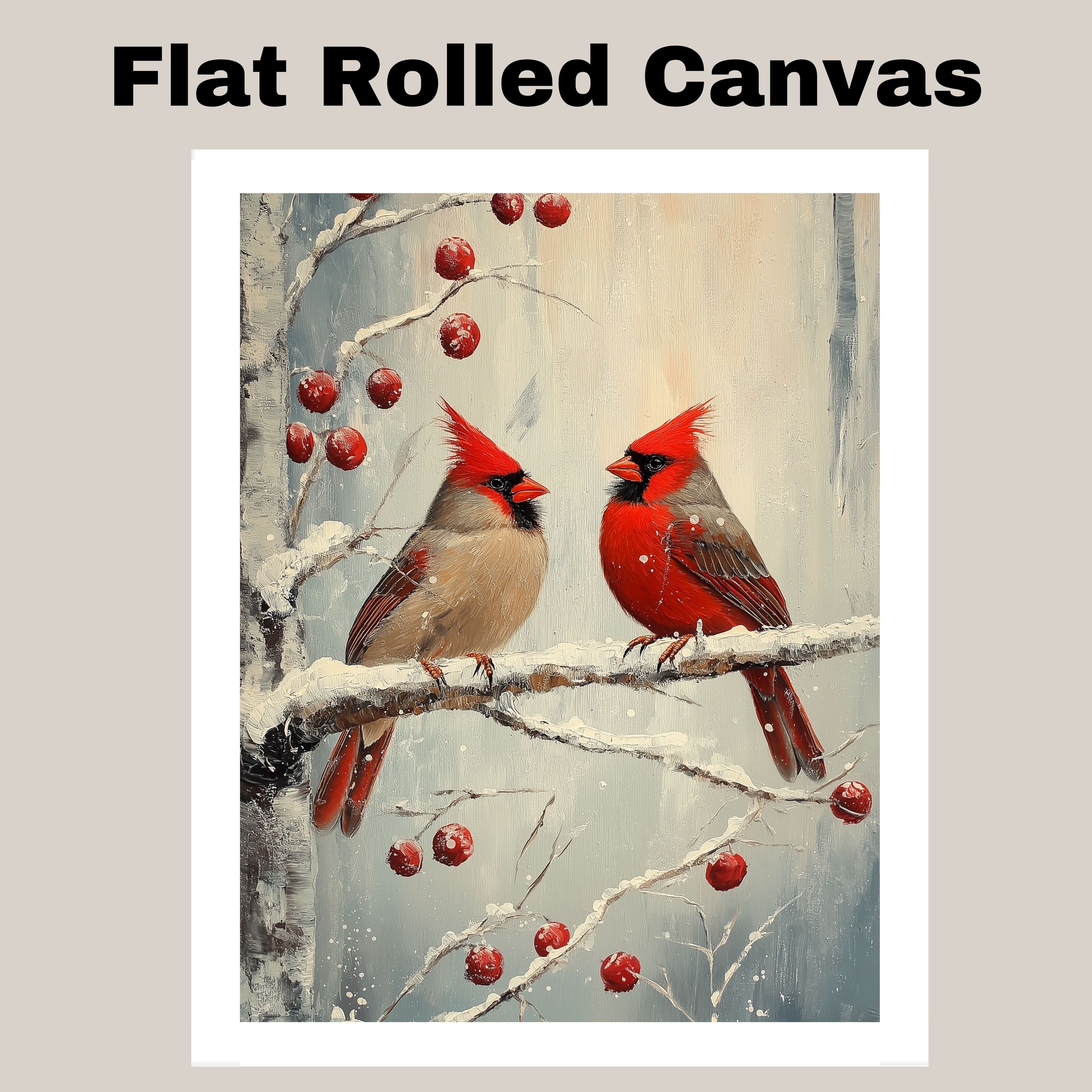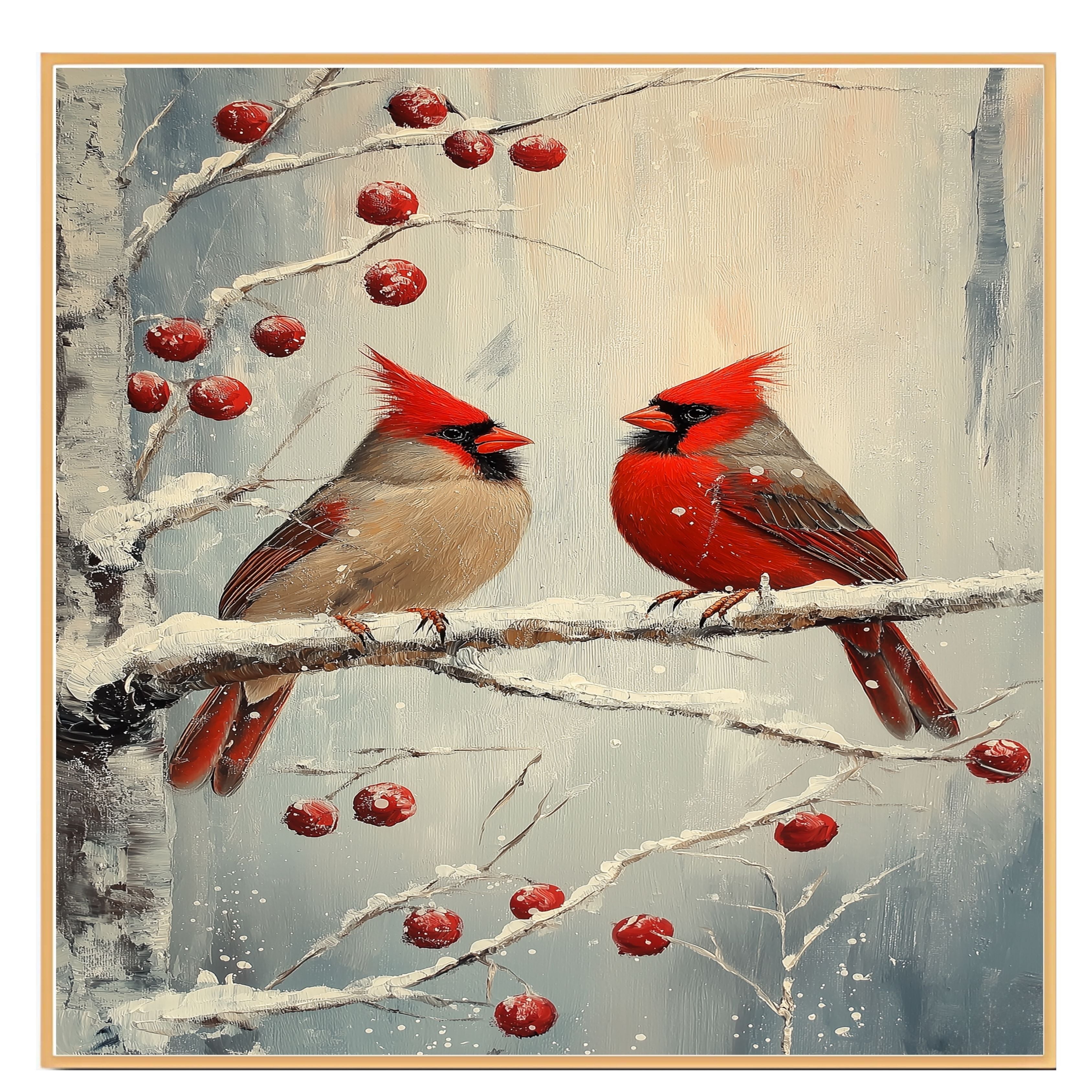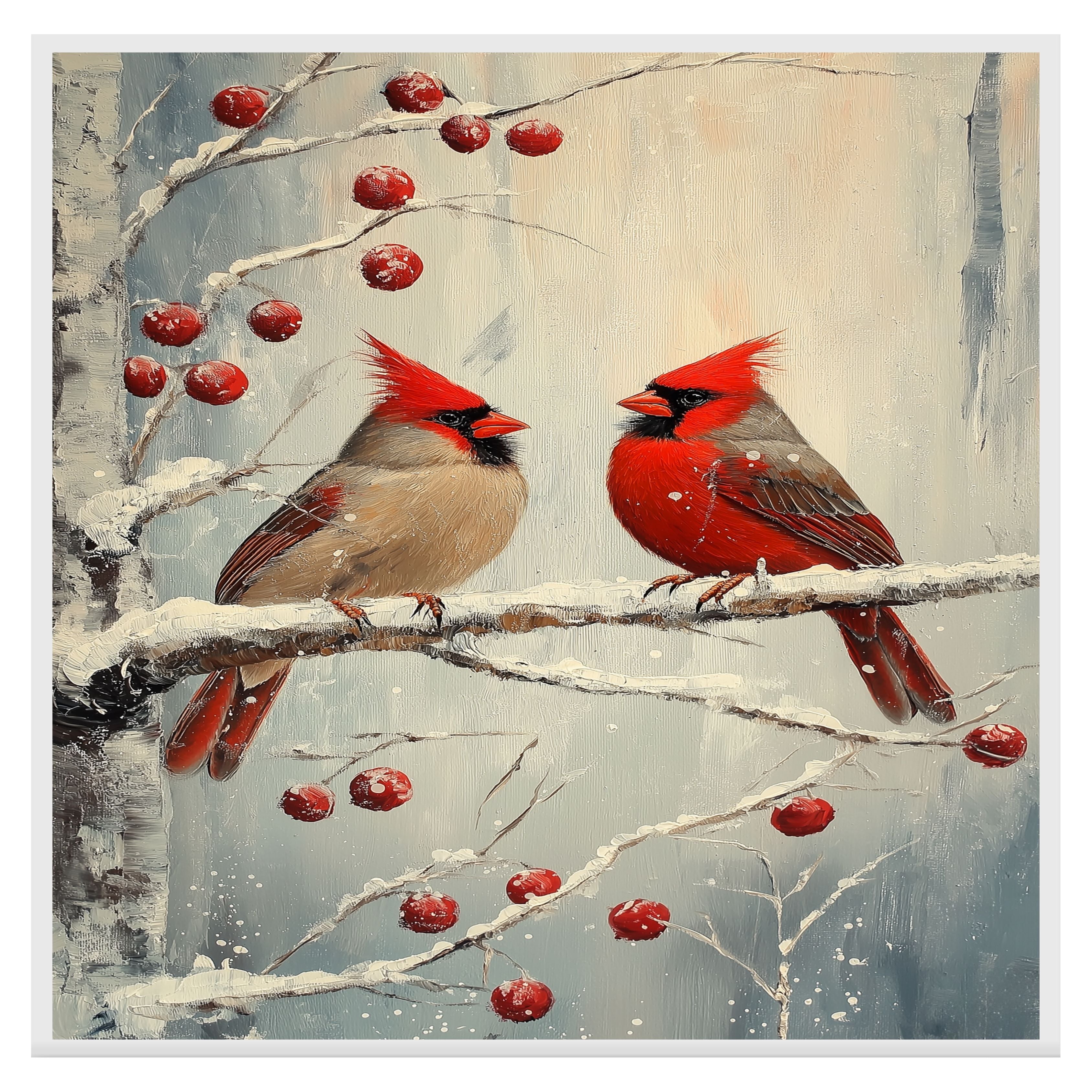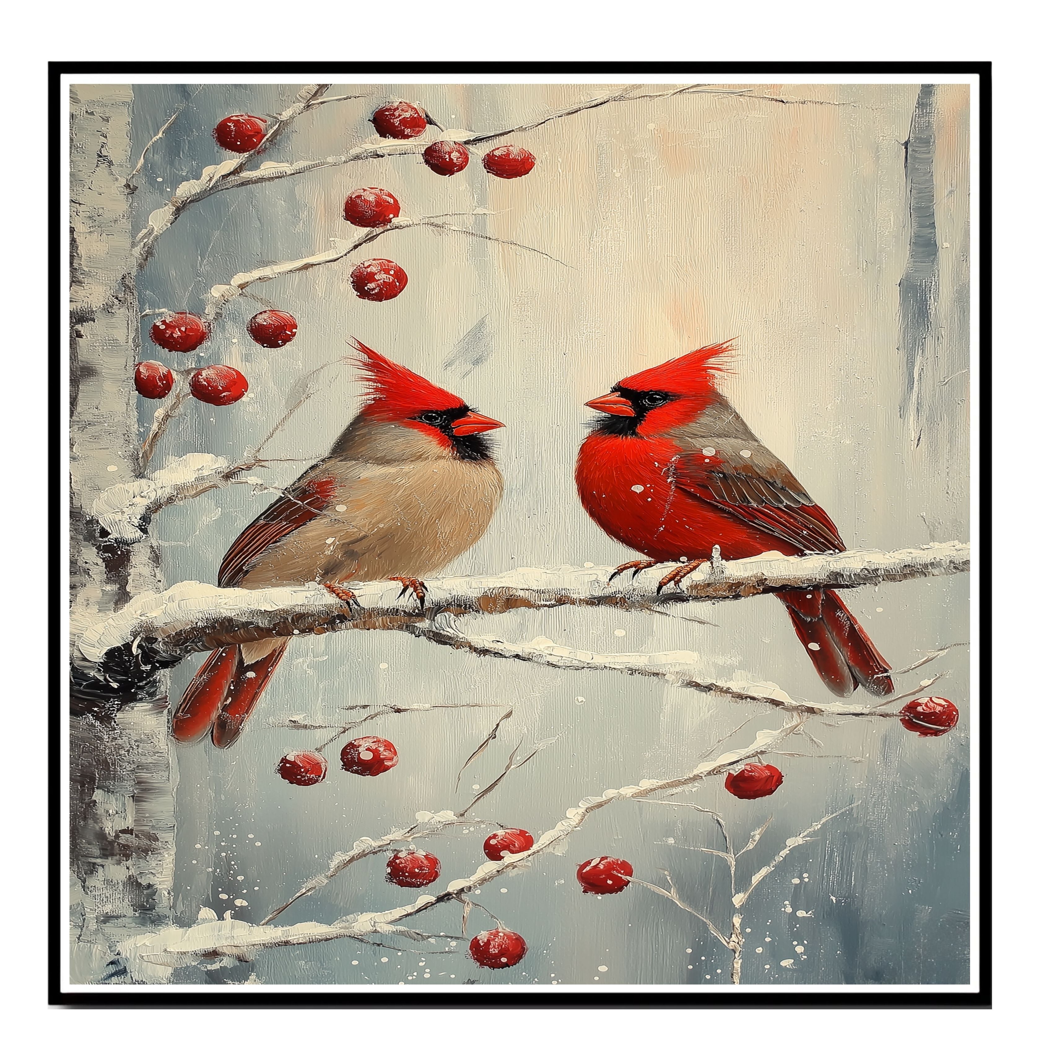 This serene and classic artwork features a pair of red cardinals perched on a snow-covered branch accented with rich winter berries. Rendered in a vintage-inspired style with soft brushstrokes and subtle textures, it captures the peaceful beauty of the season. A timeless choice for Christmas decorating or a thoughtful gift for bird and nature lovers.
