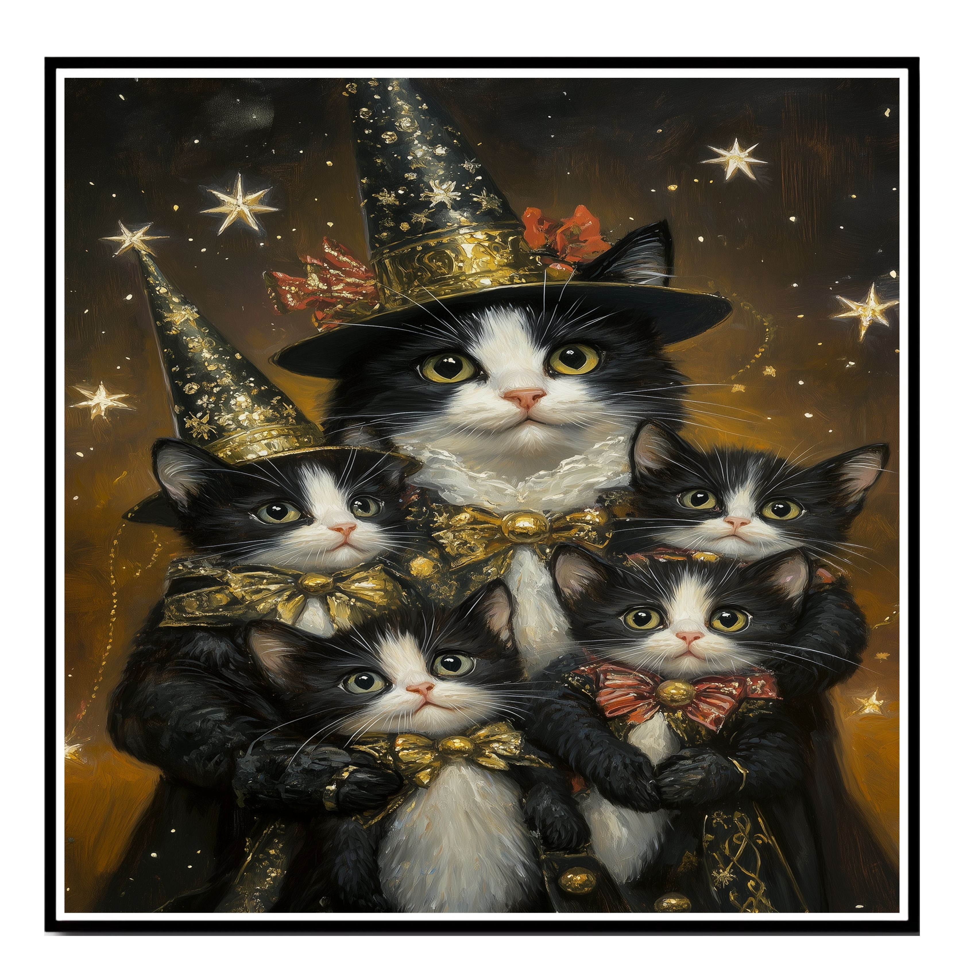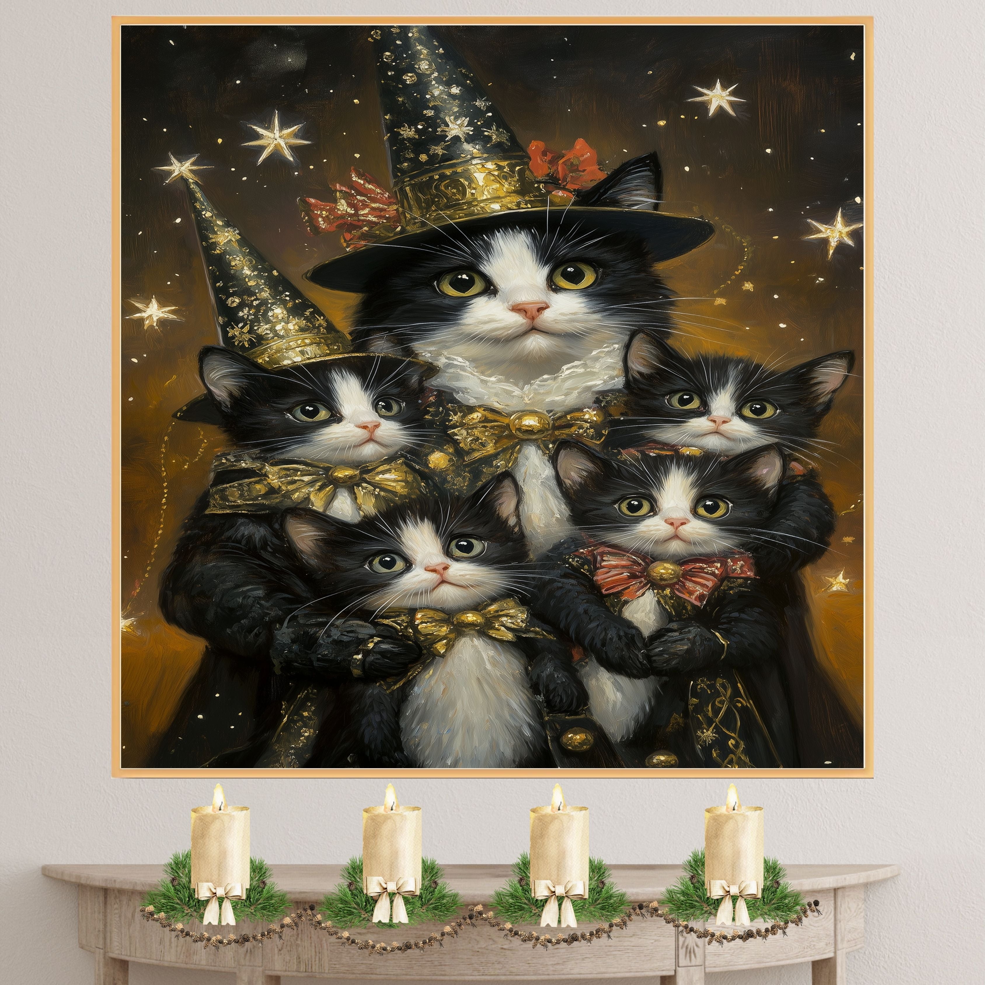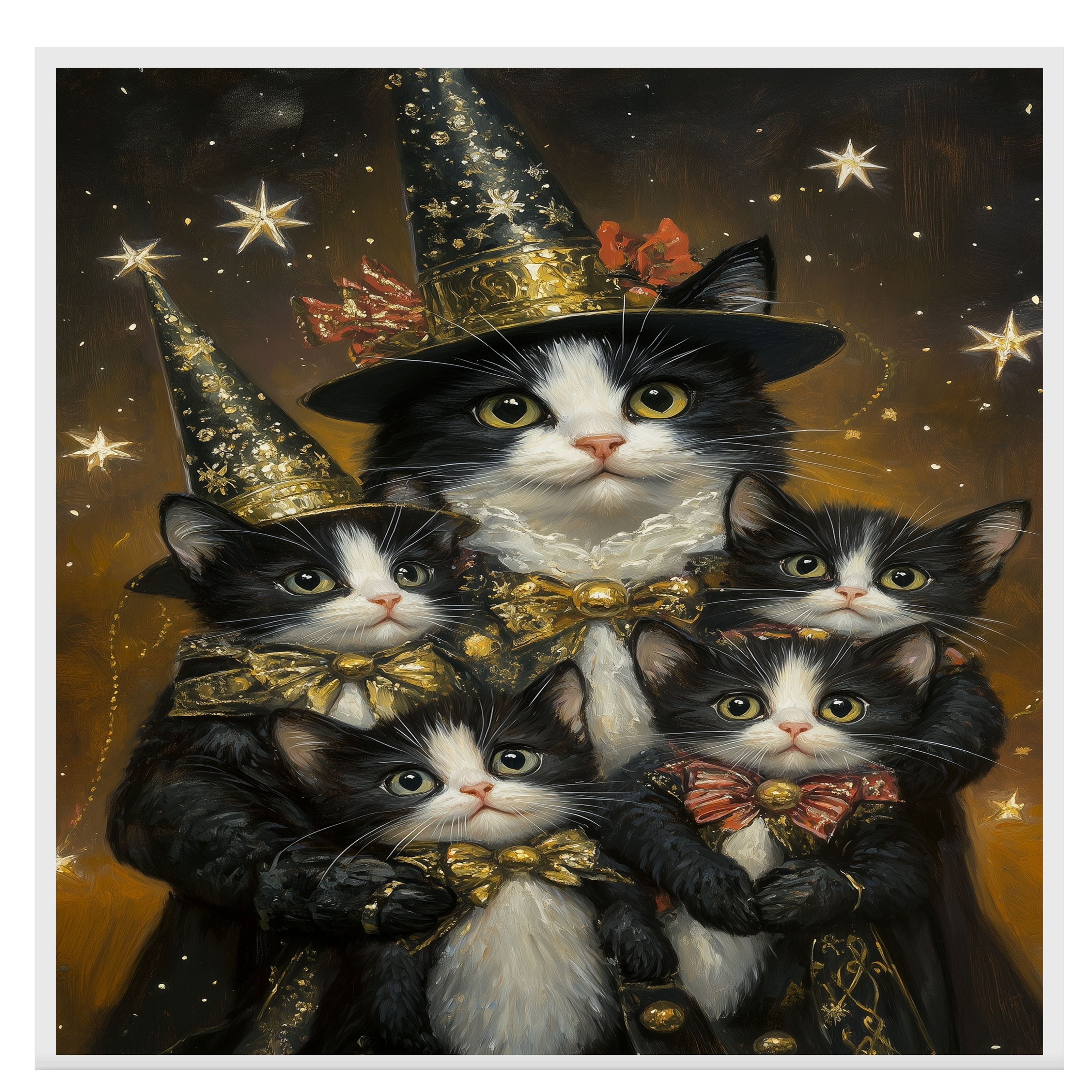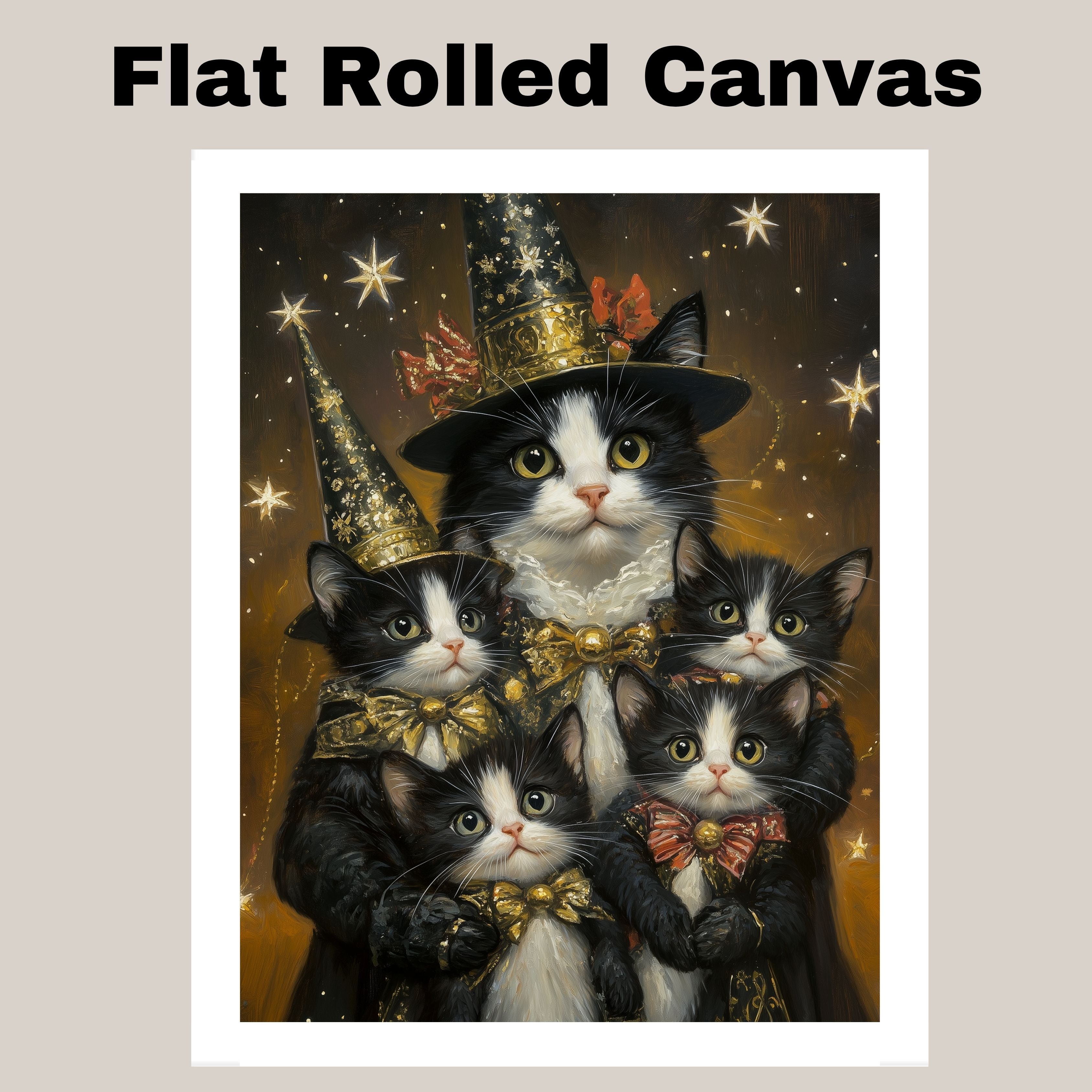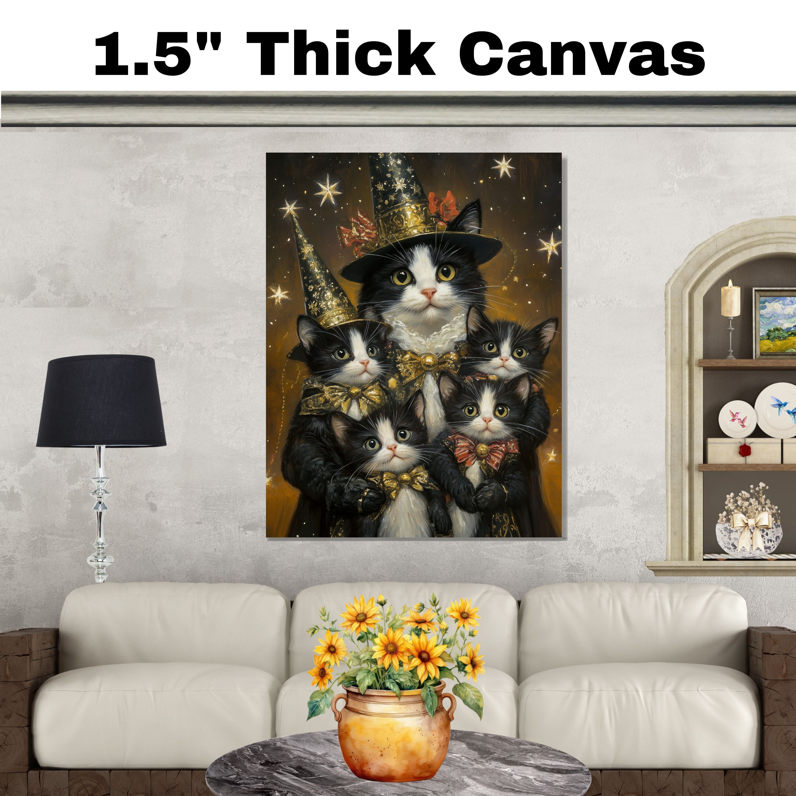 Our "Enchanted Twilight" Canvas whisks you away to a magical wonderland where a tuxedo cat mom watches over her four curious kittens beneath a dreamy, twilight sky. Soft moonlight bathes the whimsical landscape, casting a mystical glow over delicate flowers and twinkling stars. This captivating artwork blends fantasy and warmth, making it a delightful addition to any space. Available on a 1.5" thick canvas wrap, floating framed canvas, or flat rolled canvas, this enchanting piece is perfect for cat lovers and dreamers alike.