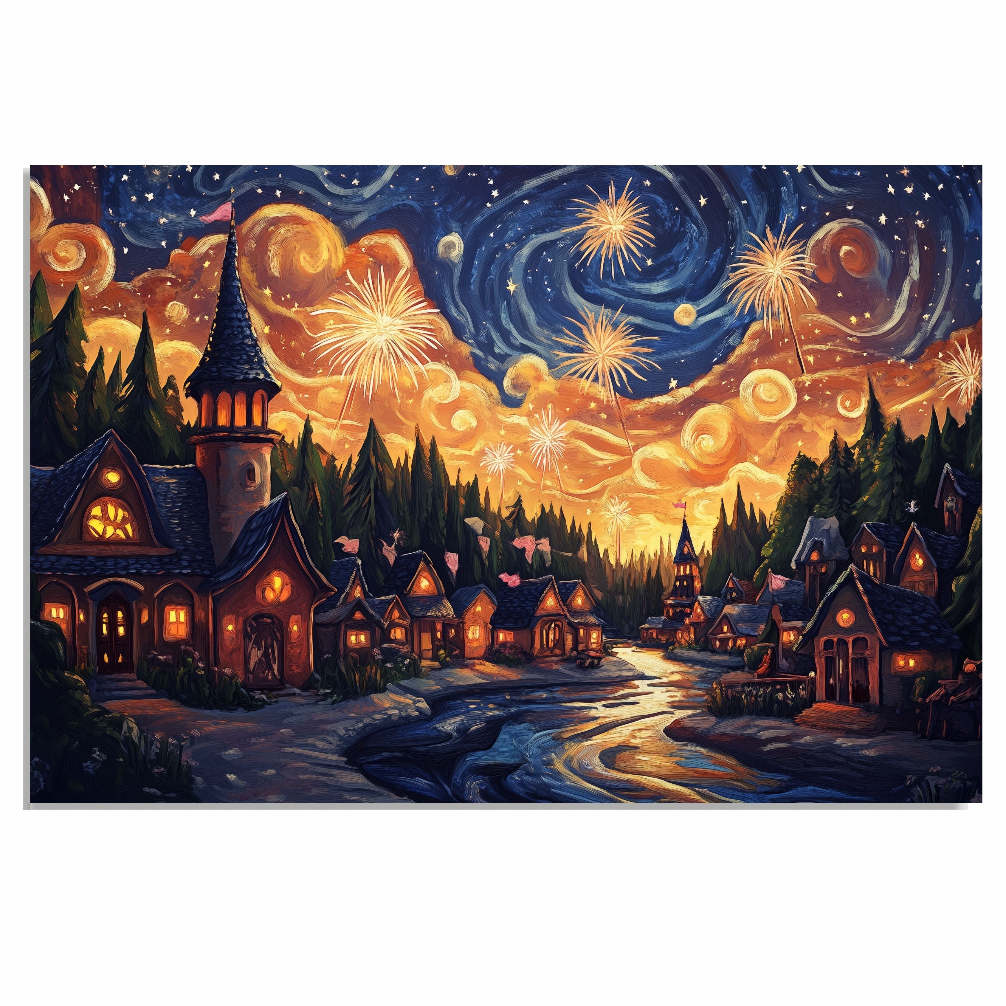 Immerse yourself in a festive wonderland with this enchanting painting of a cozy village celebrating the 4th of July. Bursting with glowing windows, swirling stars, American flags, and vibrant fireworks, this magical nighttime scene blends patriotism with fantasy charm. Perfect for lovers of storytelling art and holiday-inspired whimsy.