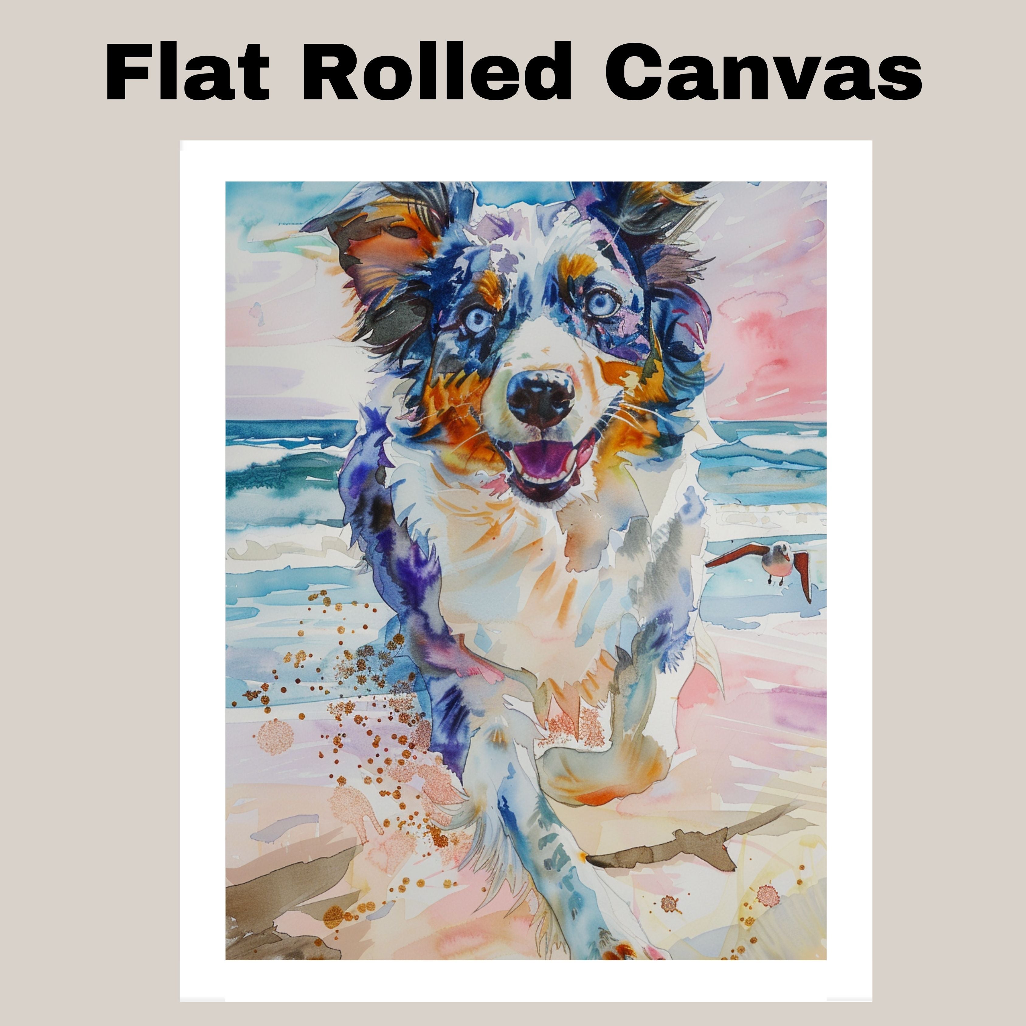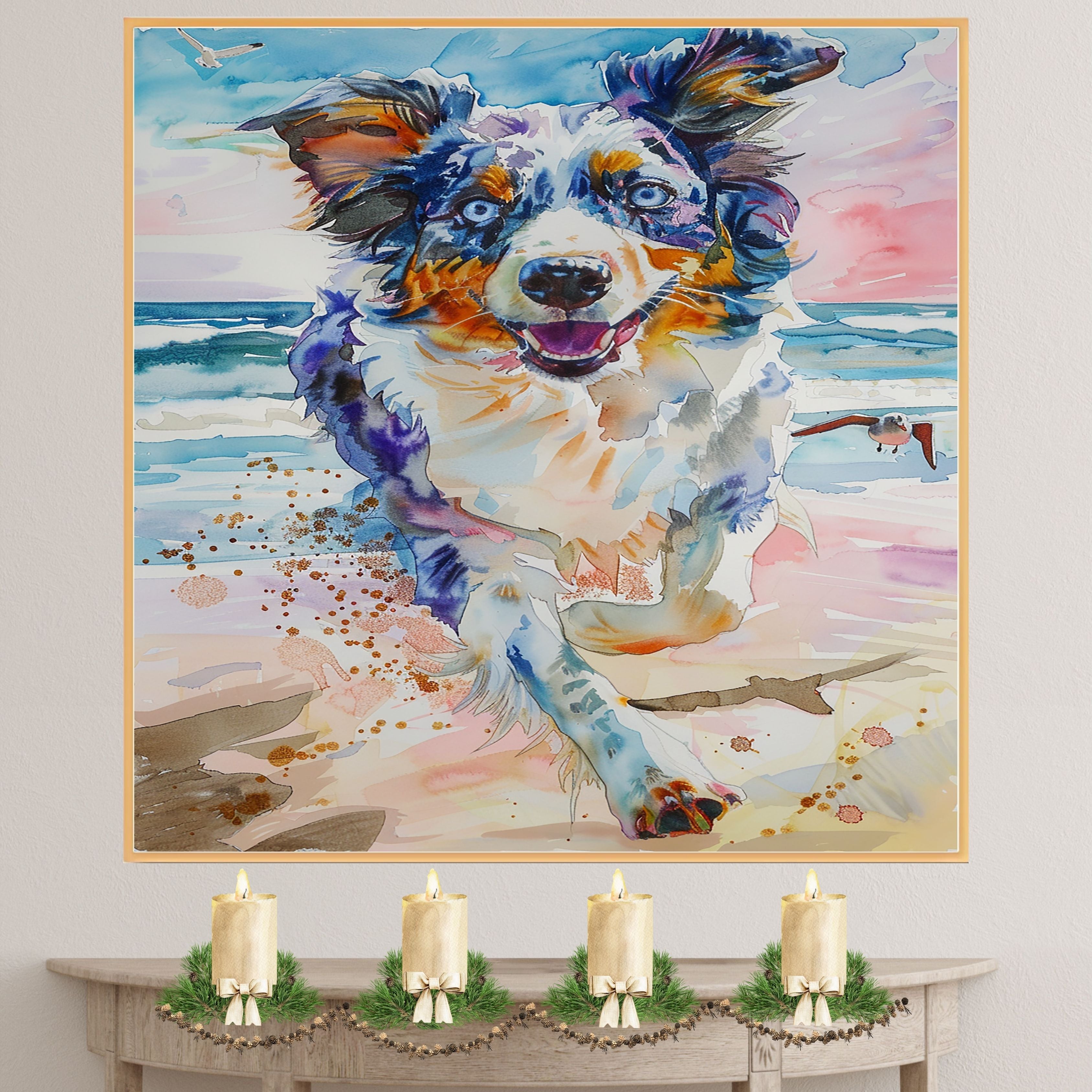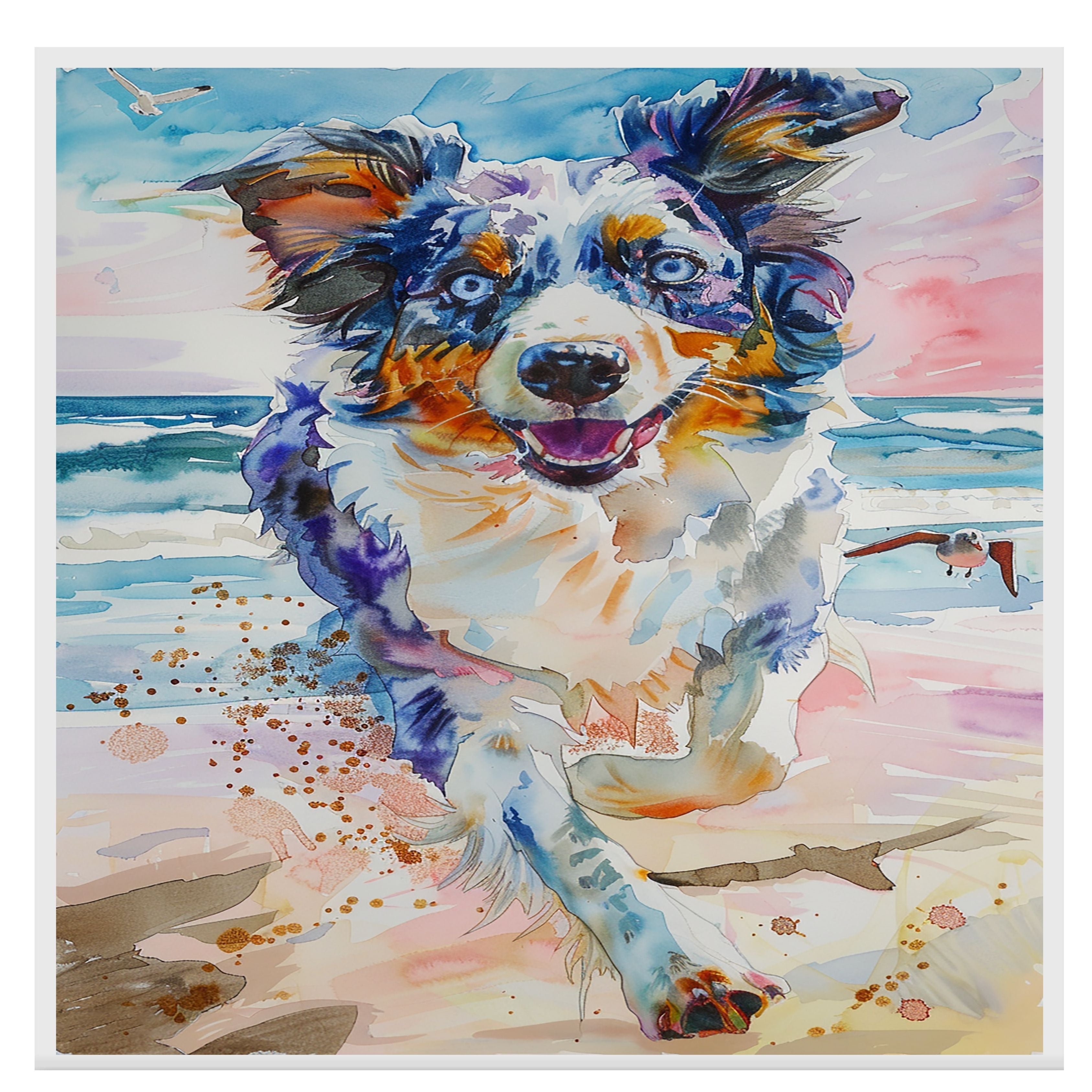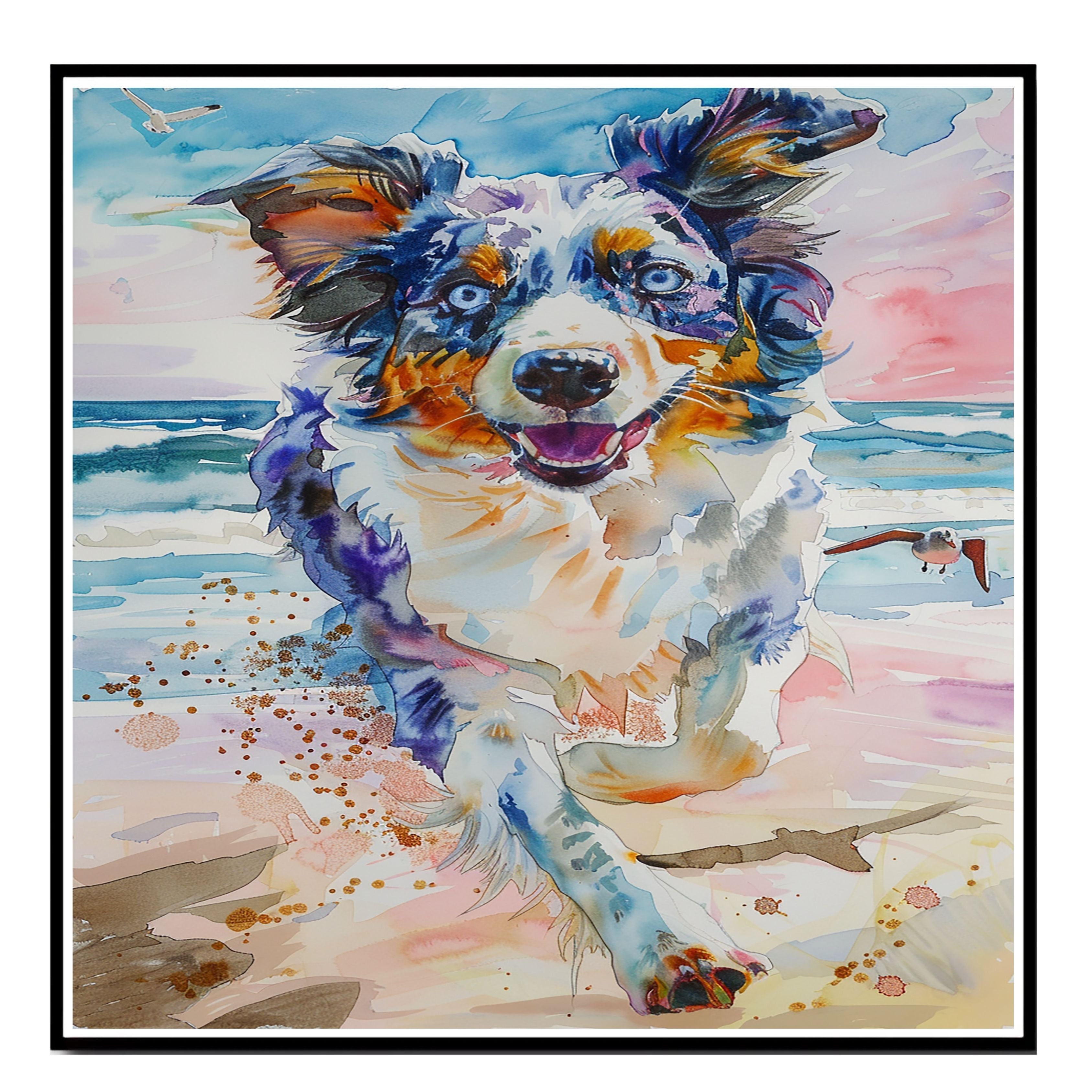 Bursting with personality and movement, this vibrant watercolor captures a joyful dog sprinting along the beach. With expressive brushwork and bright multicolor tones, this artwork brings playful coastal energy to any space—perfect for pet lovers and beach home decor.