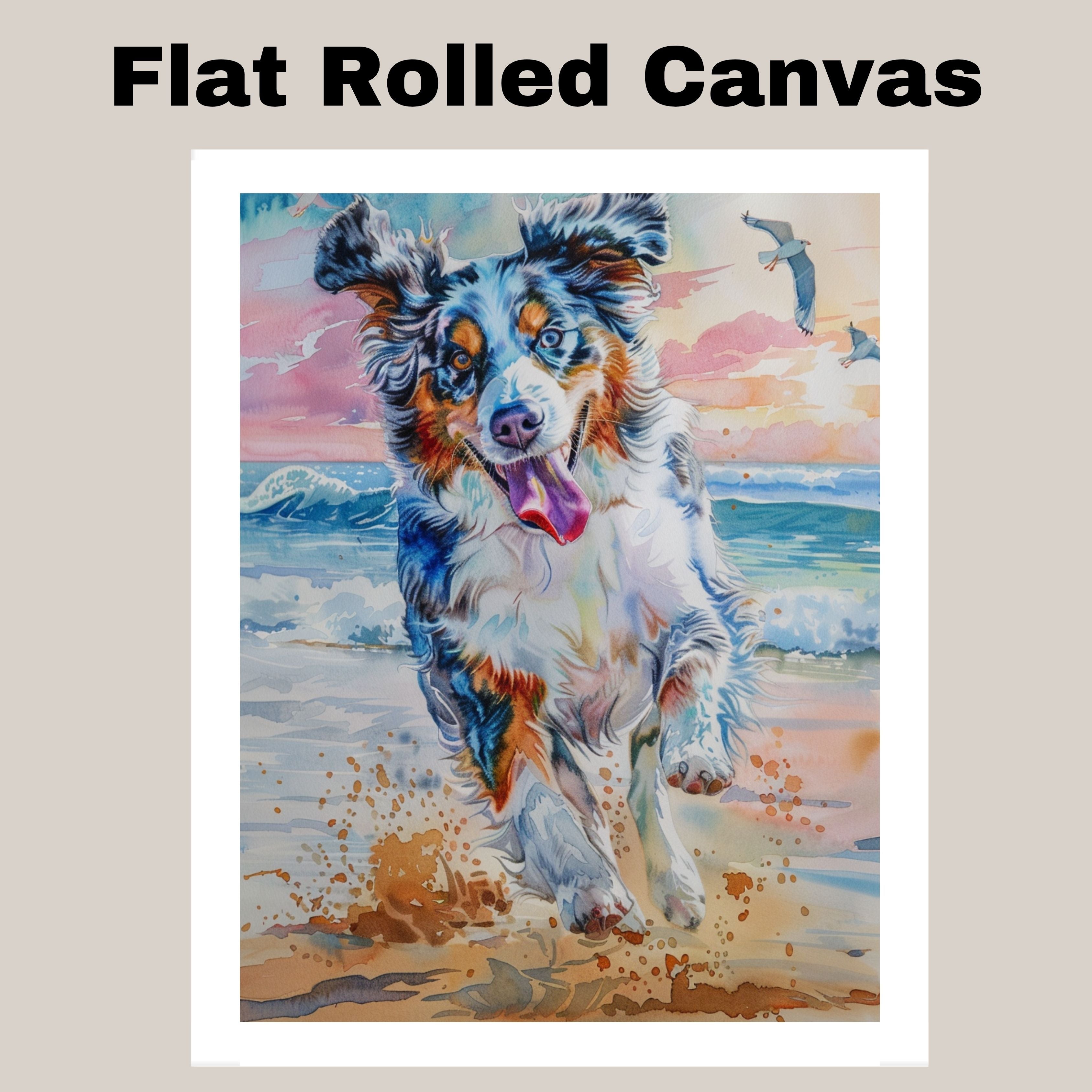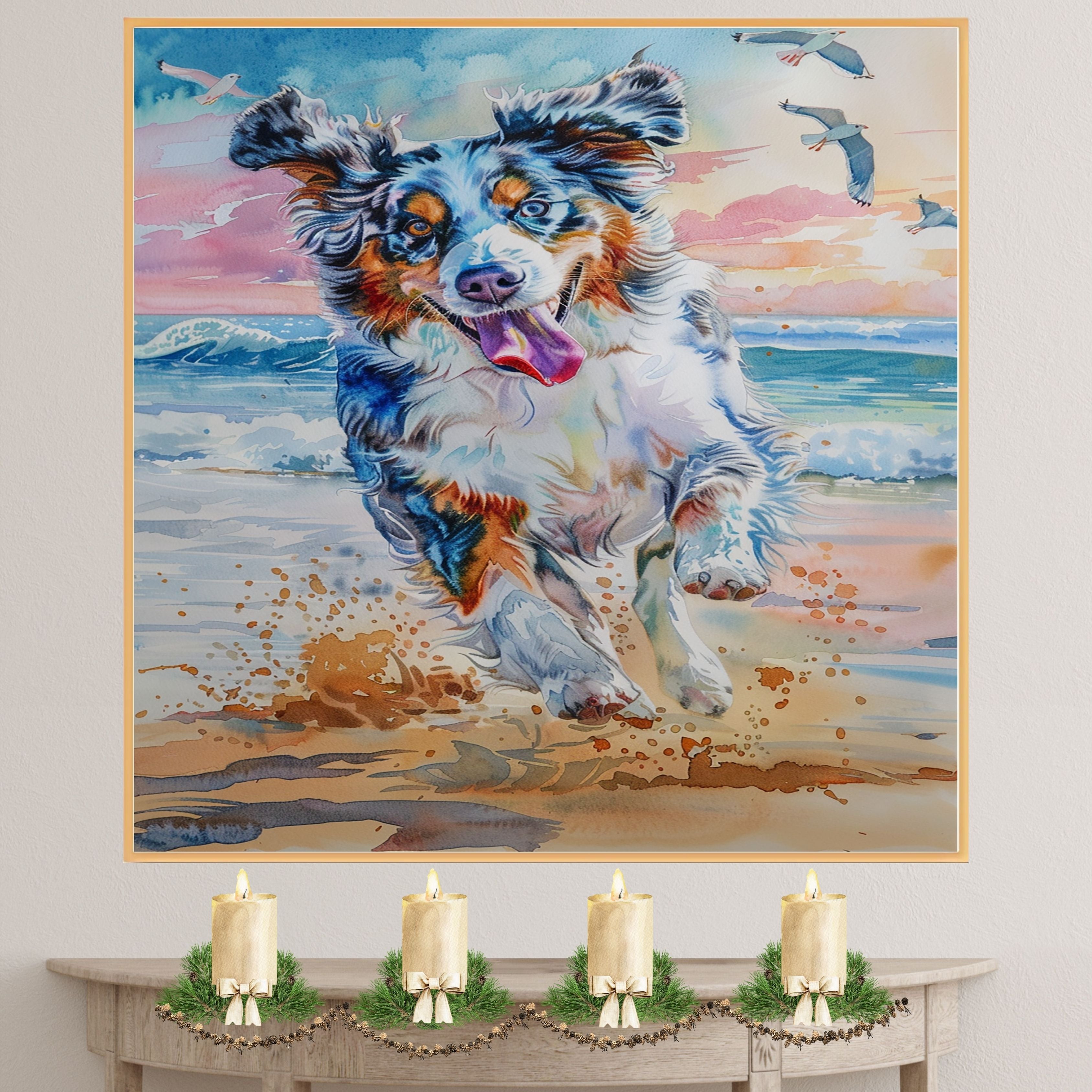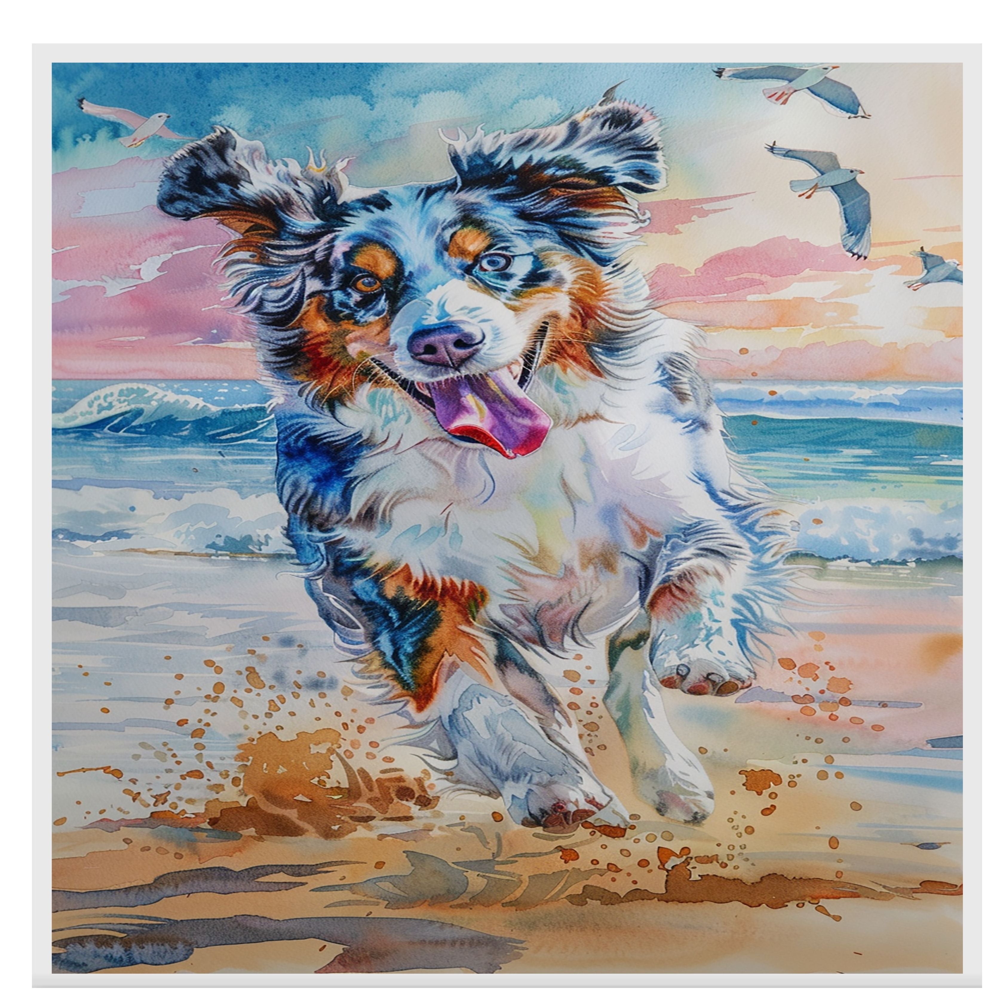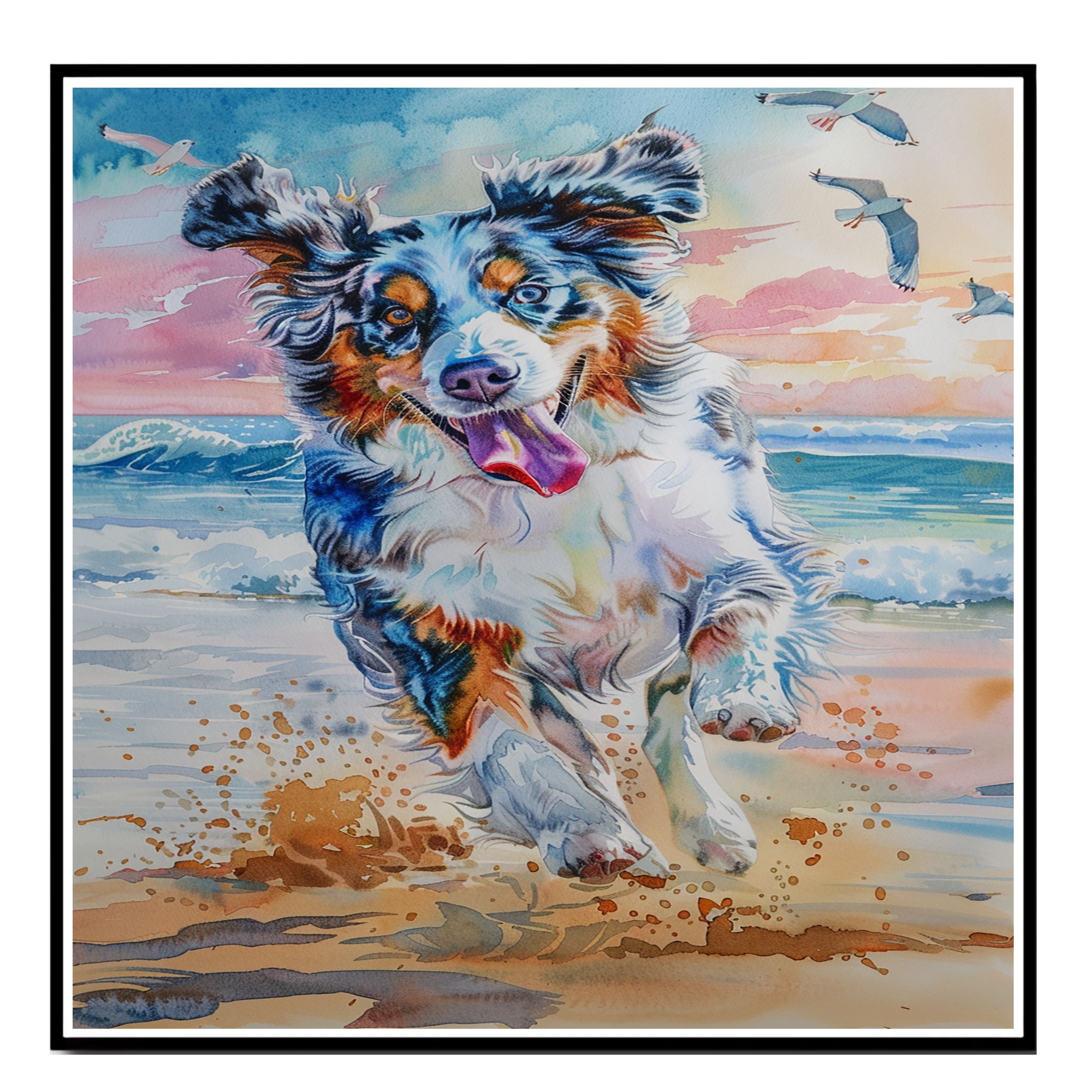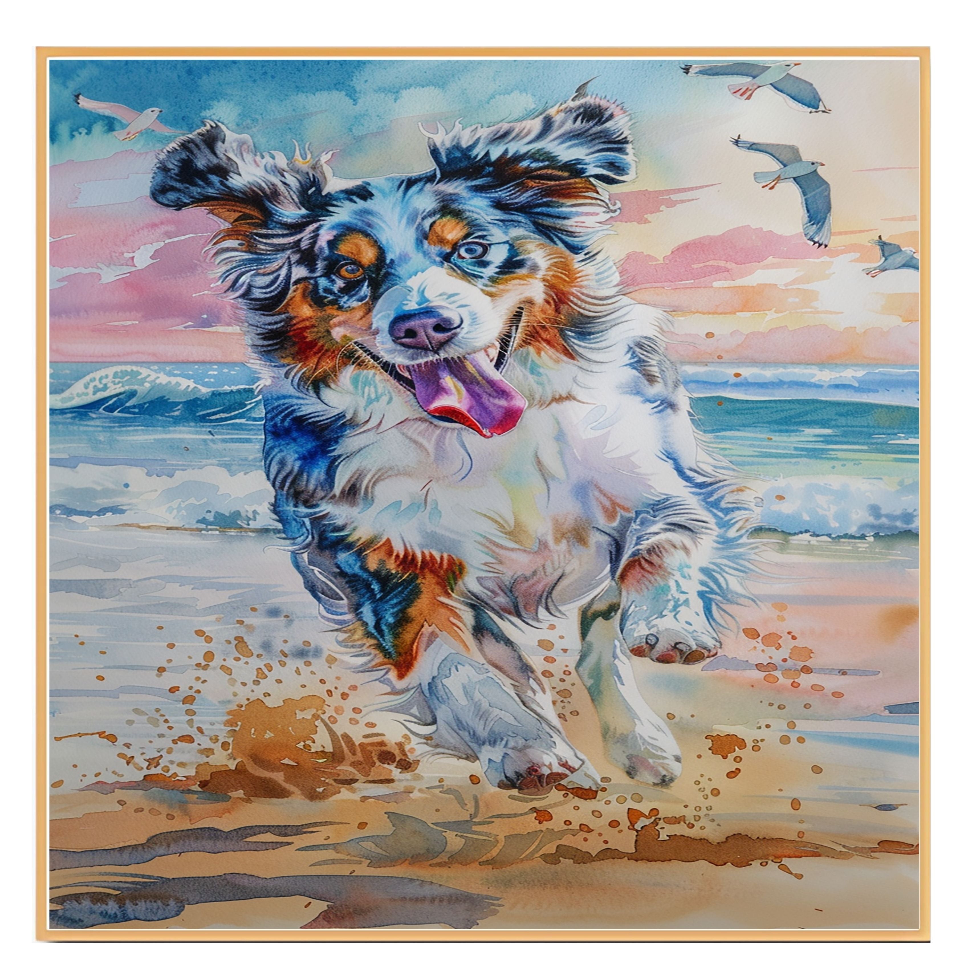 This joyful watercolor artwork captures the unfiltered happiness of a dog running through the sand at the beach. With expressive strokes, colorful splashes, and a tongue-out smile, it’s the perfect feel-good piece for pet lovers, beach house decor, and anyone drawn to seaside joy.