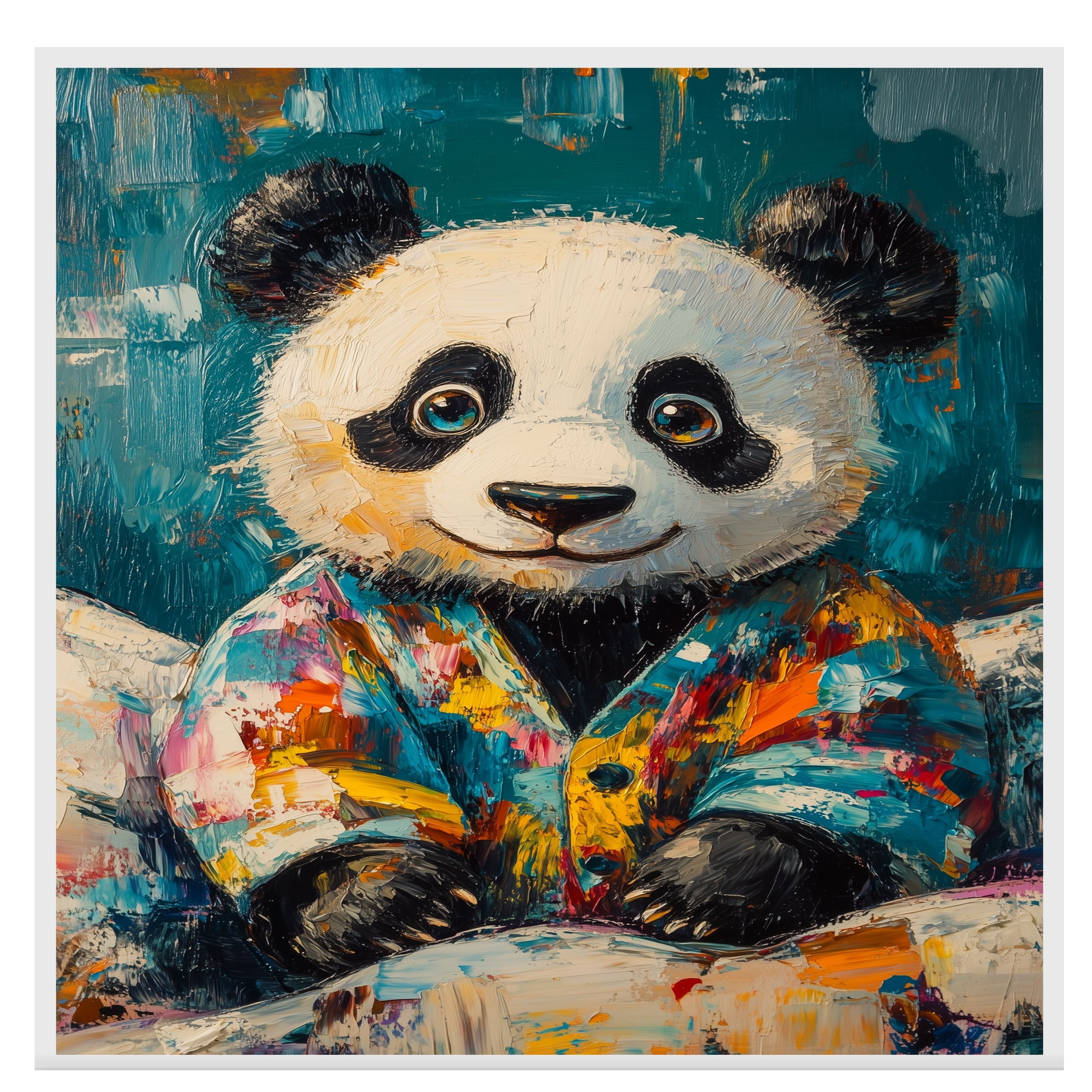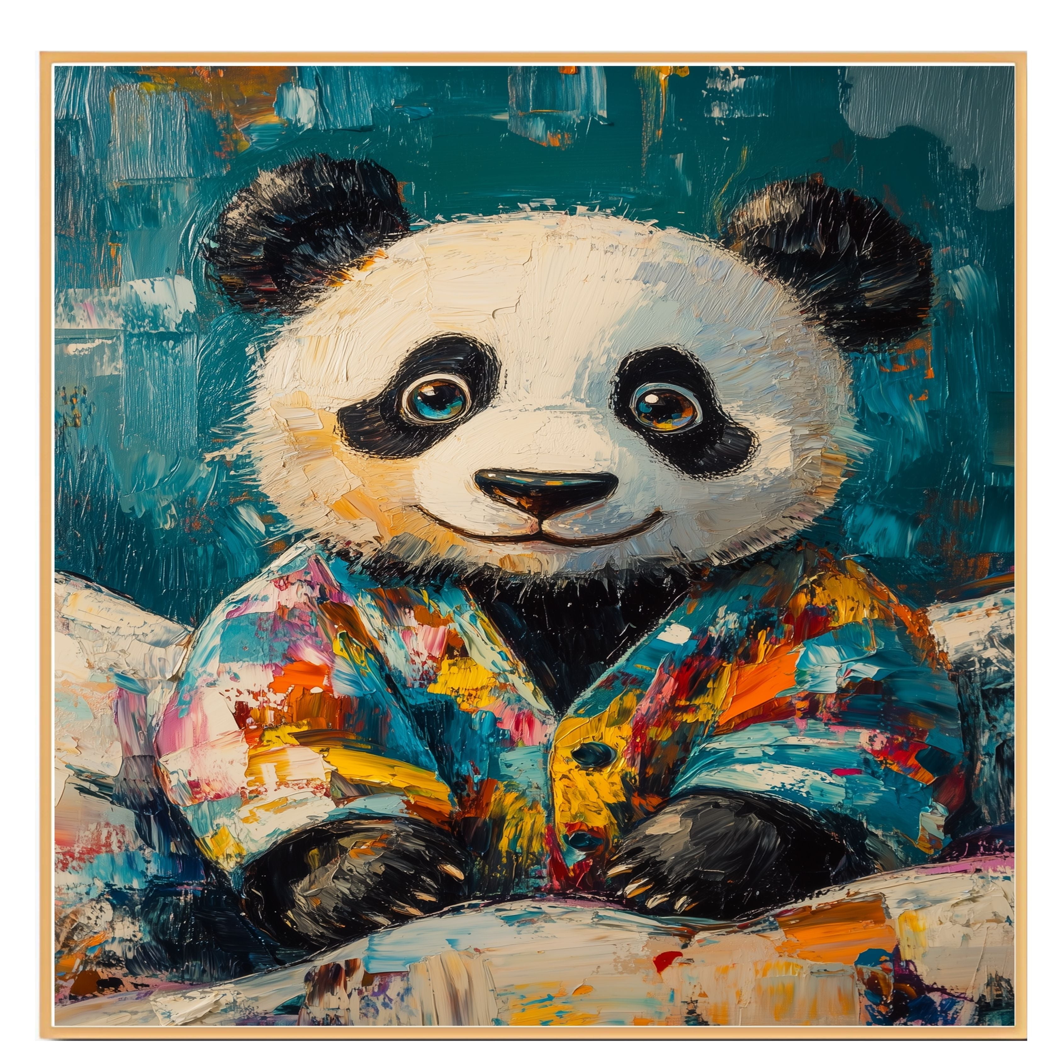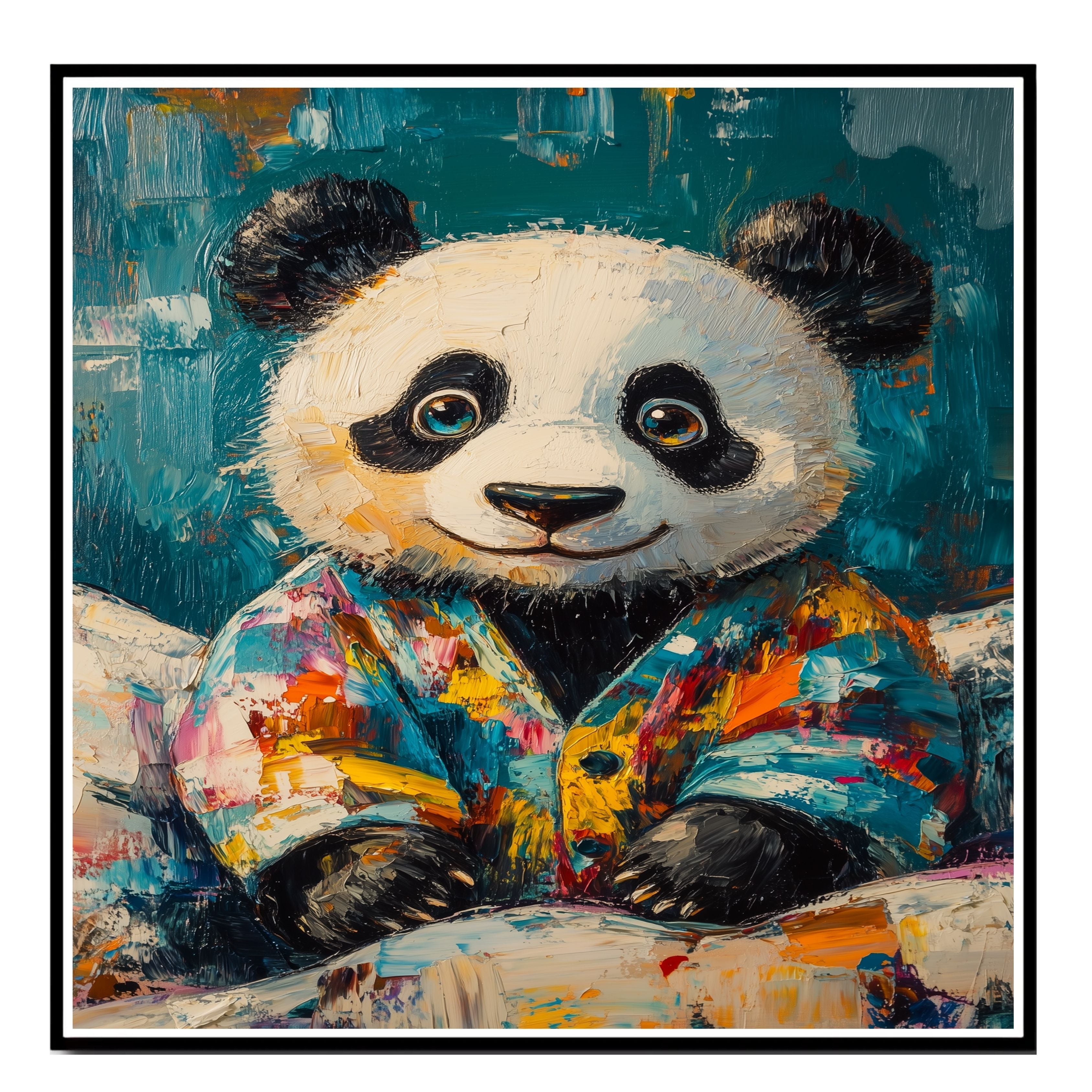 This vibrant painting features an adorable panda bear wearing a bright, multicolored jacket and sitting with a sweet, calm expression. The bold brushstrokes and rich textures bring this lovable character to life, making it a joyful and eye-catching piece perfect for any animal-themed space, nursery, or cozy corner.