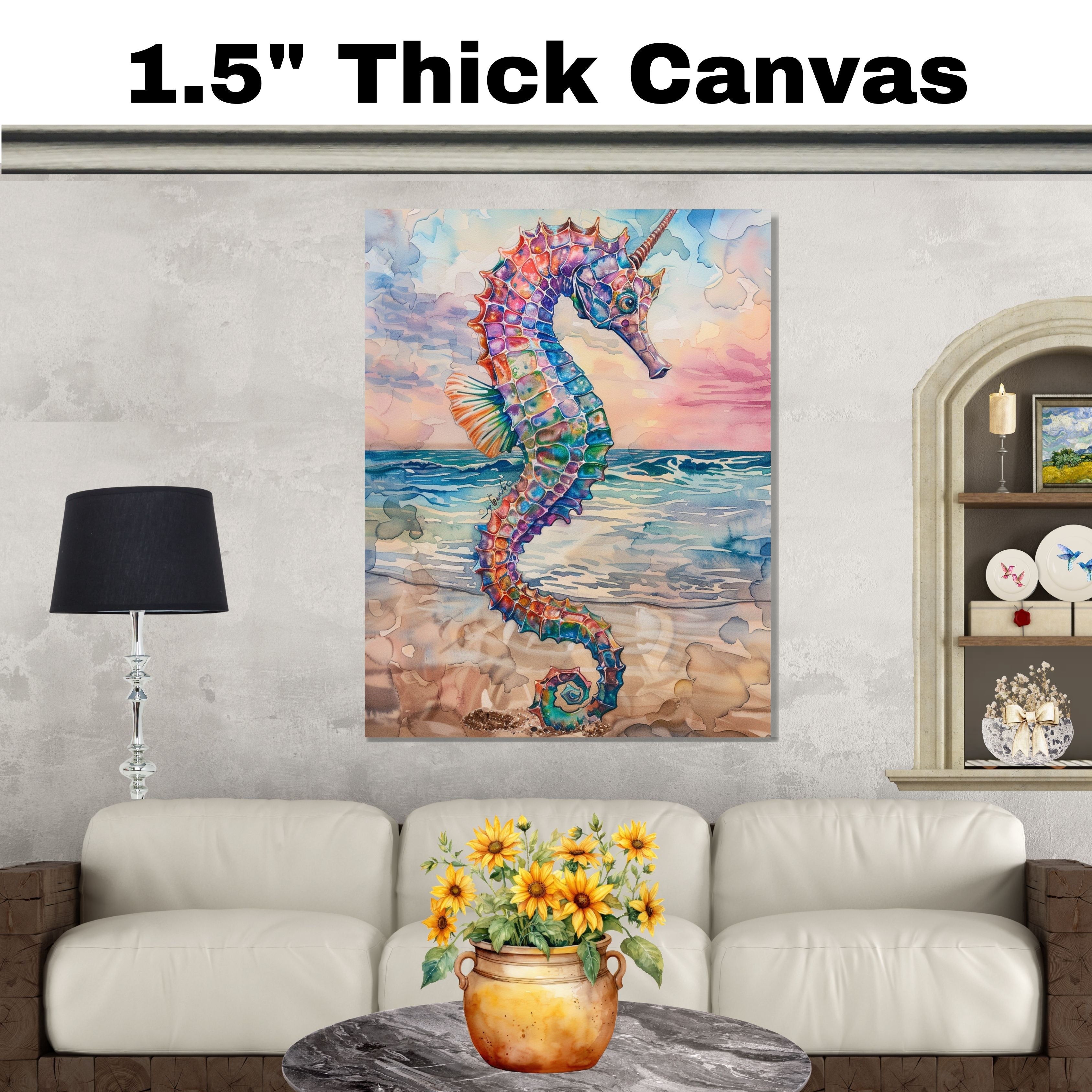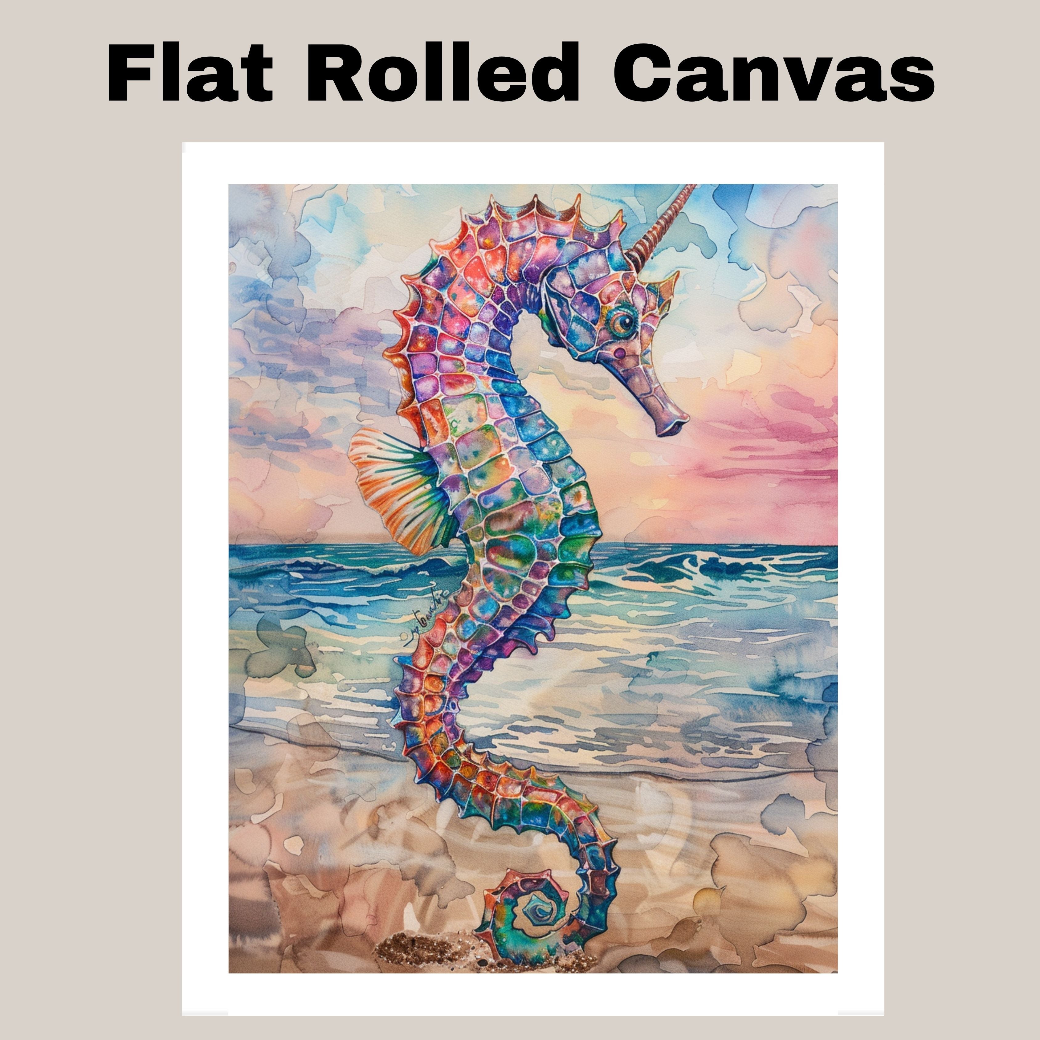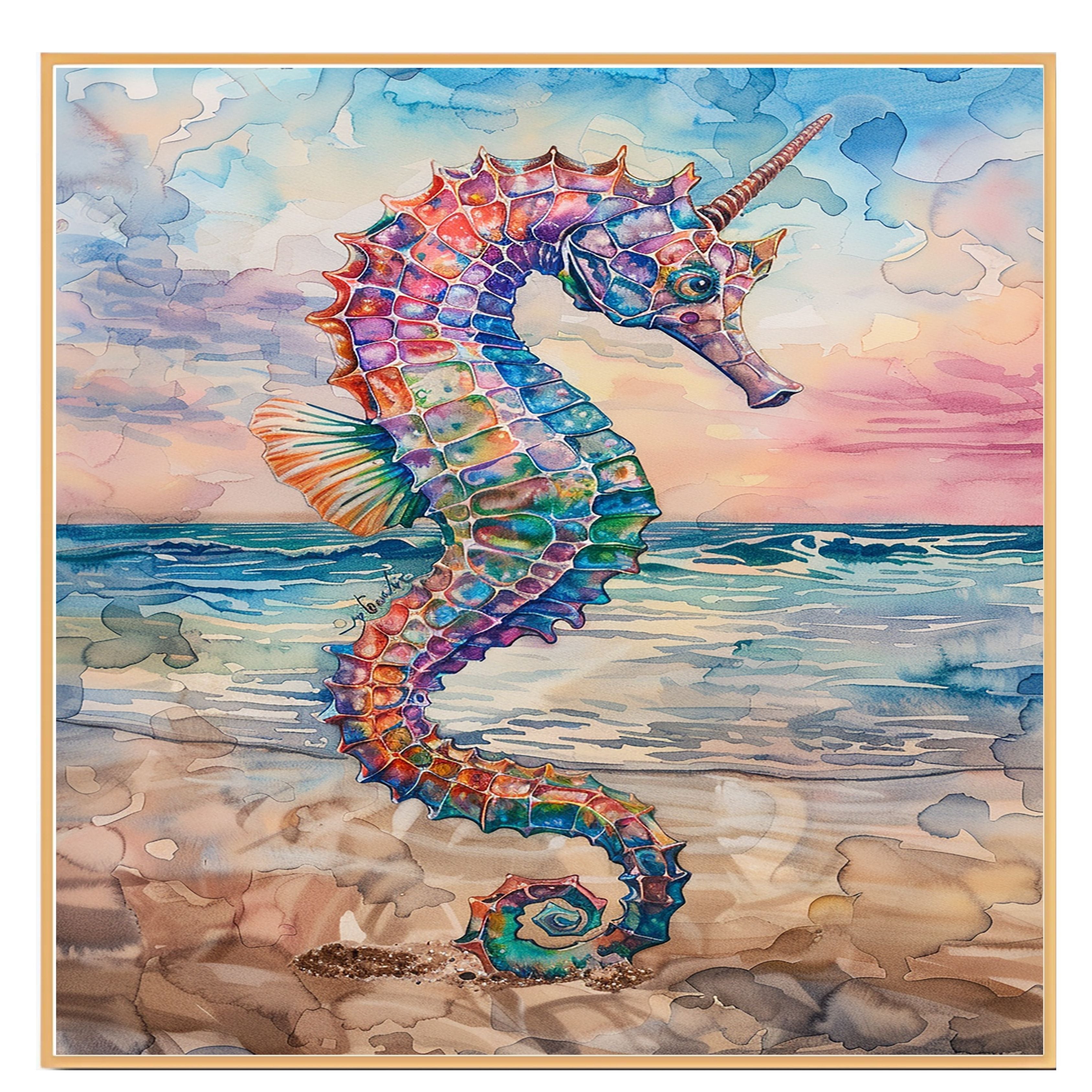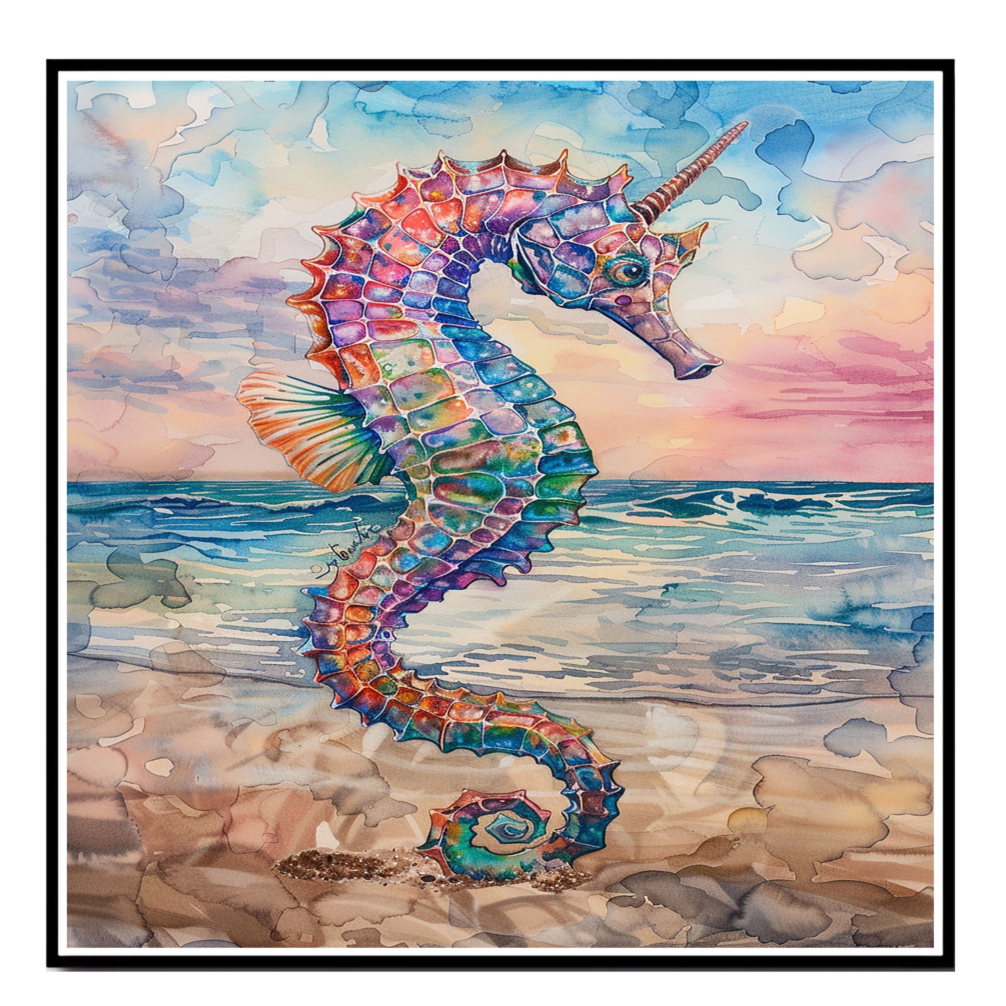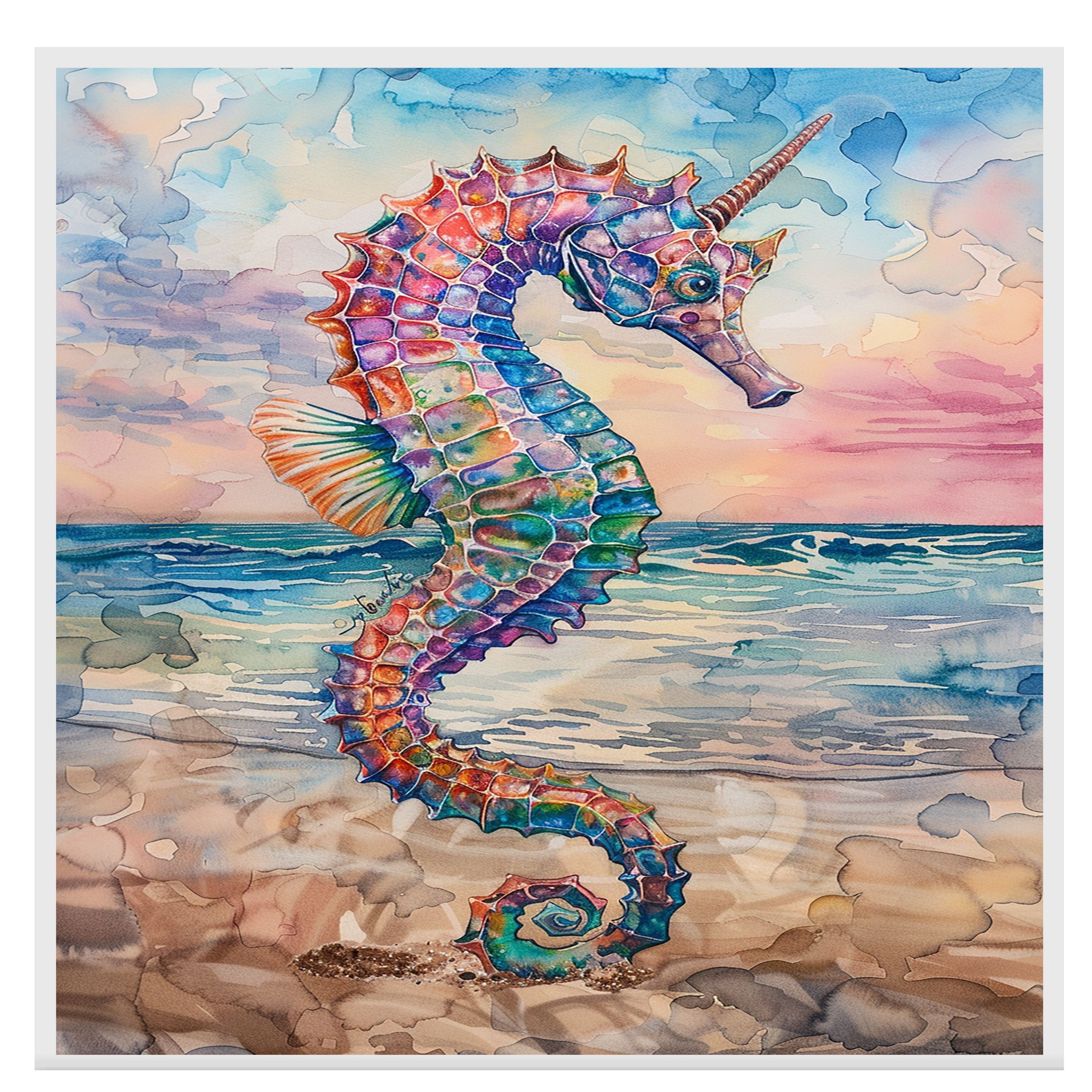 Experience the whimsical charm of this fantasy seahorse watercolor, featuring rainbow-colored scales, a unicorn horn, and an ocean at sunset. An imaginative celebration of marine life and color.