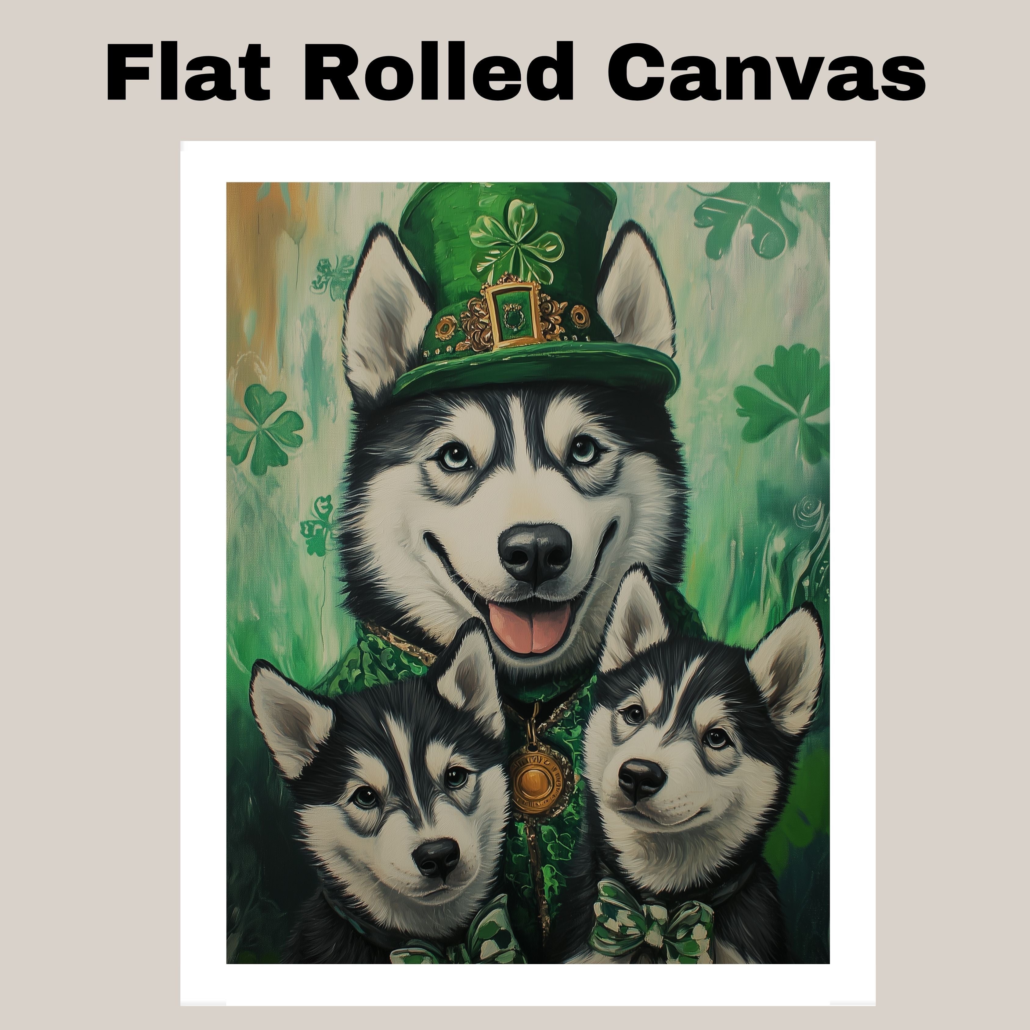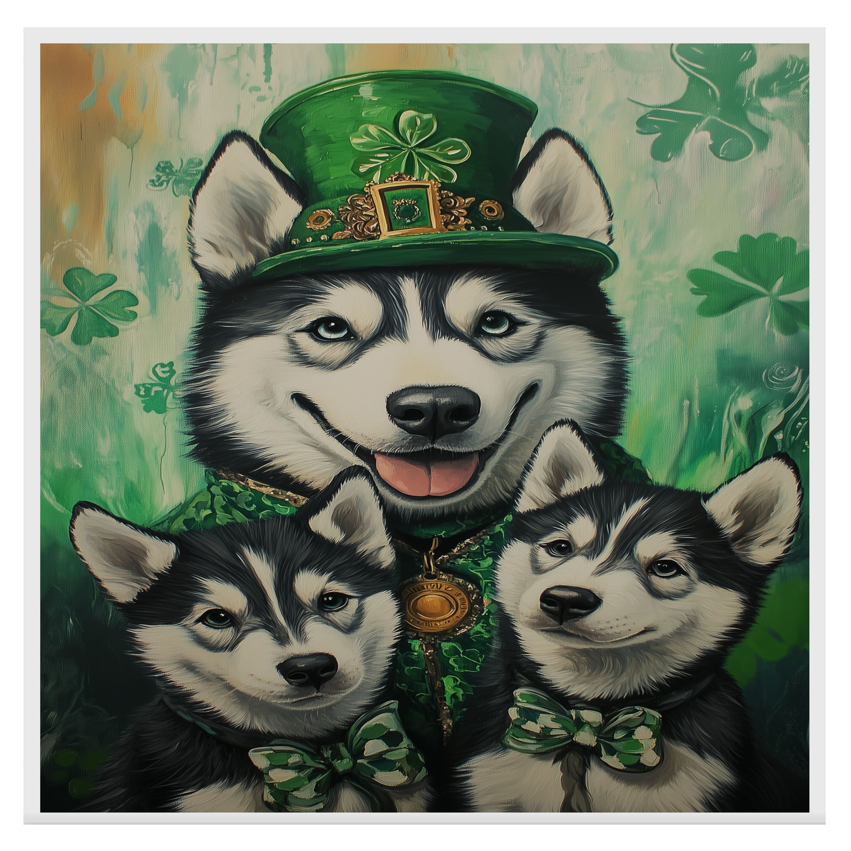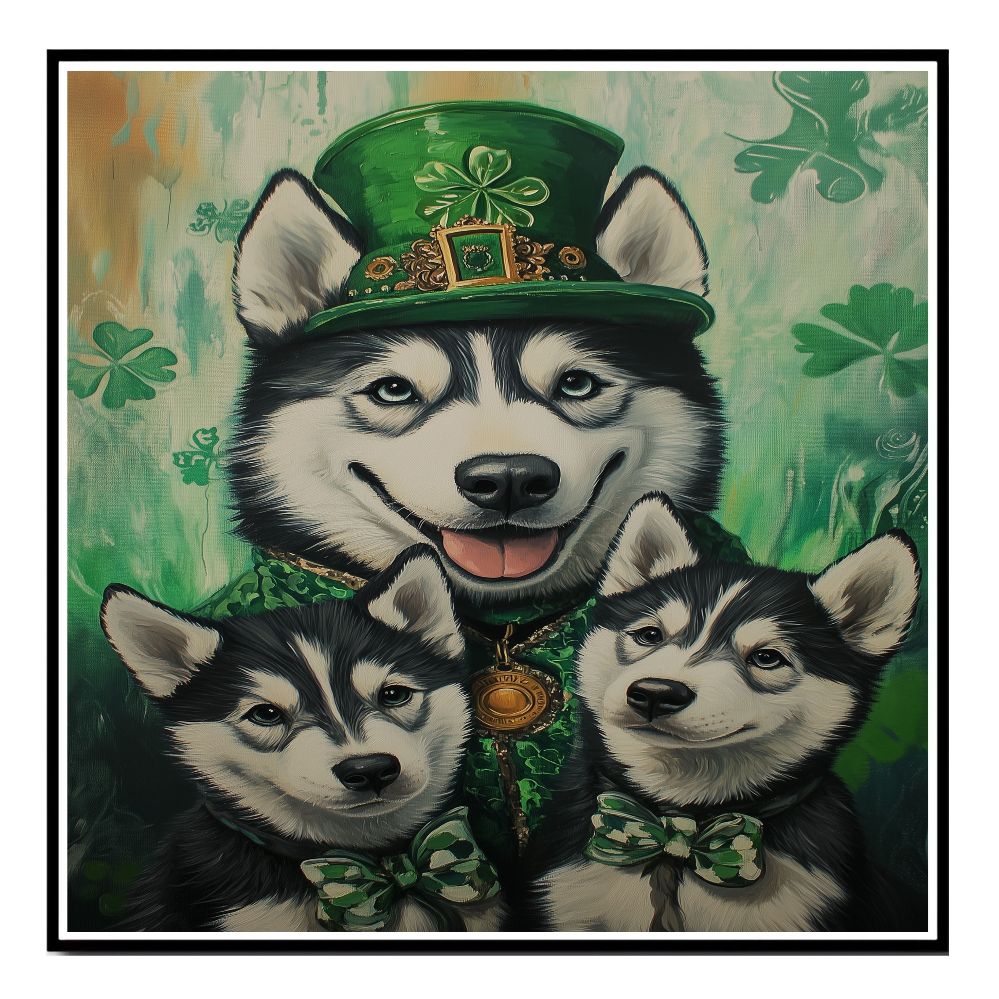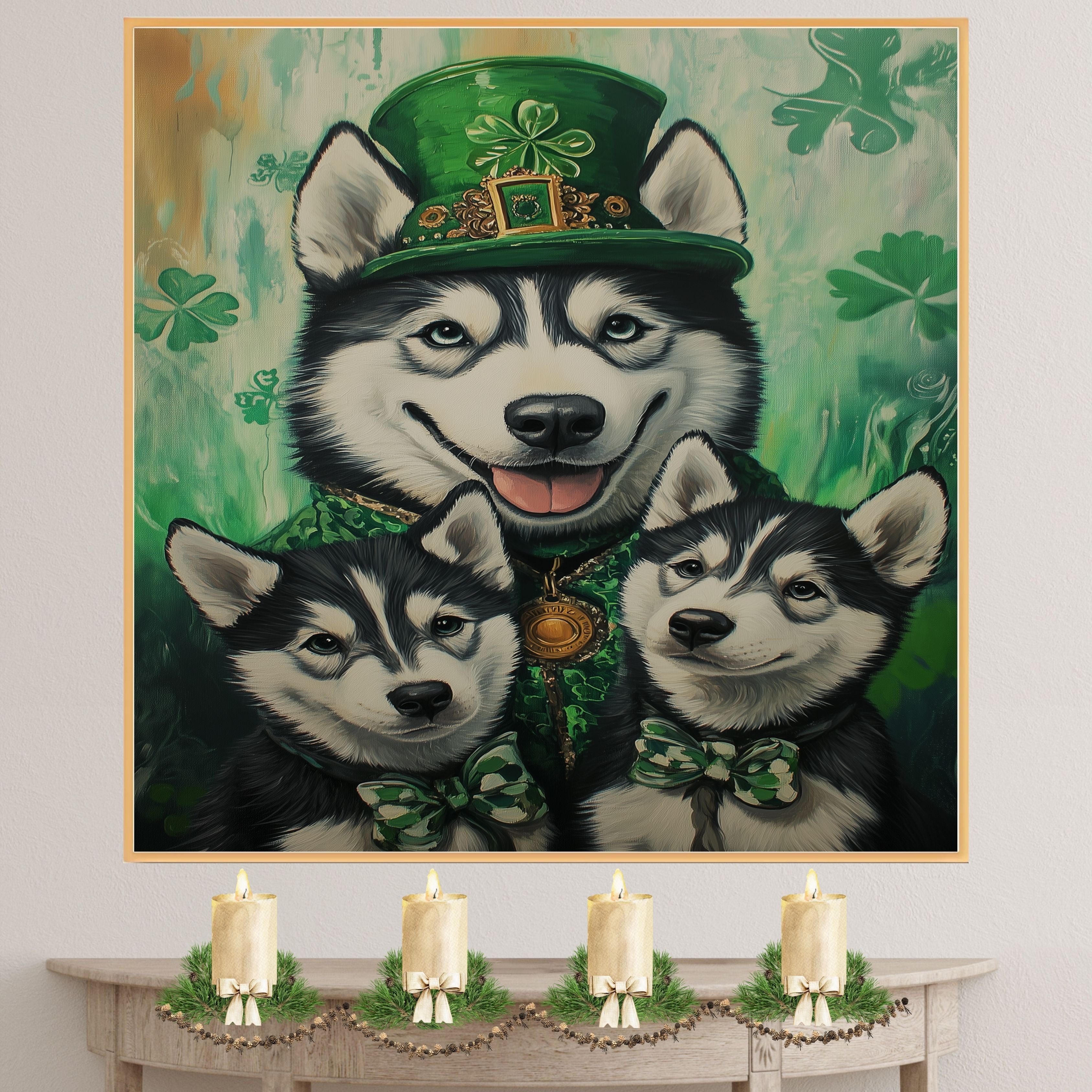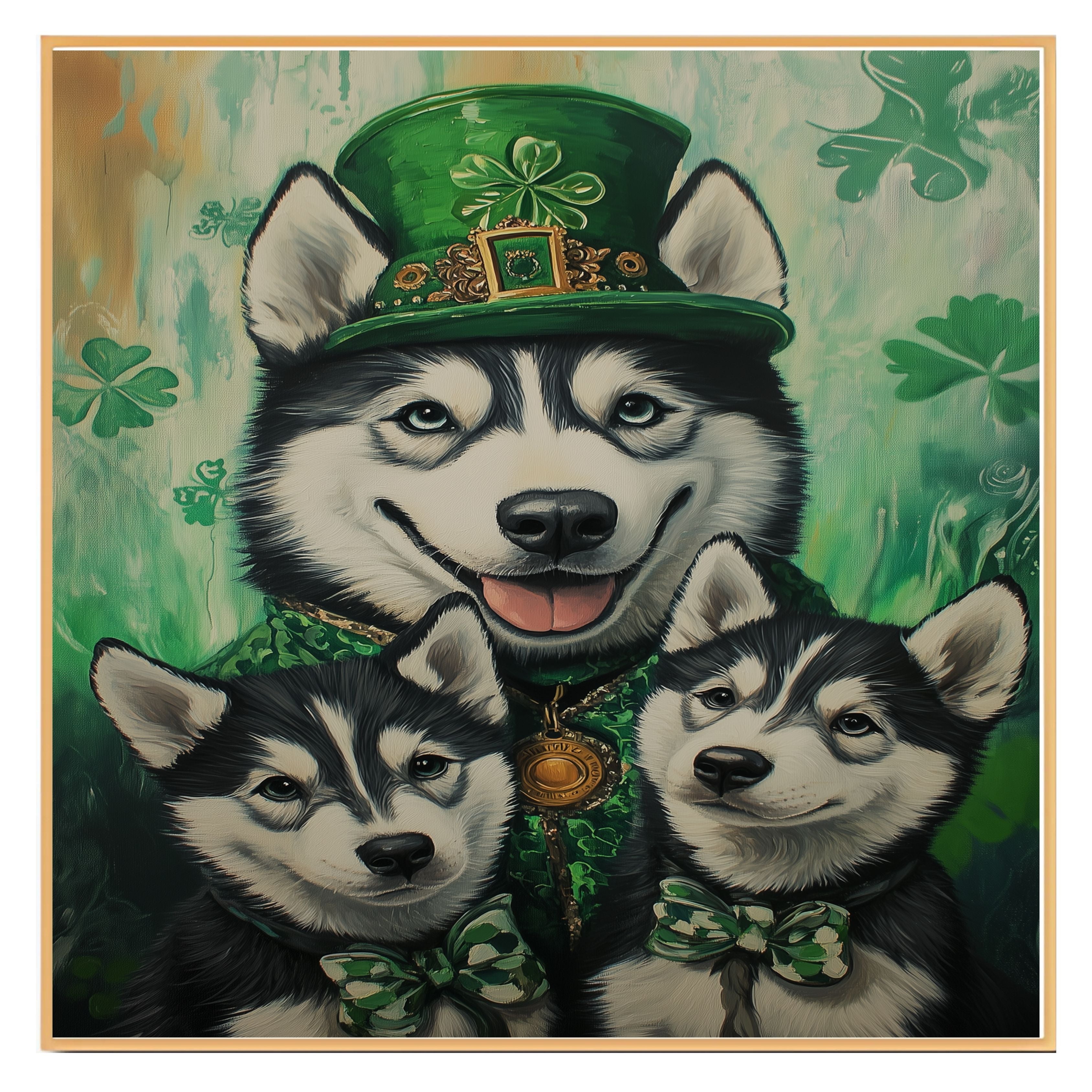"Festive Charm" Canvas captures the playful spirit of St. Patricks Day with a proud Siberian Husky and a litter of adorable puppies, all dressed in delightful green attire. This heartwarming scene radiates luck and joy, featuring shamrocks, festive accessories, and the irresistible charm of these furry companions. Perfect for adding a whimsical and celebratory touch to your space, this artwork is available on a 1.5" thick canvas wrap, floating framed canvas, or as a flat rolled canvas. A lucky and thoughtful gift for dog lovers and St. Patrick's Day enthusiasts alike!