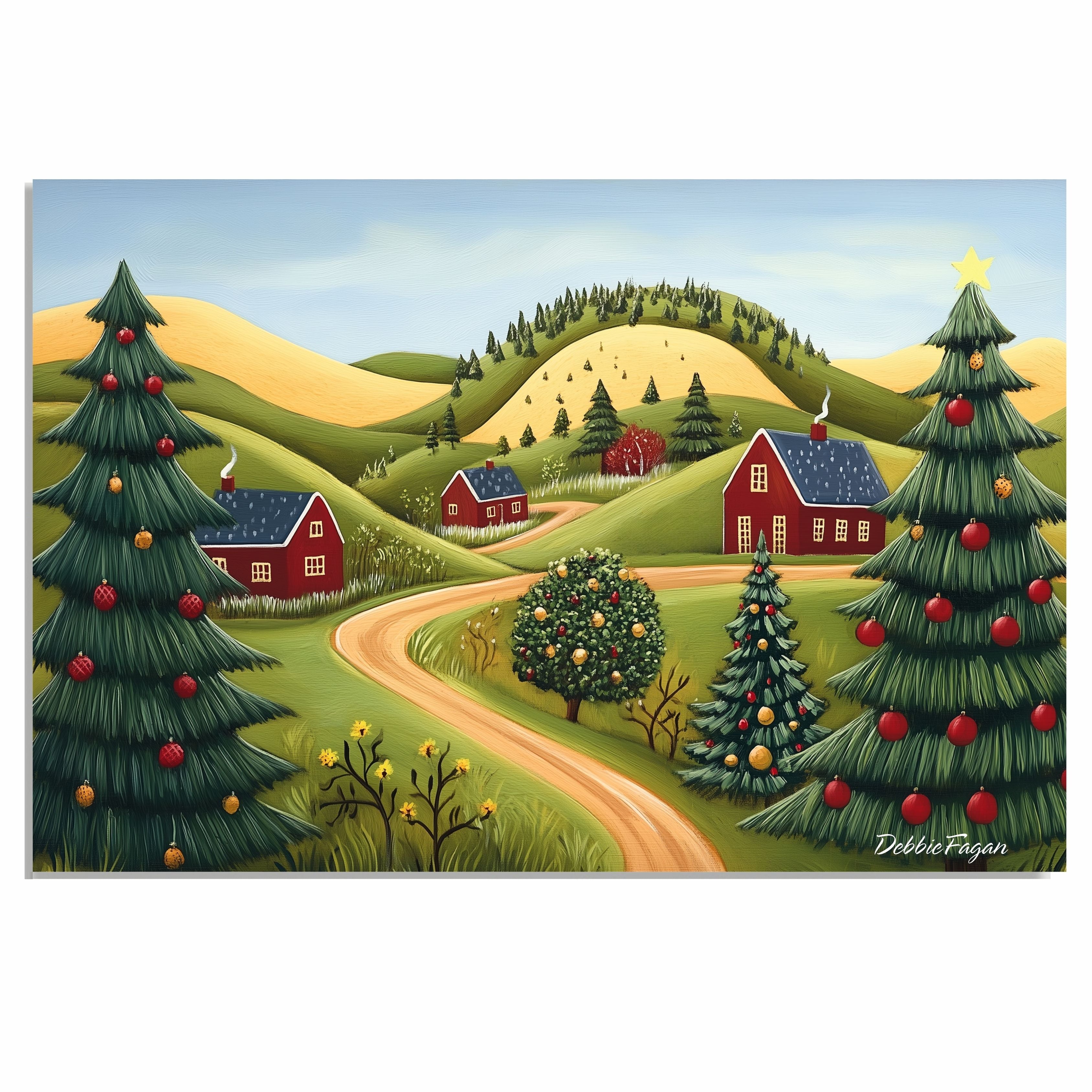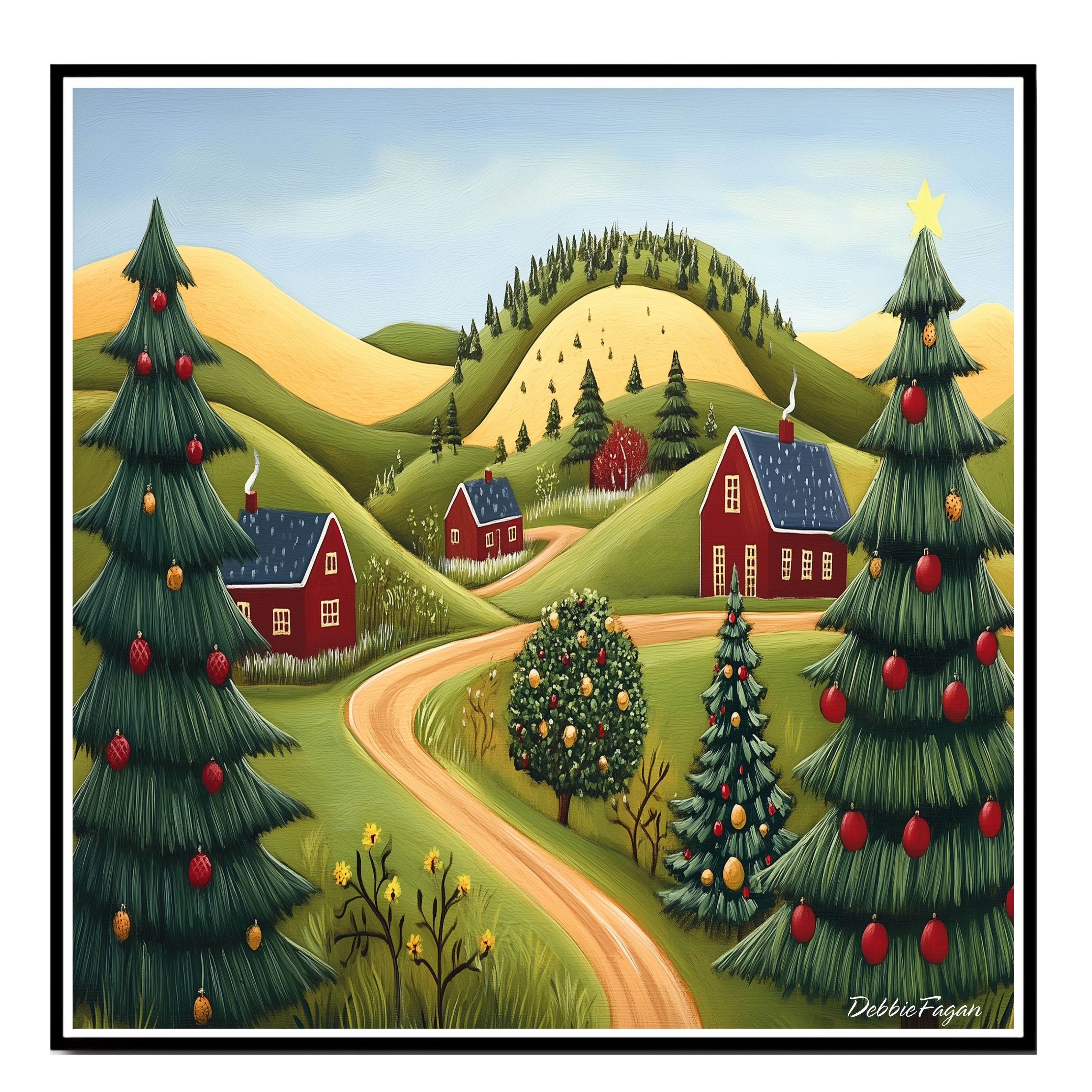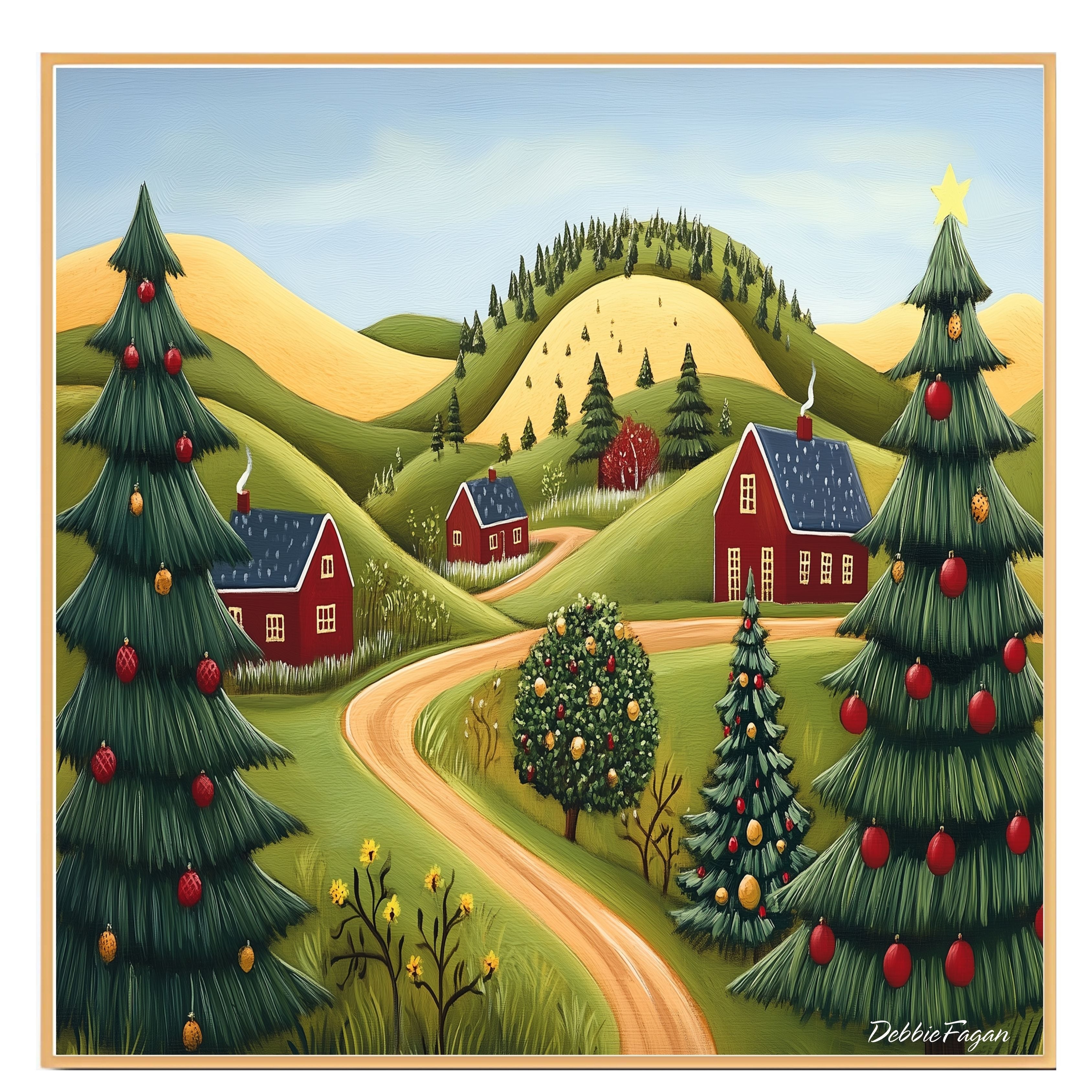 This charming folk art painting features red houses nestled in green rolling hills with Christmas trees decorated...