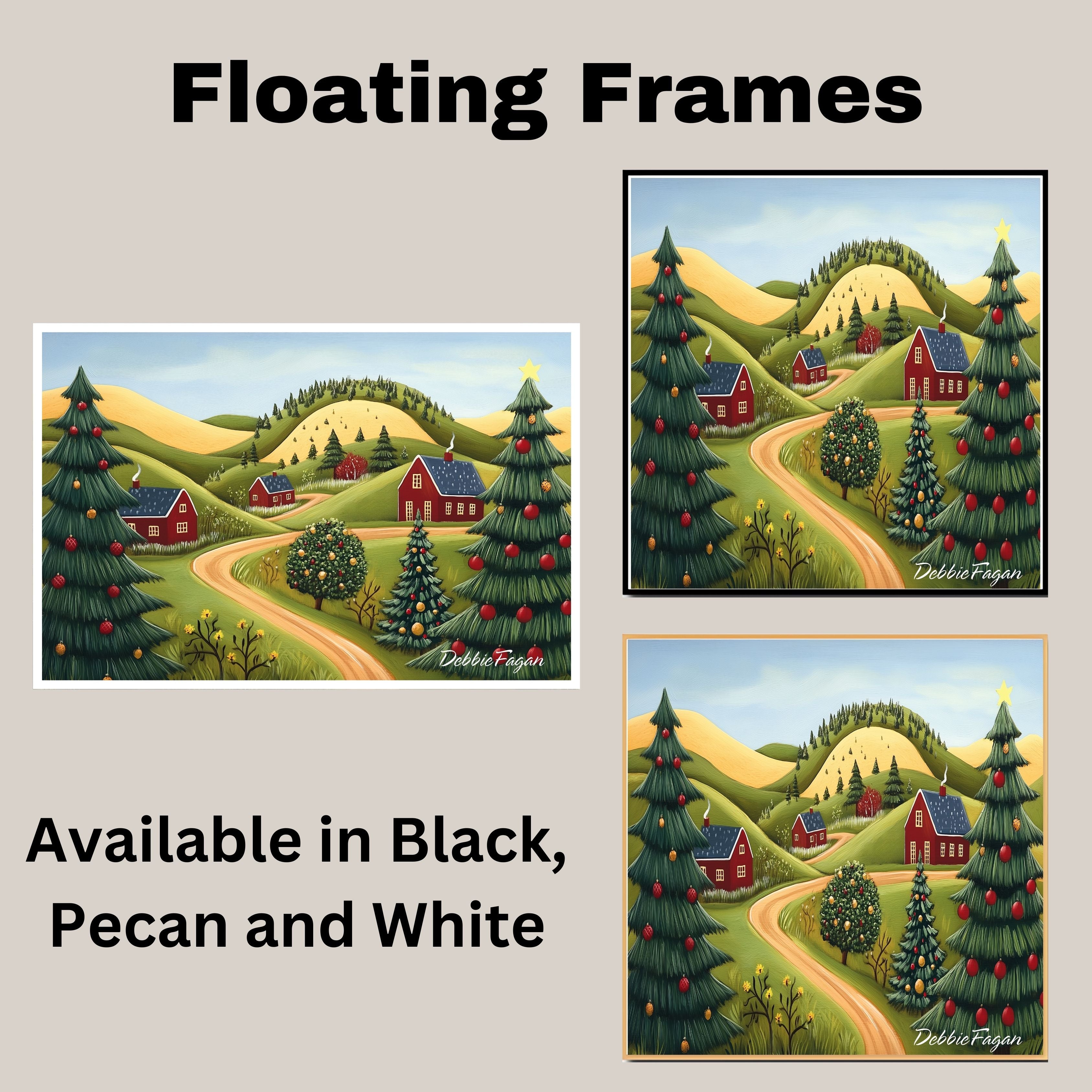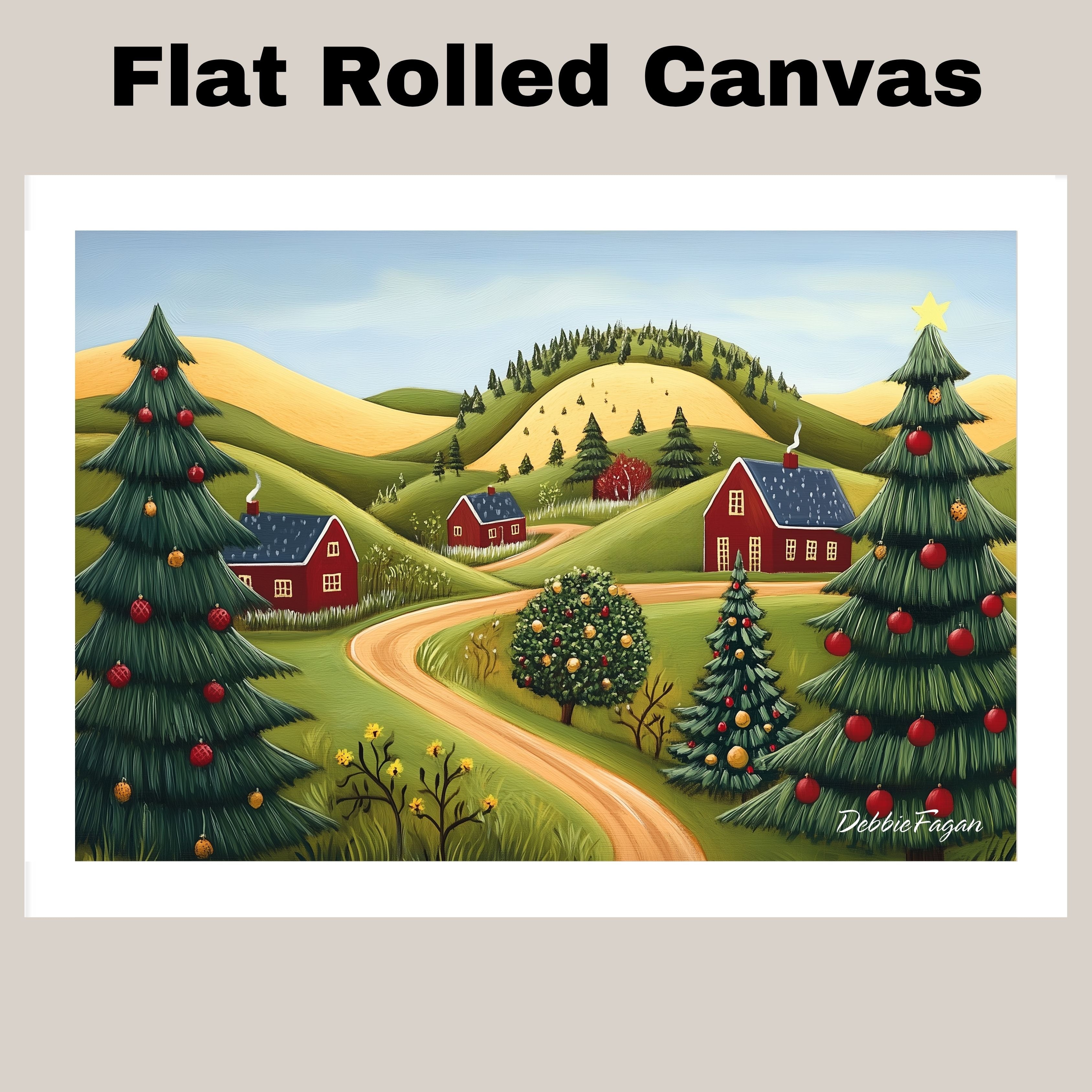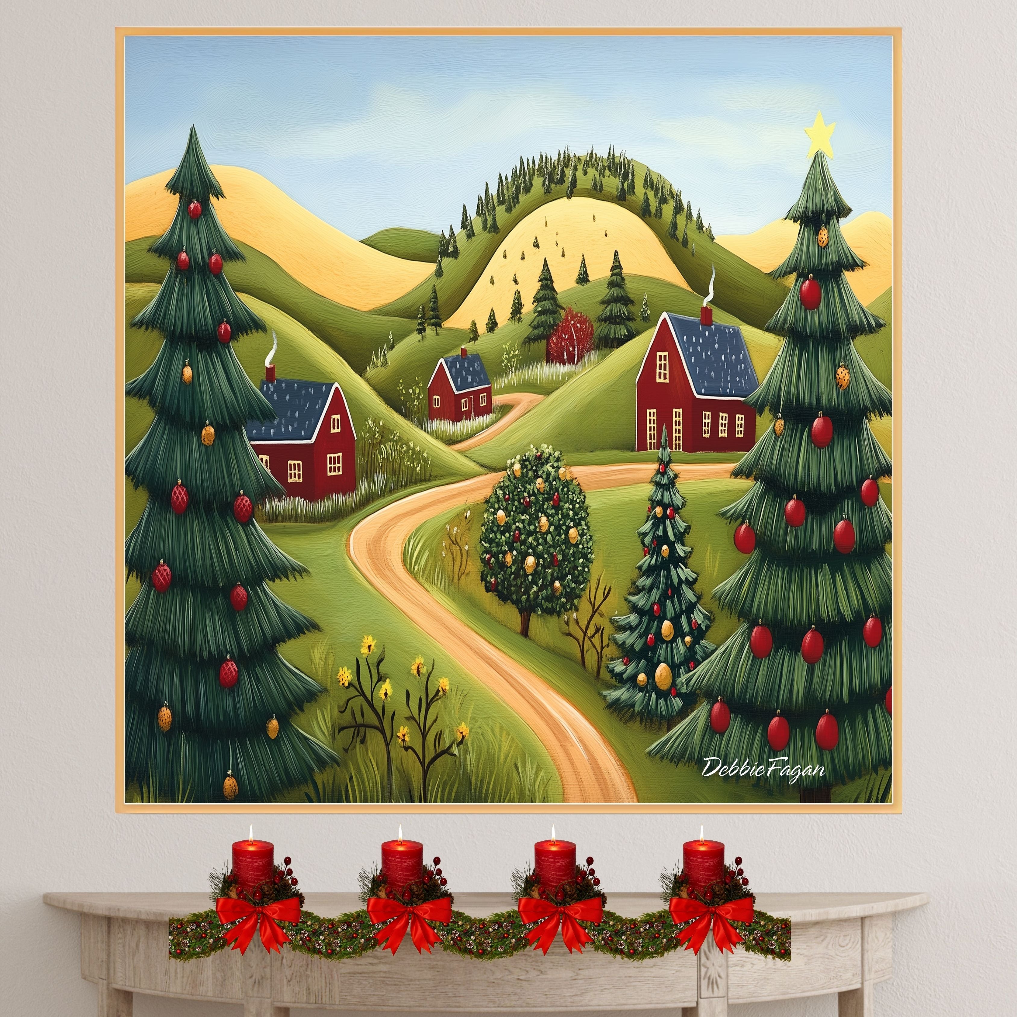 Festive Folk Art Christmas Scene with Red Houses, Rolling Hills, and Decorated Trees Under a Peaceful Winter Sky on Ready to Hang 1.5" Thick Canvas Wrap, Floating Framed Canvas, Flat Rolled Canvas