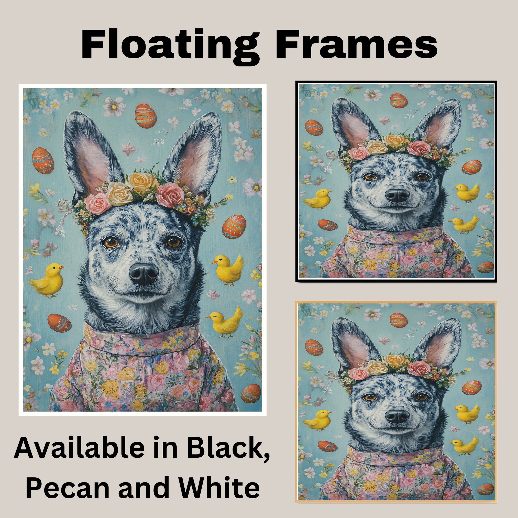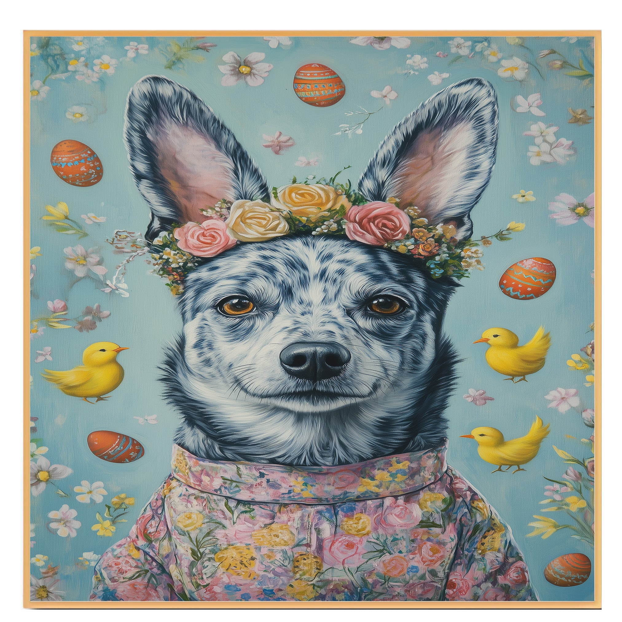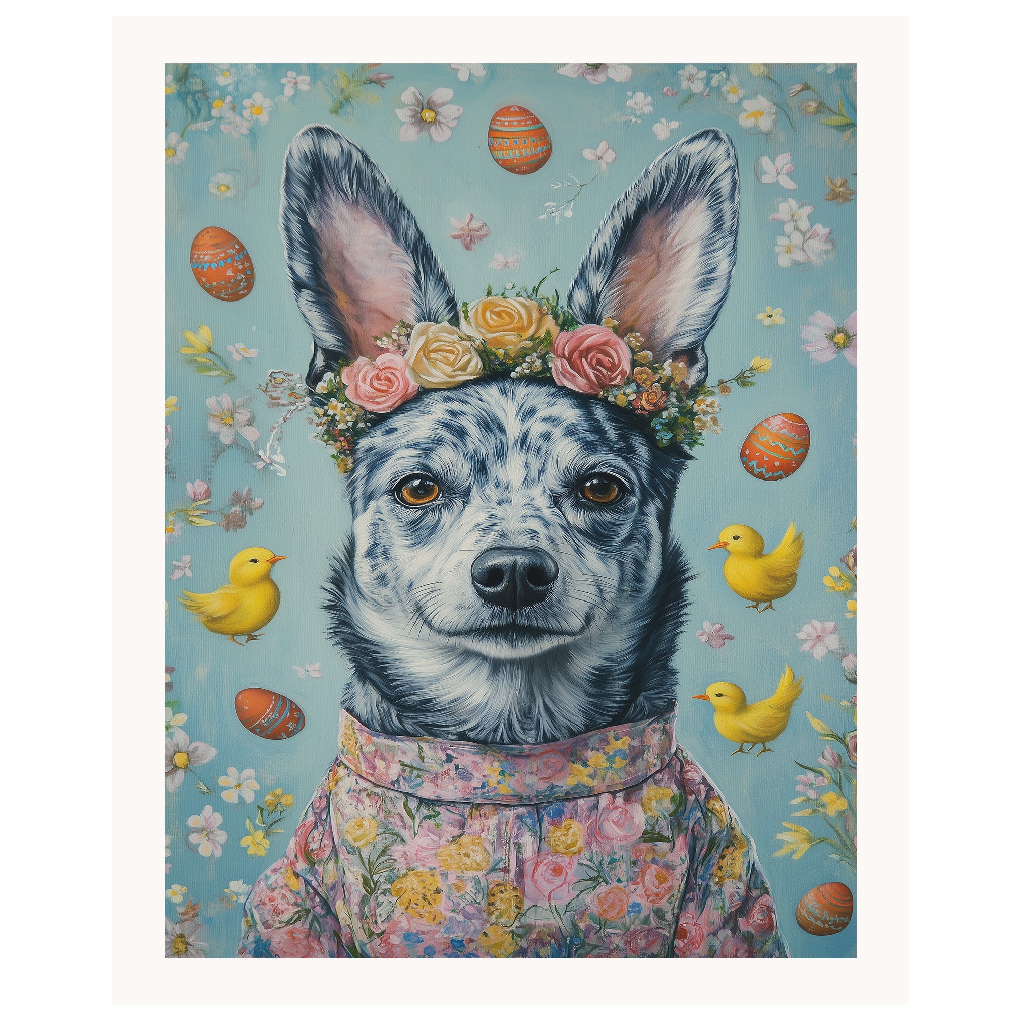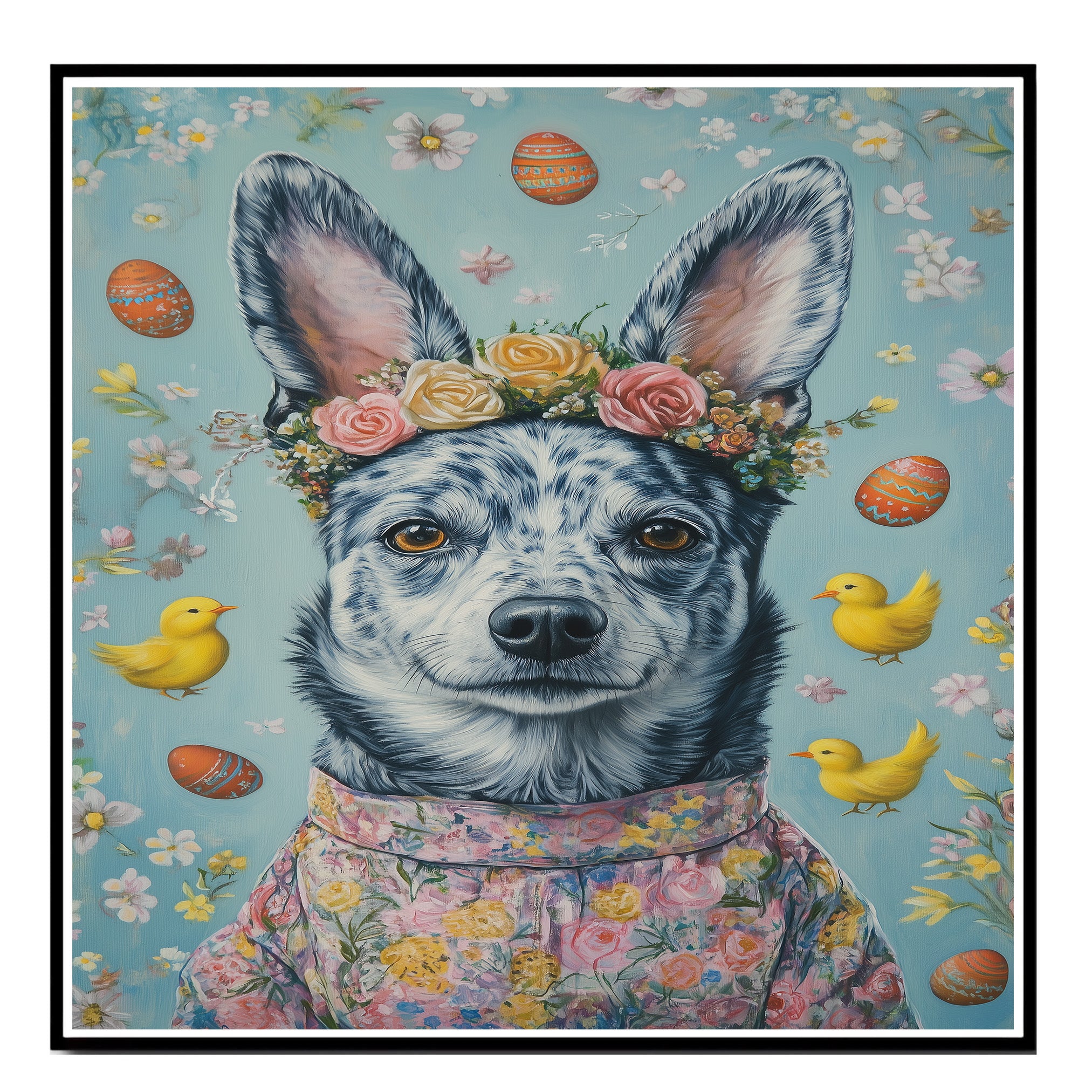 Festive Paws: Blue Heeler Showcasing a Cheerful Easter Look on High-Quality Canvas Wrap, Framed Print, or Rolled Artwork