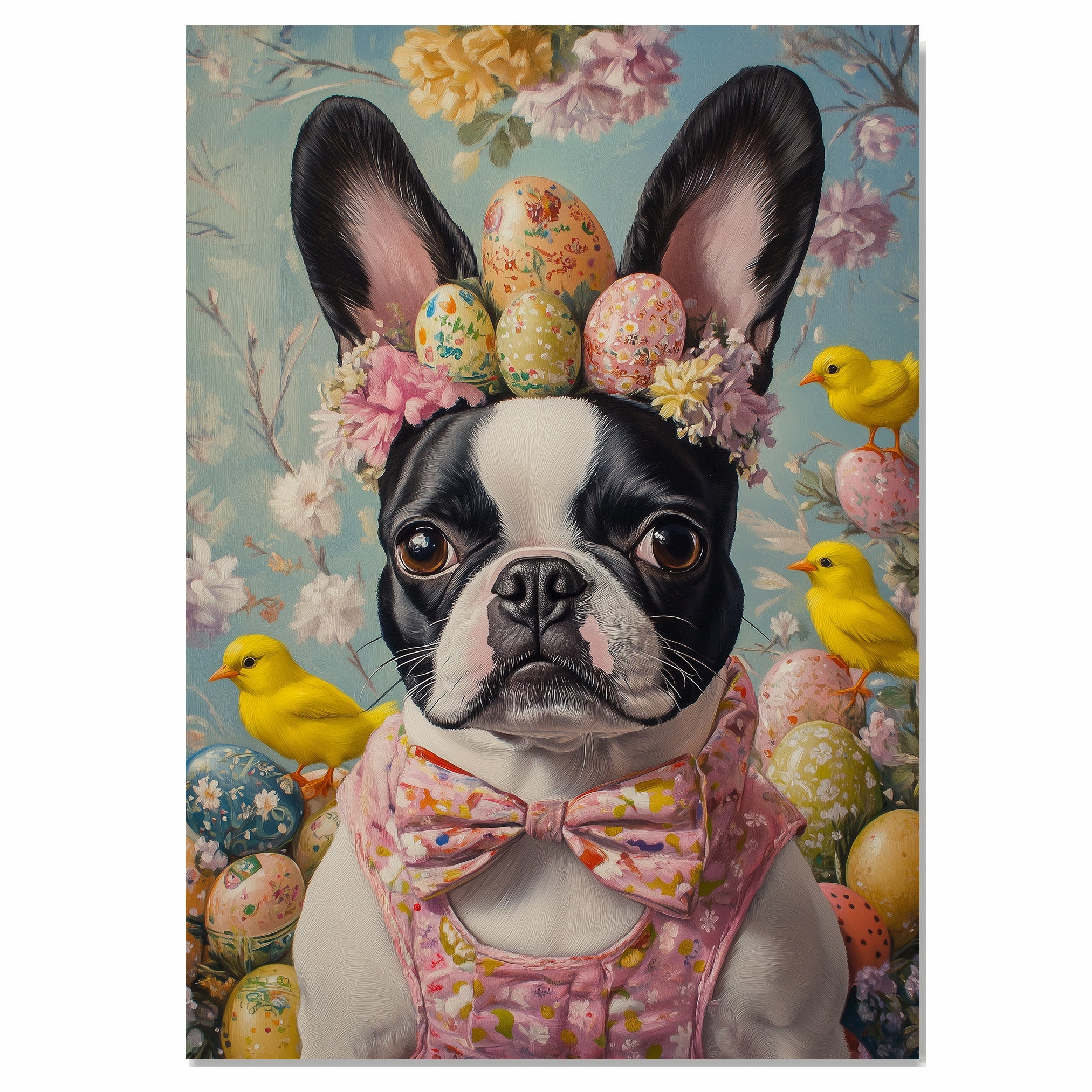 Festive Paws: Boston Terrier Sporting a Charming Springtime Look on High-Quality Canvas Wrap, Framed Print, or Rolled Artwork