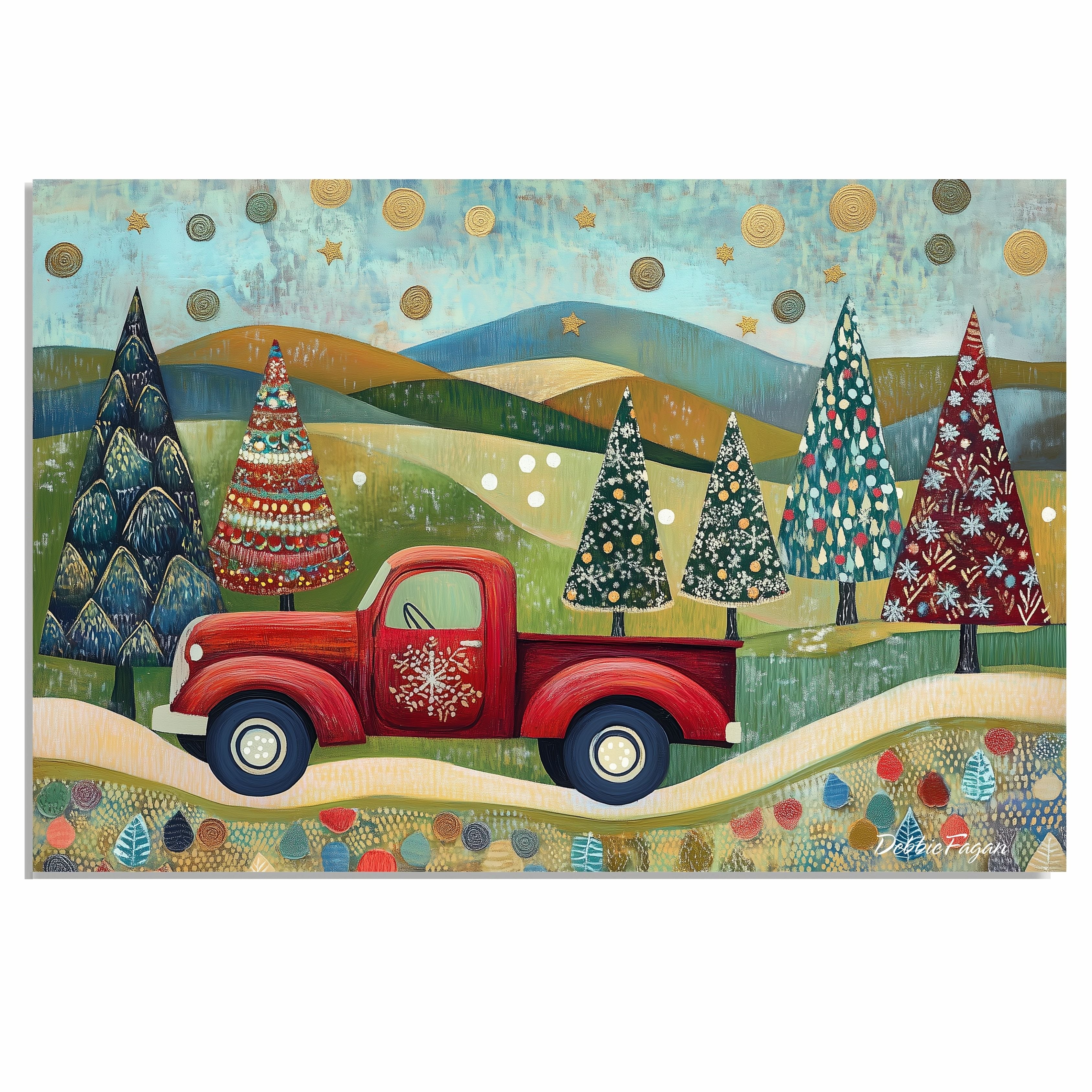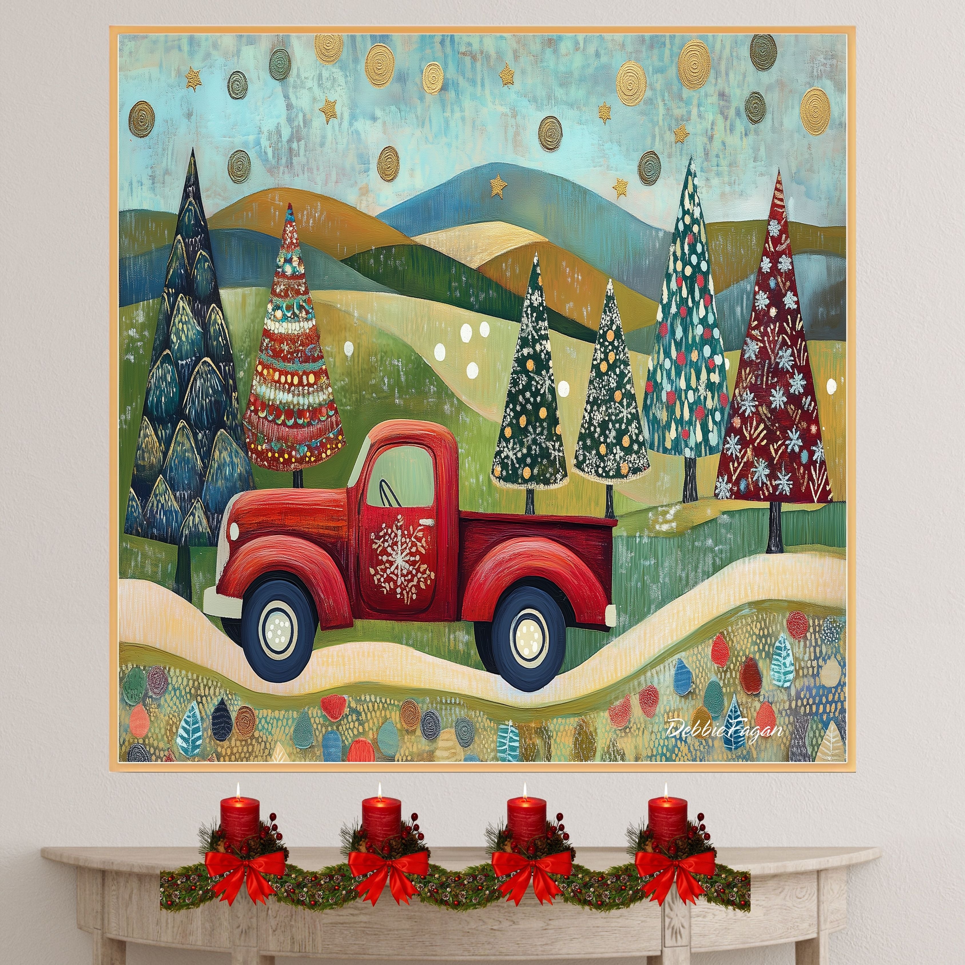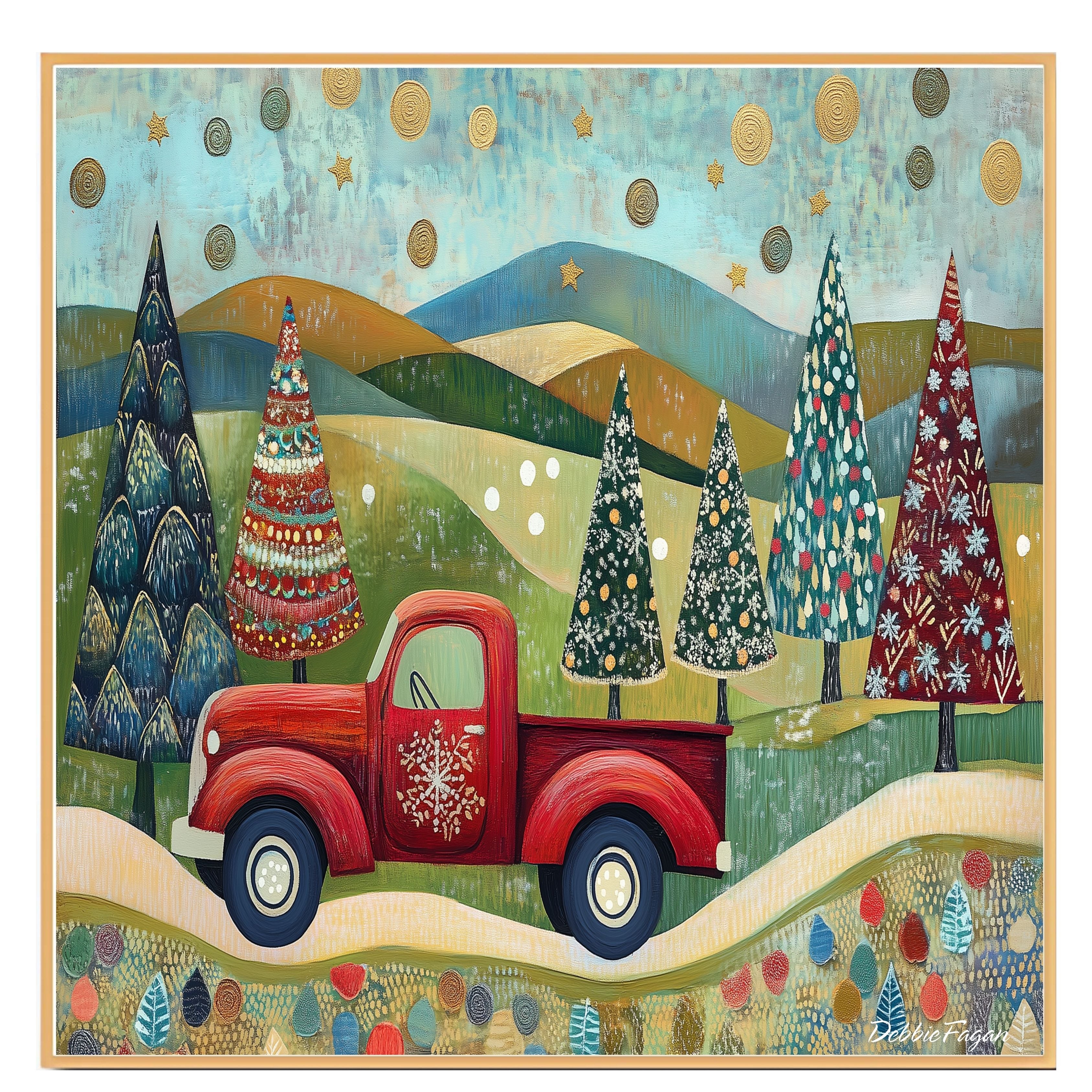 Whimsical folk art of a red vintage truck hauling colorful Christmas trees through scenic rolling hills, beneath...