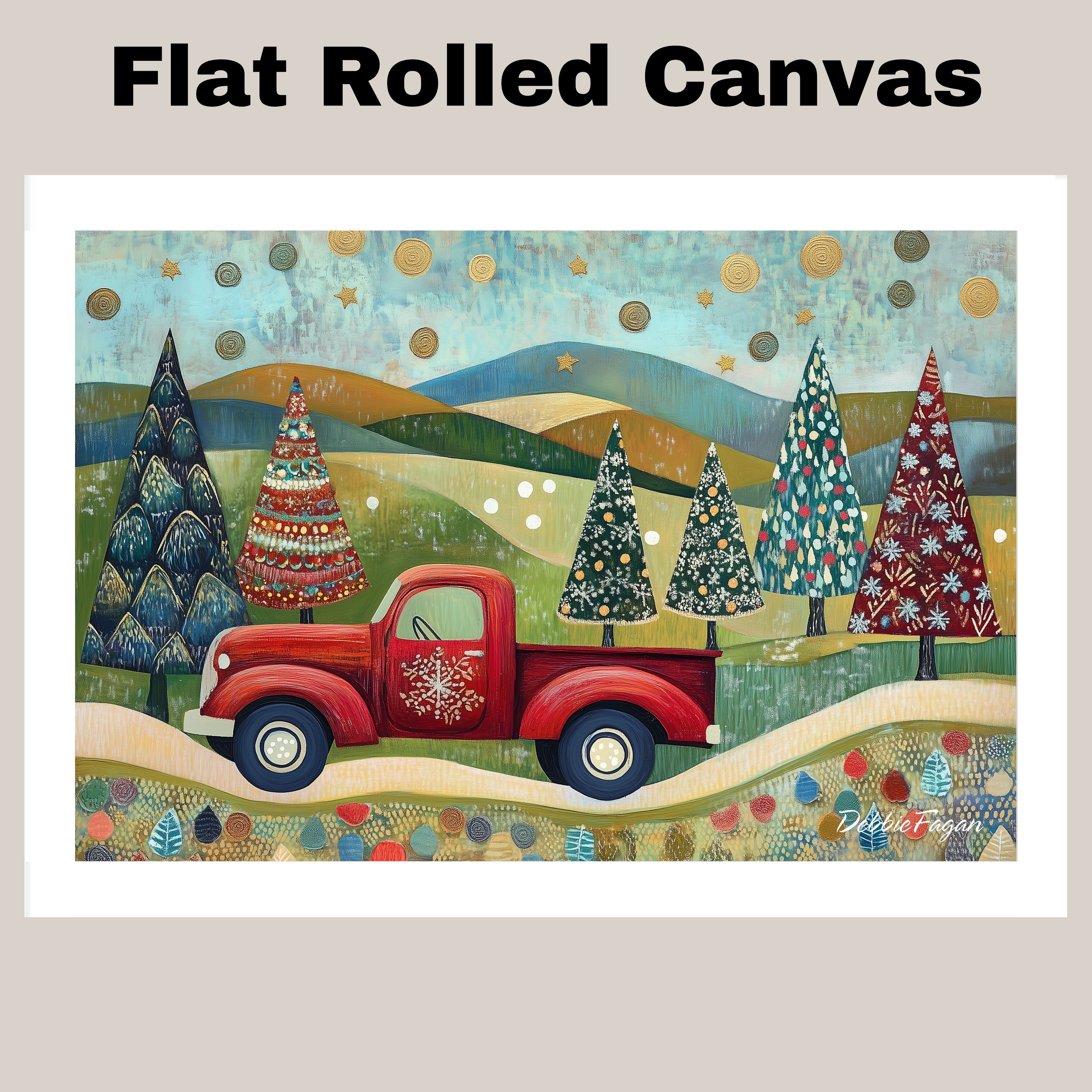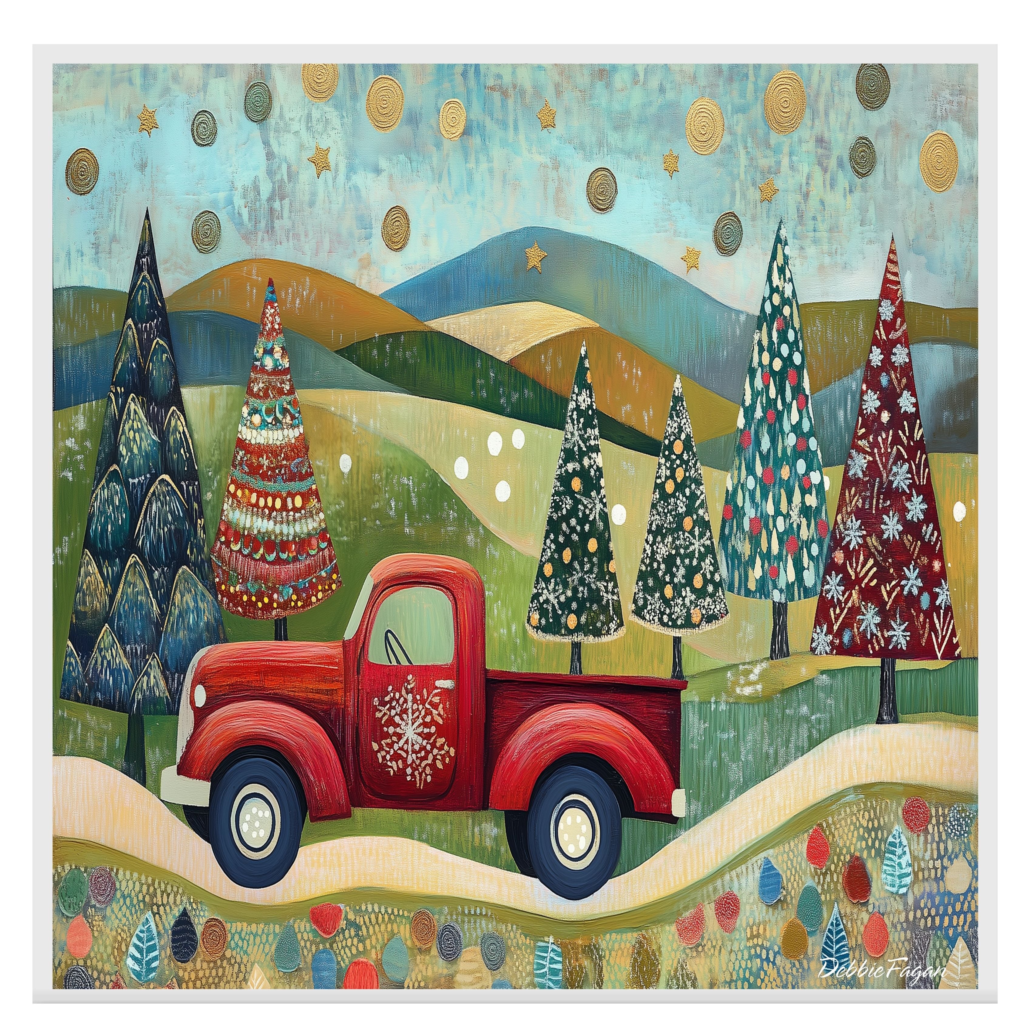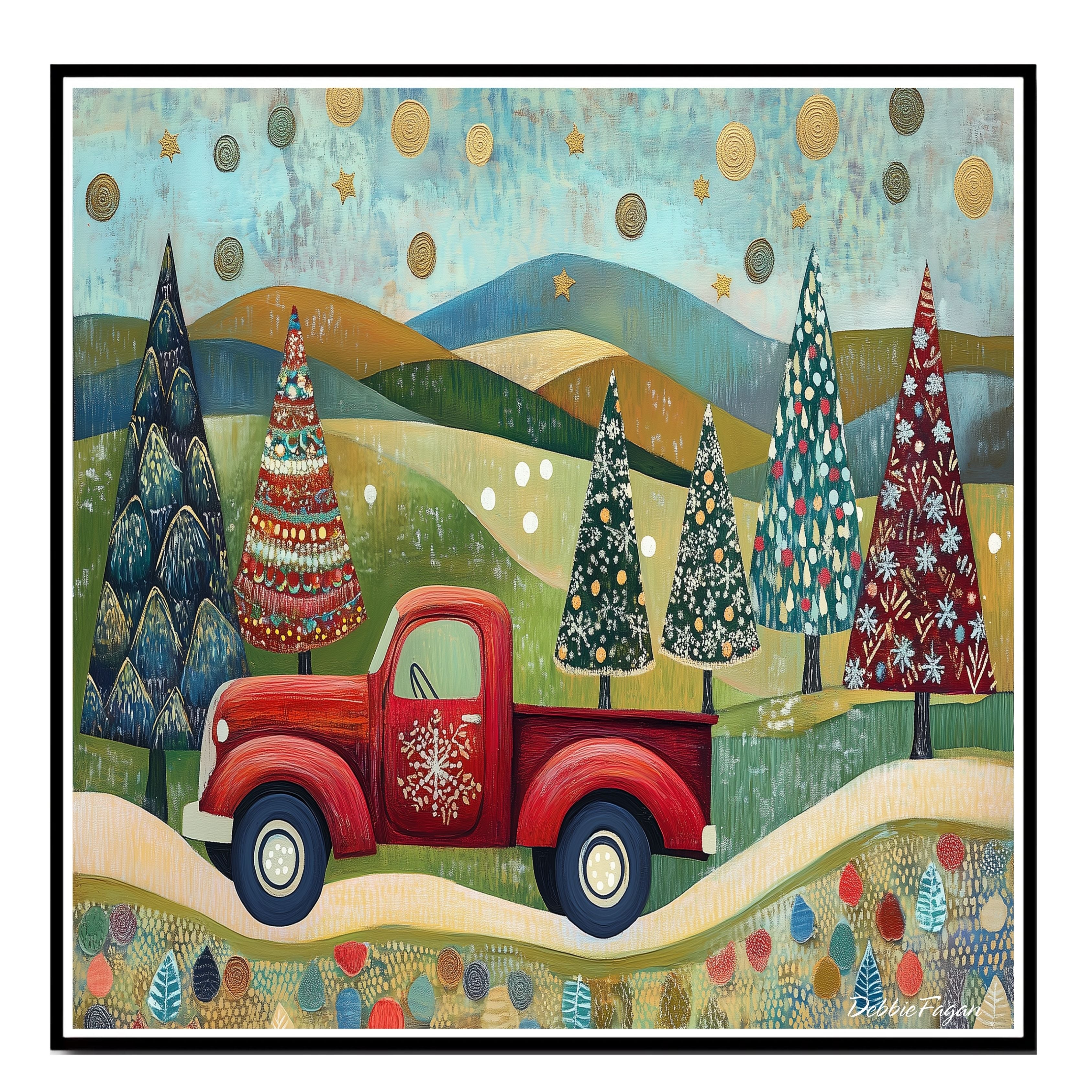 Whimsical folk art of a red vintage truck hauling colorful Christmas trees through scenic rolling hills, beneath...