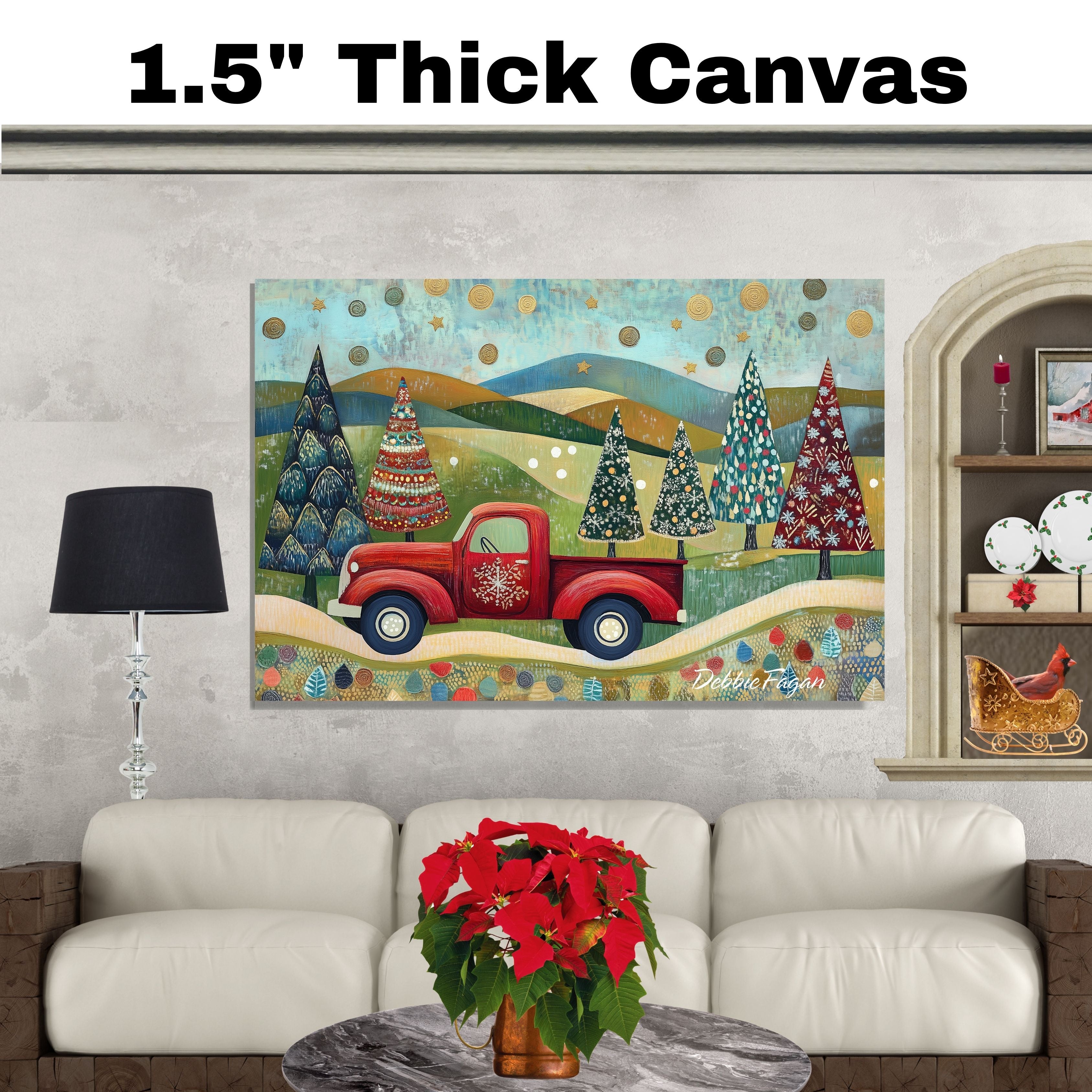 Festive Red Truck Carrying Decorated Christmas Trees Across Rolling Hills Under a Starry Winter Sky on Ready to Hang 1.5" Thick Canvas Wrap, Floating Framed Canvas, Flat Rolled Canvas