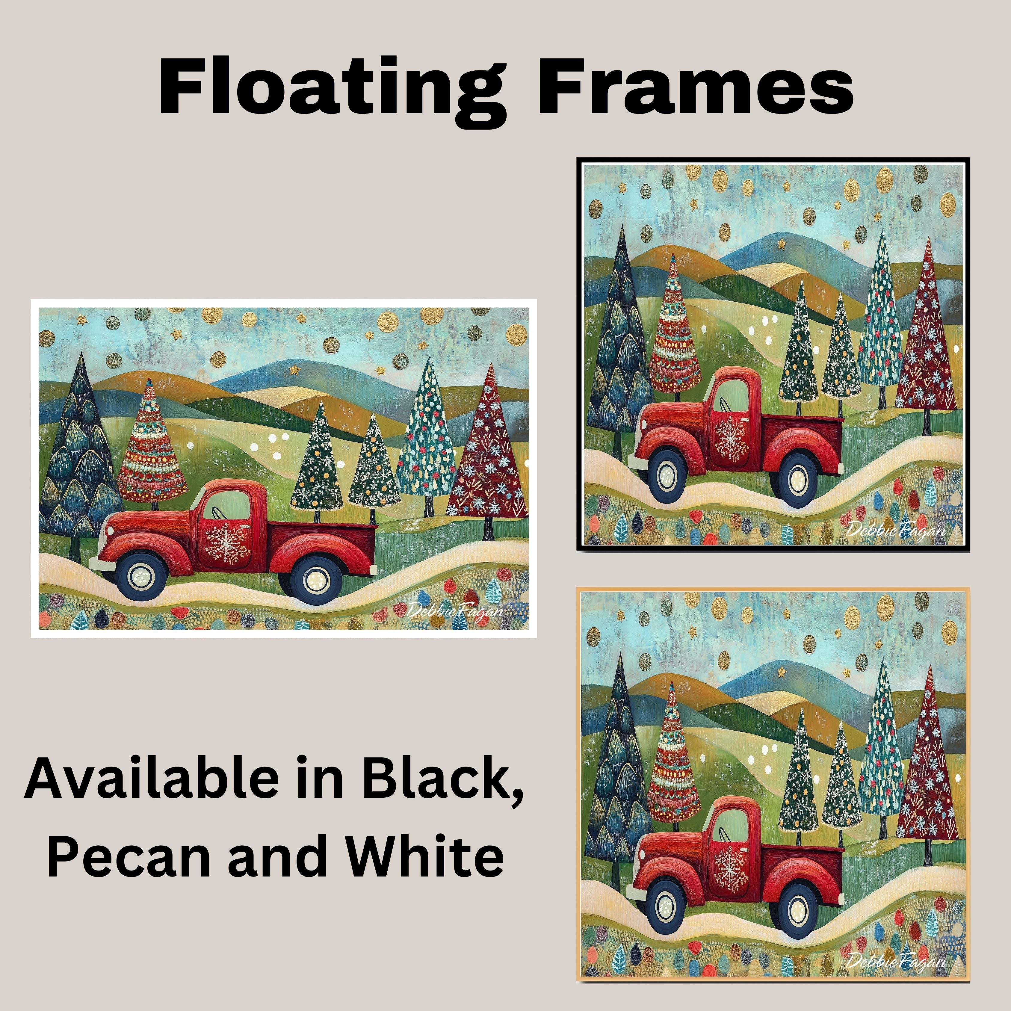 1.5" Thick Floating Framed Canvas: Available in Black, Pecan, and White Grain. Durable shrink-resistant frame. Comes with easy-to-install hanging kits, ready for immediate display.