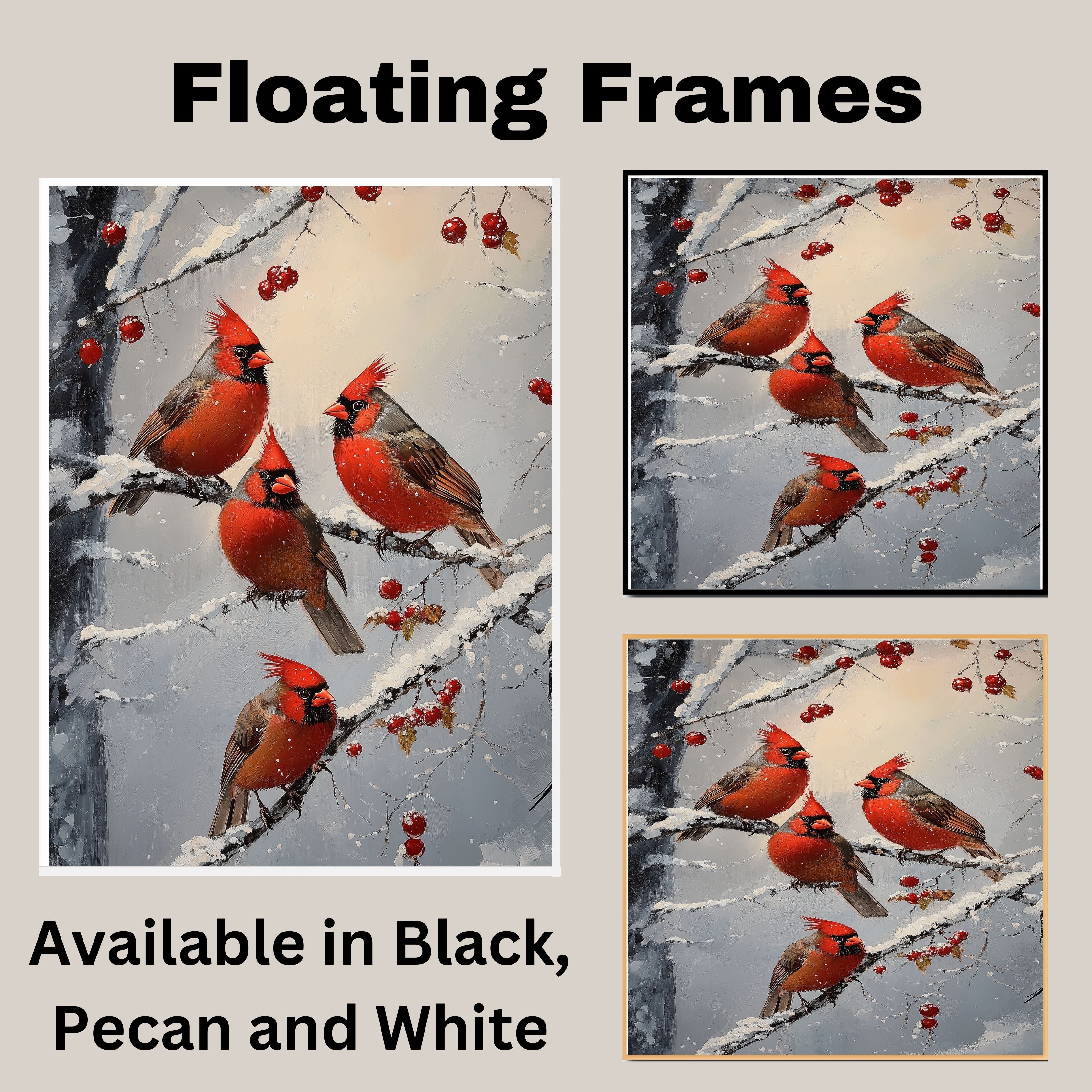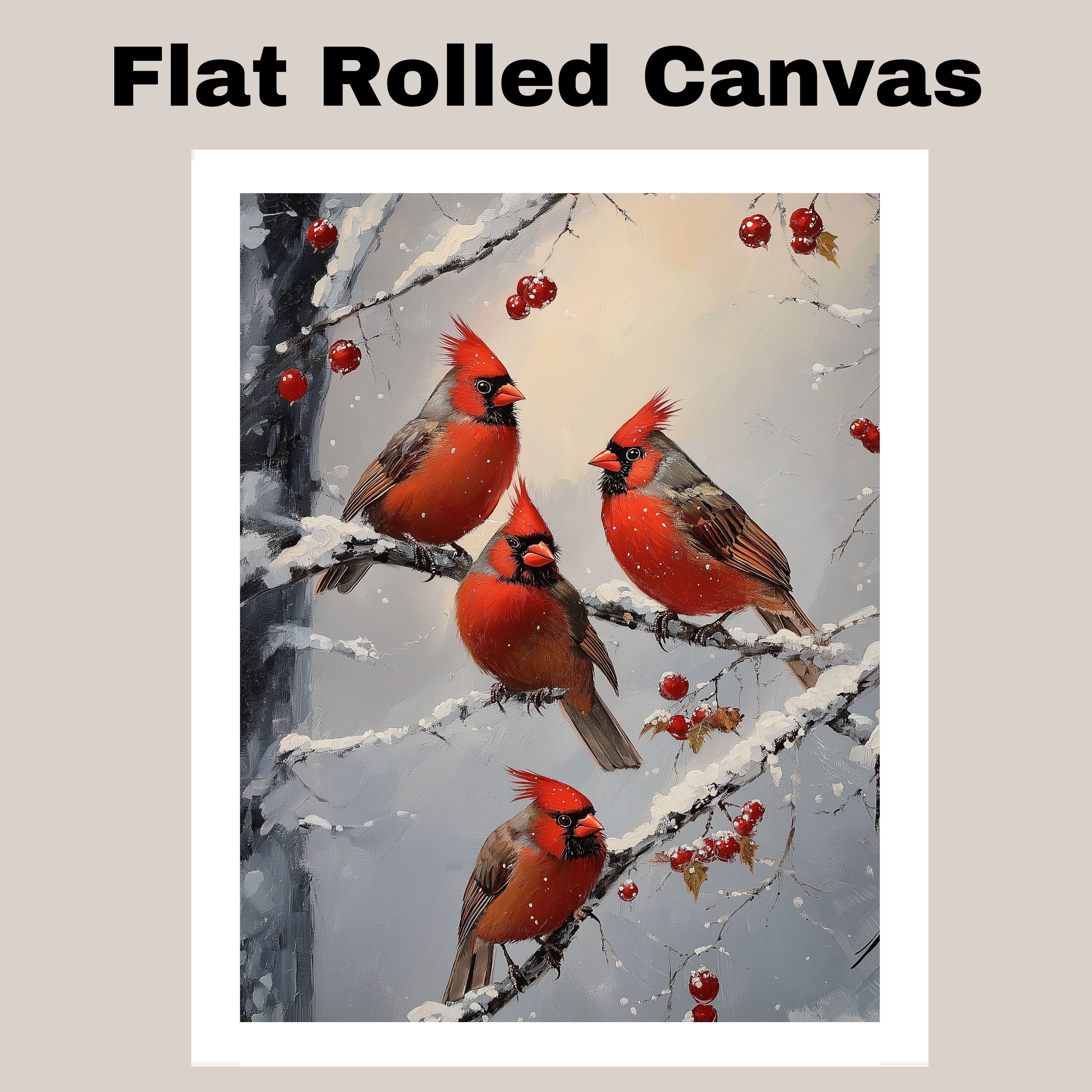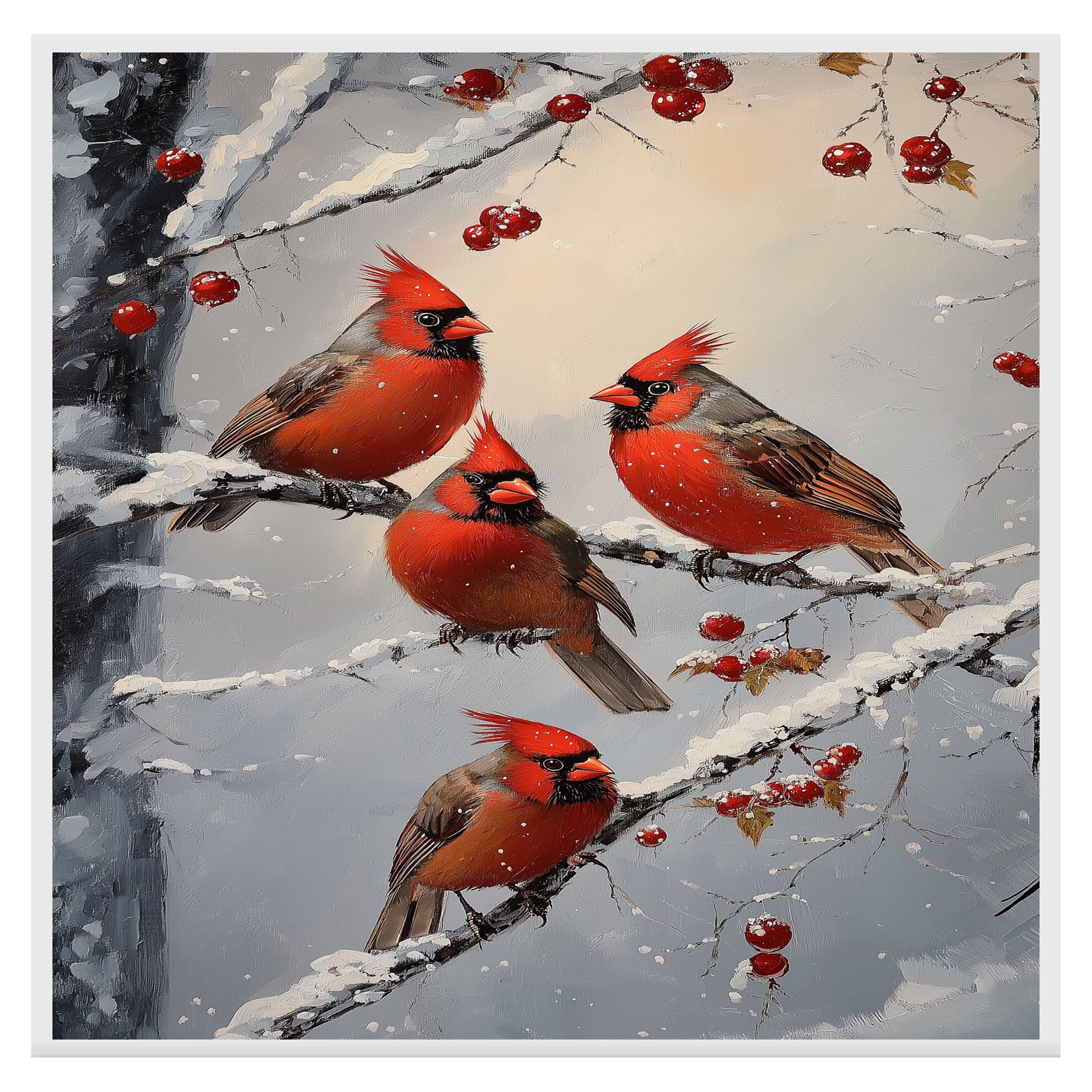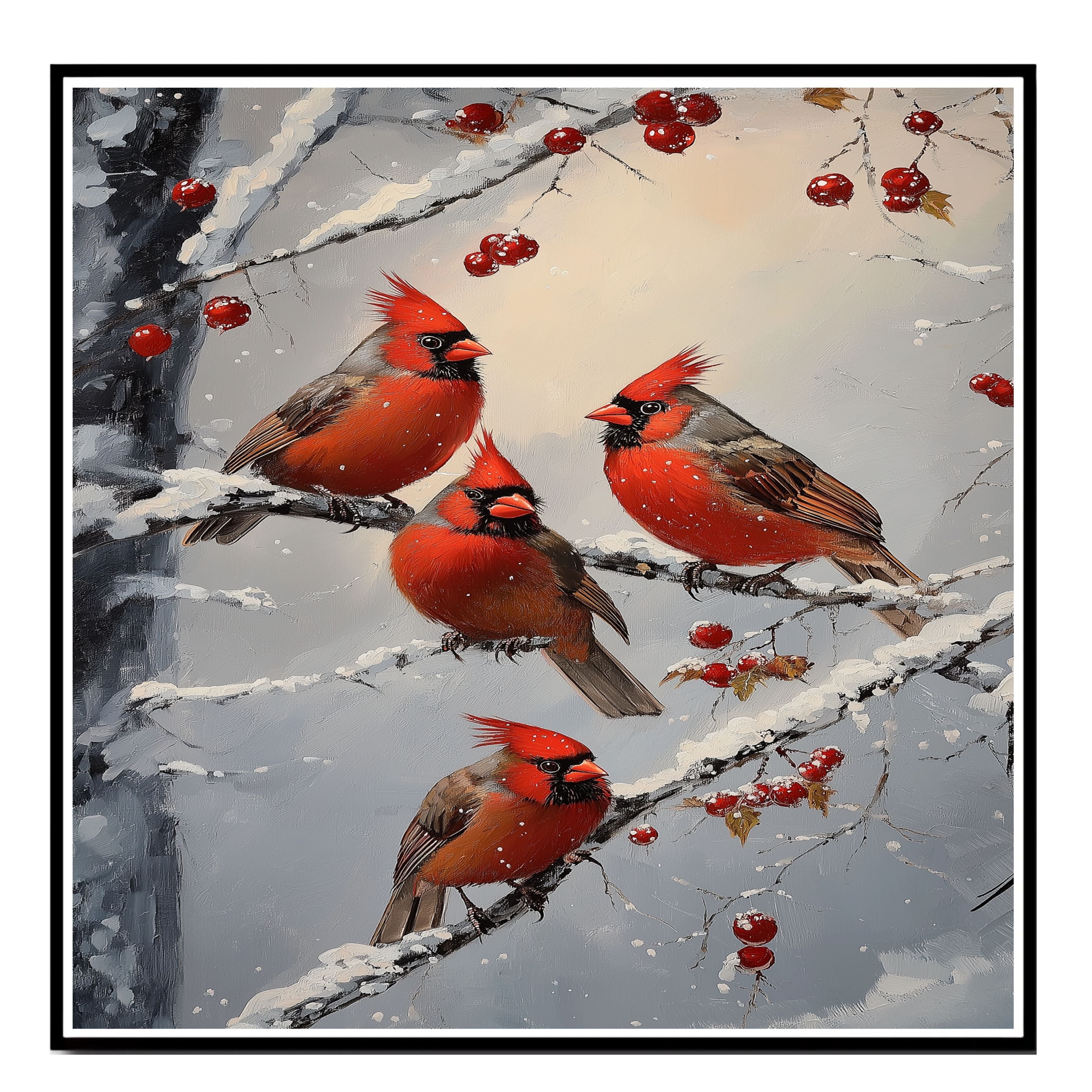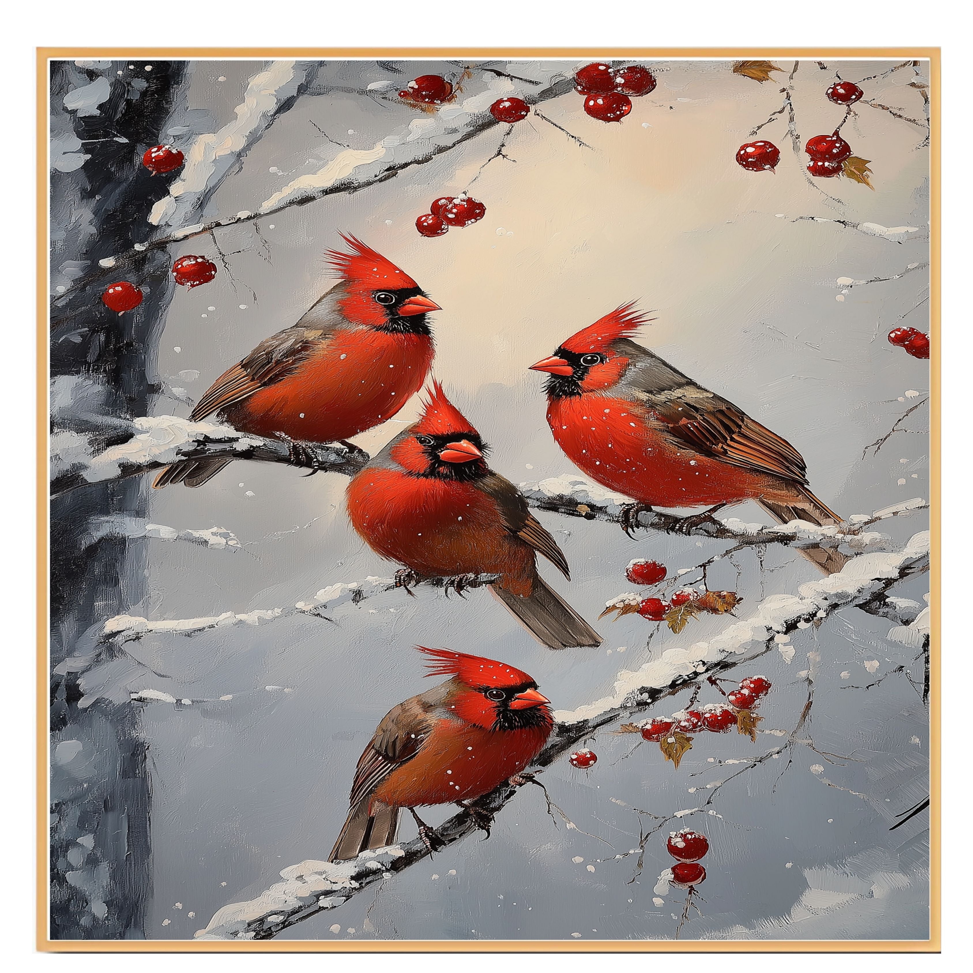 This heartwarming retro-style painting showcases four vibrant red cardinals perched on snow-covered branches, surrounded by clusters of winter berries. With its rich colors and nostalgic holiday charm, this artwork brings warmth and elegance to any Christmas display. A perfect seasonal accent for nature enthusiasts or a thoughtful winter gift.