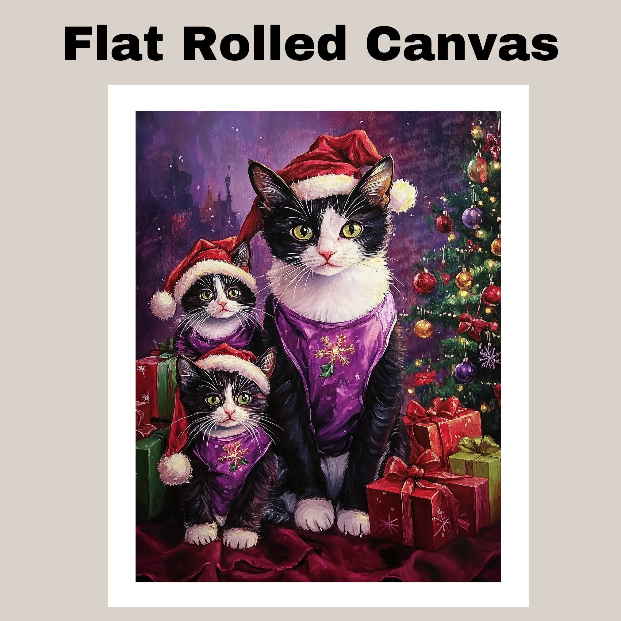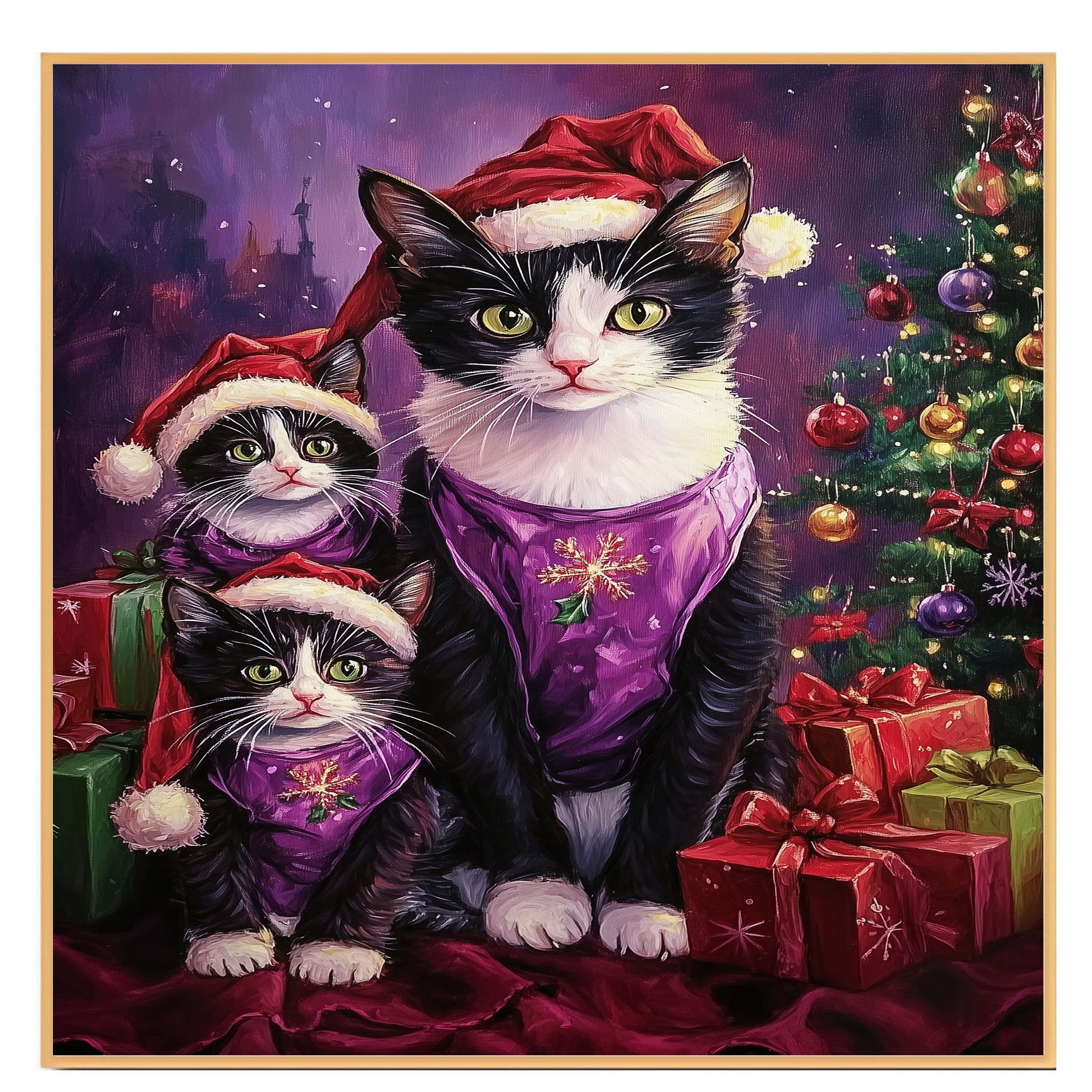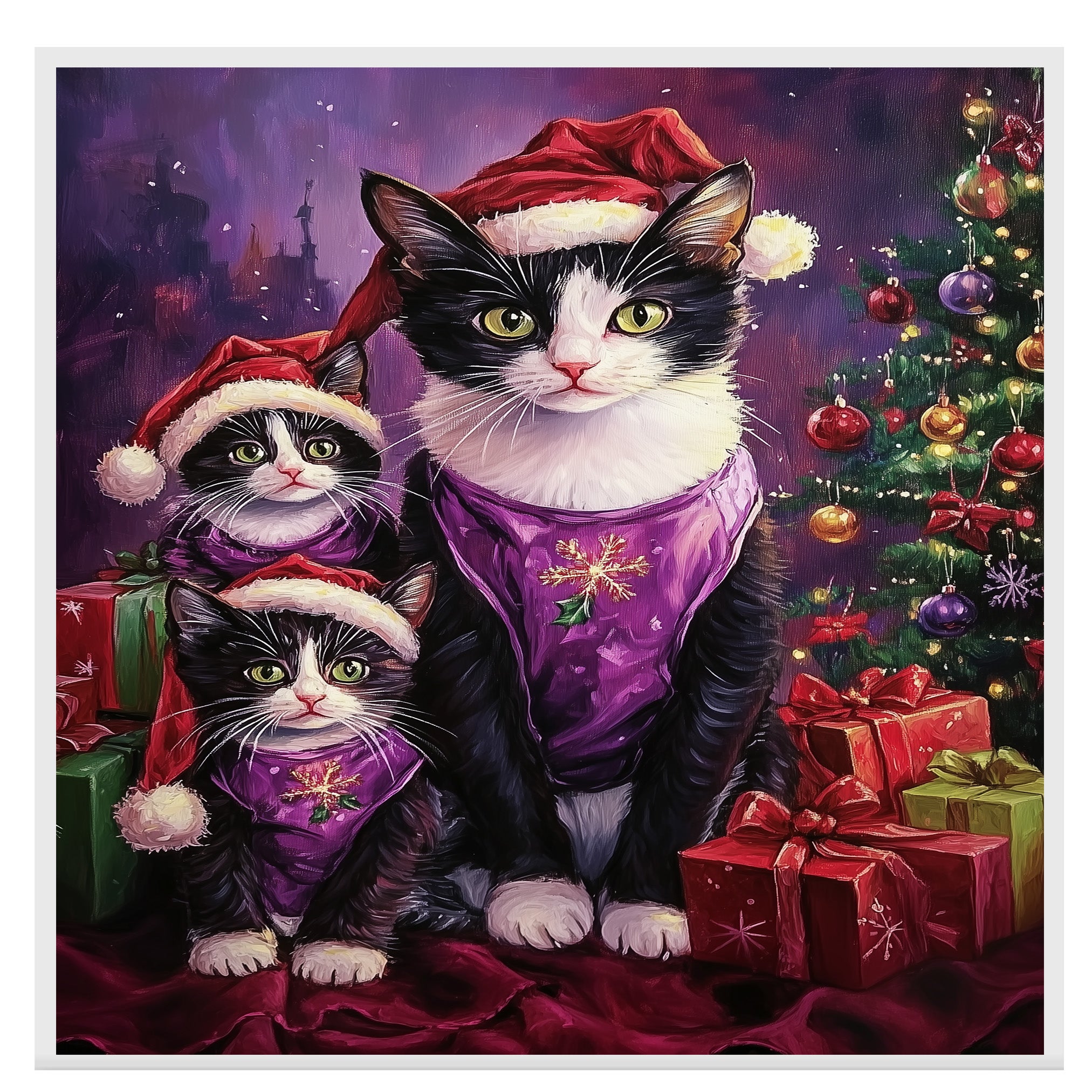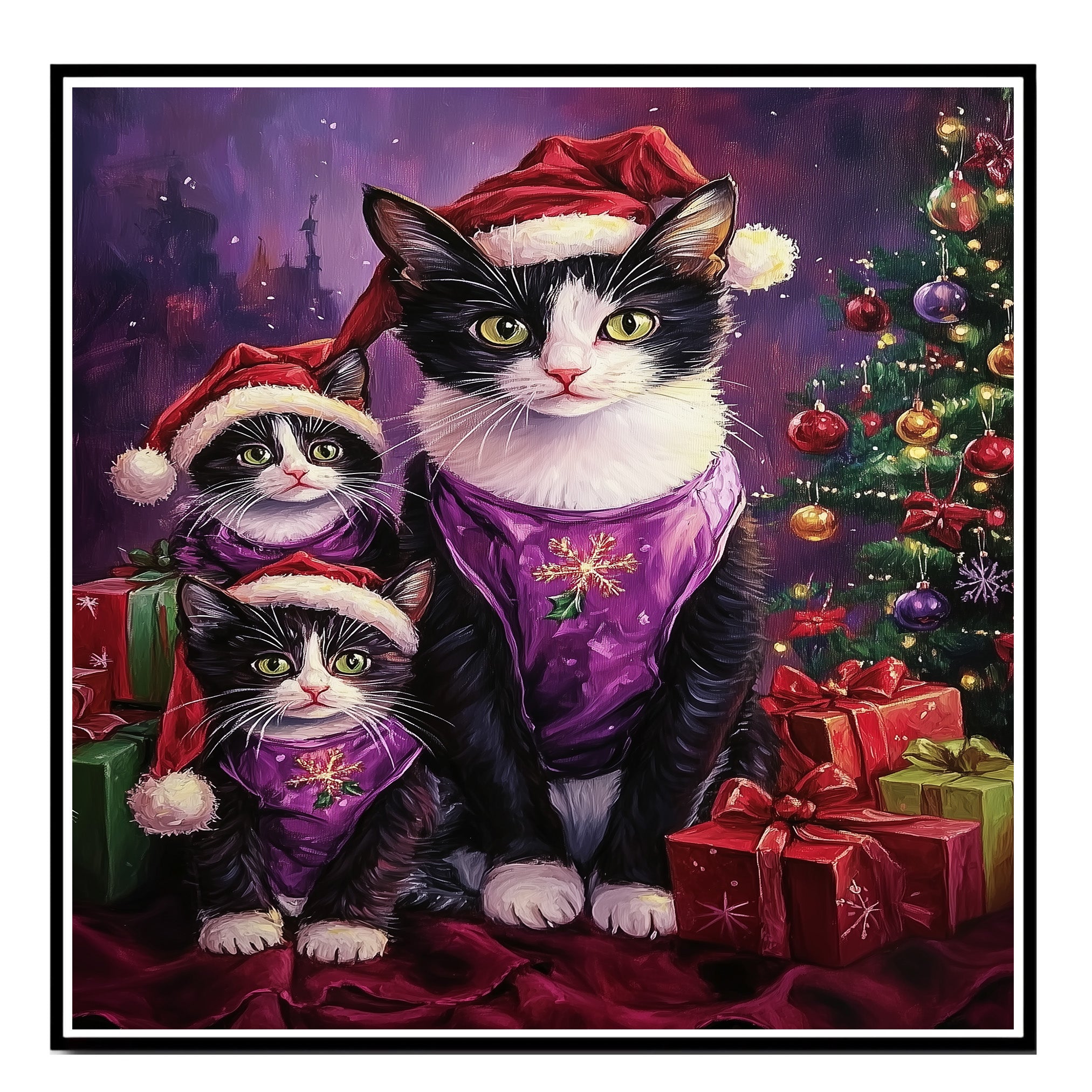 Celebrate the holiday spirit with this whimsical artwork of a tuxedo cat family dressed in purple outfits and Santa hats, surrounded by colorful gifts and a sparkling Christmas tree. A perfect festive touch for cat lovers and seasonal collections.