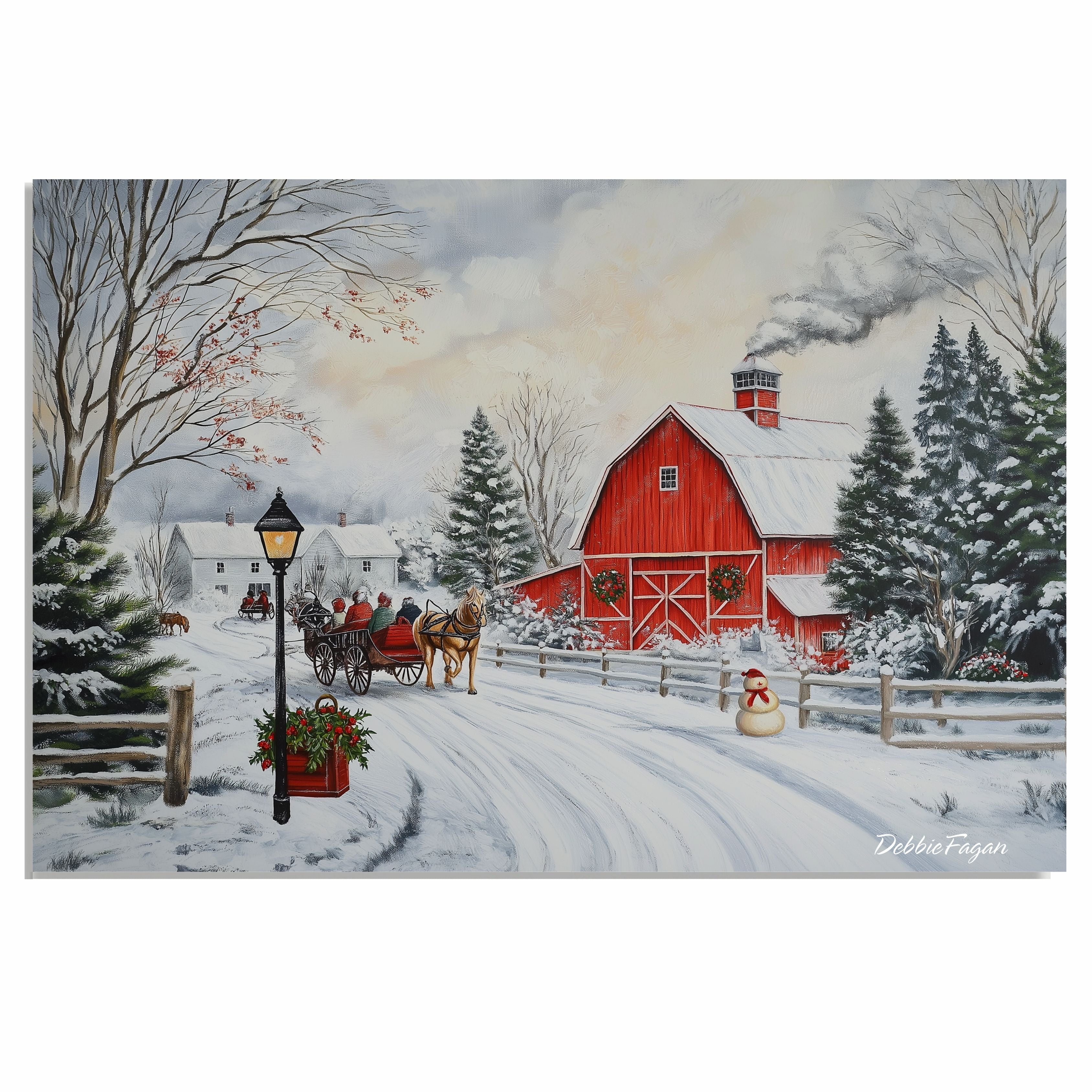 This heartwarming painting captures a snowy countryside with a bright red barn decorated for the holidays, a horse-drawn sleigh, glowing lamplight, and a joyful snowman. Perfectly festive and full of seasonal charm.