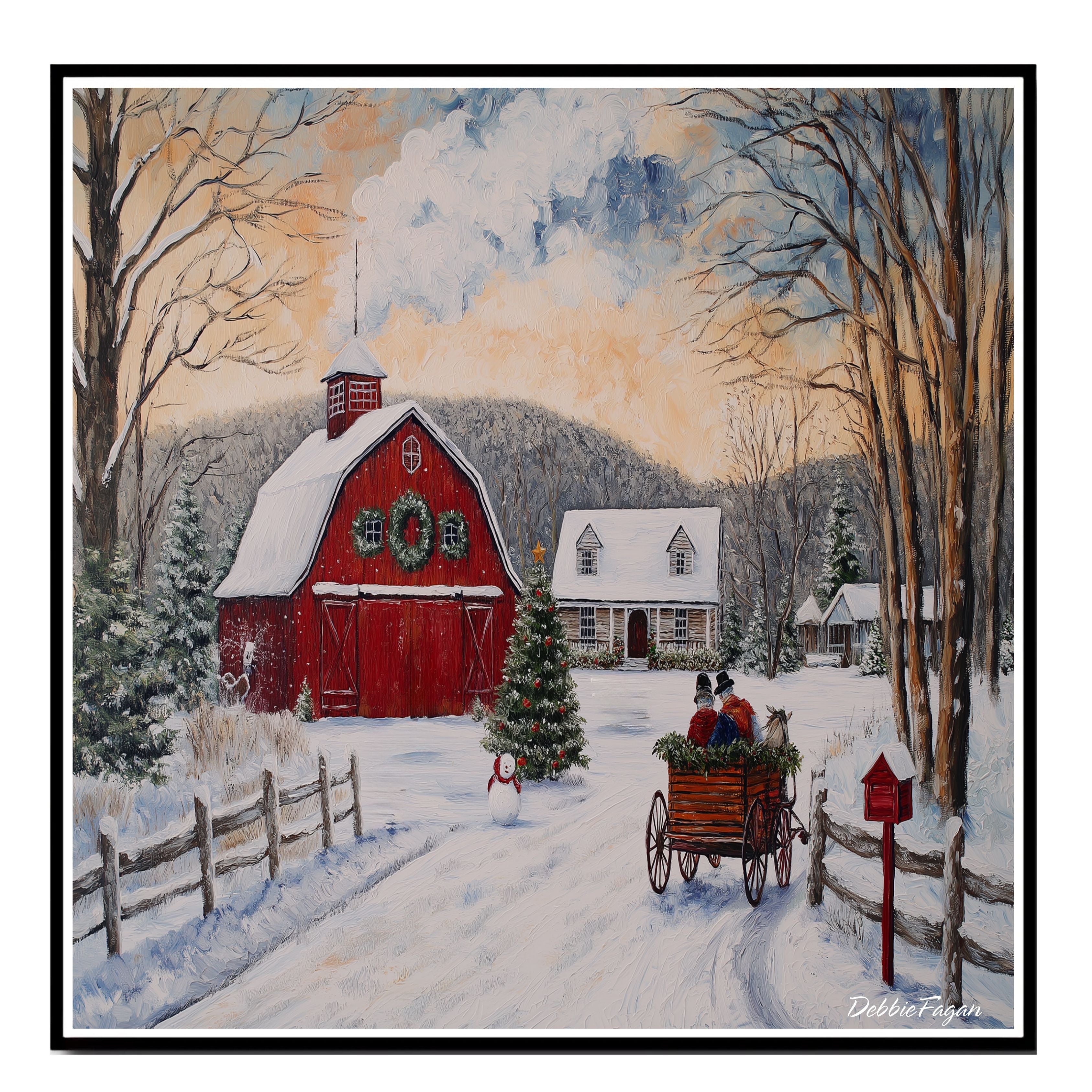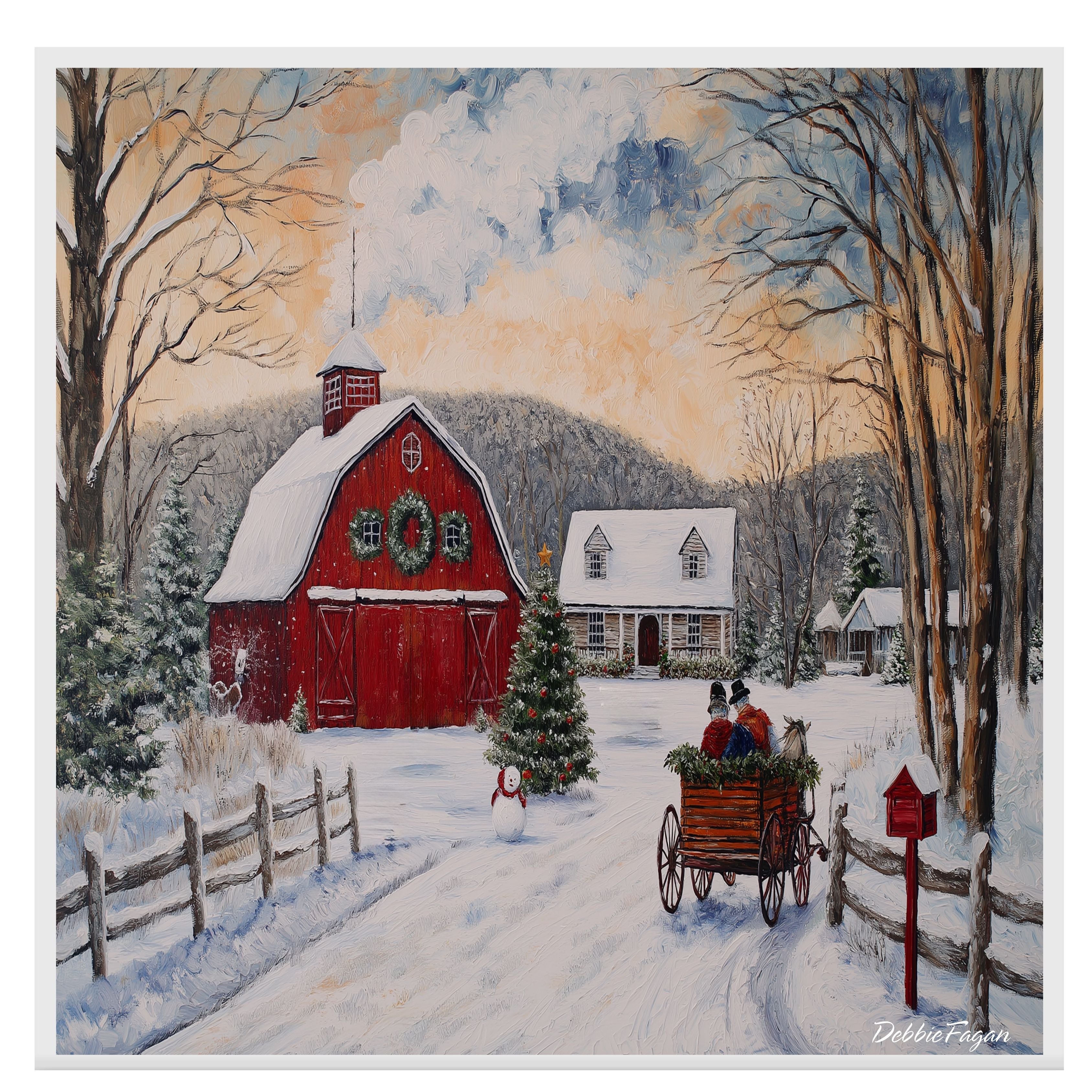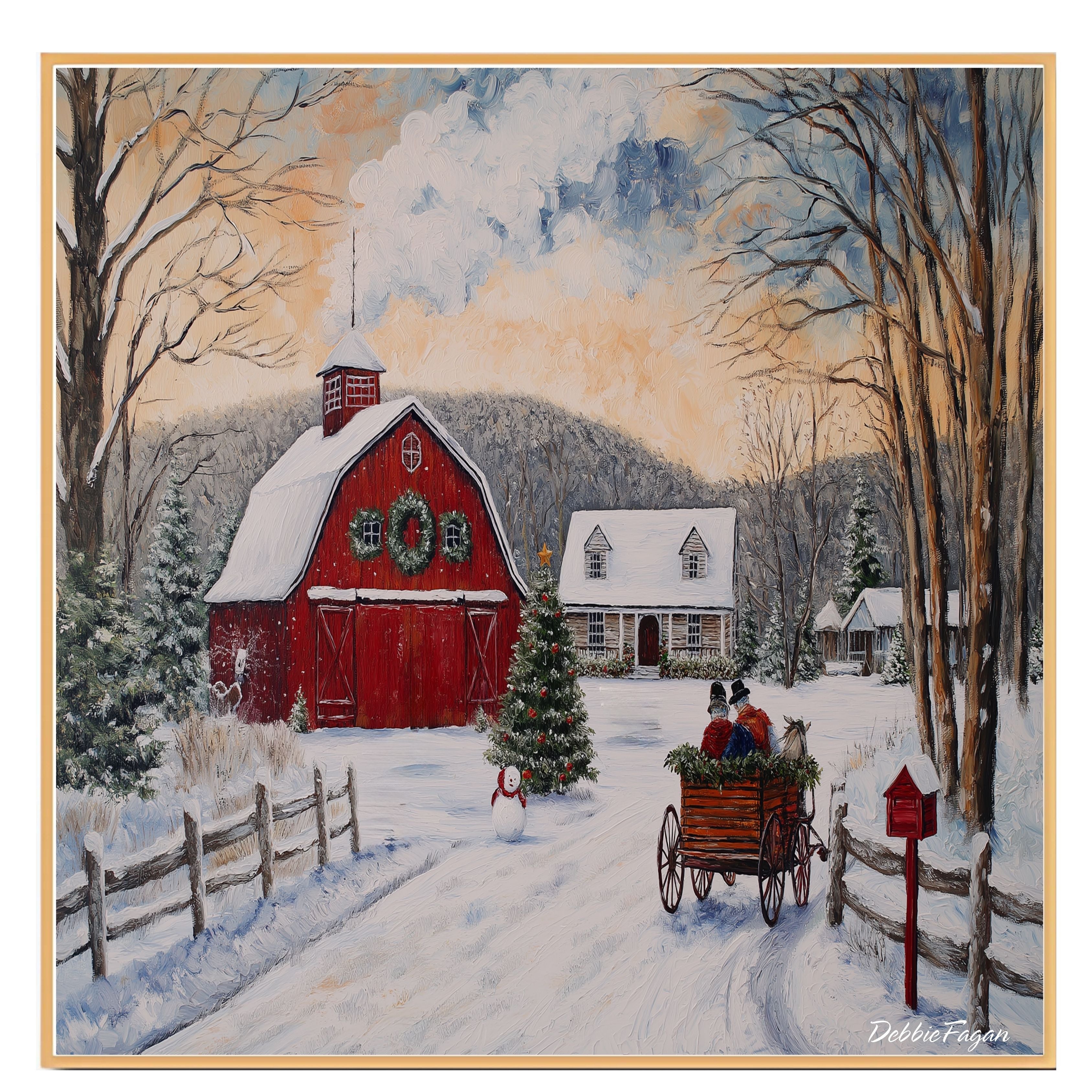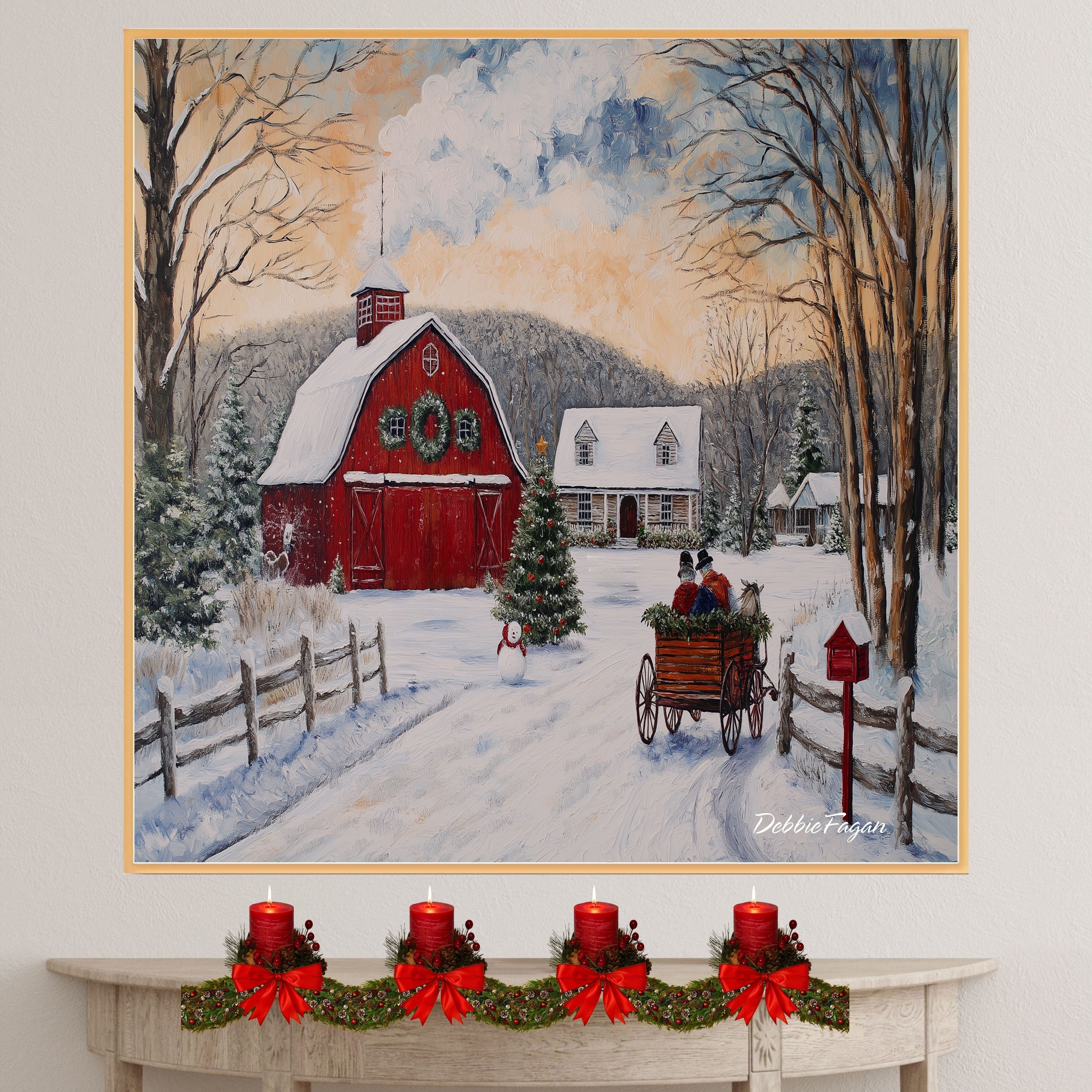 This detailed winter painting captures a red barn adorned with wreaths, a snow-covered cabin, and a horse-drawn...