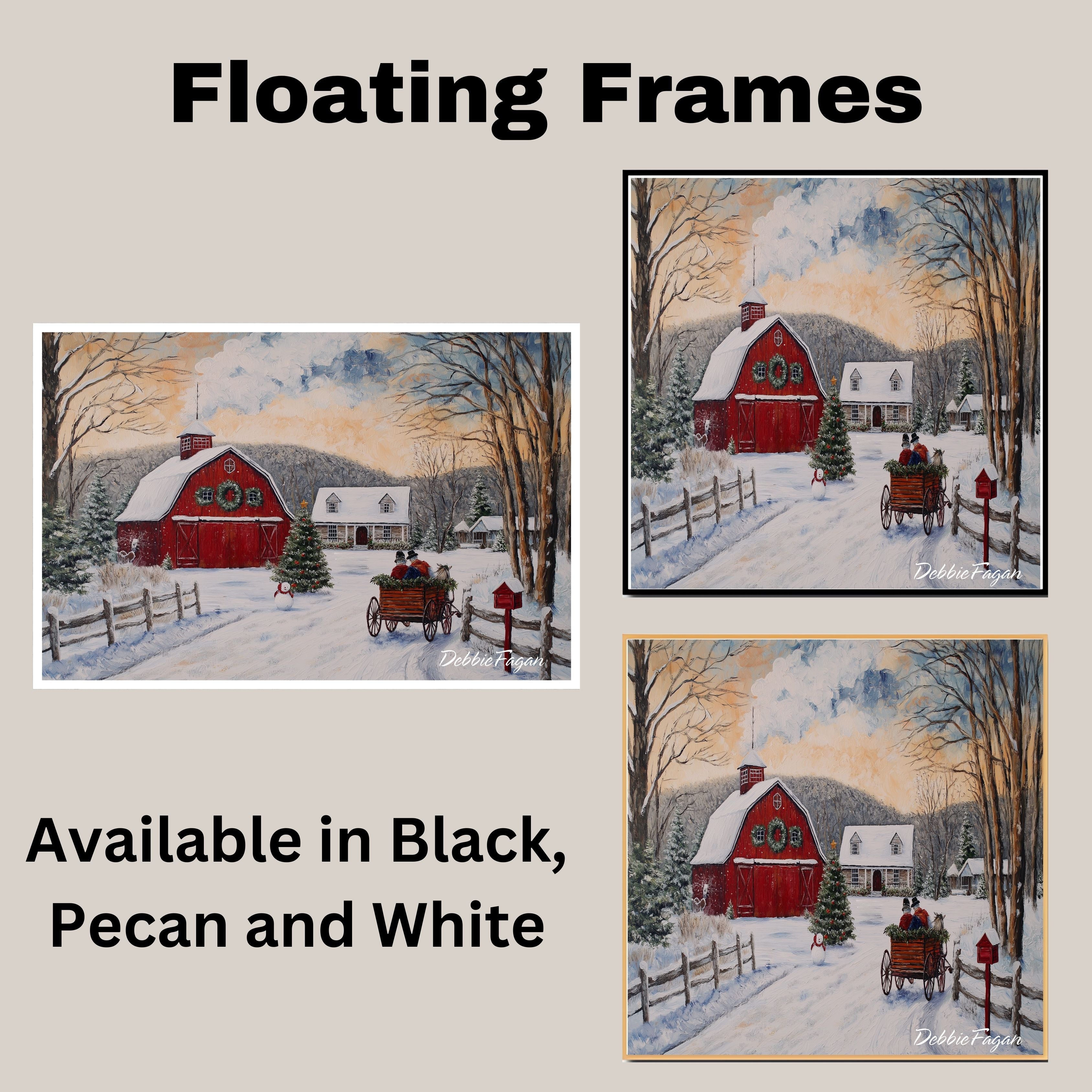 1.5" Thick Floating Framed Canvas: Available in Black, Pecan, and White Grain. Durable shrink-resistant frame. Comes with easy-to-install hanging kits, ready for immediate display.