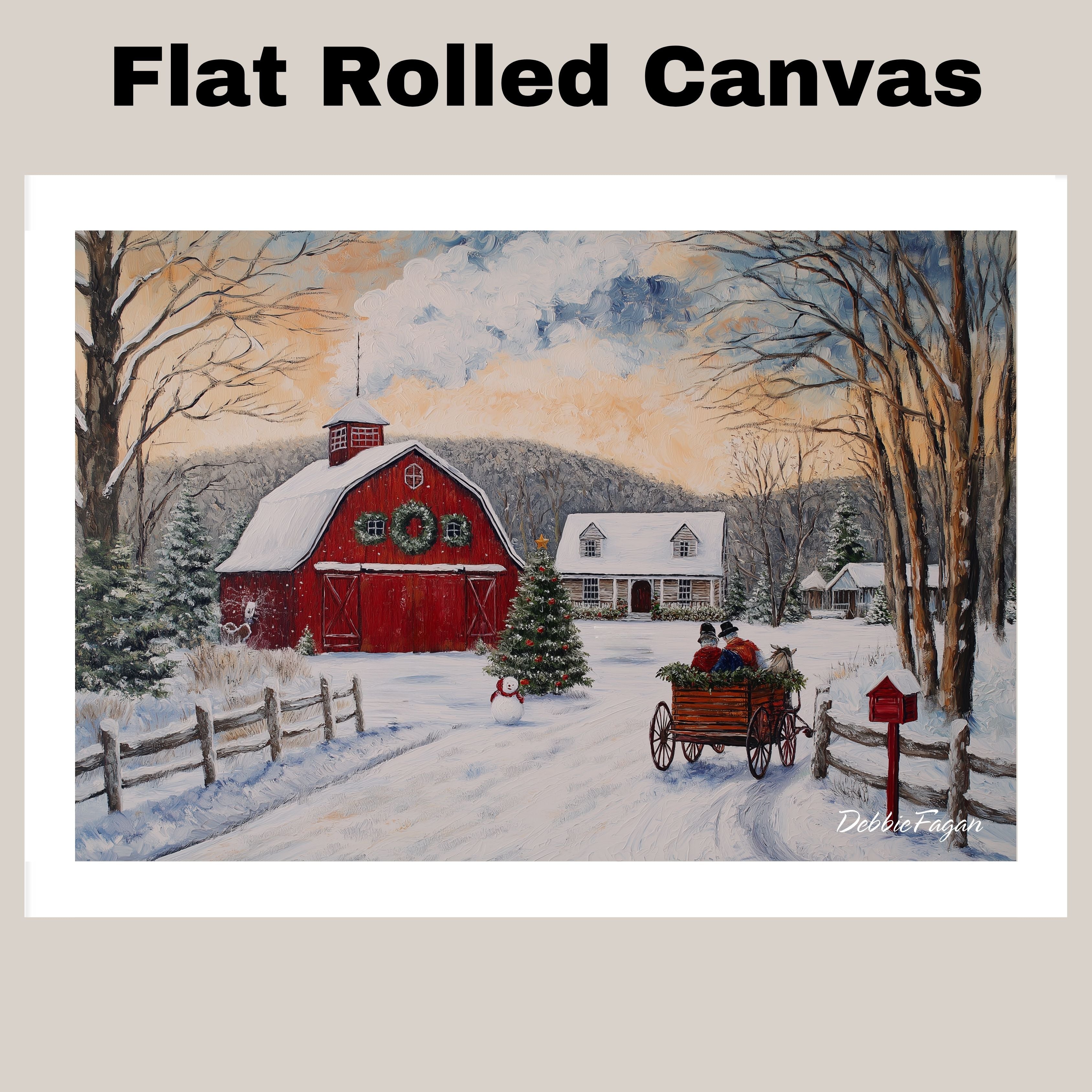 Festive Winter Scene with Red Barn, Snowy Cabin, Horse-Drawn Sleigh, Christmas Tree, and Cozy Countryside Charm on Ready to Hang 1.5" Thick Canvas Wrap, Floating Framed Canvas, Flat Rolled Canvas