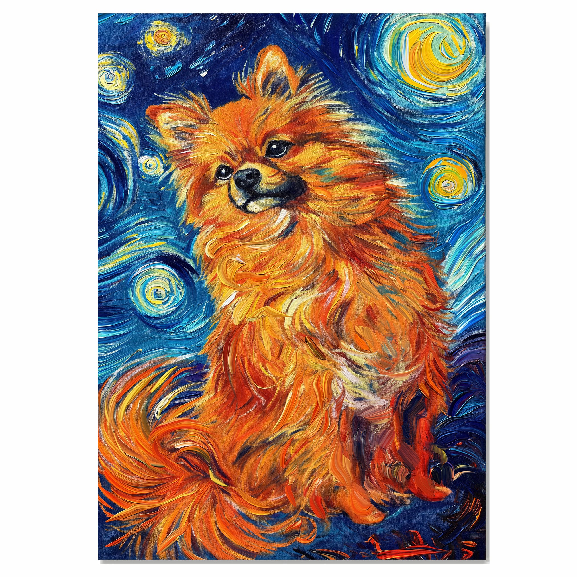 This vivid and energetic portrait captures the spirited charm of a fluffy orange Pomeranian reimagined in Van Gogh’s Starry Night style. With fiery brushstrokes and a swirling star-filled sky, this artwork celebrates the personality and beauty of the breed in a whimsical, impressionist style. Ideal for Pomeranian lovers and art collectors who enjoy bold color and expressive texture.