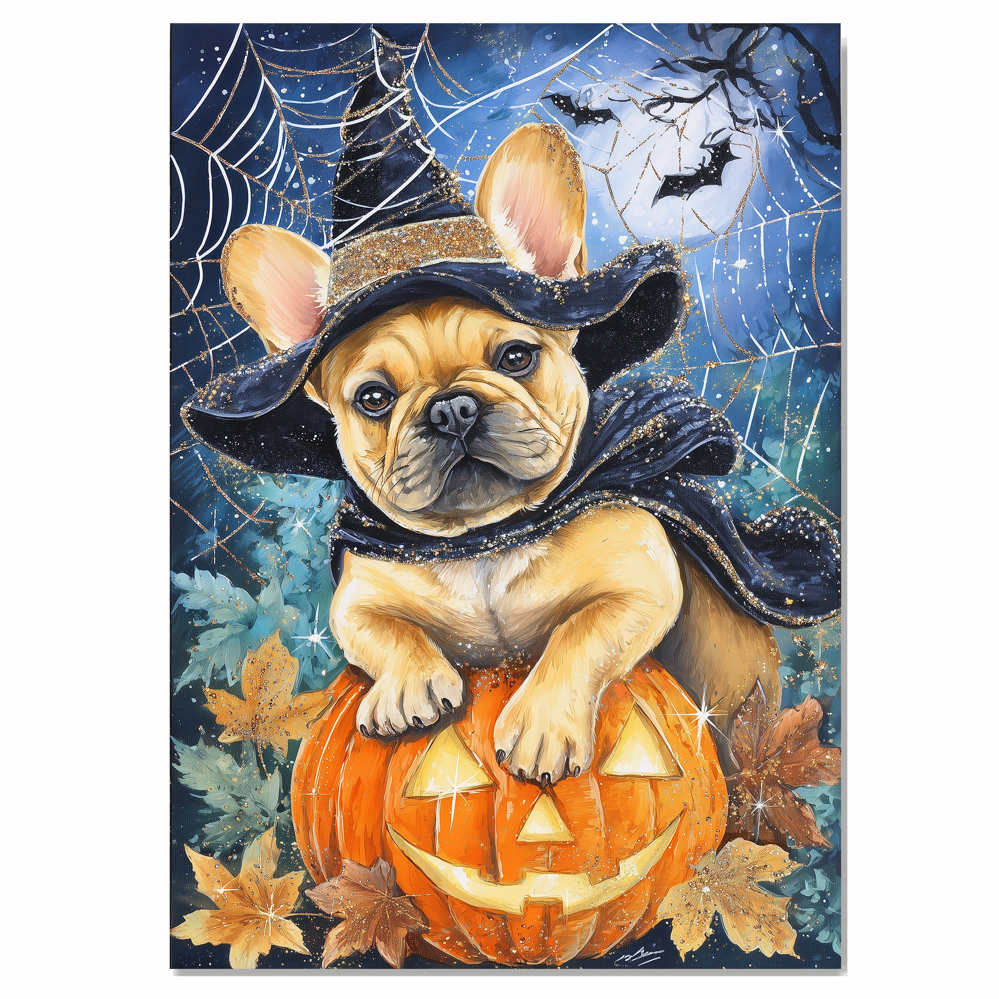 Add Halloween charm to your décor with this delightful French Bulldog puppy wall art. The tan Frenchie sits proudly on a glowing jack o lantern, dressed in a sparkling witch hat and cape under a full moon with bats and spiderwebs. A whimsical seasonal decoration for dog lovers and a thoughtful holiday gift.