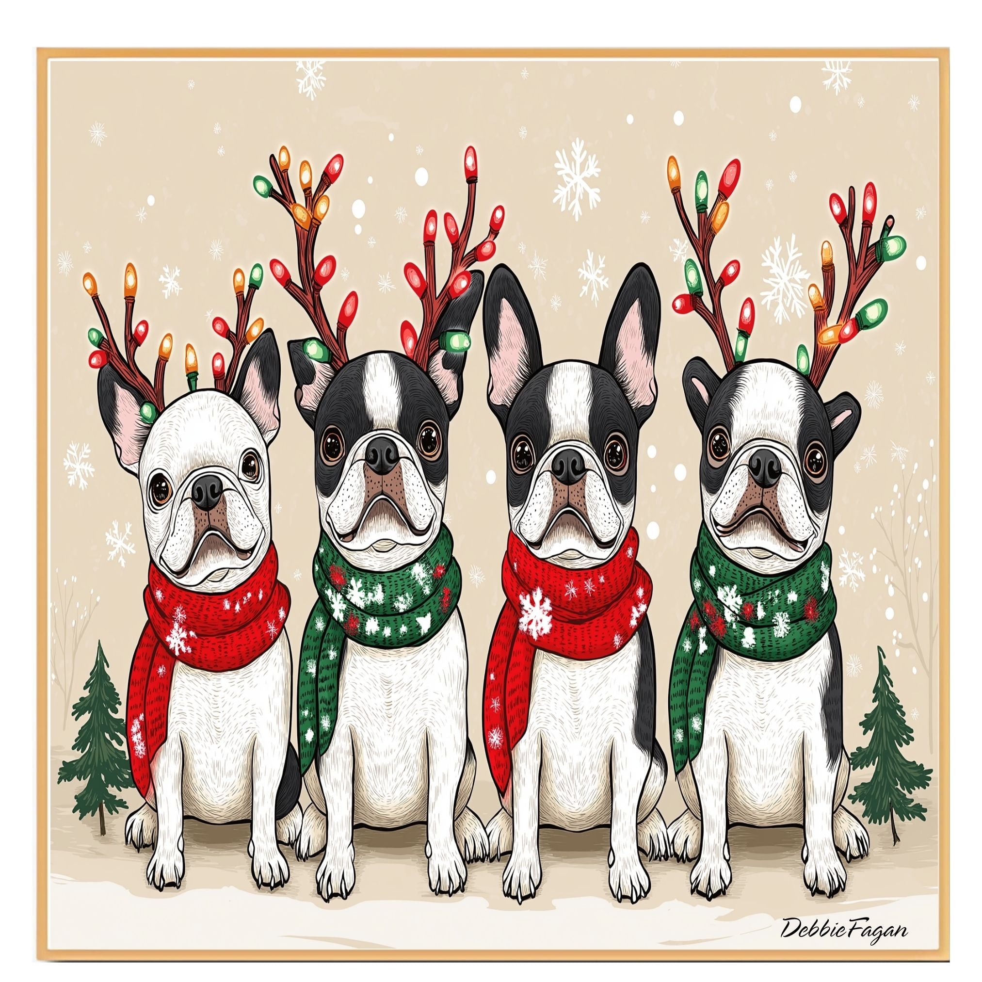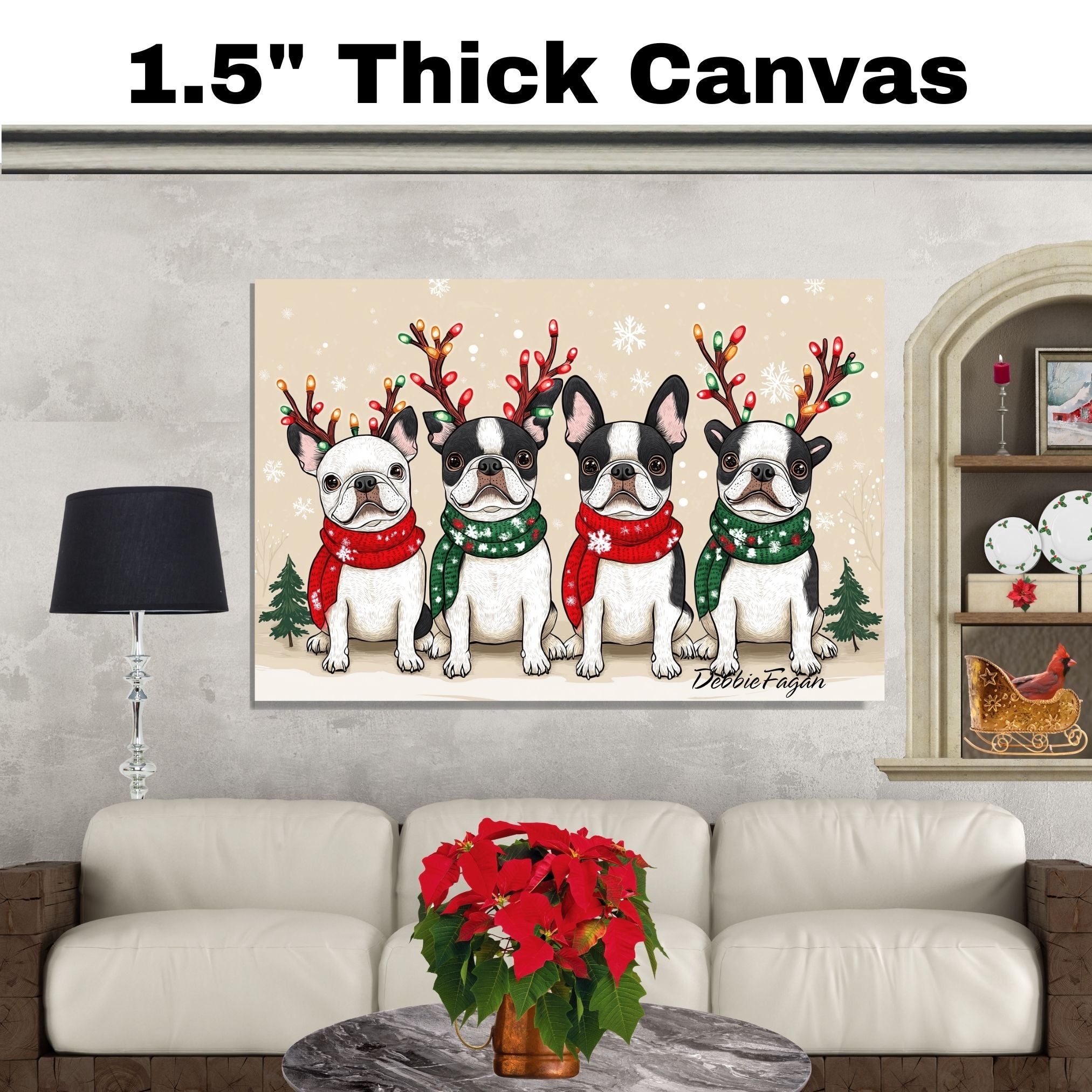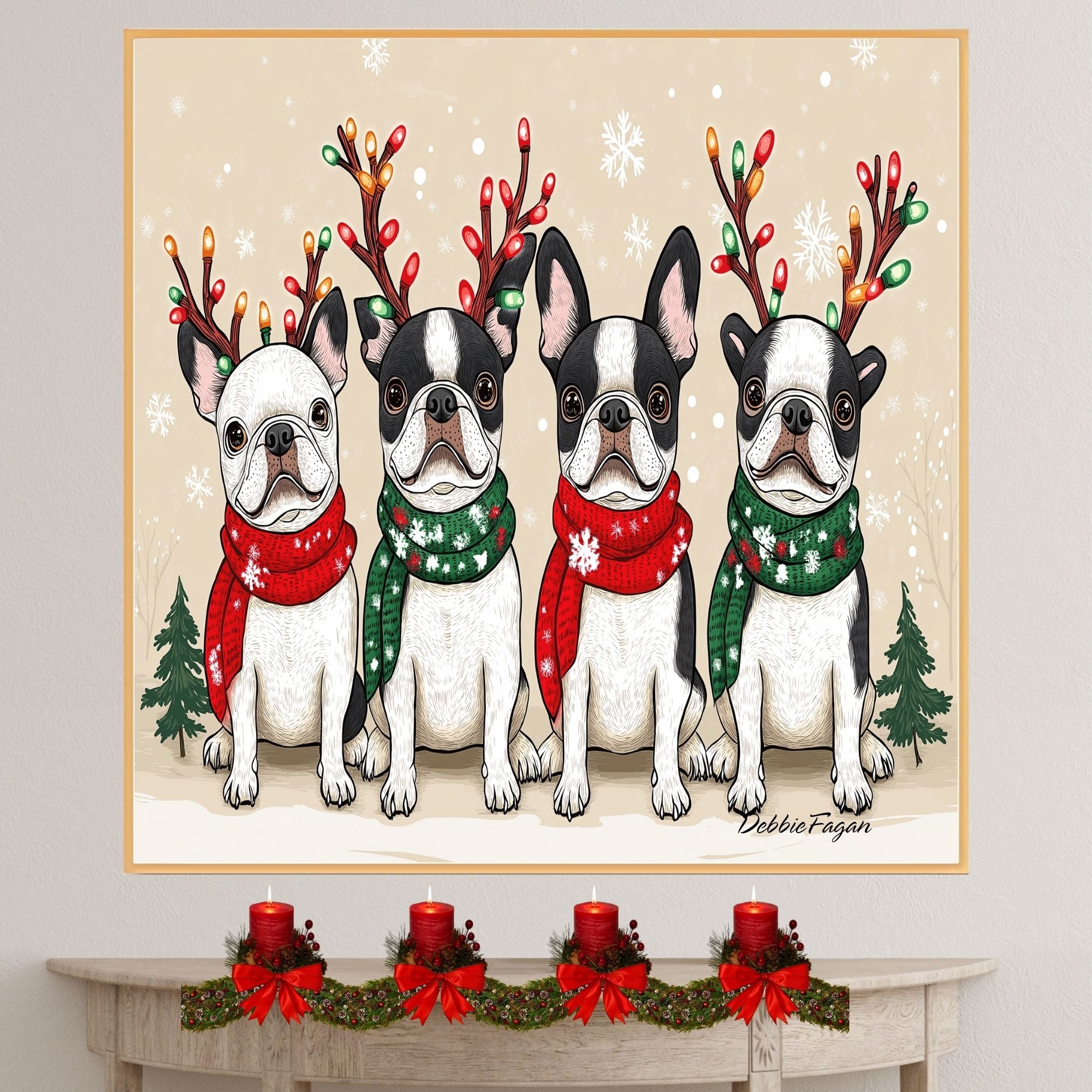 Our Frenchie Frost Canvas adds a touch of festive charm and wintery warmth to your decor, showcasing a group of delightful French Bulldogs wearing vibrant holiday antlers amidst a peaceful snowy scene. This heartwarming artwork, titled Frenchie Frost, is available as a 1.5" thick canvas wrap, floating framed canvas, or flat rolled canvas, making it a versatile piece for any space. Capturing the joyful, playful spirit of the holiday season, this canvas is the perfect seasonal focal point, blending charm and elegance to bring a smile and cozy cheer to your holiday decor.