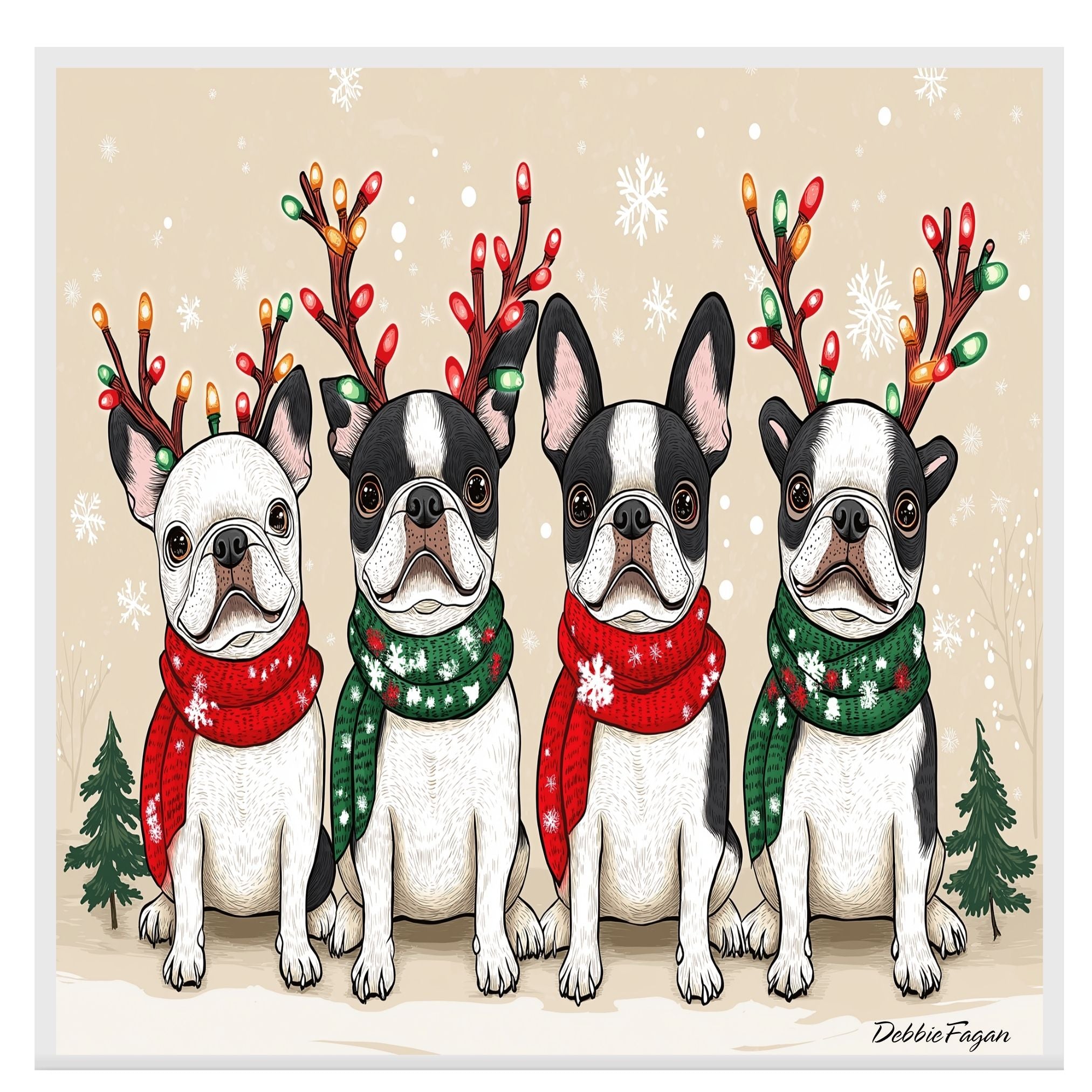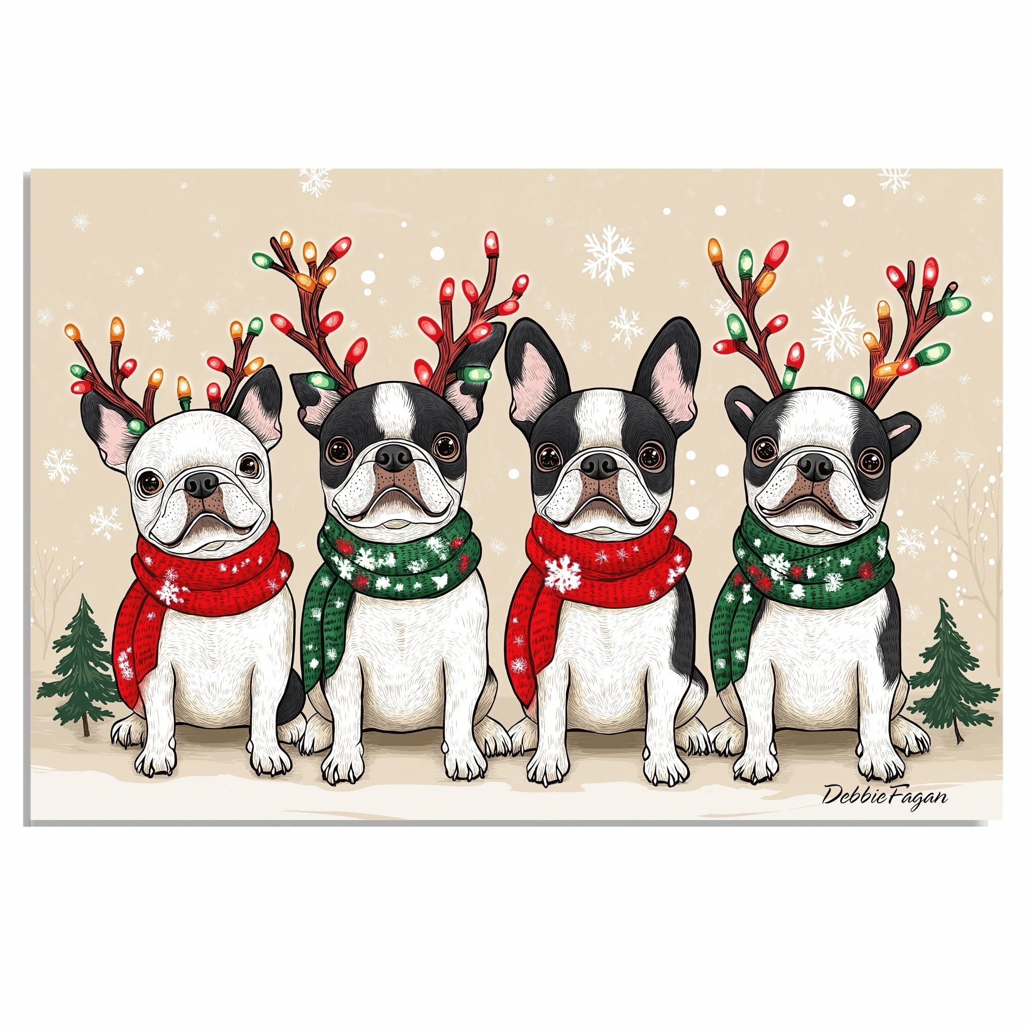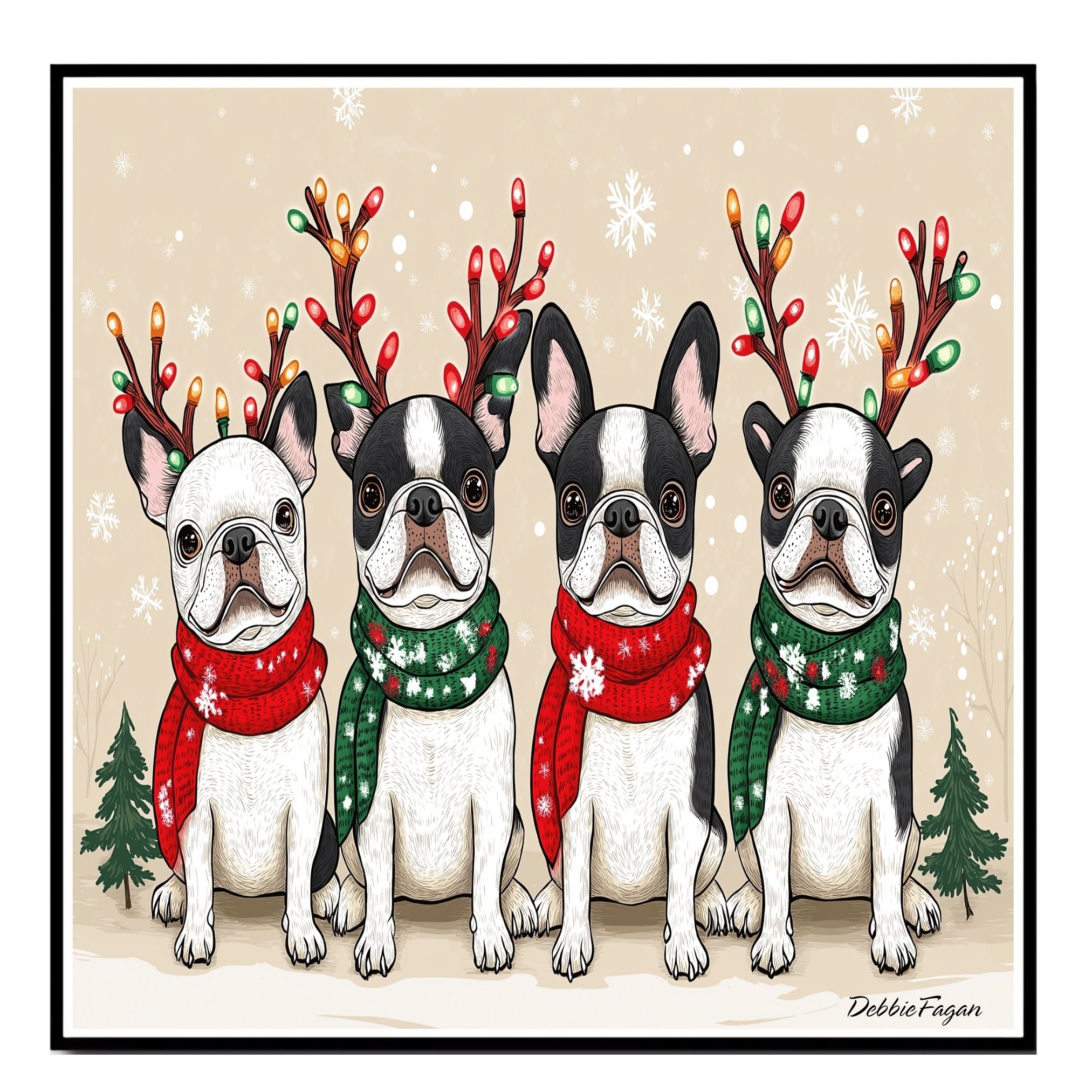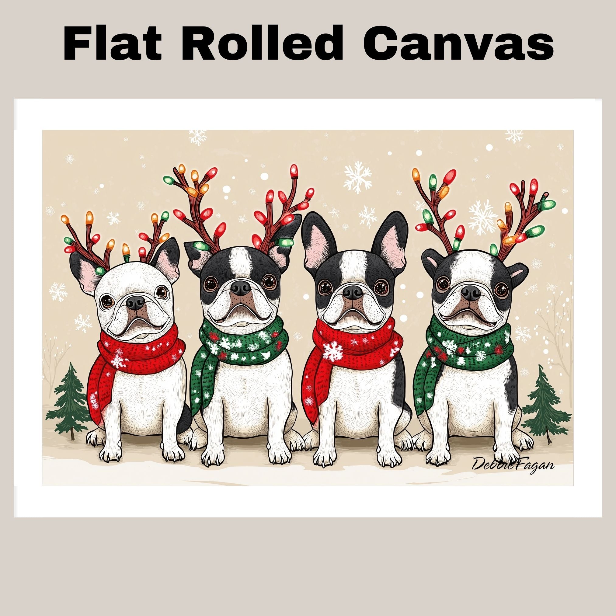 Our Frenchie Frost Canvas adds a touch of festive charm and wintery warmth to your decor, showcasing a group of delightful French Bulldogs wearing vibrant holiday antlers amidst a peaceful snowy scene. This heartwarming artwork, titled Frenchie Frost, is available as a 1.5" thick canvas wrap, floating framed canvas, or flat rolled canvas, making it a versatile piece for any space. Capturing the joyful, playful spirit of the holiday season, this canvas is the perfect seasonal focal point, blending charm and elegance to bring a smile and cozy cheer to your holiday decor.