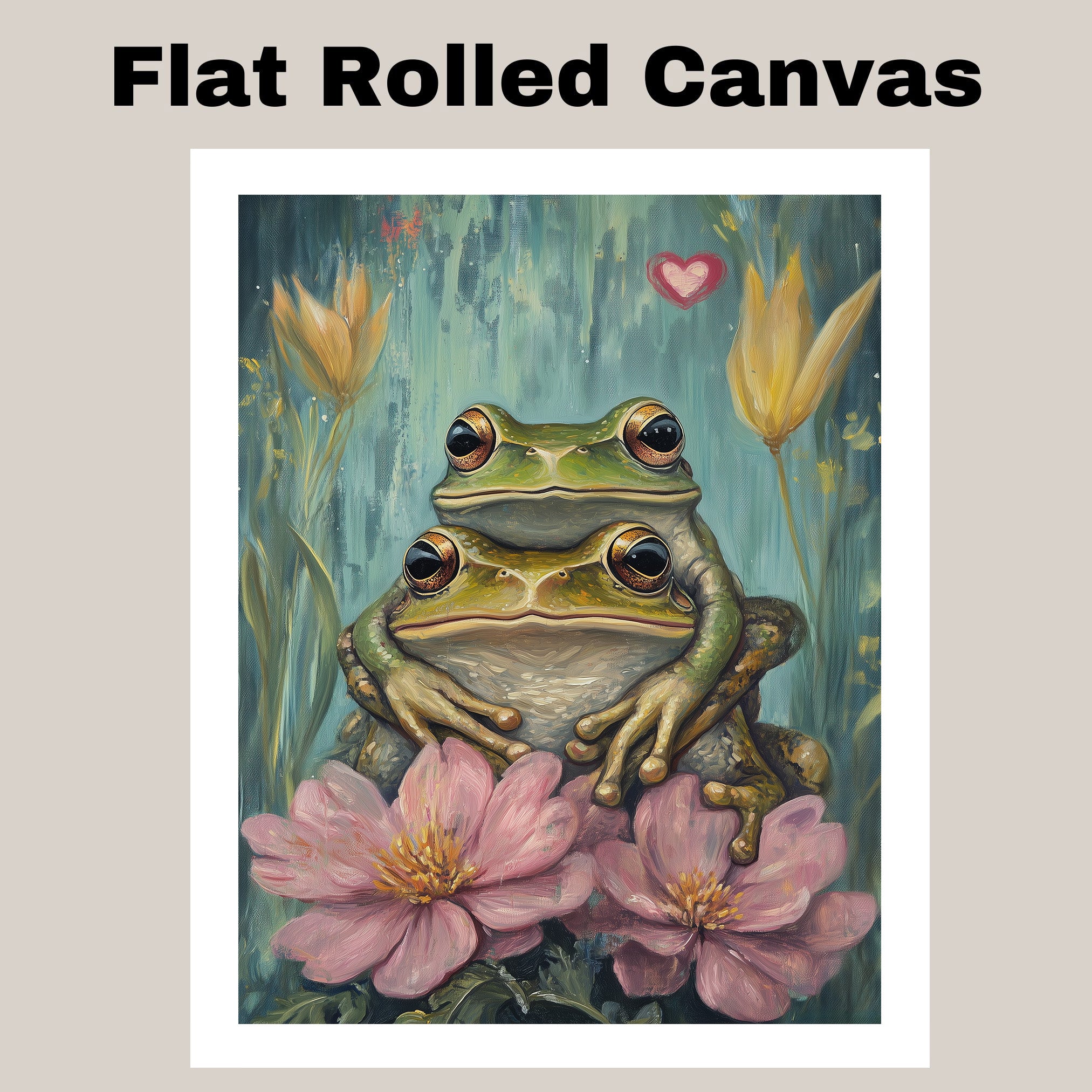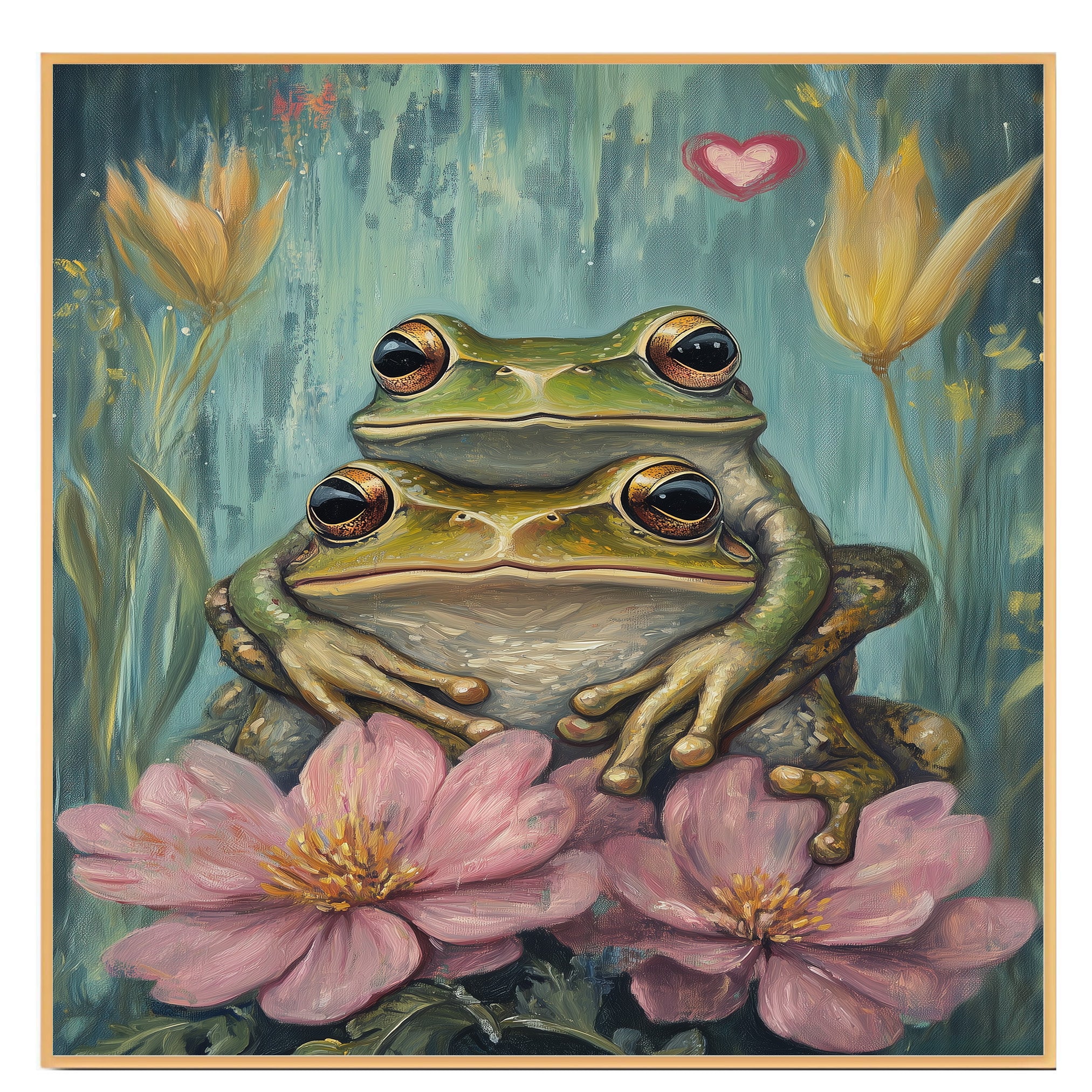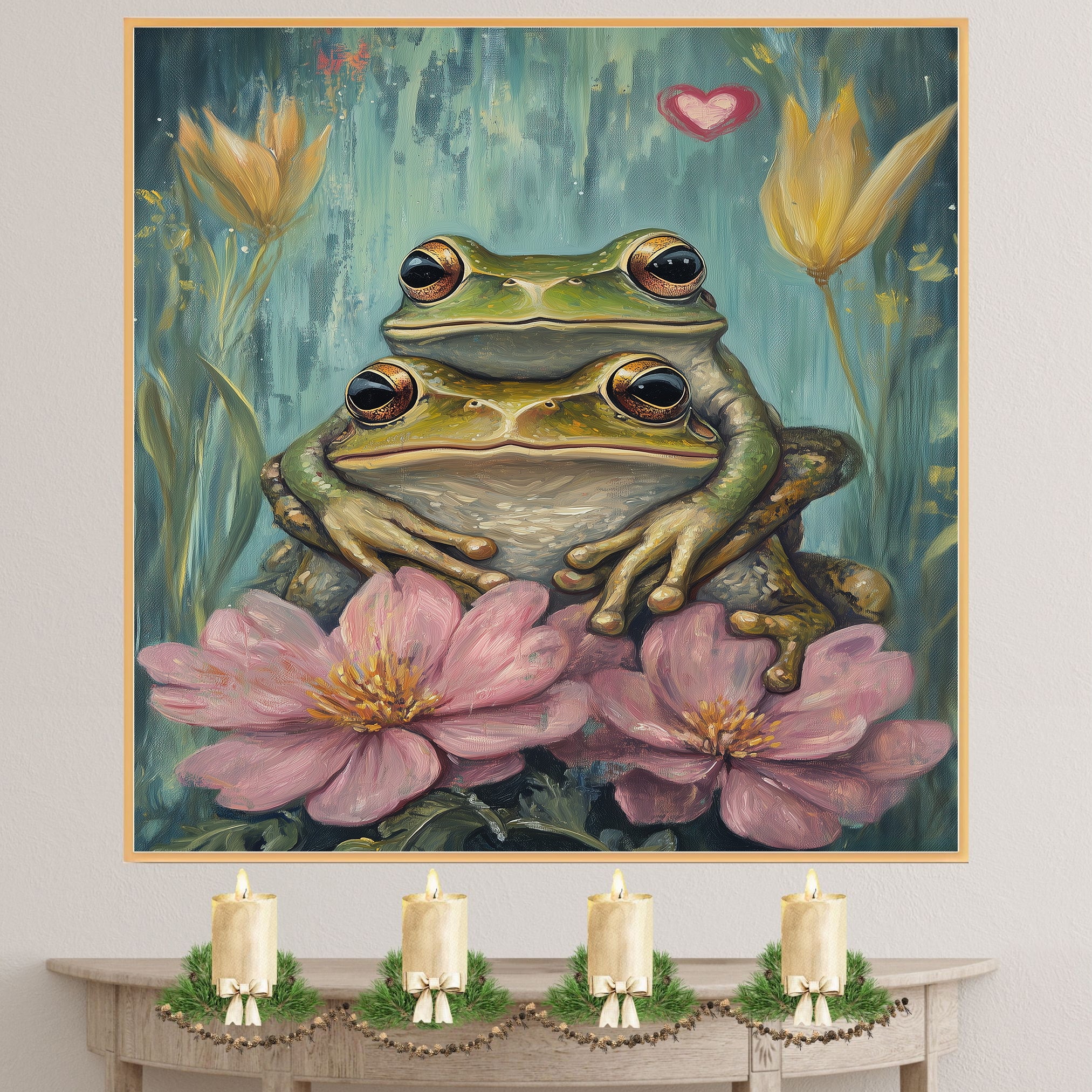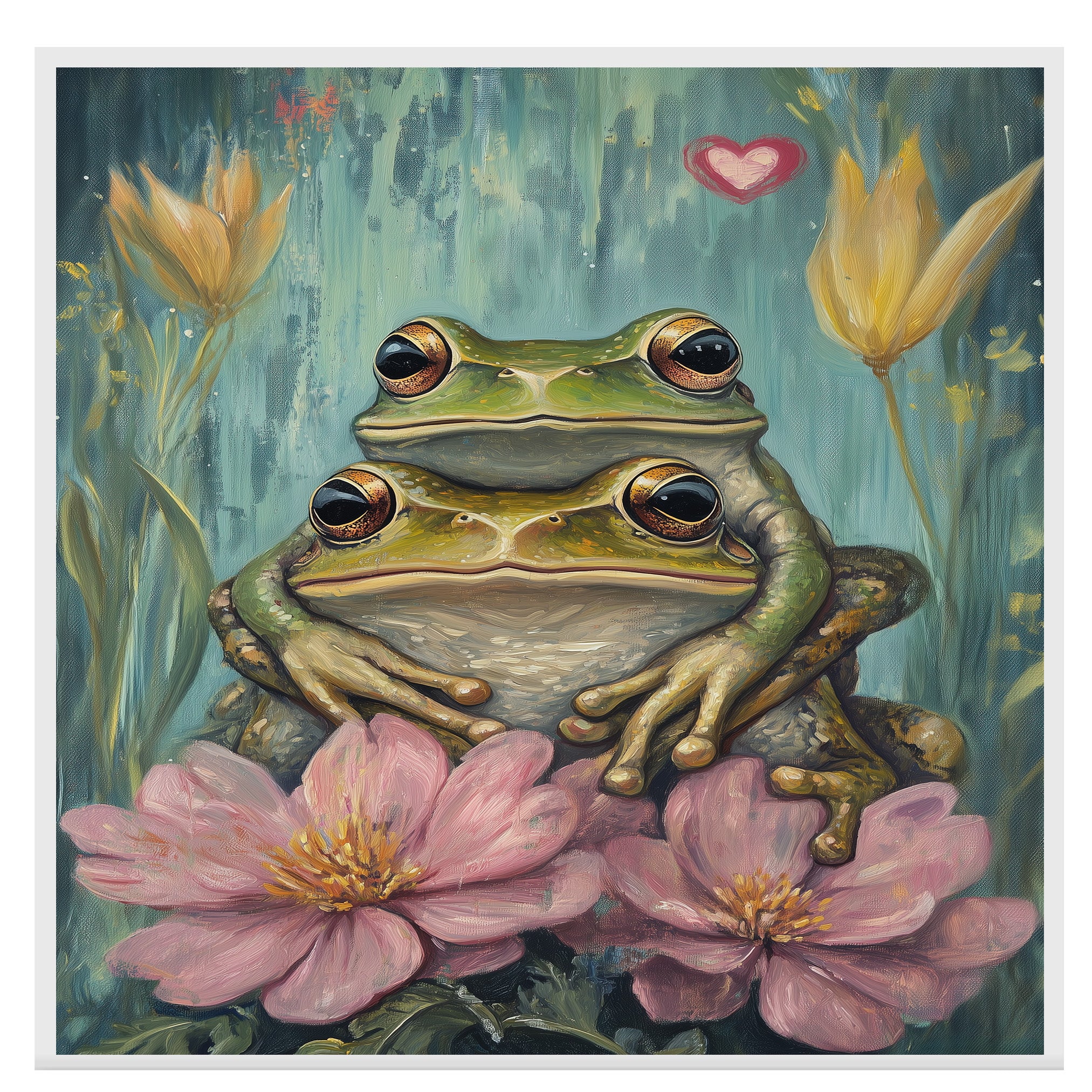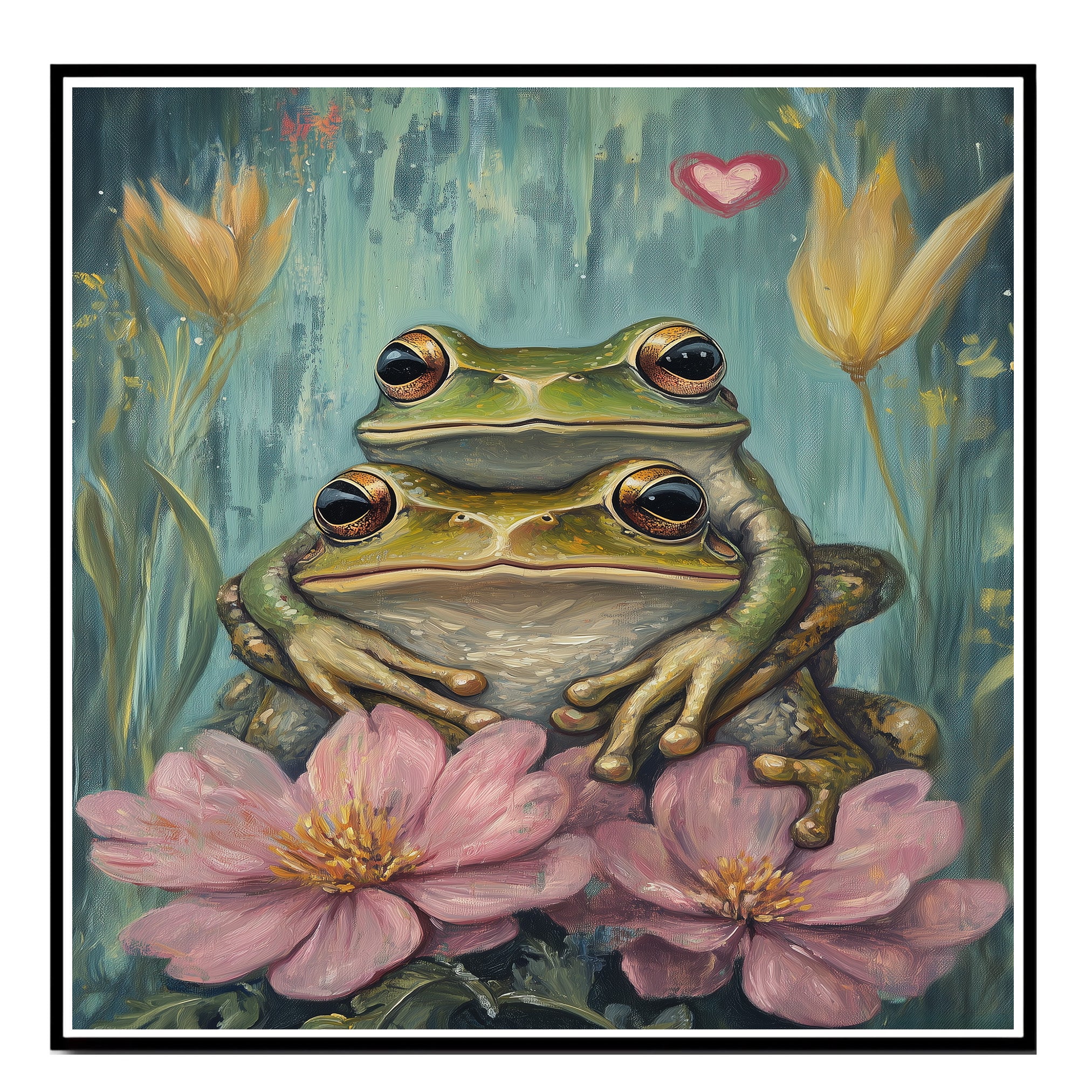 Celebrate love and serenity with this whimsical painting featuring an adorable frog couple surrounded by blooming pink flowers and a subtle heart. With a dreamy blue-green background and tender expressions, this artwork is perfect for nature lovers, rustic decor, or heartfelt gift occasions.