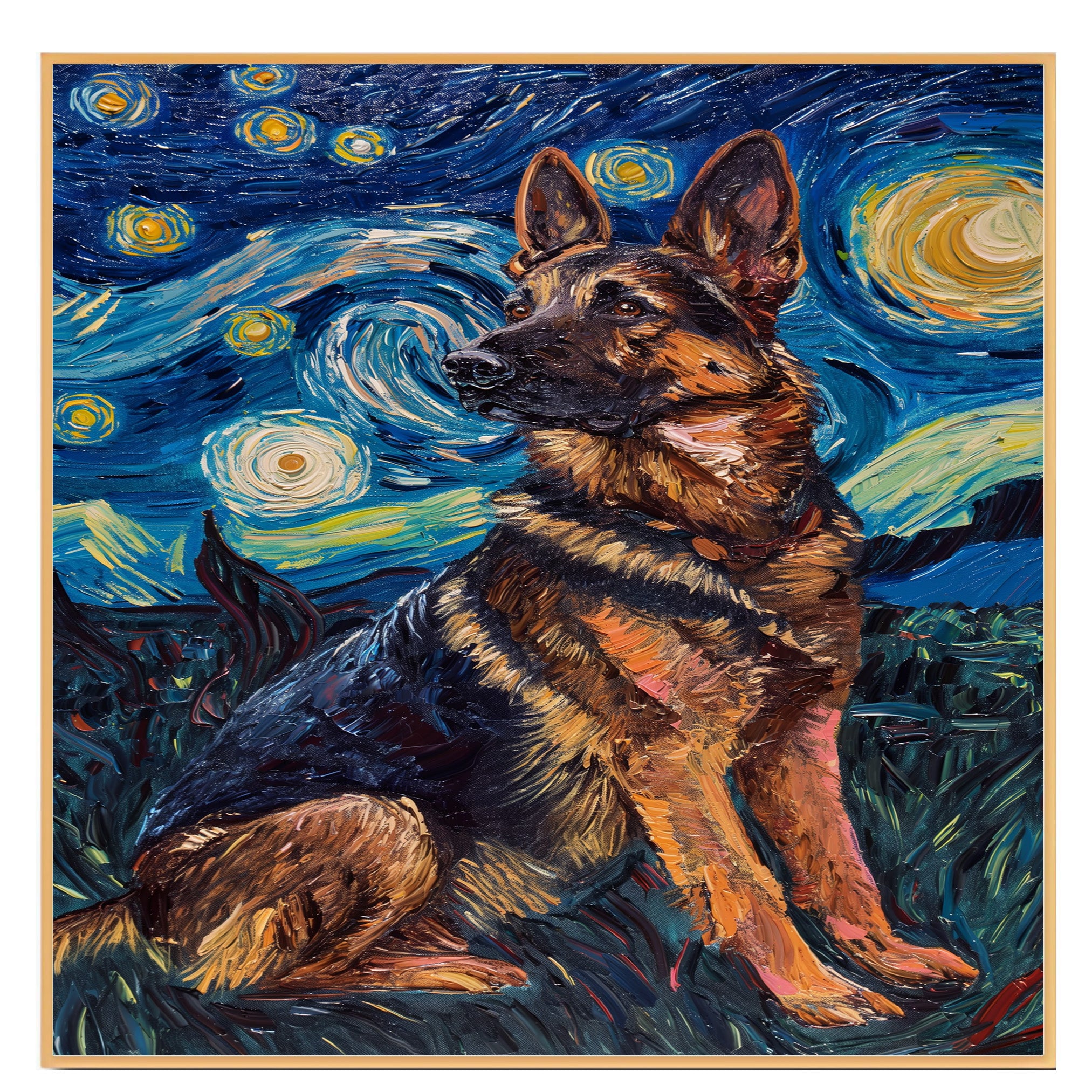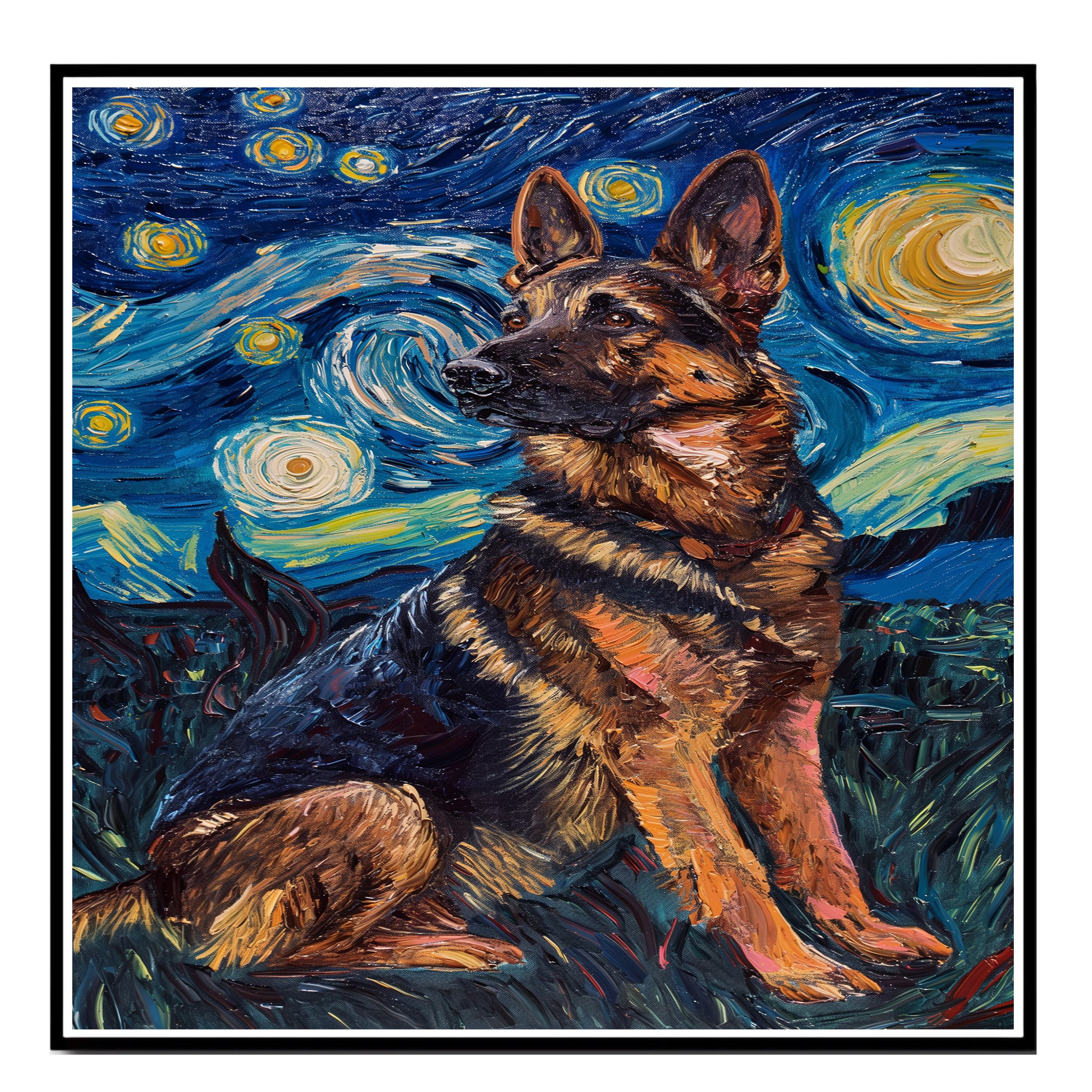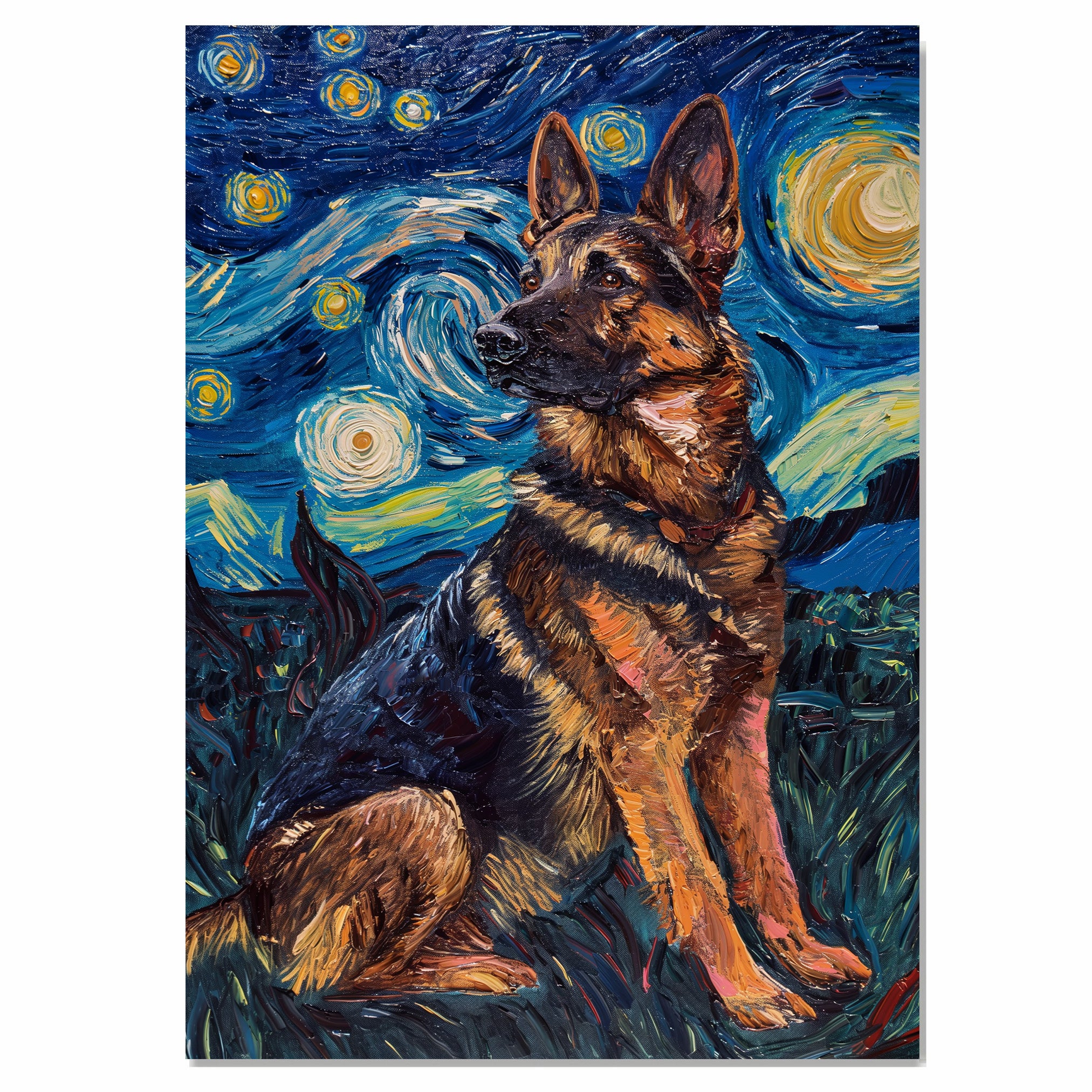 This full-body German Shepherd portrait captures the breed’s alert and noble presence in a scene inspired by Van Gogh’s Starry Night. The swirling sky, rich brushwork, and dynamic colors highlight the dog’s confident pose while blending seamlessly into the vibrant background. Perfect for dog lovers, art collectors, and fans of expressive, imaginative animal artwork.