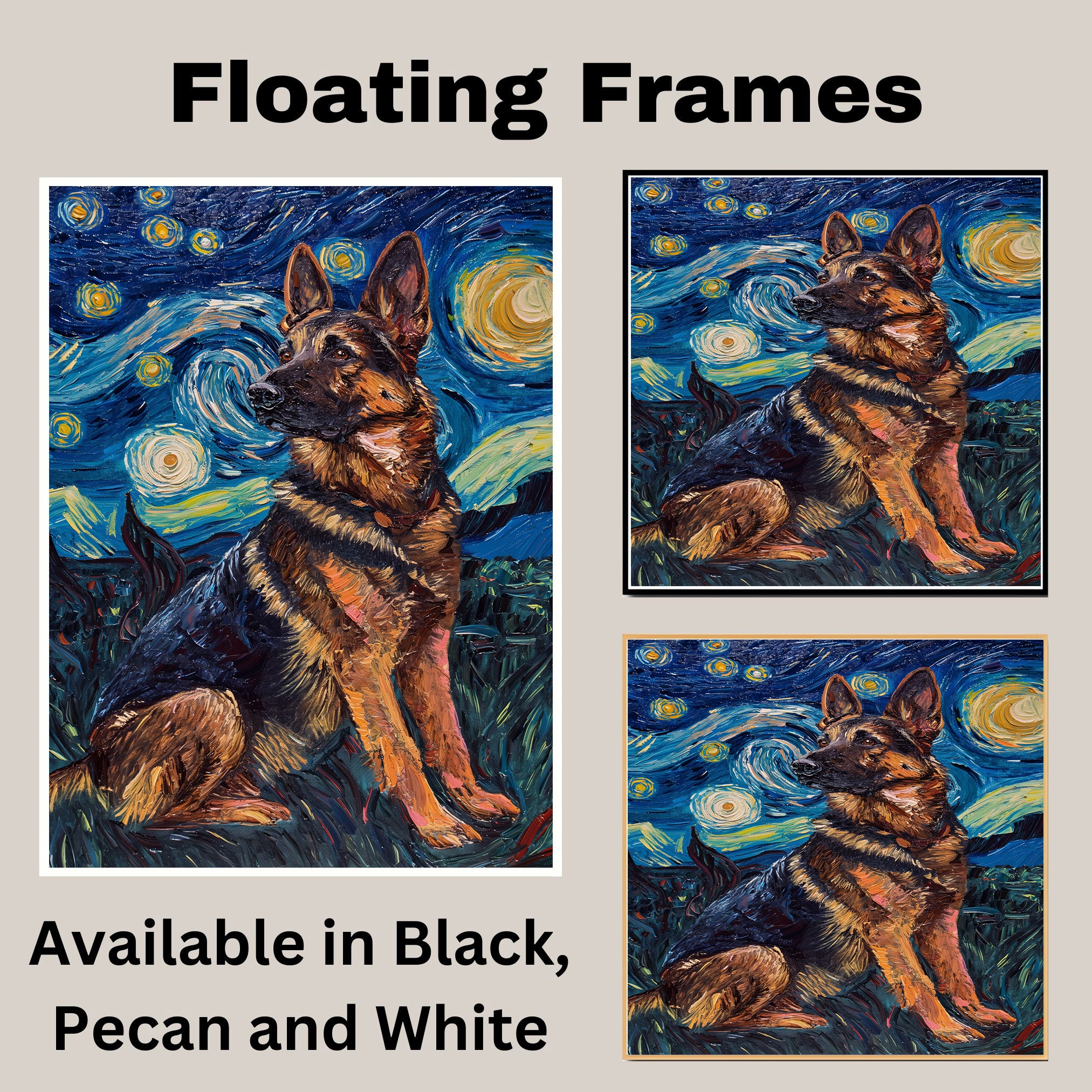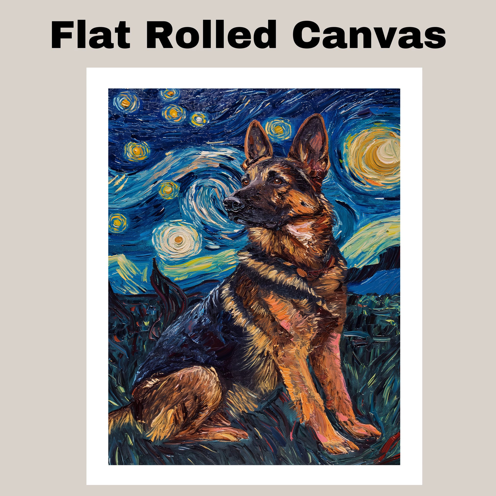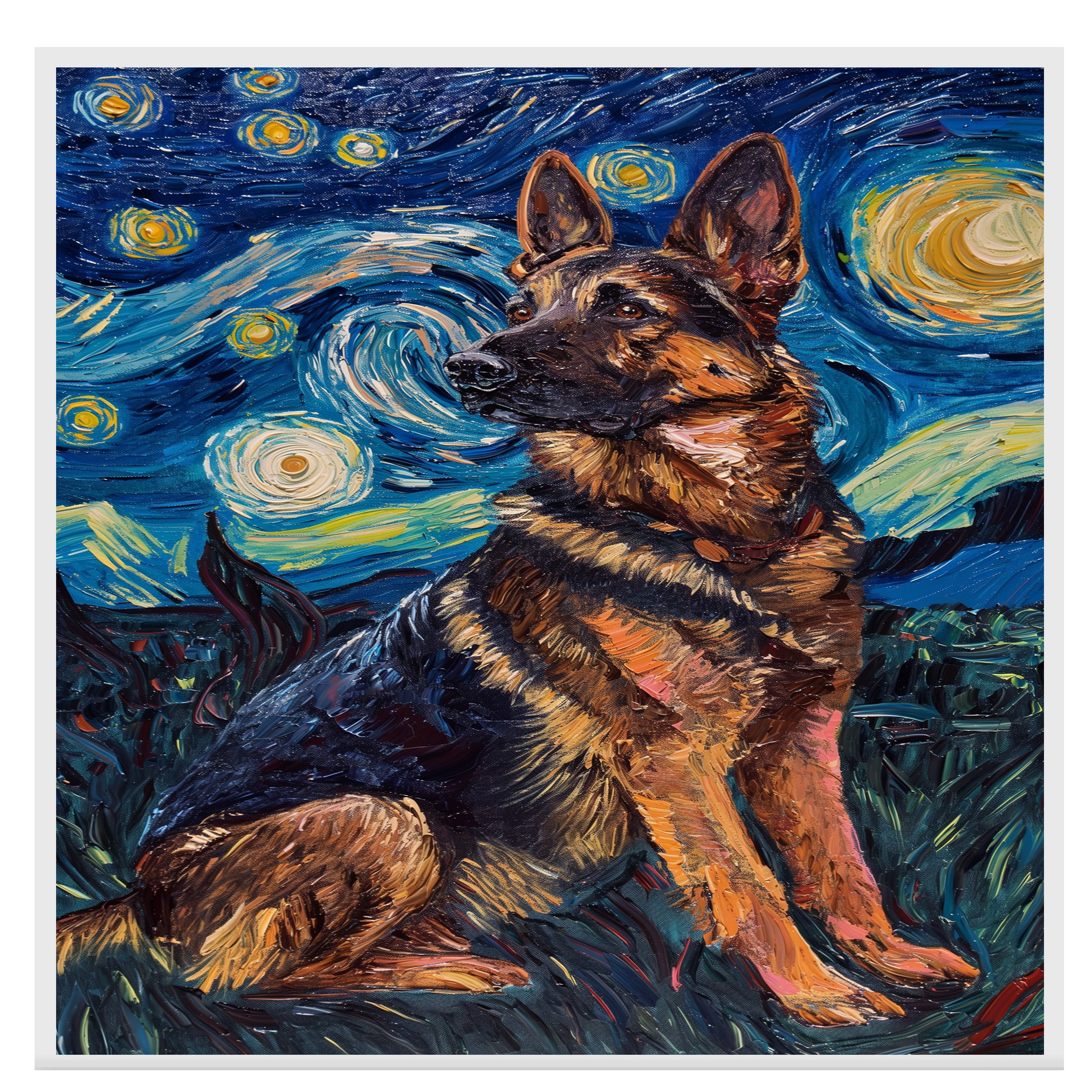 This full-body German Shepherd portrait captures the breed’s alert and noble presence in a scene inspired by Van Gogh’s Starry Night. The swirling sky, rich brushwork, and dynamic colors highlight the dog’s confident pose while blending seamlessly into the vibrant background. Perfect for dog lovers, art collectors, and fans of expressive, imaginative animal artwork.