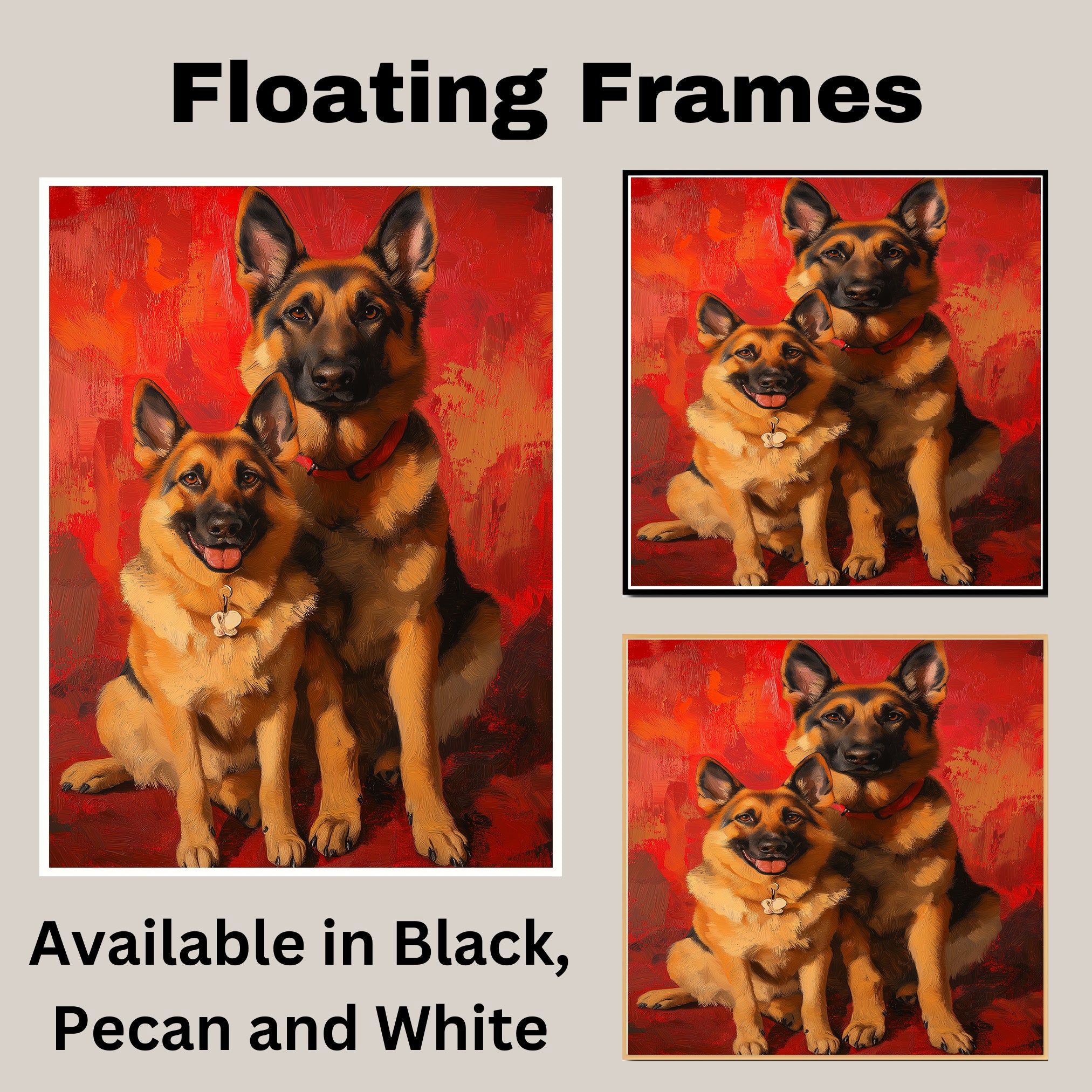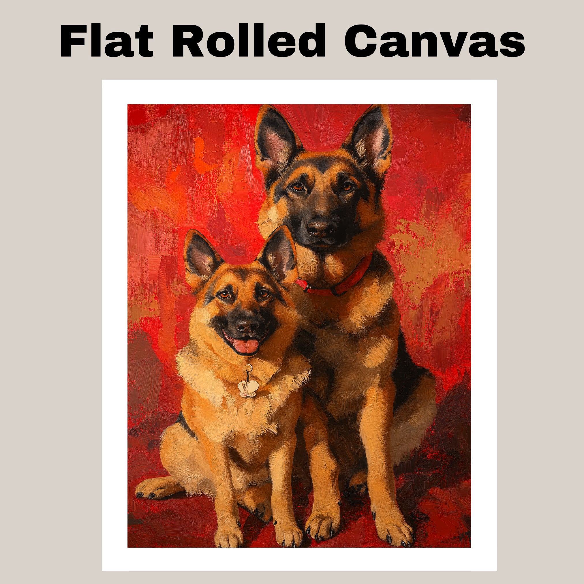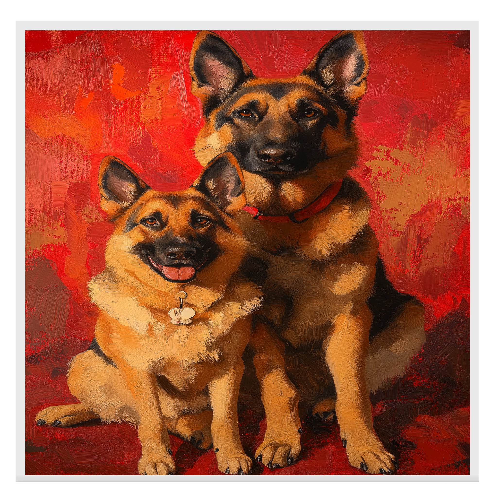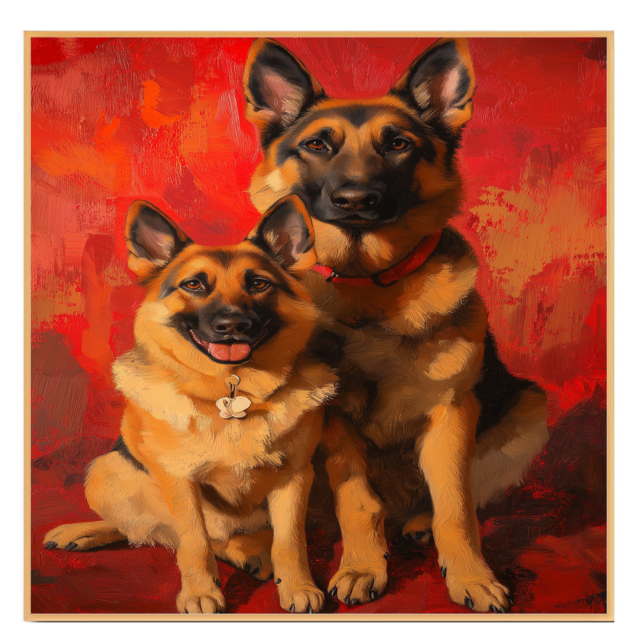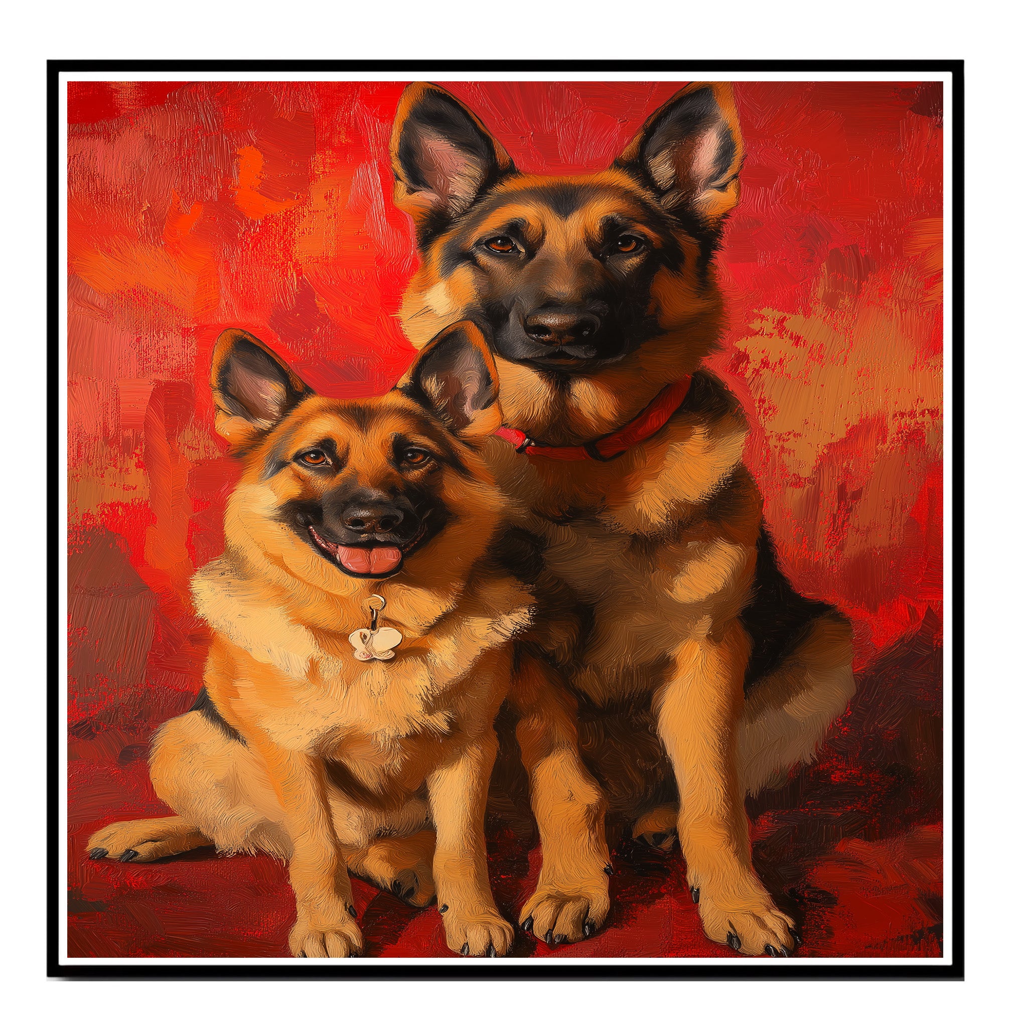 Celebrate loyalty and strength with this heartwarming painting featuring a German Shepherd couple posed against a rich red textured background. With expressive eyes and a warm palette, this artwork brings a sense of love, protection, and coziness to any space. Perfect for dog lovers, rustic homes, or thoughtful gifts.