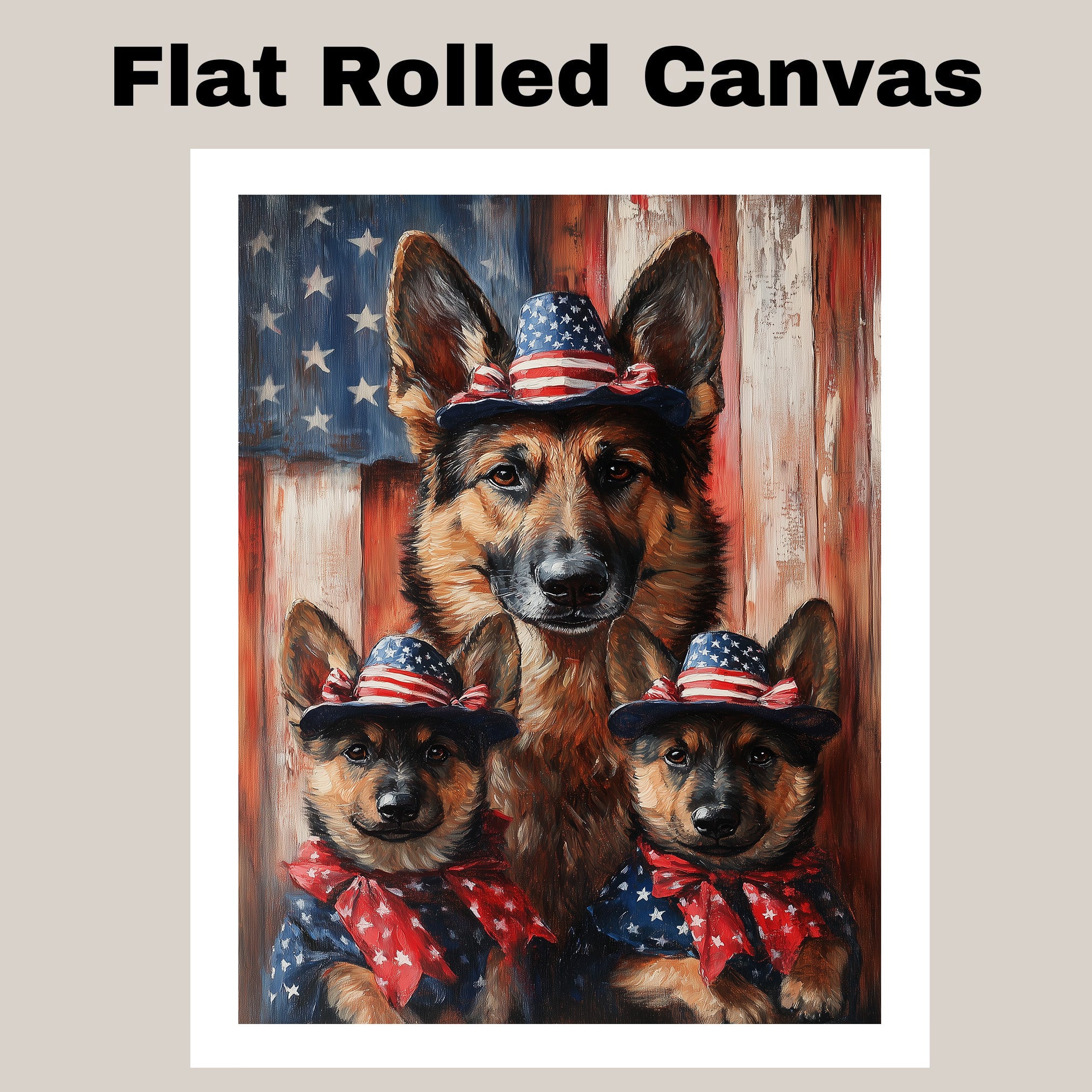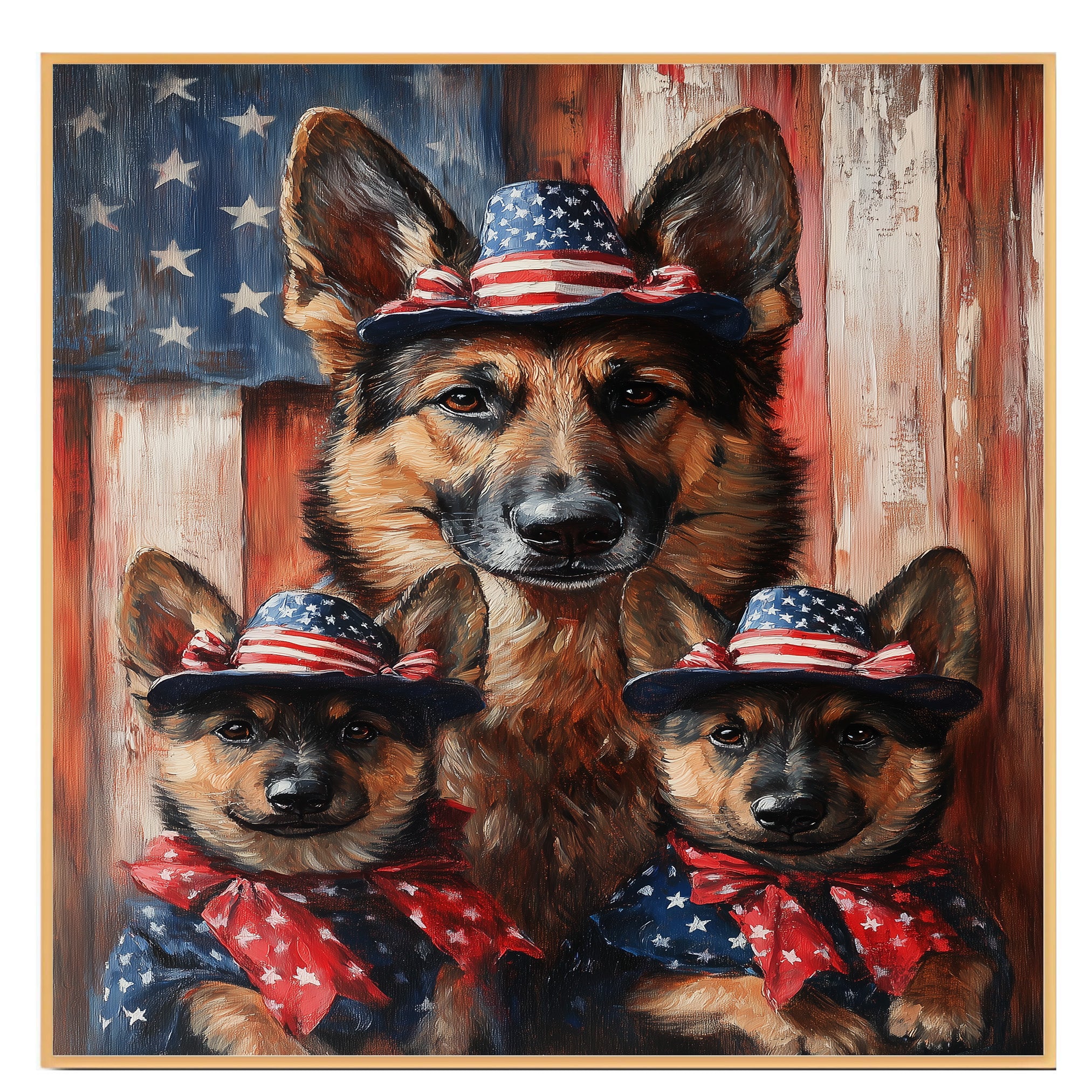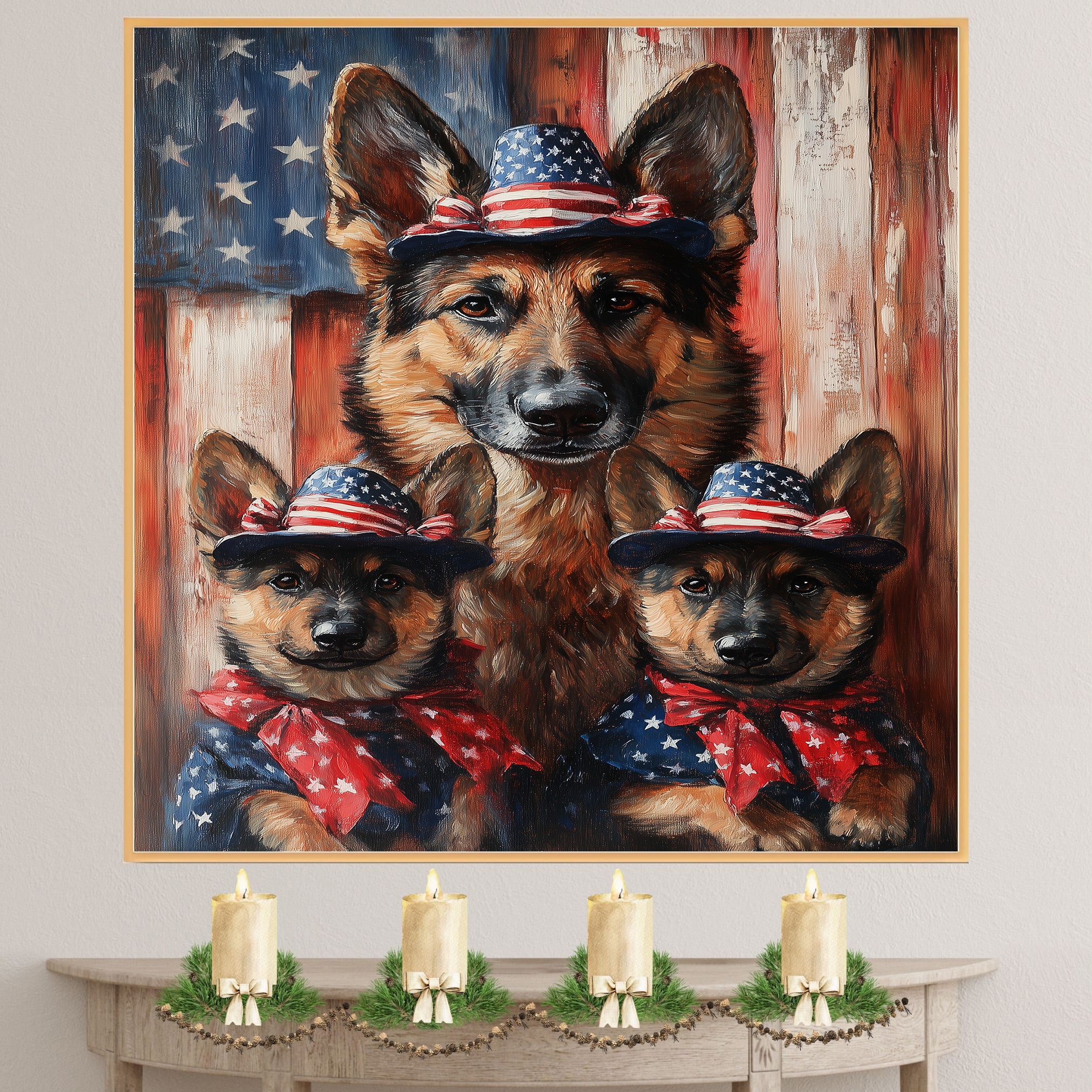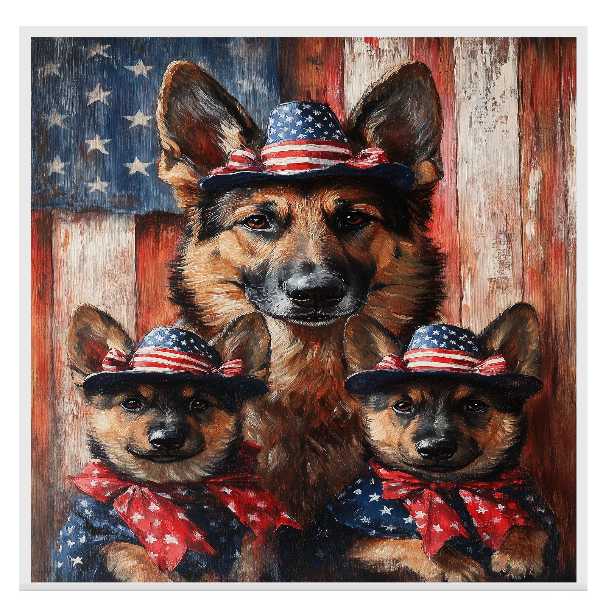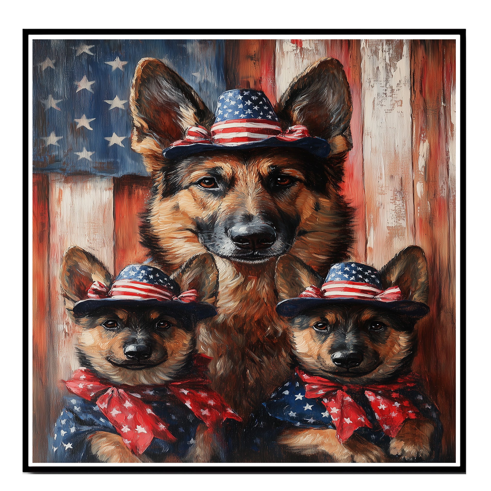 Celebrate the spirit of patriotism and loyalty with this heartwarming painting of a proud German Shepherd mother and her two puppies dressed in star-spangled hats and red bowties. Set against a weathered American flag backdrop, this artwork captures a rustic, Americana vibe. Ideal for dog lovers, military families, or Fourth of July celebrations, this piece brings together themes of family, country, and timeless devotion. A charming gift for German Shepherd fans or anyone who cherishes American pride.